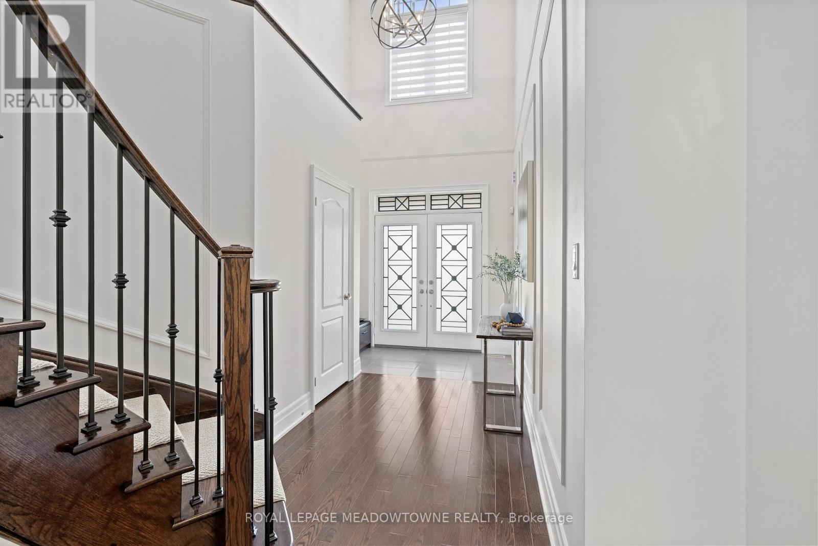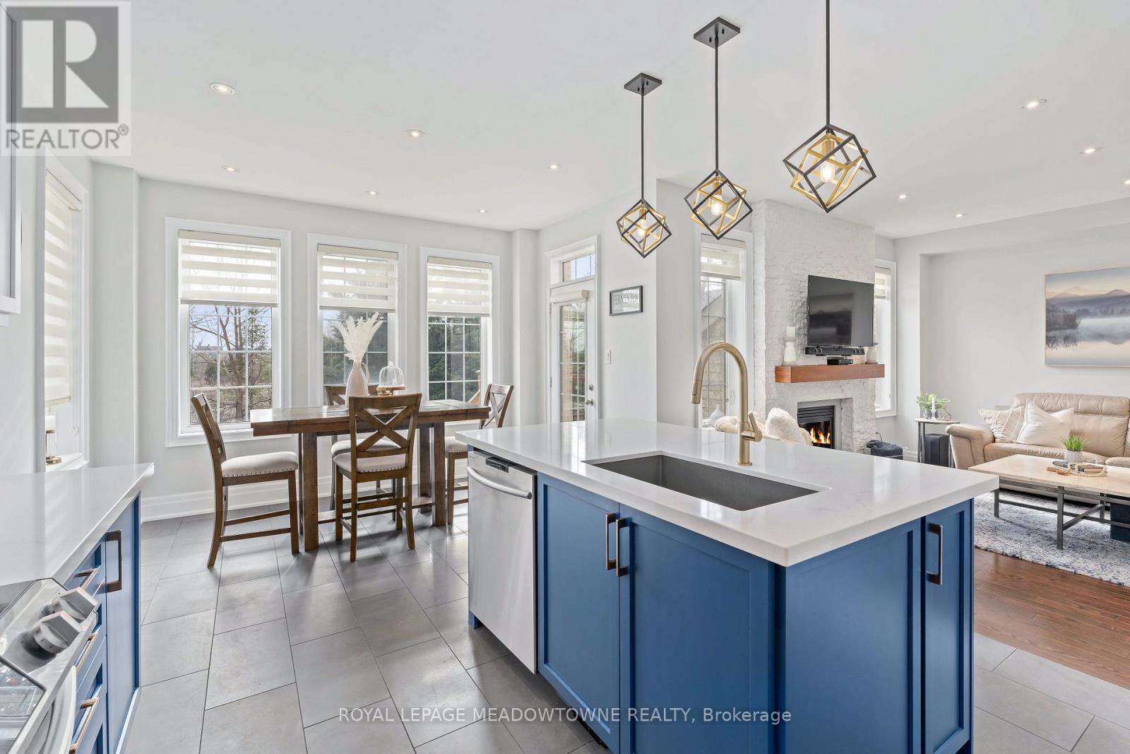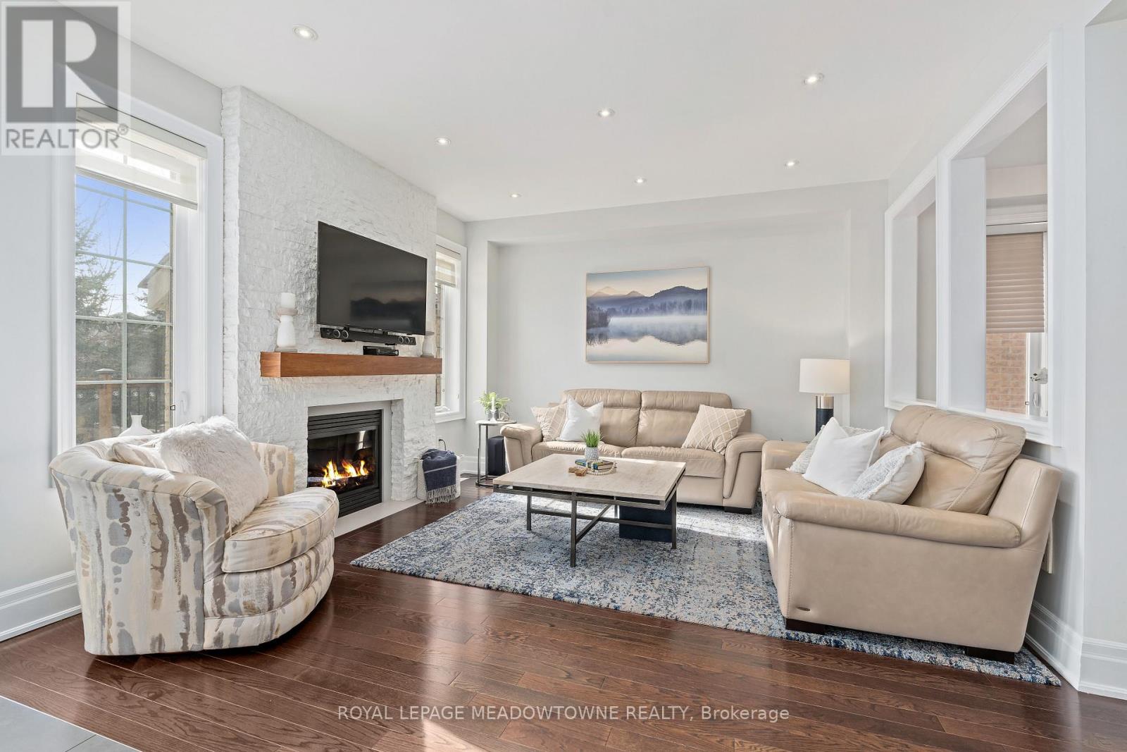 This stunning Georgetown South home, perfectly positioned on a premium lot where nature becomes part of your everyday life. From the moment you arrive, the custom flagstone porch and grand double door entry set the tone for what awaits inside. Step into a soaring foyer that opens into a beautifully finished home, where every detail has been thoughtfully curated. The heart of the home is a magazine worthy, fully renovated kitchen designed to impress, flowing seamlessly into the family room, complete with a striking stone gas fireplace and expansive views of the water beyond. With 4 spacious bedrooms and 4 bathrooms, including a dream primary retreat with a luxurious ensuite, this home offers both comfort and sophistication. Hardwood floors, custom ceilings, crown moulding, and pot lights add warmth and elegance. The finished basement with a custom fireplace provides the perfect space for a home office or quiet retreat, adapting effortlessly to your lifestyle. Step outside to a spectacular two-tier deck wrapped in natural stone, extending around the side and front of the home-an ideal setting for entertaining or simply unwinding while surrounded by peaceful views and the sounds of nature. Located just steps to scenic walking trails, the Gellert Community Centre, shopping, and convenient commuter routes, this home blends tranquility with everyday convenience. With no sidewalk, there's parking for up to 6 vehicles. This is more than a home, it's a lifestyle you'll fall in love with. (id:50787)