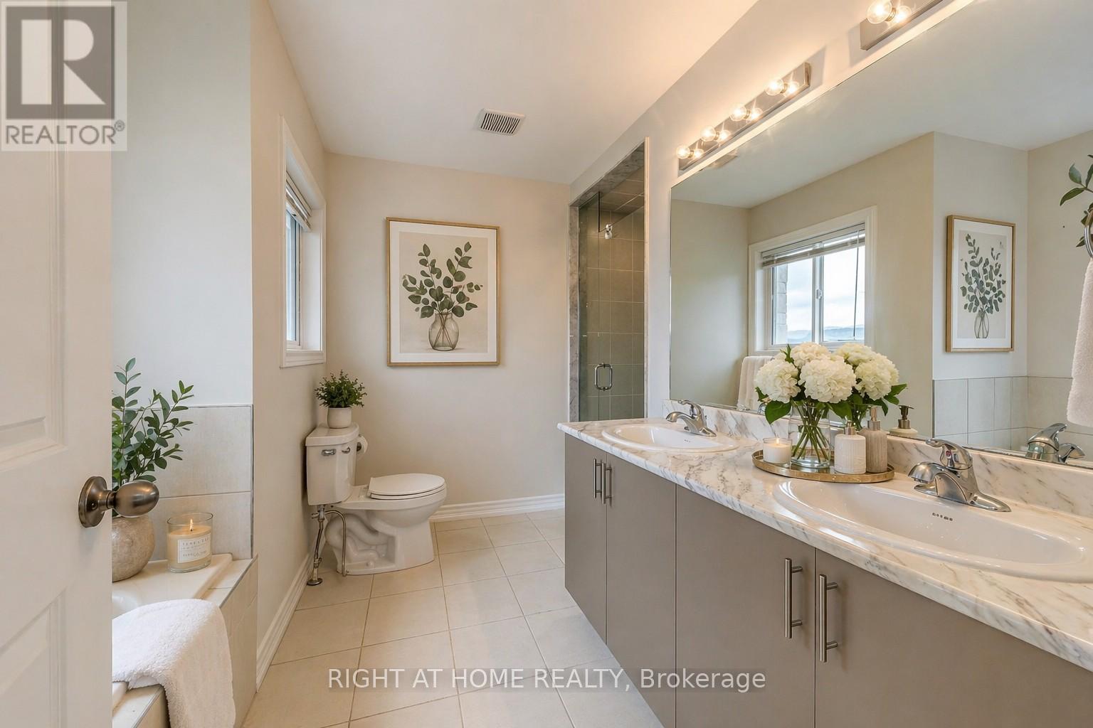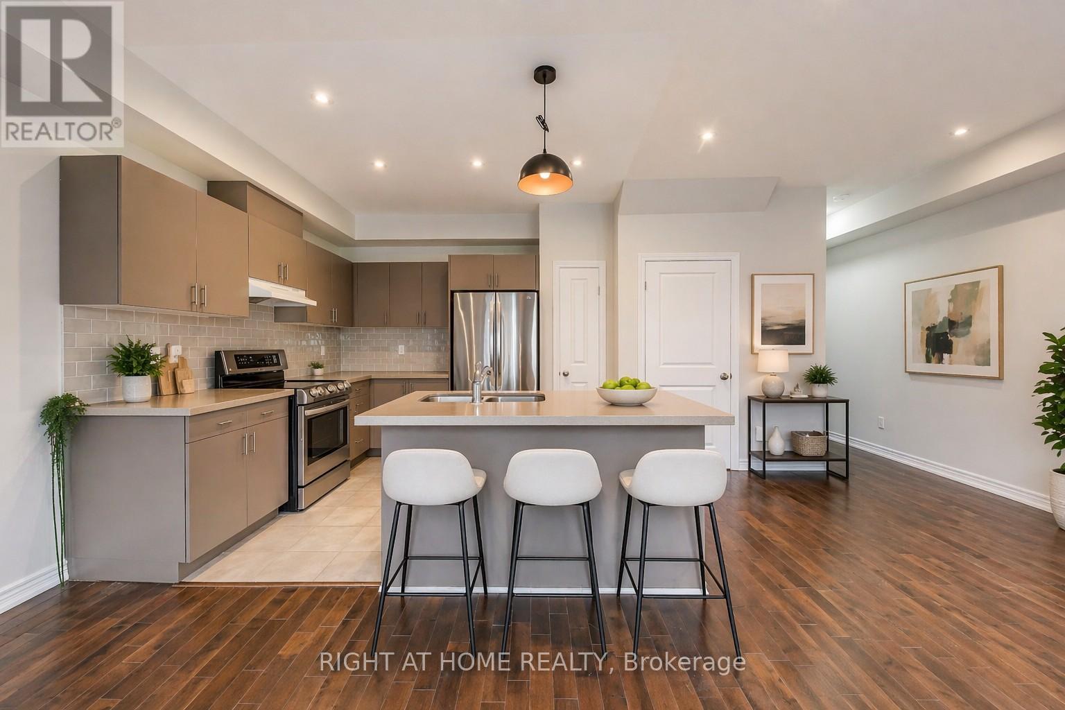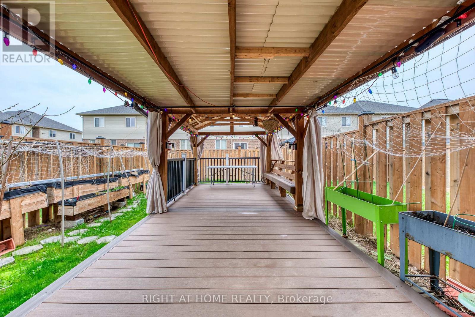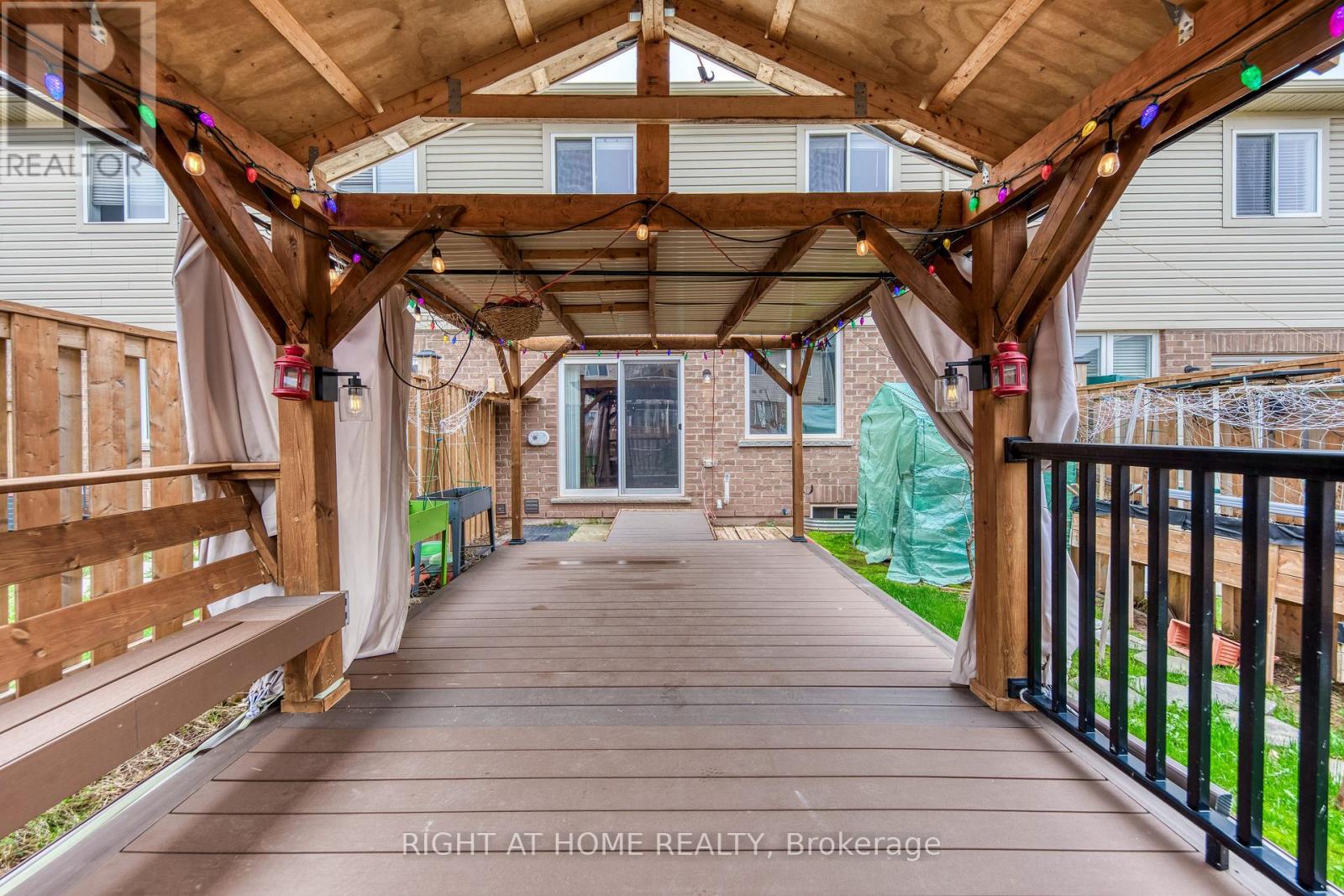 Beautifully upgraded 3-bedroom, 2.5-bath carpet-free freehold townhouse featuring a bright, spacious open-concept layout with high ceilings, hardwood floors on the main and second levels, pot lights in the kitchen and living area, and freshly professionally finished natural décor paint throughout. Modern kitchen with island, quartz countertops, backsplash, upgraded cabinetry, stainless steel appliances, gas line-ready stove, and water line for ice-making fridge. The spacious primary bedroom offers an upgraded 5-piece ensuite with double sinks, a separate soaker tub, and a stand-up shower. The standout "Muskoka in the city" backyard features a large custom-built solid deck with composite grooved boards and a beautifully designed gazebo with privacy curtains and extensive party lighting, perfect for entertaining rain or shine. Fully fenced yard with vegetable garden and a unique apple tree producing four varieties on one tree, two growing peach-producing trees purchased directly from the farm, plus a backyard solar panel system. Convenient side-door access to oversized 1.5 car garage with total parking for 3 vehicles. Prime location just 5 minutes to Lake Ontario with easy access to Costco, Winona Park, Winona Crossing shopping centre, Fifty Point Conservation Area, schools, GO Transit, Hwy QEW & 403, public transit, and all amenities. Pictures are virtually staged. A great place to call home. (id:50787)