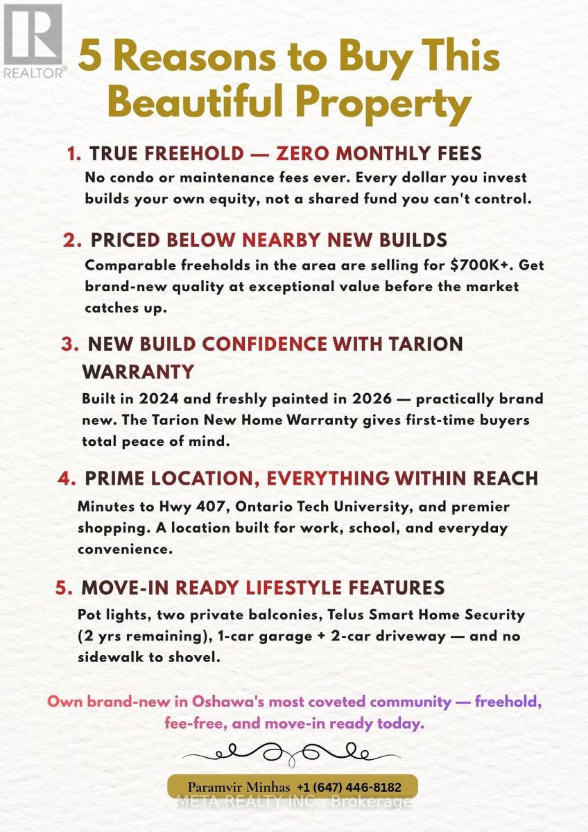 Welcome to one of North Oshawa's most exciting & Very rare opportunity! This 2024-built, 4-bedroom, 3 full-bath FREEHOLD townhouse in the coveted Kedron community is the one you've been waiting for, and it won't last! Zero monthly fees means Zero compromises. NO POTL, NO Maintenance Fees, Freshly painted in 2026, this home feels brand new, because it practically is. Backed by a Tarion New Home Warranty, first-time buyers can purchase with total confidence and peace of mind. Enjoy pot lights throughout, two private balconies for outdoor entertaining, and seamless Telus Smart Home Security with 2 years remaining - all included. Park with ease using your 1-car garage + 2 car driveway, and say goodbye to sidewalk snow shovelling - there isn't one! Located just minutes from Hwy 407, Ontario Tech University, and premier shopping, this home puts everything within reach. The best part? Builders are selling comparable freeholds nearby for $700K+. This is your chance to get into a brand-new, move-in-ready home at an unbeatable value. Freehold - No Maintenance Fees, Tarion Warranty, Smart Home Security, Two Balconies, 3 Full Washrooms, Minutes to 407 & Ontario Tech. This motivated seller is ready to make a deal. Don't think twice - book your showing TODAY before it's gone! Property Is Virtually Staged. (id:50787)