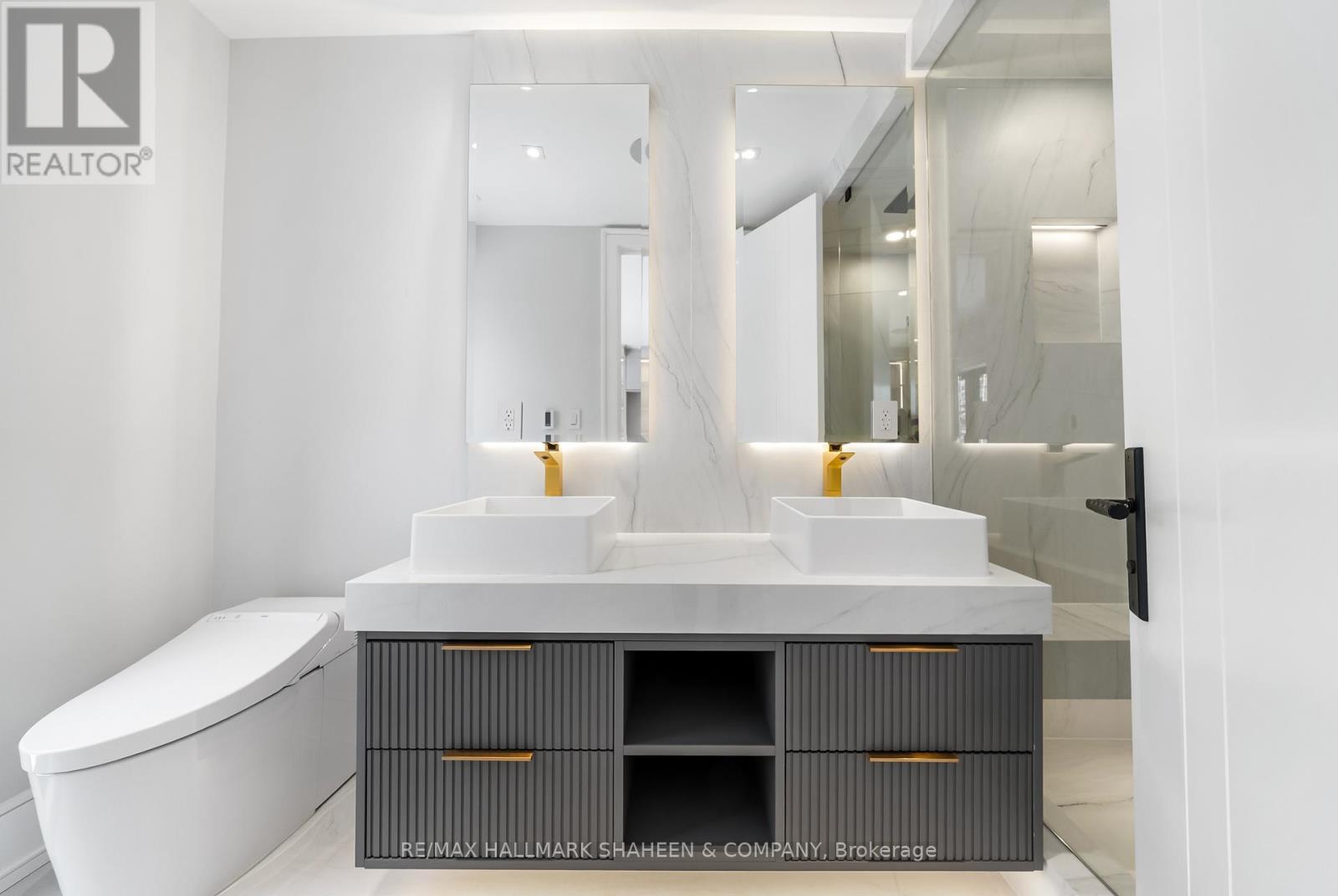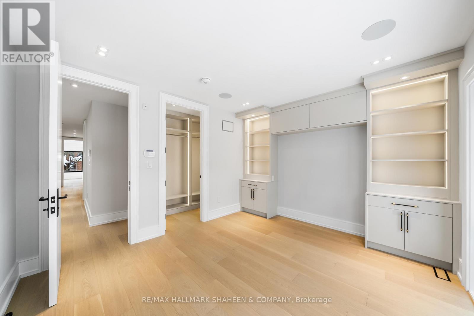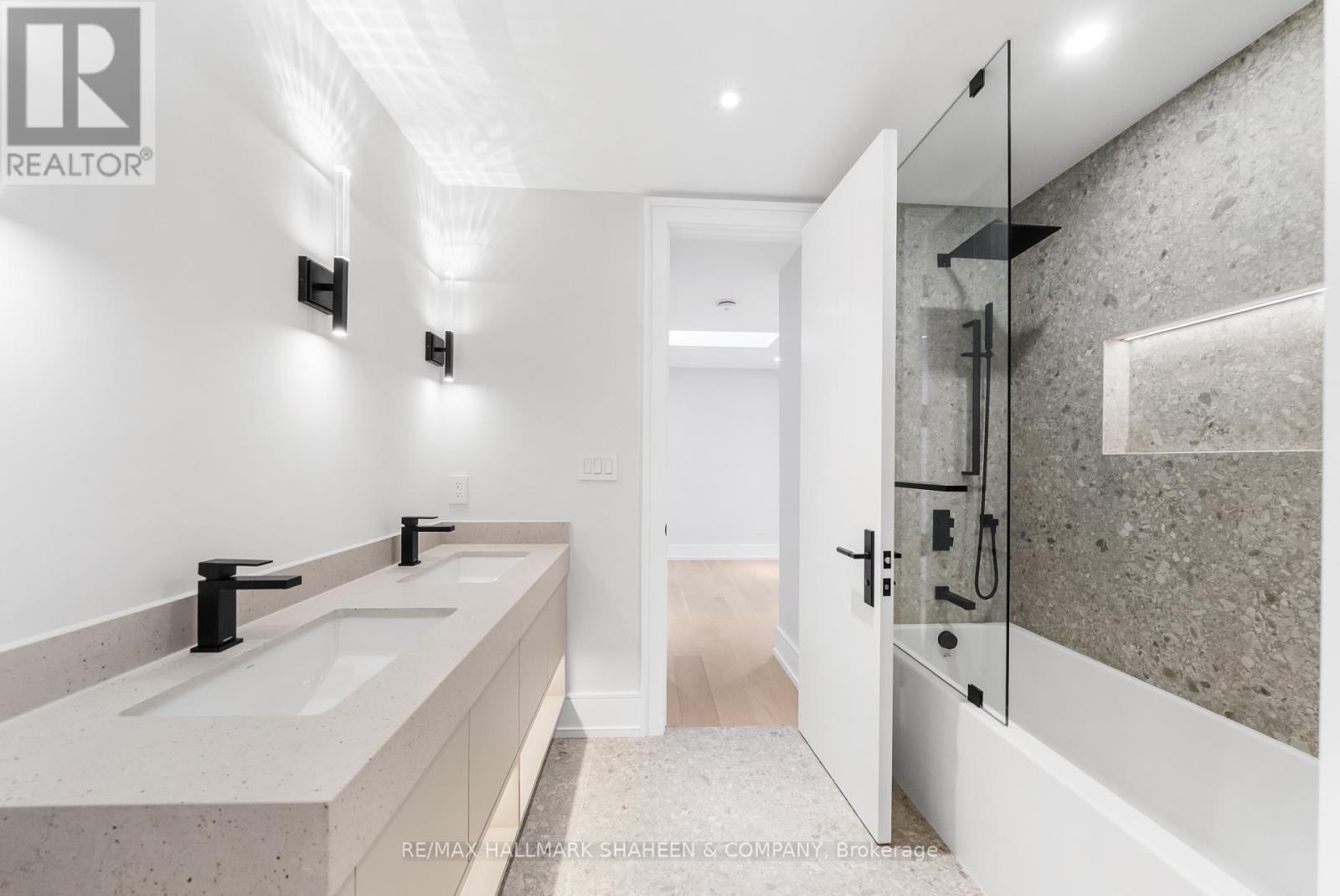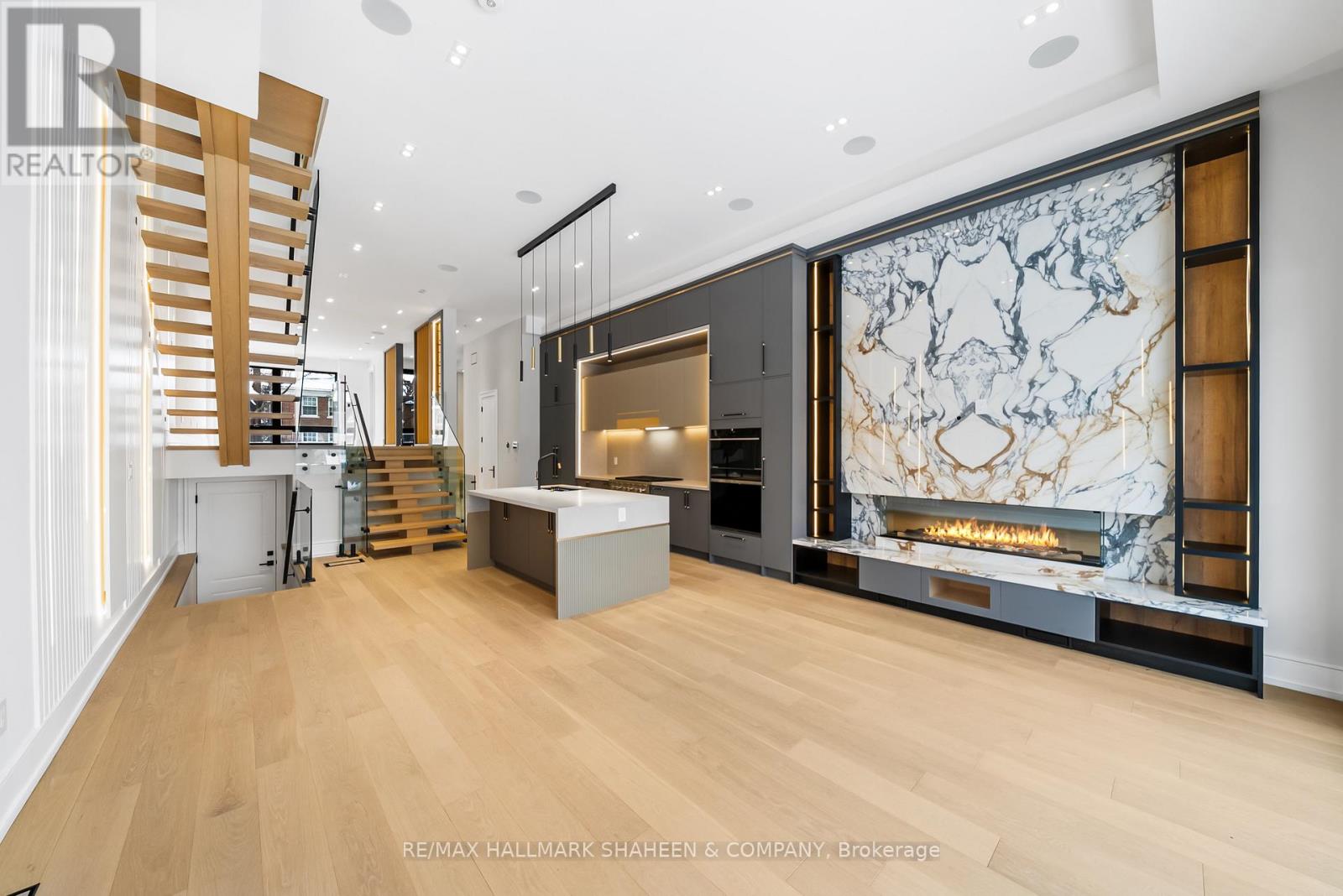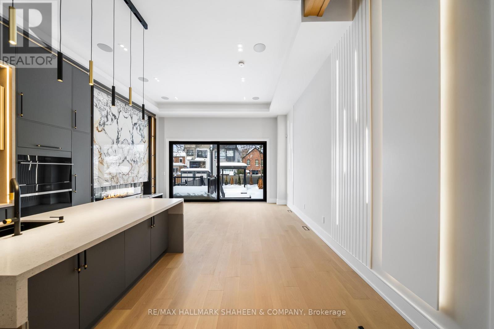 The experience begins on arrival with a heated driveway, followed by 12+ foot ceilings, skylights, and a raised, light-filled living space that set the tone for scale and warmth. The chef's kitchen is anchored by a large island wrapped in a fluted finish, a design motif echoed throughout the home in Vogt faucets, solid brass hardware, and refined architectural accents. Custom millwork is paired with a premium appliance suite including a Sub-Zero fridge/freezer, Wolf six-burner gas cooktop, wall oven, and Bosch dishwasher. The family room is elegant yet inviting, featuring fluted oak veneer panels, custom built-ins, and a porcelain fireplace, with floor-to-ceiling glass opening to a beautifully landscaped backyard. Enjoy a composite deck, interlocking surfaces, gas lines for a BBQ and firepit, gazebo, and full landscape illumination-ideal for quiet evenings at home. Upstairs, the primary suite offers a serene retreat with custom cabinetry, dual sinks, wall-mounted vanity, linear drain, floor bench, and a seamless full-slab stone shower. One additional bedroom includes its own ensuite, while two others share a bath. A convenient upper-level laundry completes the floor, with rough-ins in place for a future second laundry in the basement. The finished lower level features heated floors, a spacious rec room with walkout, wet bar, wine display, and flexible living space with direct access to the garage. Engineered for comfort and longevity, the home includes radiant in-floor heating for all stone surfaces, a high-efficiency furnace with heat pump cooling, tankless hot water, sump pump, integrated drainage system, an interlock driveway with snow-melt on stairs, and epoxy garage floors with LED lighting. Smart home features include Control4, an Ecobee thermostat, built-in speakers, a Wi-Fi booster, and security cameras. Set between Avenue Road and Yonge Street, within the coveted Allenby Junior PS and North Toronto CI catchments. (id:50787)