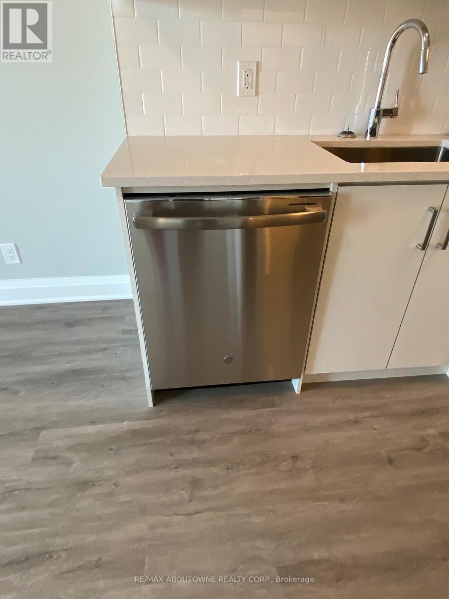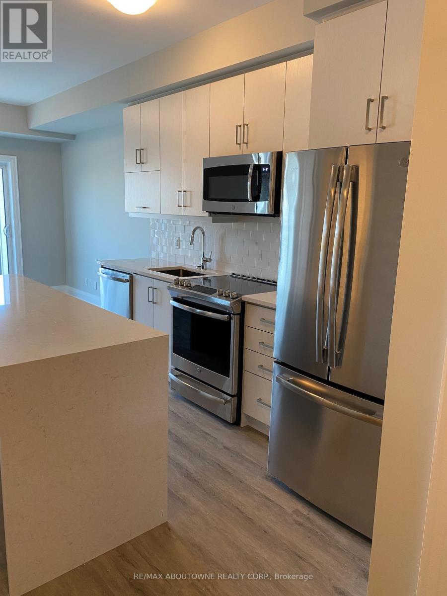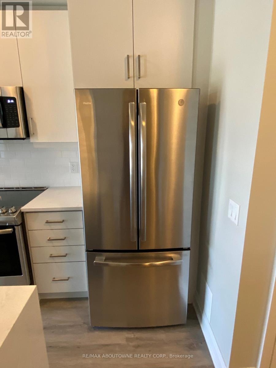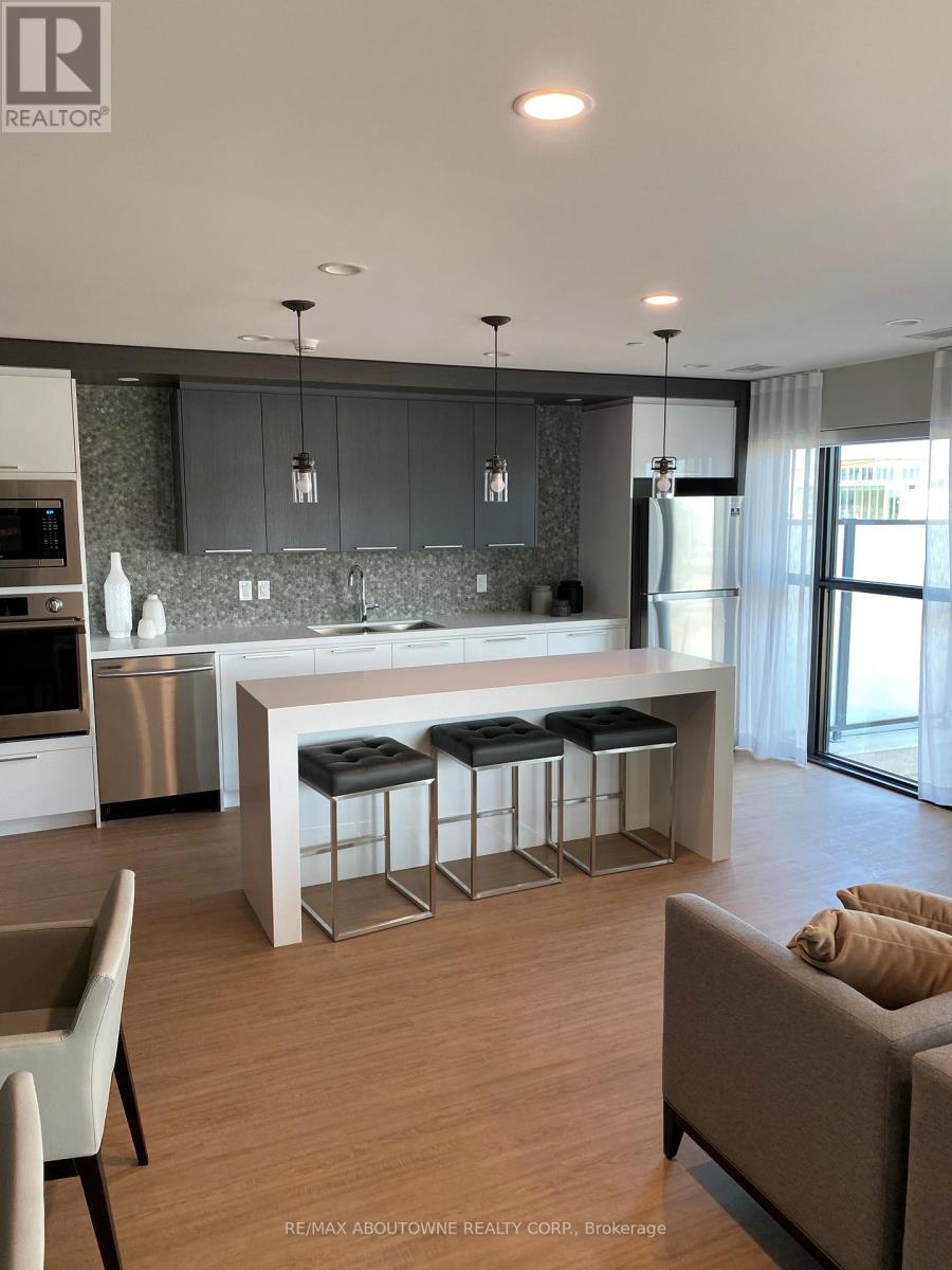 Beautiful 1 bedroom + den executive suite in Mattamy's Bower Condos. Immediate Possession Available! Thousands in luxury upgrades and modern finishes! Kitchen features upgraded porcelain tiles, stainless steel appliances with slide in range, French door refrigerator, built in dishwasher & microwave plus upgraded kitchen cabinetry with pots & pan drawers & quartz countertops with island waterfall. Den can be used as a work or guest space. Upgraded bathroom with walk in shower. Enjoy the sunny south facing exposure & view from your large private terrace. The three piece washroom features upgraded porcelain tiles, vanity and faucets. In suite laundry. 635 sq. ft plus plus 168 sq. ft patio!. One underground parking space and private locker included. Building amenities include fitness room & social lounge. Excellent location, walk to shopping, great parks, public transit and easy access to QEW, 403, 407 and a short drive to Oakville Hospital and Oakville Go station. Triple A tenants (id:50787)