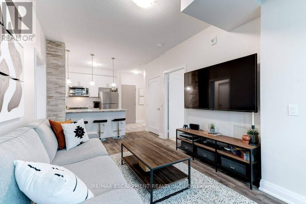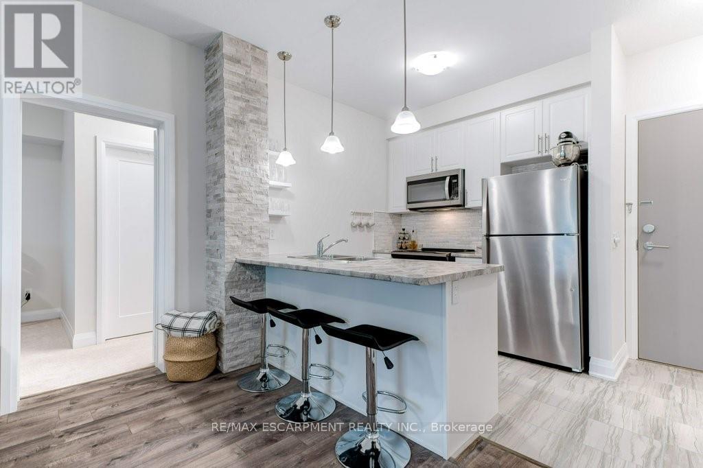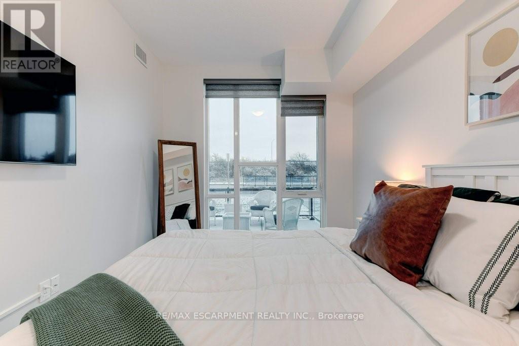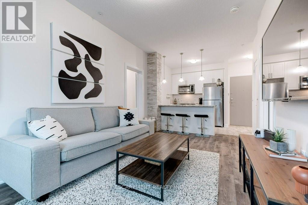Upscale Lakefront Living! Elegant 2 Bedroom, 2 Bathroom ground floor suite with oversized 385 sq. ft. Terrace in the award winning AquaZul Waterfront Condominiums. Open-concept design, 9' ceilings, floor-to-ceiling windows & 1,191 SqFt of total living space with the expansive private Terrace; perfect for Entertaining & Lounging. Fabulous gourmet Kitchen w/Breakfast Bar, custom white cabinetry, S/S Appliances, floating shelves, tiled backsplash & ledgestone feature. Large Primary Suite with walk-in closet & luxe 3pc Ensuite with frameless walk-in glass shower. Spacious second Bedroom w/floor to ceiling windows. Stylish second (4pc) Bath & oversized closet w/system. Generous Great Room w/laminate wood floors, floor to ceiling windows & w-o to huge Terrace w/glass railings for spectacular seasonal entertaining. Aquazul is designed with opulent style & 5-star Resort style amenities: in-ground outdoor Pool with Cabanas, BBQ areas, Club Room w/fireplace & Terrace, Fitness Centre w/Lake views, Billiards, Media Room, Visitor Parking and so much more! Poised on the shores of Lake Ontario amidst the beauty of Wine Country & on Grimsby's $5 Million revitalized Lake Shore. Steps to Grimsby Waterfront Beach Park Trail & walkable to the unique shops & restaurants of charming Grimsby on the Lake. Close to transit, highways & 2 minutes from the new GO train station in the works. AquaZul will be like living at your own resort, and it's all just outside your front door. Book your private viewing today! (id:50787)
