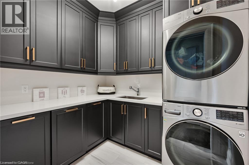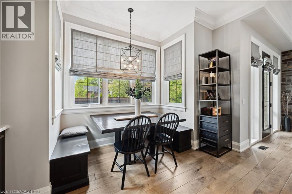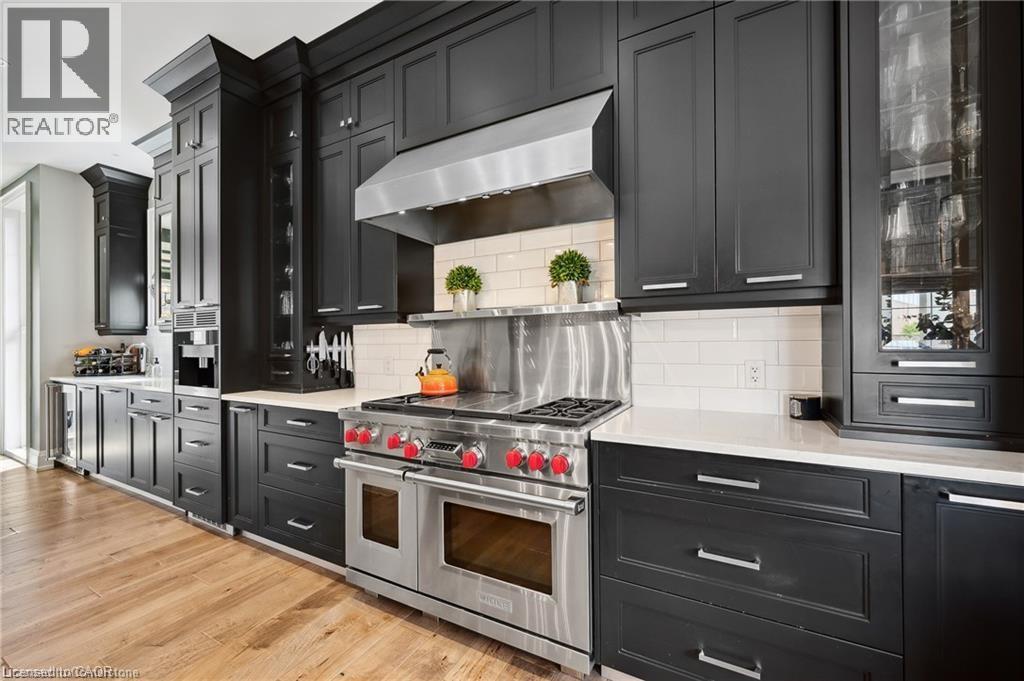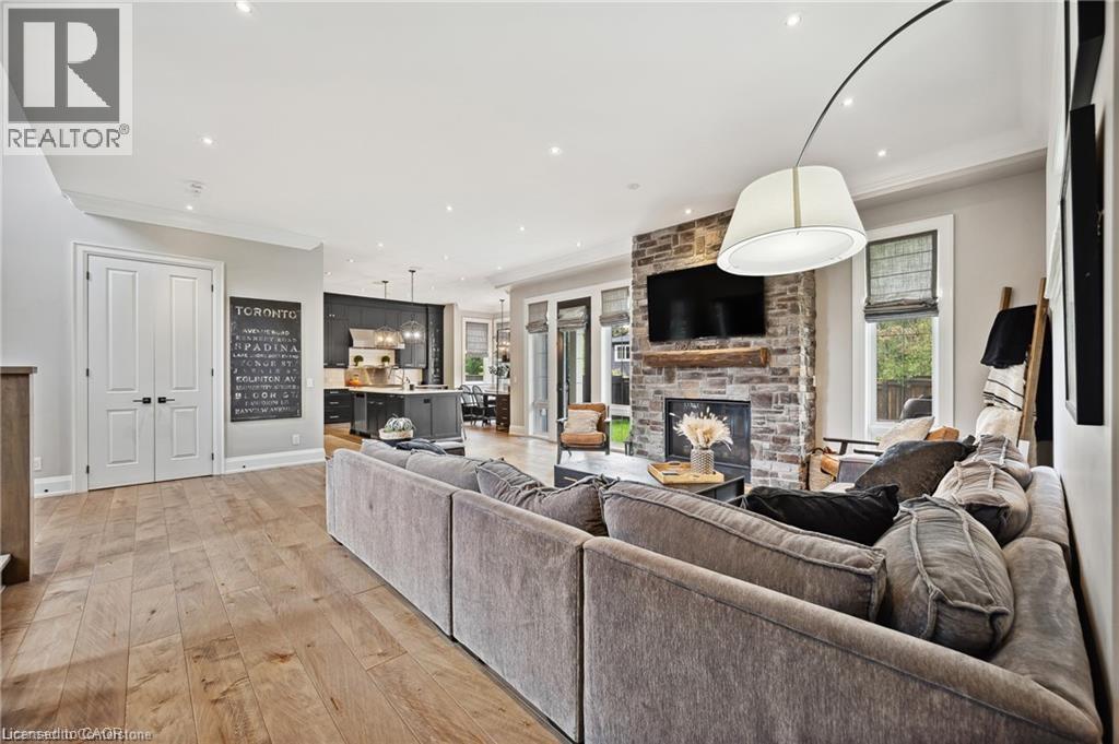 Welcome to 1247 Wood Place, a stunning custom home designed by renowned architects Willmott & Strickland. Set on a premium pie-shaped lot, this luxurious 2-storey detached home offers approx. 5,700 sq. ft. of total living space (3,879 sq. ft. above grade plus a fully finished basement). The main level features a grand 2-storey foyer, hardwood floors, and a chef-inspired kitchen with quartz counters, high-end appliances (Wolf, Miele, Electrolux, KitchenAid), a butler’s pantry, and built-in wine fridge. The living room offers floor-to-ceiling windows, a gas fireplace, and walkout to a professionally landscaped backyard with covered lounge, gas fireplace, hot tub, and concrete deck. A main-floor office with custom cabinetry can also serve as a bedroom. Upstairs, the primary suite includes two walk-in closets and a spa-like 5-piece ensuite with heated floors, gas fireplace, and French doors. 3 additional bedrooms feature a Jack-and-Jill bath and a private ensuite, plus convenient second-floor laundry. The fully finished basement with luxury vinyl plank flooring adds a large rec room with built-in sound system, a gym, an additional bedroom, a 3-piece bath, and plenty of storage. Additional highlights include a double garage with 2 Tesla chargers and 200-amp service. Located on a quiet street with excellent curb appeal, this home offers a great blend of modern design and comfort. Located in a highly desirable Oakville location close to top schools, parks, shopping, and transit. (id:50787)