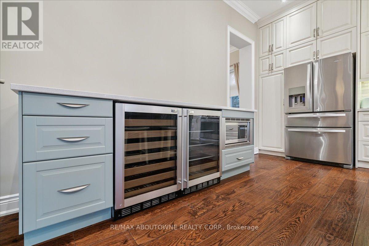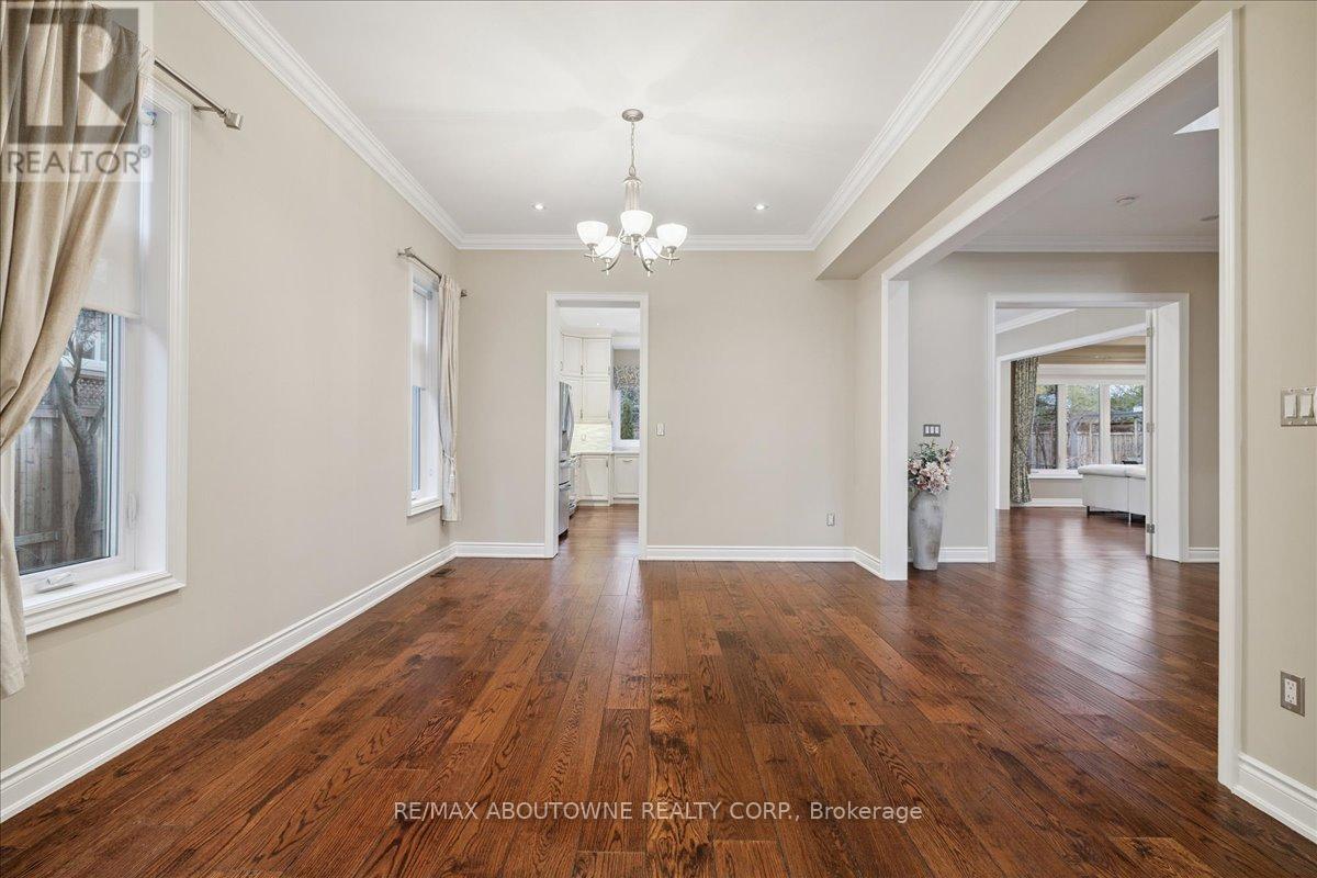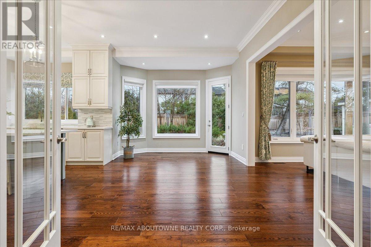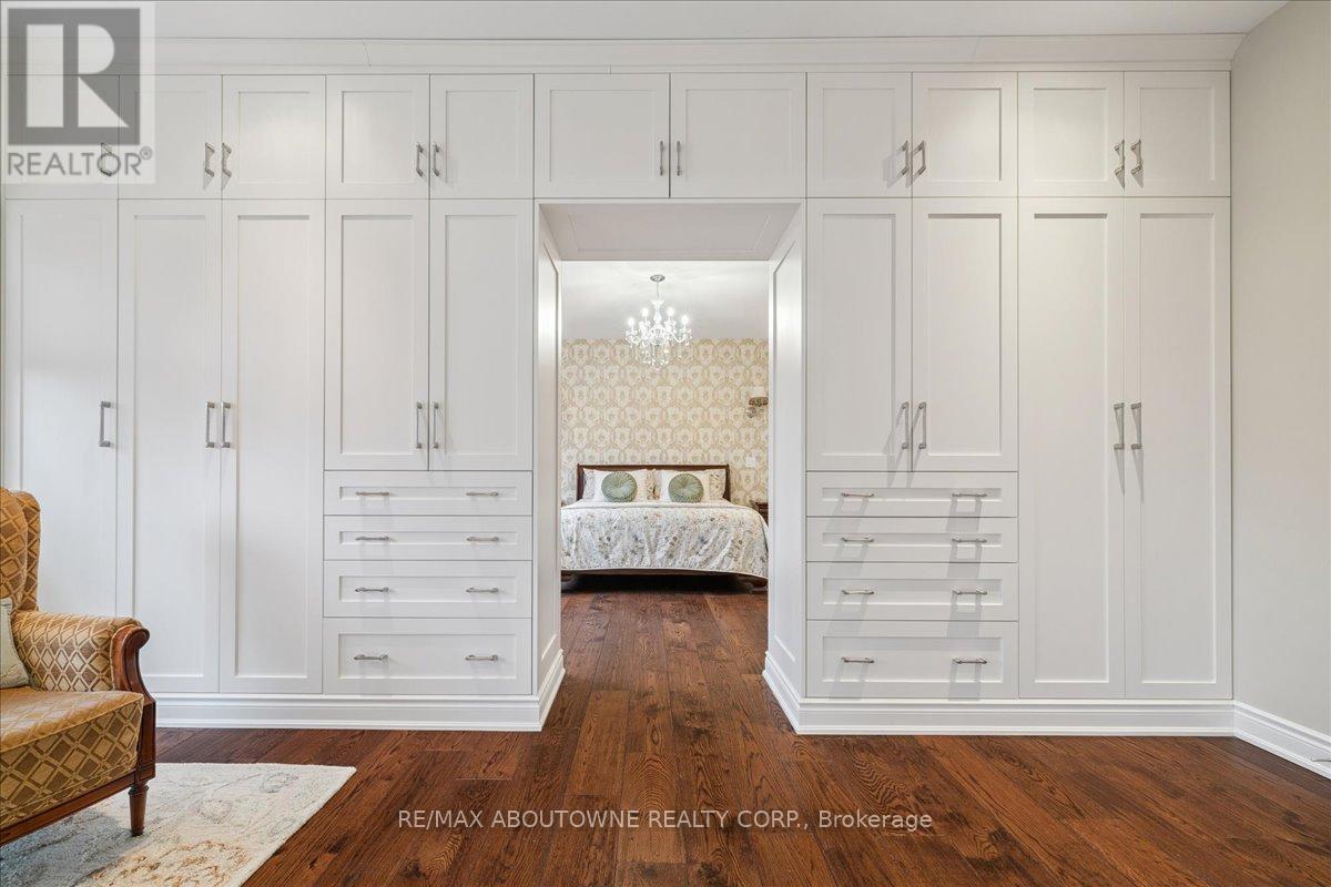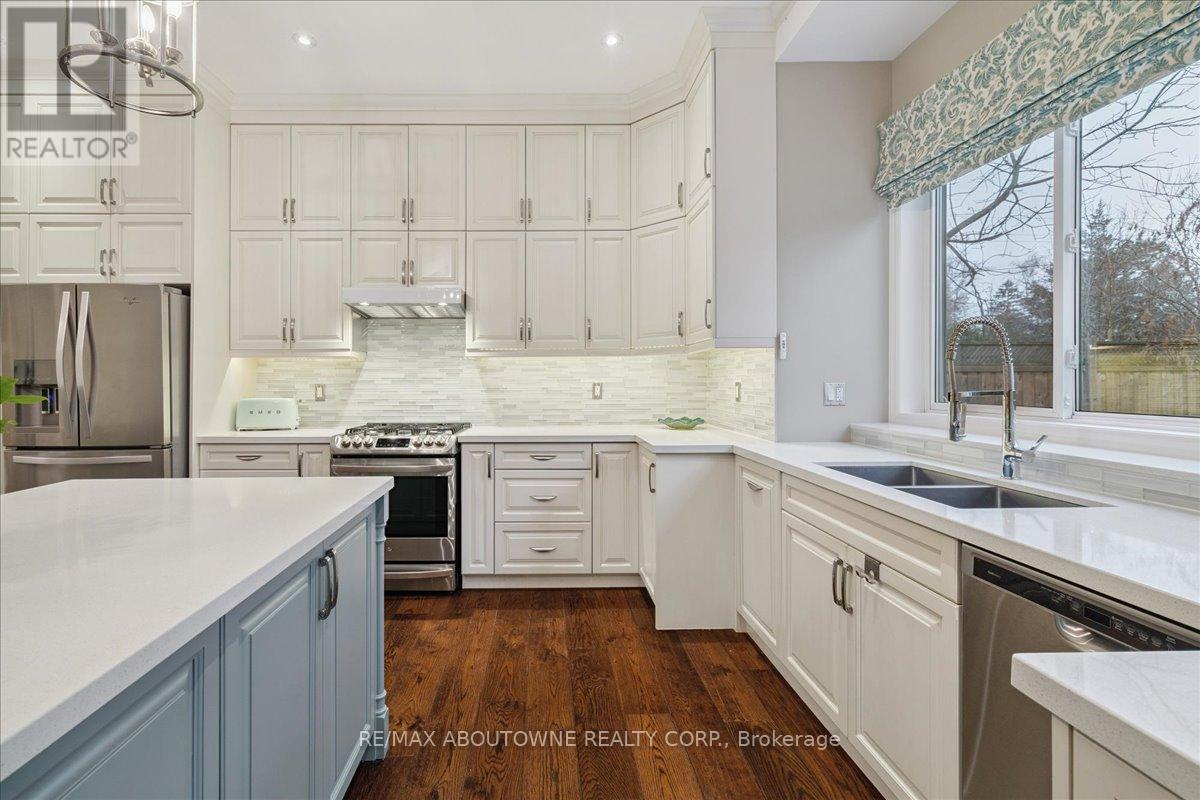 Welcome to this exceptional home in the heart of sought-after West Oakville, where timeless design meets modern comfort. Discover refined living, where elegance, space, and privacy come together on a premium lot with gated driveway, double car garage & landscaped front & back yards. This large home offers an ideal balance, perfect for both executive entertaining & a family home. An impressive cathedral-ceiling entrance with stunning chandelier fills the home with natural light & creates a grand first impression. The main floor features a spacious open-concept living area that offers elegant finishes & seamless flow throughout. The large gourmet kitchen with wine & bar fridge, & space for a large kitchen table for those informal get togethers is a home chef's delight. Family room, with gas fireplace and built-in bookshelves, can be closed off with large French doors. Separate dining & living rooms for more formal entertaining. A large main floor office, walk-in closet, powder room & mud room with access to the attached double car garage complete this level. The second floor delivers comfort & privacy for family members & guests alike. The primary bedroom has ample storage with beautifully designed built-in closets, a separate walk-in closet & 5-pc ensuite. Each bedroom is generously sized. Two bedrooms share a 5-pc ensuite & the 4th bedroom offers a 4-pc ensuite & walk-in closet. The beautifully finished walk-out basement provides incredible versatility, complete with in-law suite capability, good size bedroom with large walk-in closet, 3-pc bath, entertaining area, & kitchenette, ideal for multi-generational living, extended family, or potential income opportunities. Located in one of Oakville's most desirable neighbourhoods, close to top-rated schools, parks, lakefront trails, Walmart, Metro, LCBO & QEW, this home offers the perfect blend of luxury, functionality, & lifestyle. A rare opportunity in West Oakville - don't miss your chance to call it home. (id:50787)