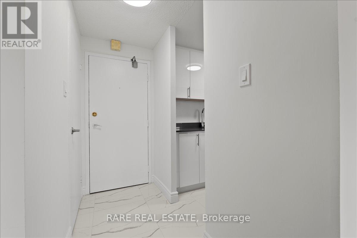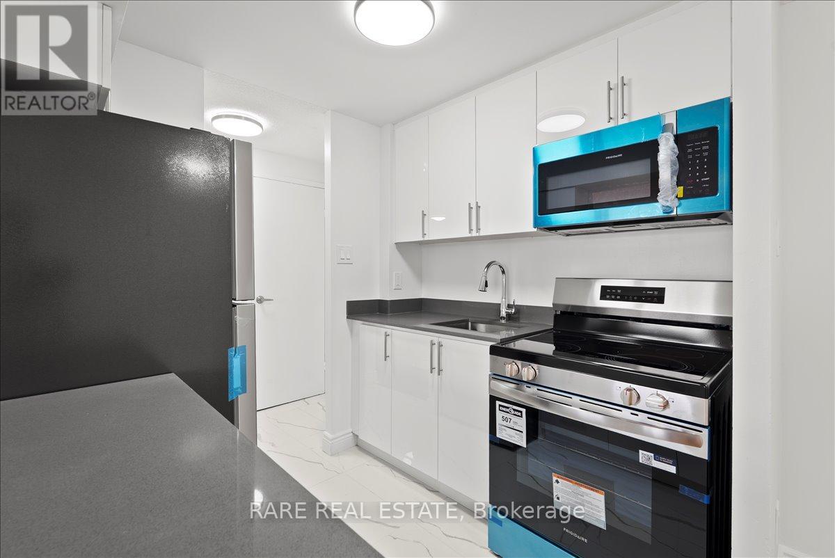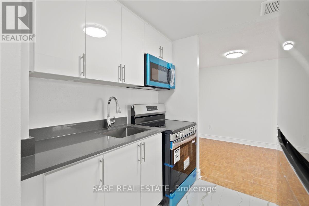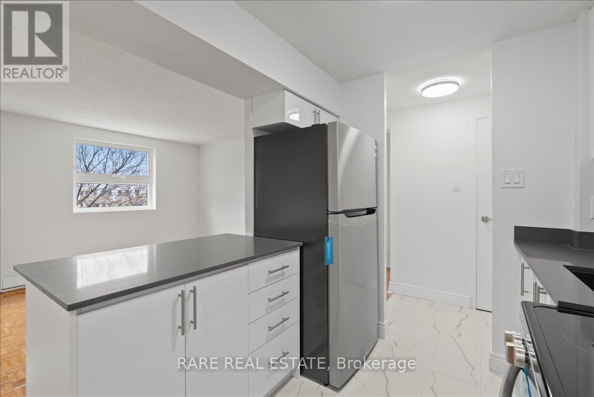 This fully renovated and freshly painted 1 bedroom suite delivers a clean, modern living experience with elevated finishes throughout. The thoughtfully designed layout features a sleek kitchen complete with quartz countertops, stainless steel appliances, ceramic tile backsplash, and upgraded cabinetry, along with a double sink and tall designer faucet. The refreshed bathroom is finished with contemporary ceramic tile, updated fixtures, and a modern vanity with a quartz countertop. The space feels bright and move-in ready. Set within a secure, well-maintained building with a welcoming on-site management team, residents also enjoy access to newly renovated shared laundry facilities, a children's playground right on the grounds, and lush greenery that creates a quiet, relaxed atmosphere. Ideally positioned close to public transit, schools, shopping, and major highways, this location offers seamless everyday convenience. Rent includes heat and water. Outdoor parking available for an additional monthly fee of $100. (id:50787)
