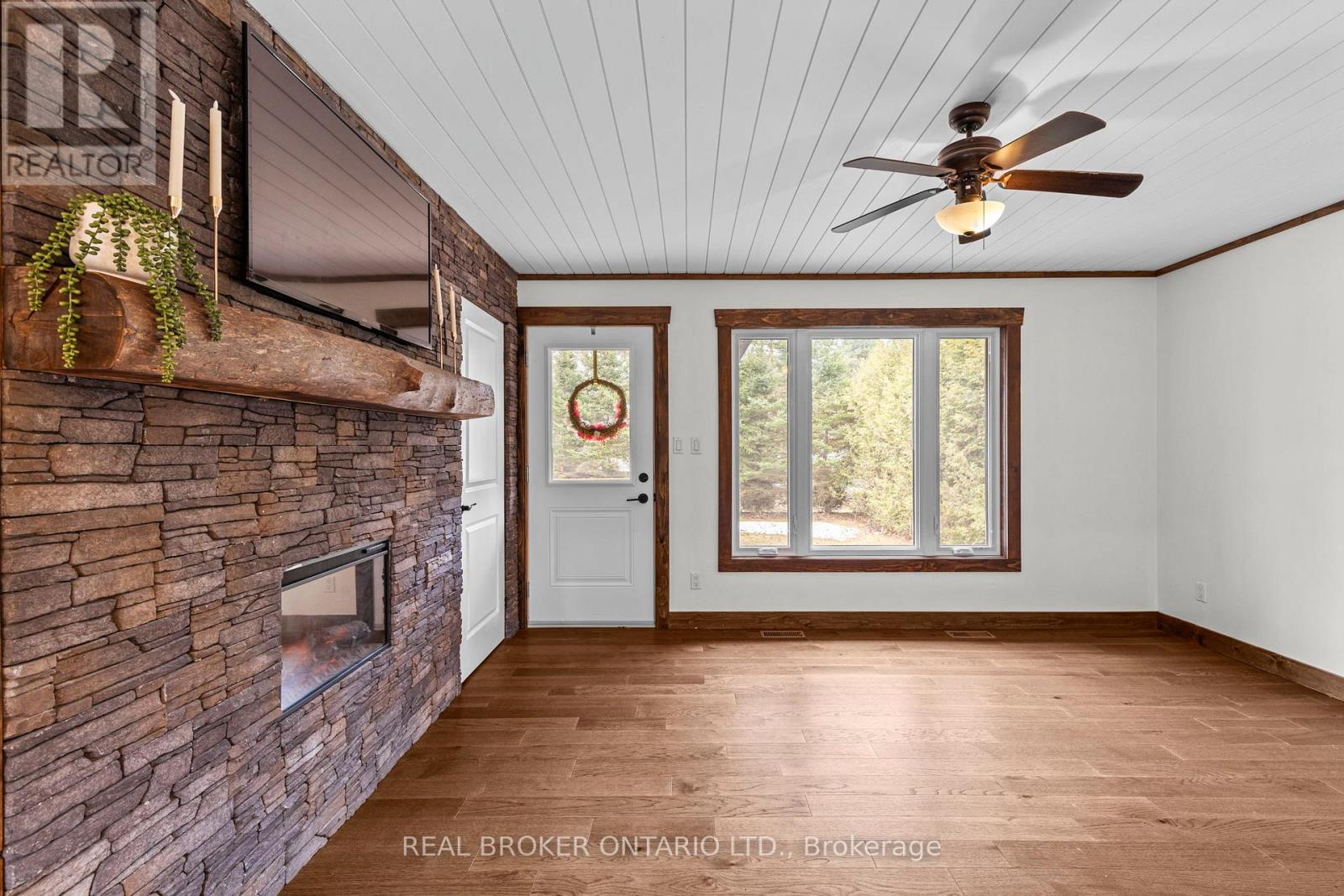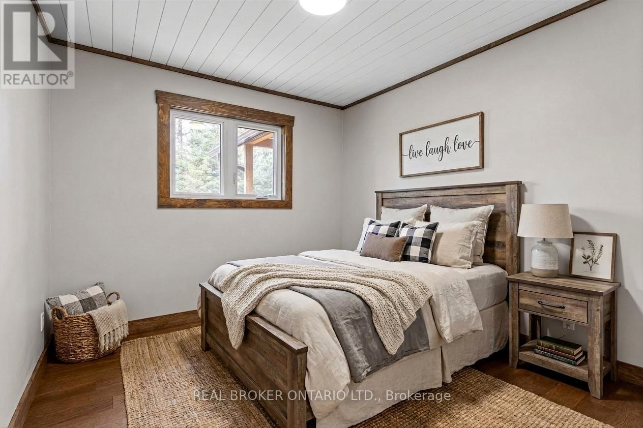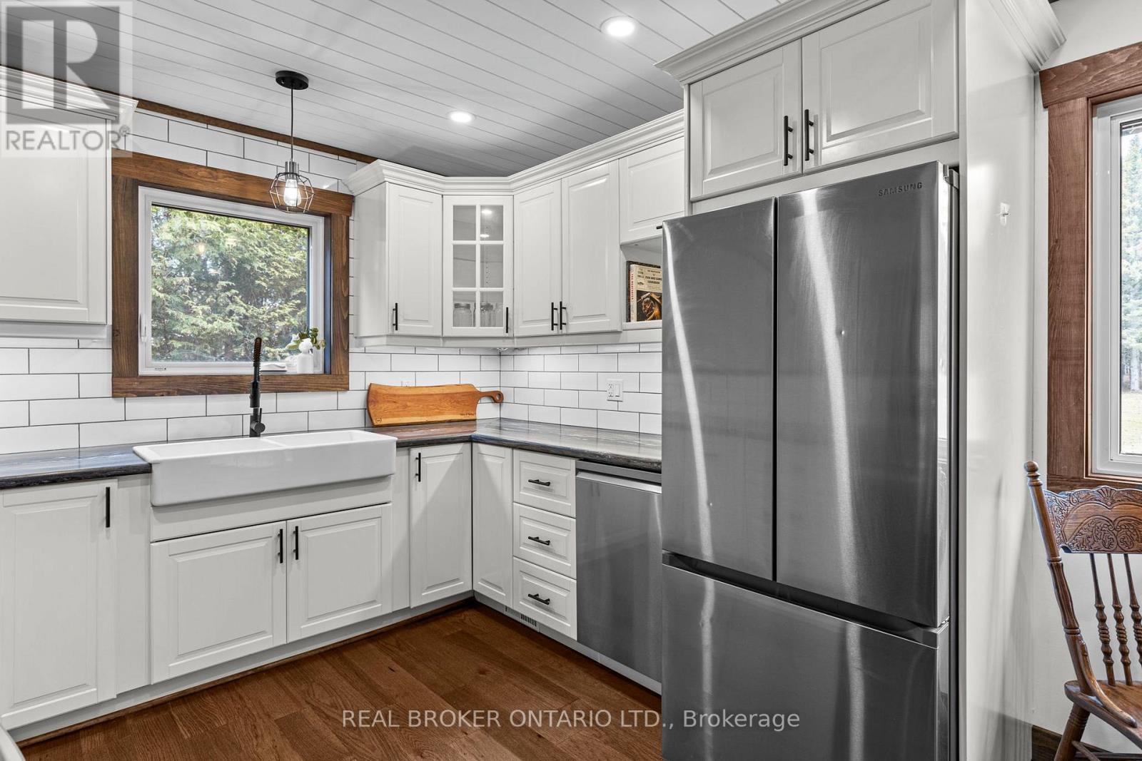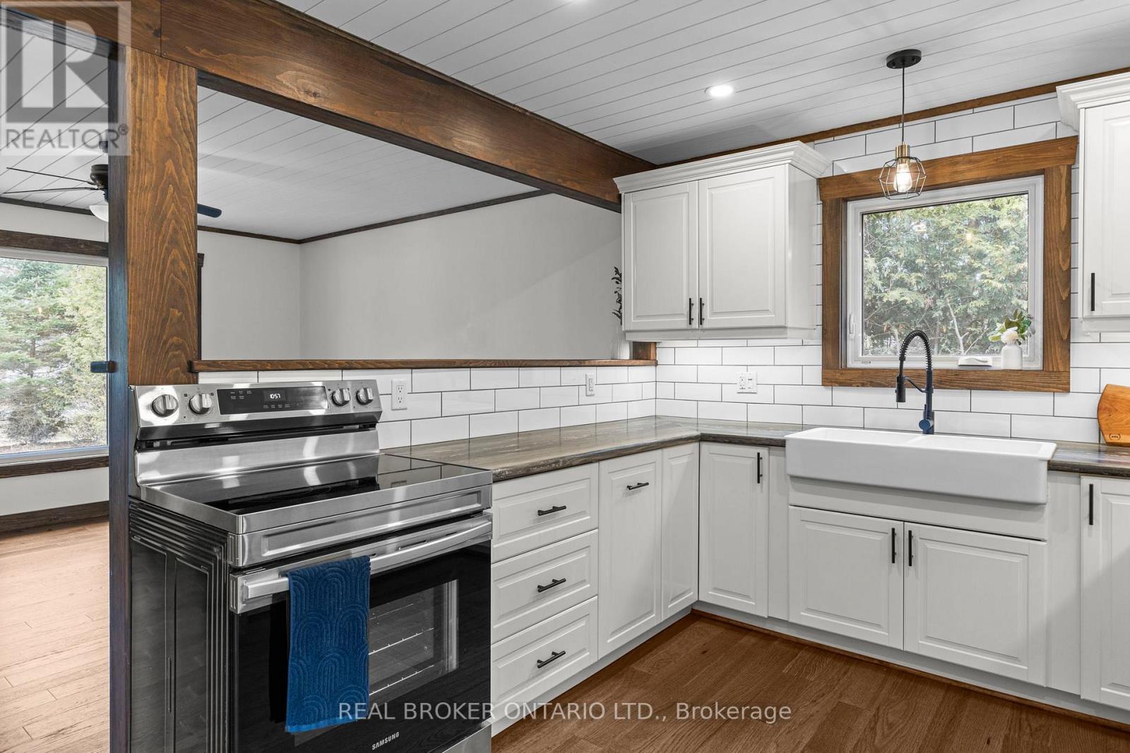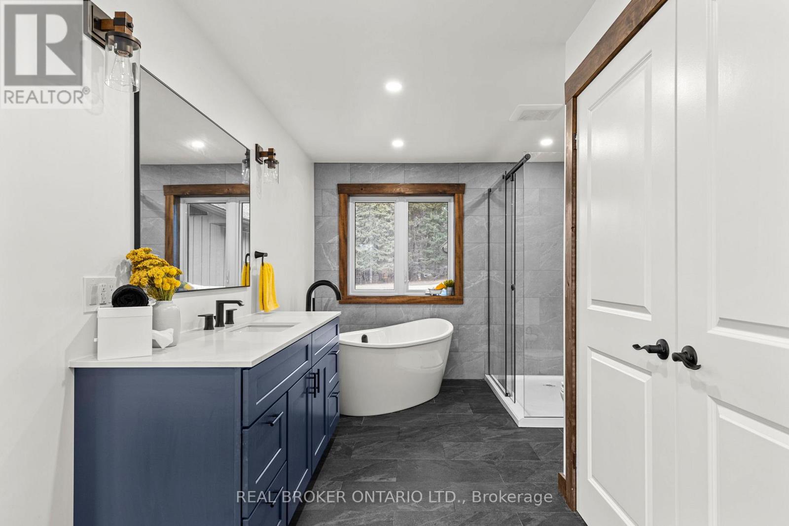 Check Out This Stunning Bungalow in Algonquin Highlands.Welcome to 1401 North Shore Rd, a turnkey rustic-modern bungalow offering luxury living in cottage country. This stunning 3-bedroom, 2-bathroom home features an open-concept layout highlighted by a floor-to-ceiling stacked stone fireplace, warm hardwood floors, and exposed timber beams. The gourmet kitchen boasts white shaker cabinets, a farmhouse sink, and stainless appliances - all flowing seamlessly into the living and dining areas, perfect for entertaining.The master suite is a true retreat, complete with a gorgeous private ensuite featuring a freestanding soaker tub, glass walk-in shower, and double stone vanity. A second full bathroom serves the remaining two bedrooms with the same quality finishes throughout. The convenience of main floor laundry rounds out the thoughtful, functional layout. Adding even more value, the property includes a 2022-built detached shop - ideal for hobbyists, tradespeople, or anyone in need of serious storage and workspace. The full unfinished basement presents an incredible opportunity to expand your living space, whether you envision a recreation room, additional bedrooms, a home gym, or more storage - the potential is entirely yours to define. Enjoy the outdoors from the beautiful timber-frame covered porch on this private, treed lot. Located near Beech Lake, Maple Lake, and local trails, this move-in ready masterpiece is the perfect year-round home. (id:50787)
