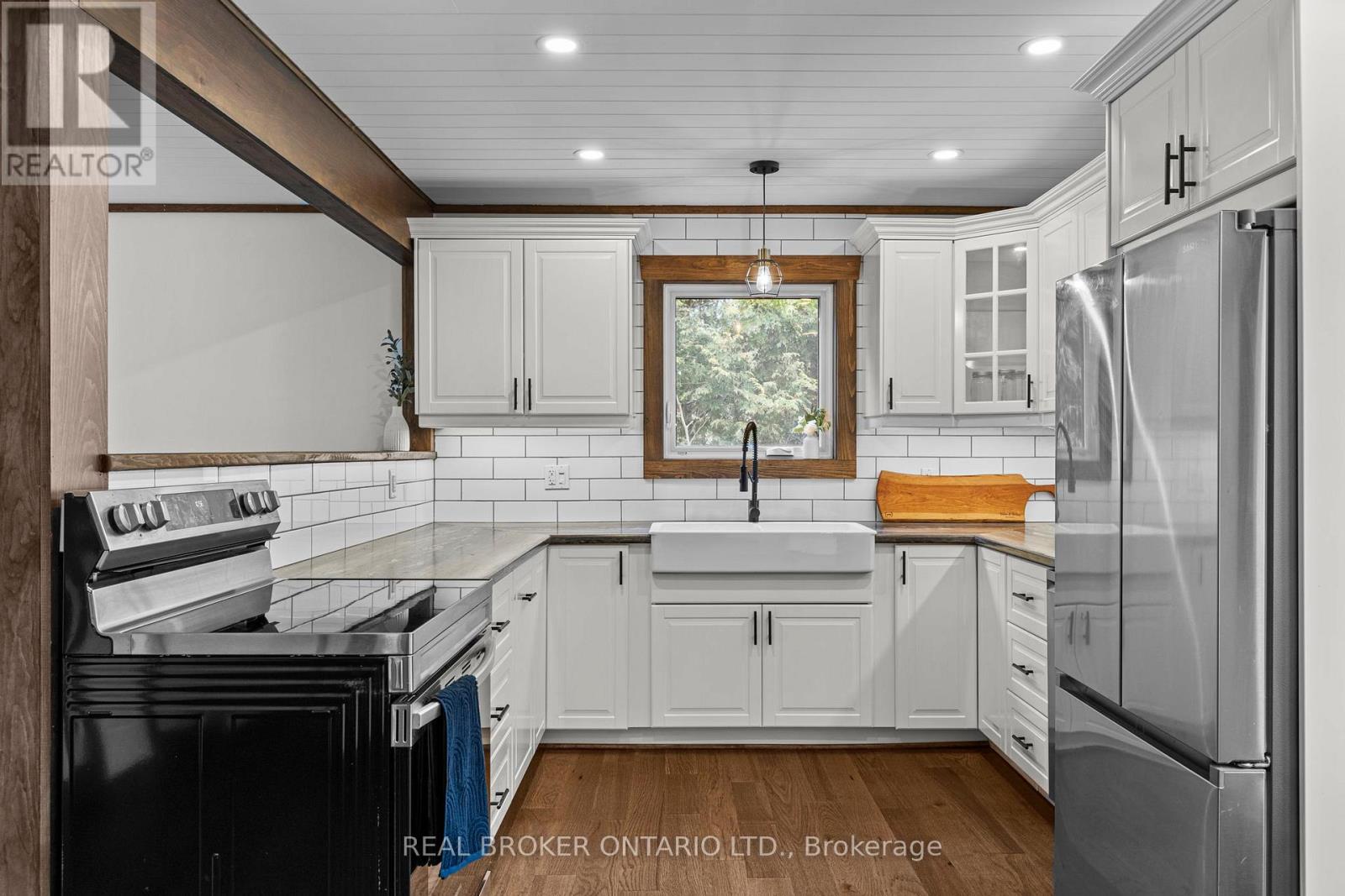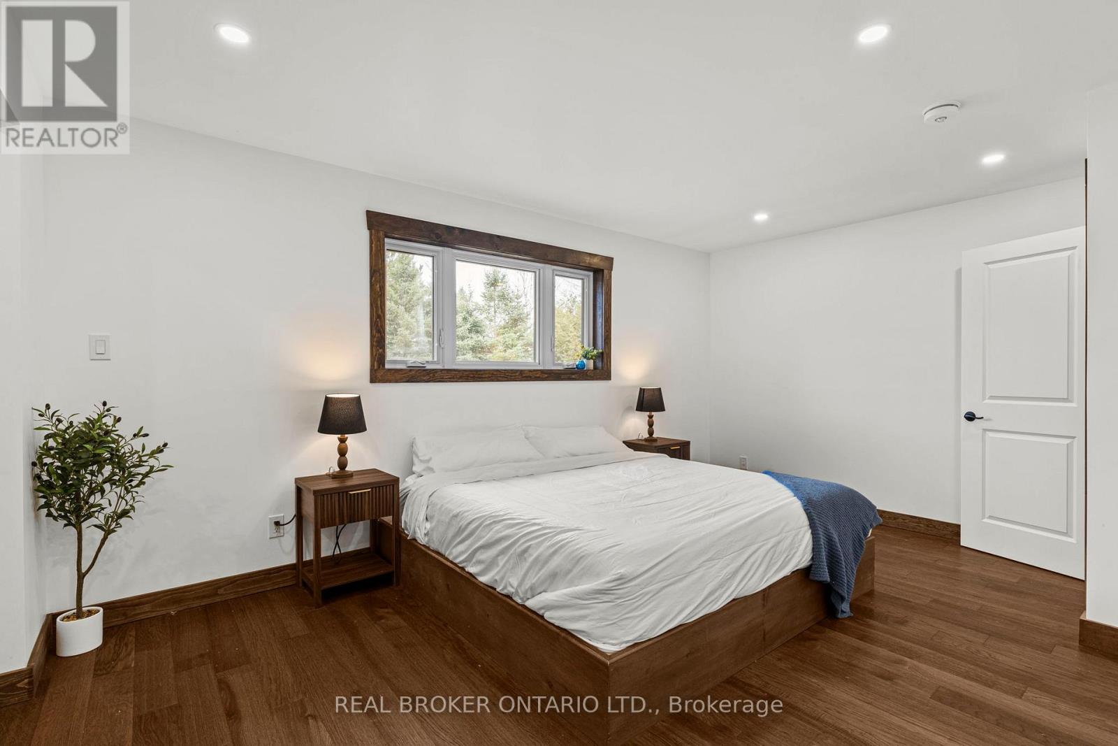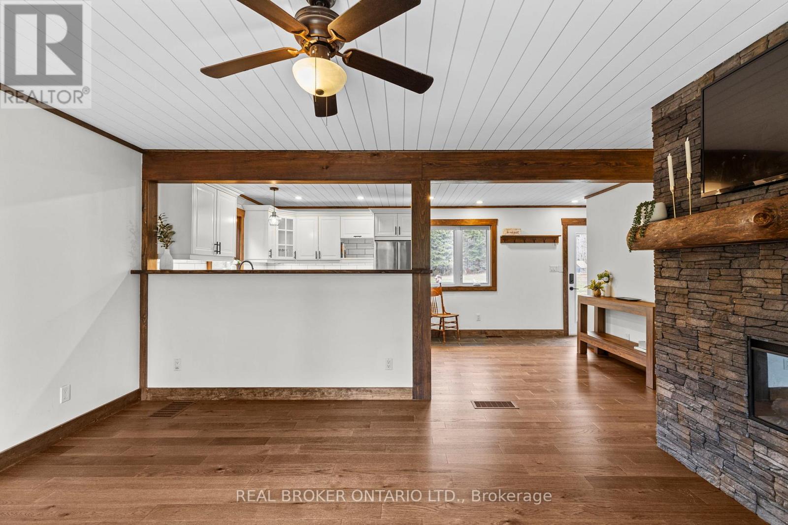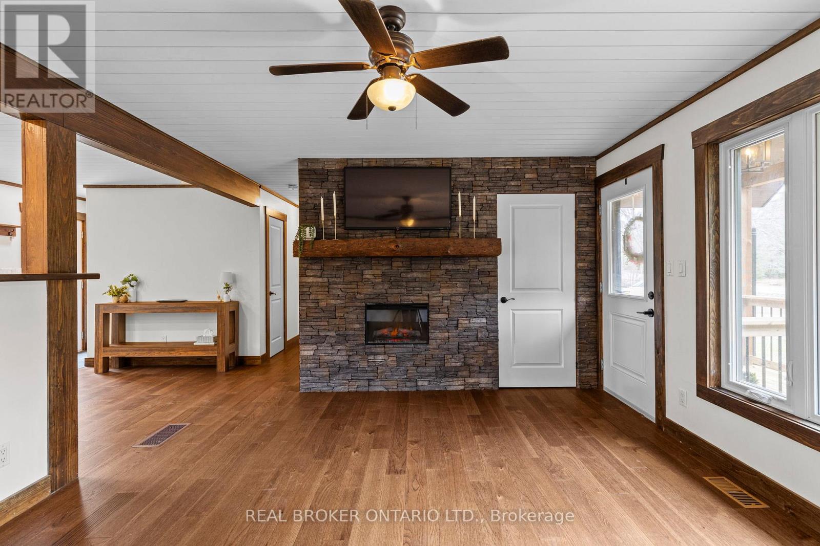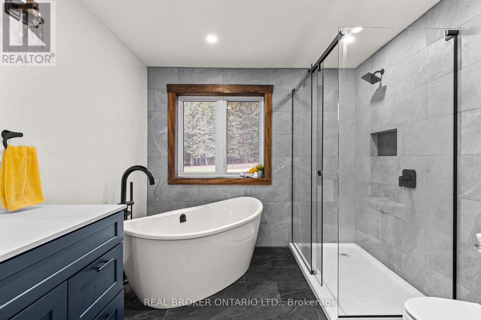 Check Out This Stunning Bungalow in Algonquin Highlands.Welcome to 1401 North Shore Rd, a turnkey rustic-modern bungalow offering luxury living in cottage country. This stunning 3-bedroom, 2-bathroom home features an open-concept layout highlighted by a floor-to-ceiling stacked stone fireplace, warm hardwood floors, and exposed timber beams. The gourmet kitchen boasts white shaker cabinets, a farmhouse sink, and stainless appliances - all flowing seamlessly into the living and dining areas, perfect for entertaining.The master suite is a true retreat, complete with a gorgeous private ensuite featuring a freestanding soaker tub, glass walk-in shower, and double stone vanity. A second full bathroom serves the remaining two bedrooms with the same quality finishes throughout. The convenience of main floor laundry rounds out the thoughtful, functional layout. Adding even more value, the property includes a 2022-built detached shop - ideal for hobbyists, tradespeople, or anyone in need of serious storage and workspace. The full unfinished basement presents an incredible opportunity to expand your living space, whether you envision a recreation room, additional bedrooms, a home gym, or more storage - the potential is entirely yours to define. Enjoy the outdoors from the beautiful timber-frame covered porch on this private, treed lot. Located near Beech Lake, Maple Lake, and local trails, this move-in ready masterpiece is the perfect year-round home. (id:50787)