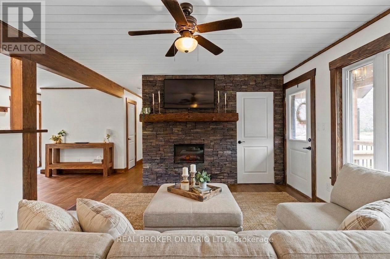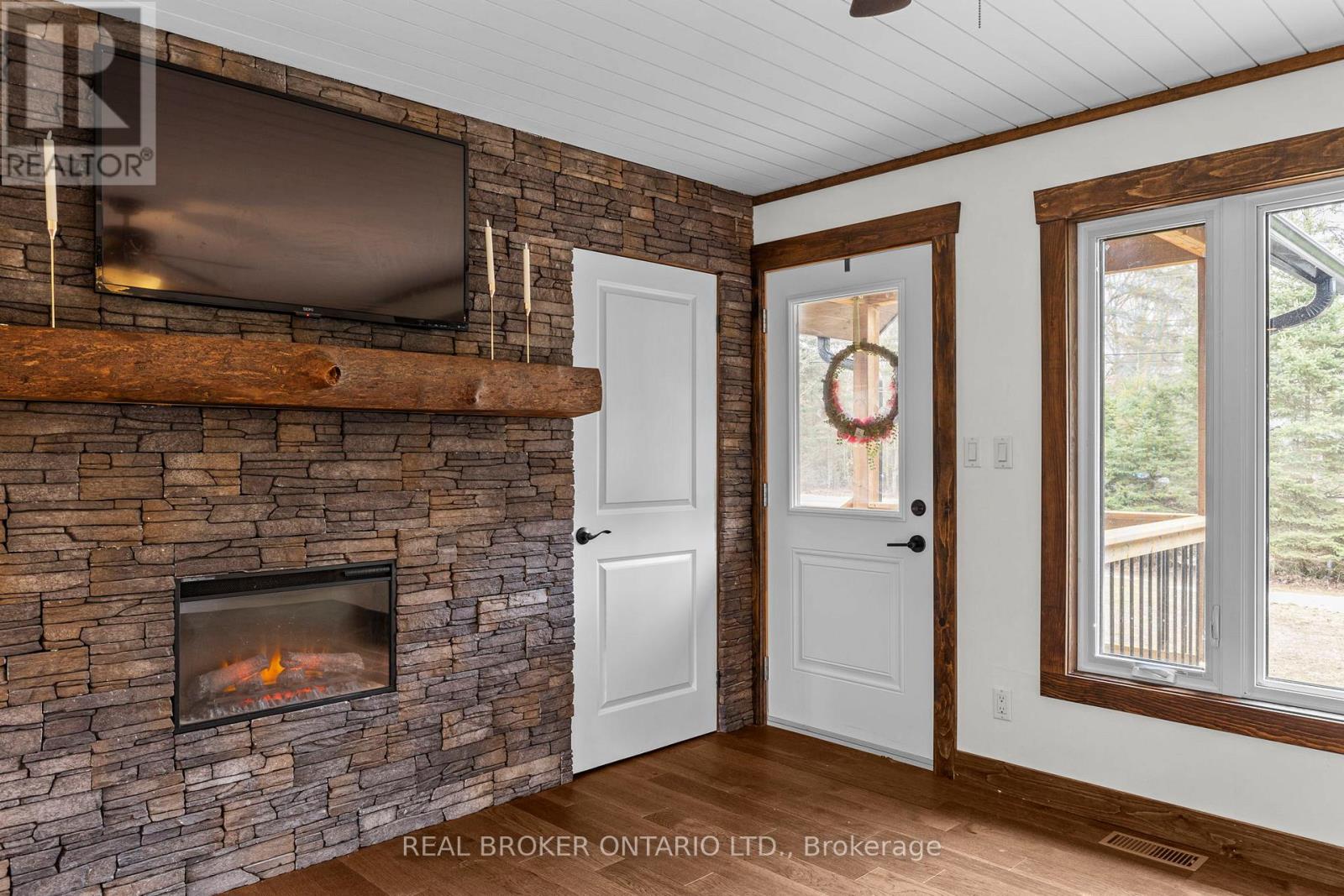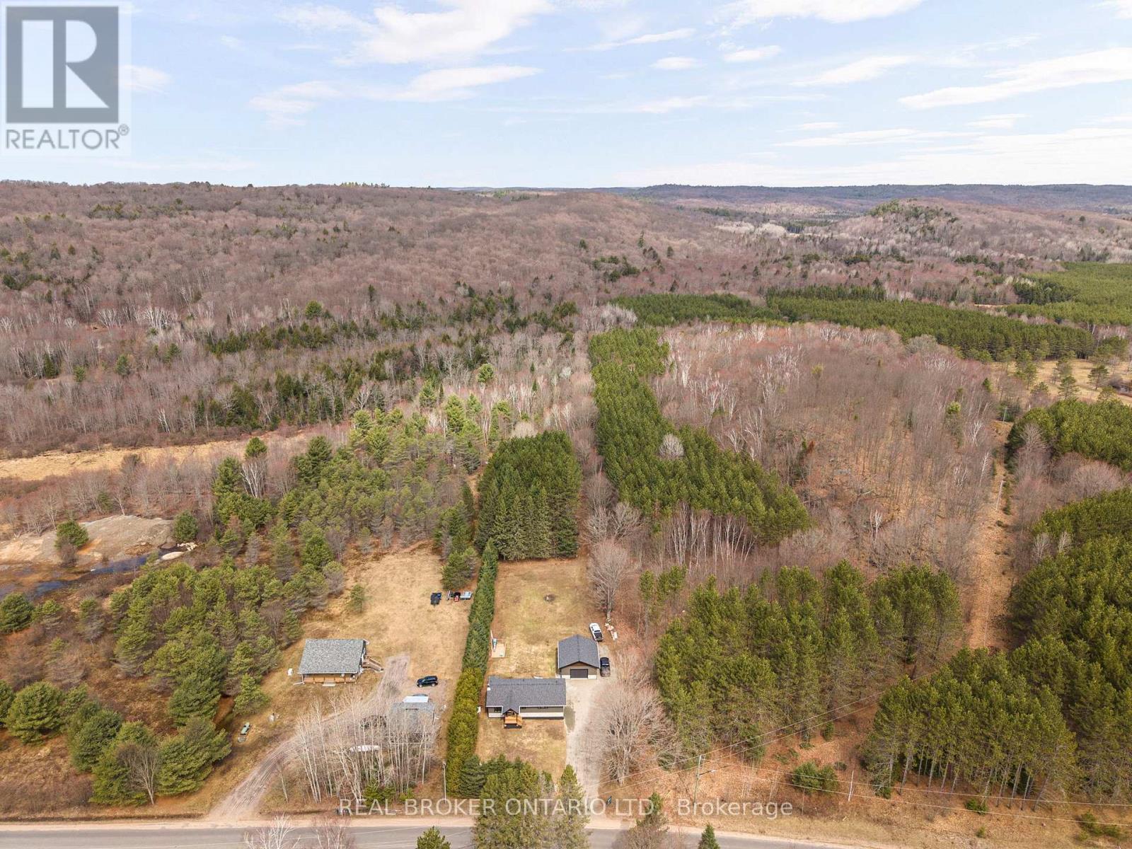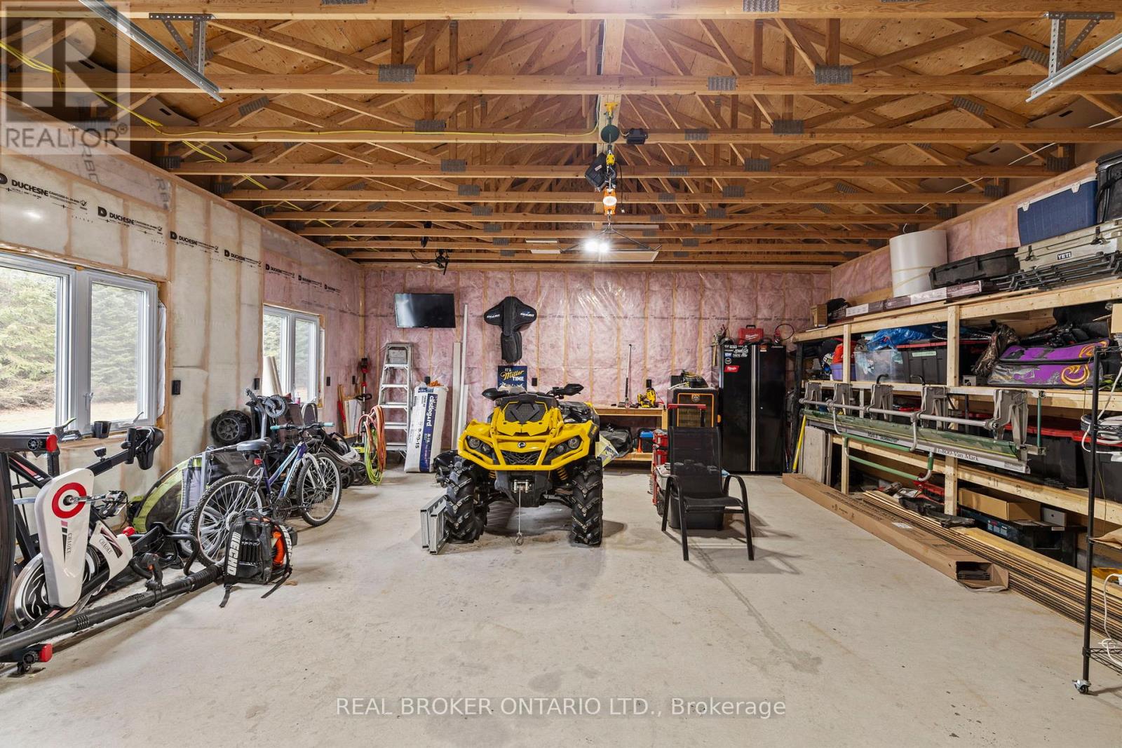 Check Out This Stunning Bungalow in Algonquin Highlands.Welcome to 1401 North Shore Rd, a turnkey rustic-modern bungalow offering luxury living in cottage country. This stunning 3-bedroom, 2-bathroom home features an open-concept layout highlighted by a floor-to-ceiling stacked stone fireplace, warm hardwood floors, and exposed timber beams. The gourmet kitchen boasts white shaker cabinets, a farmhouse sink, and stainless appliances - all flowing seamlessly into the living and dining areas, perfect for entertaining.The master suite is a true retreat, complete with a gorgeous private ensuite featuring a freestanding soaker tub, glass walk-in shower, and double stone vanity. A second full bathroom serves the remaining two bedrooms with the same quality finishes throughout. The convenience of main floor laundry rounds out the thoughtful, functional layout. Adding even more value, the property includes a 2022-built detached shop - ideal for hobbyists, tradespeople, or anyone in need of serious storage and workspace. The full unfinished basement presents an incredible opportunity to expand your living space, whether you envision a recreation room, additional bedrooms, a home gym, or more storage - the potential is entirely yours to define. Enjoy the outdoors from the beautiful timber-frame covered porch on this private, treed lot. Located near Beech Lake, Maple Lake, and local trails, this move-in ready masterpiece is the perfect year-round home. (id:50787)