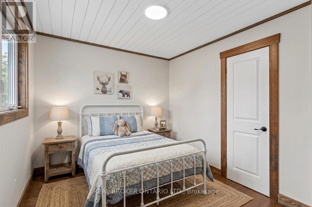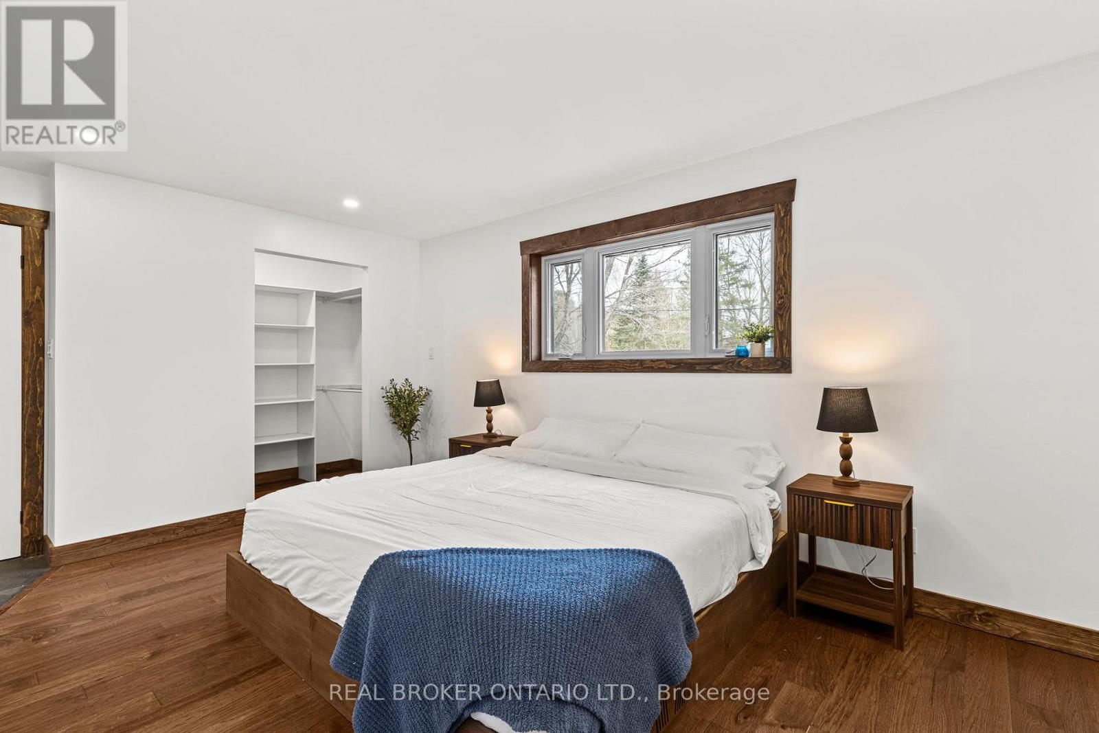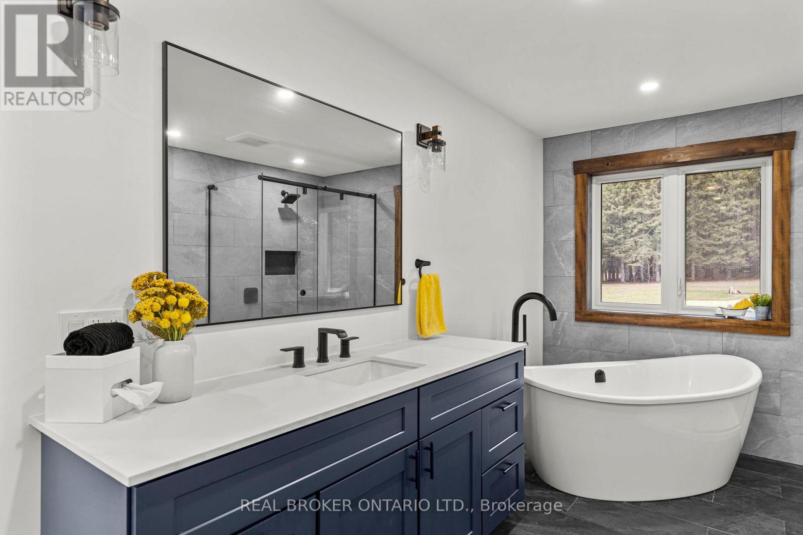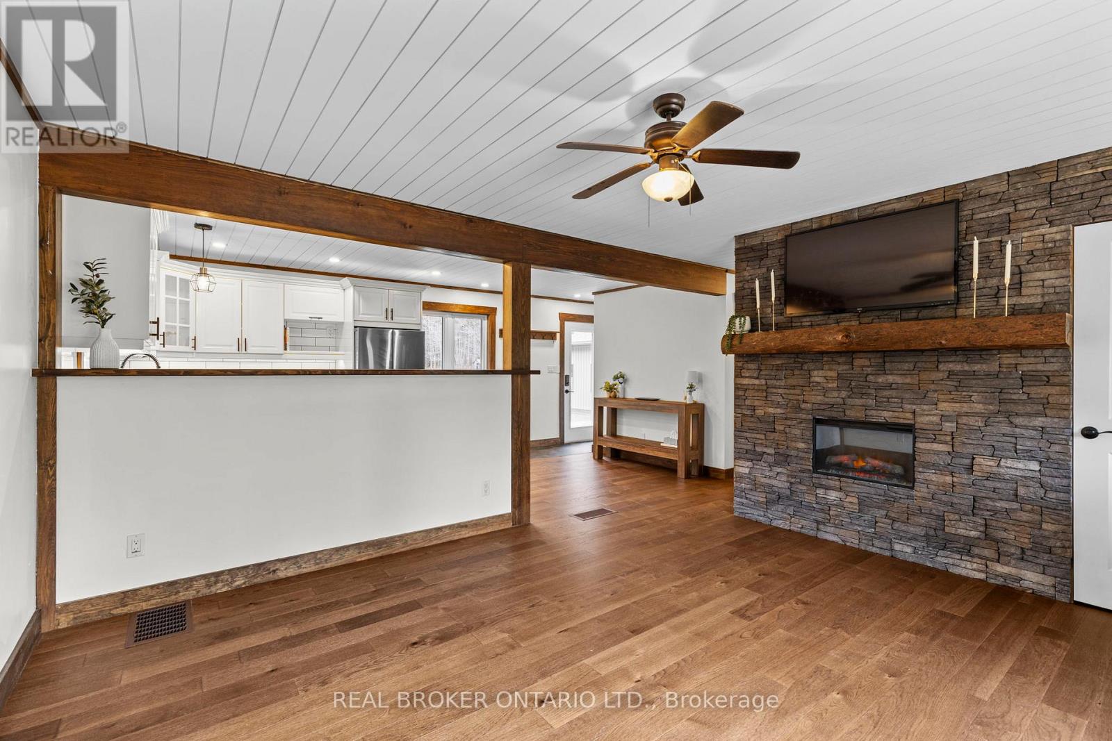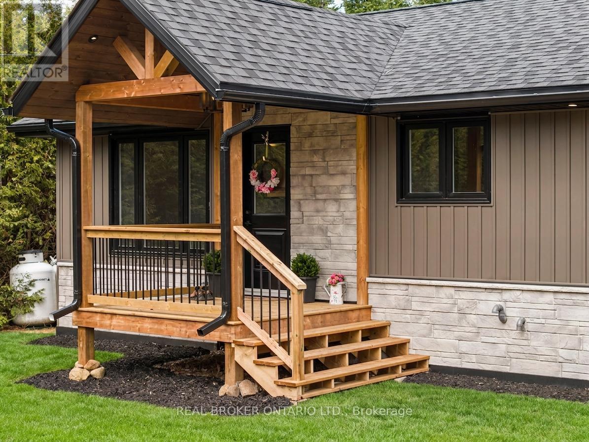 Check Out This Stunning Bungalow in Algonquin Highlands.Welcome to 1401 North Shore Rd, a turnkey rustic-modern bungalow offering luxury living in cottage country. This stunning 3-bedroom, 2-bathroom home features an open-concept layout highlighted by a floor-to-ceiling stacked stone fireplace, warm hardwood floors, and exposed timber beams. The gourmet kitchen boasts white shaker cabinets, a farmhouse sink, and stainless appliances - all flowing seamlessly into the living and dining areas, perfect for entertaining.The master suite is a true retreat, complete with a gorgeous private ensuite featuring a freestanding soaker tub, glass walk-in shower, and double stone vanity. A second full bathroom serves the remaining two bedrooms with the same quality finishes throughout. The convenience of main floor laundry rounds out the thoughtful, functional layout. Adding even more value, the property includes a 2022-built detached shop - ideal for hobbyists, tradespeople, or anyone in need of serious storage and workspace. The full unfinished basement presents an incredible opportunity to expand your living space, whether you envision a recreation room, additional bedrooms, a home gym, or more storage - the potential is entirely yours to define. Enjoy the outdoors from the beautiful timber-frame covered porch on this private, treed lot. Located near Beech Lake, Maple Lake, and local trails, this move-in ready masterpiece is the perfect year-round home. (id:50787)