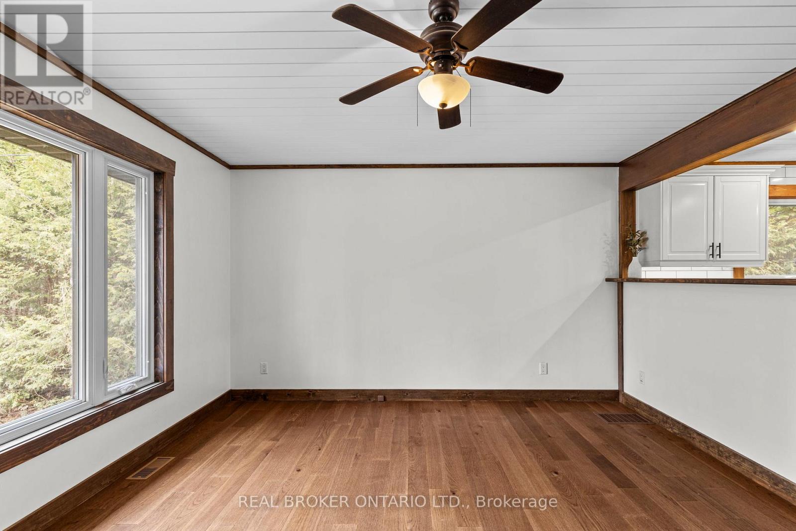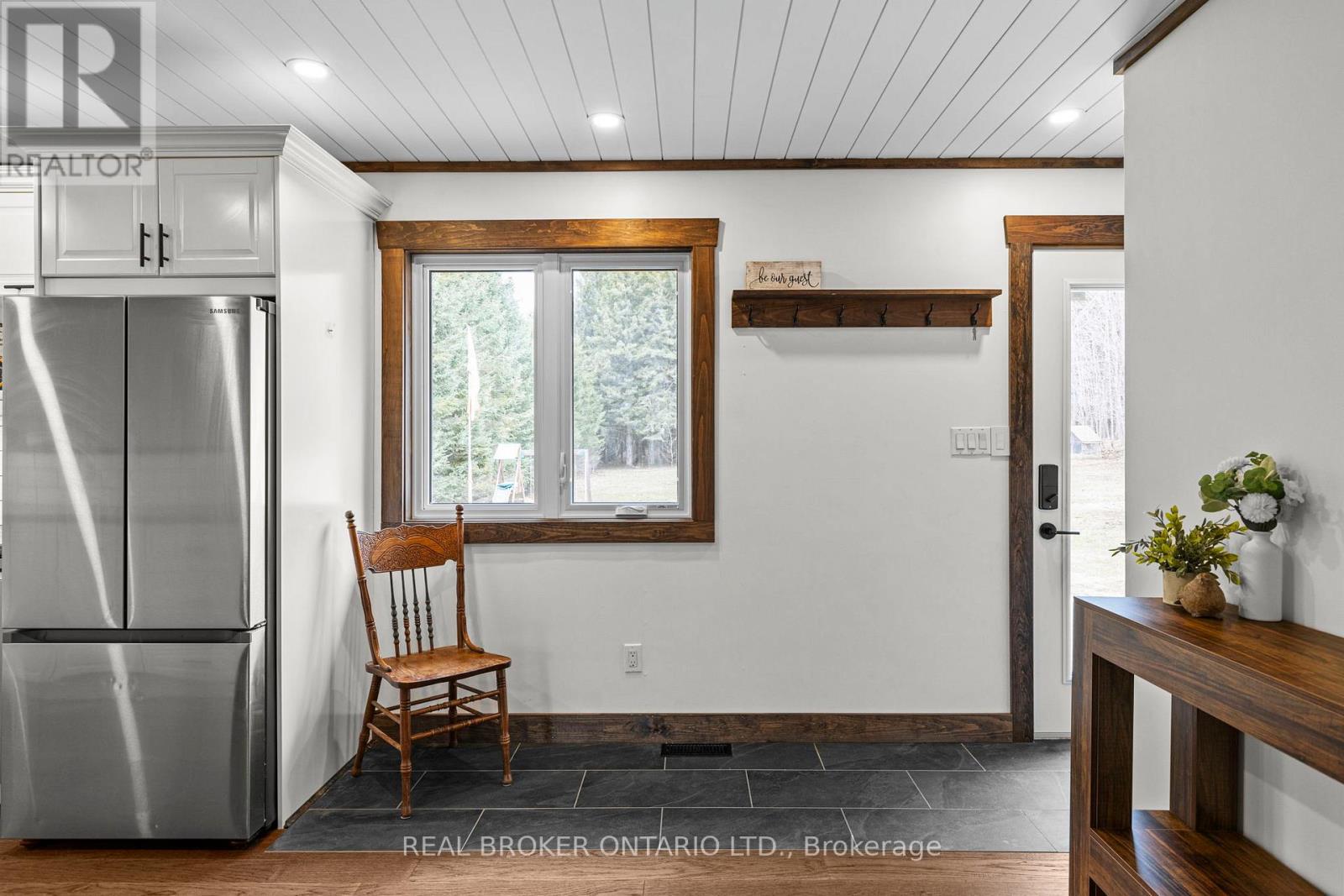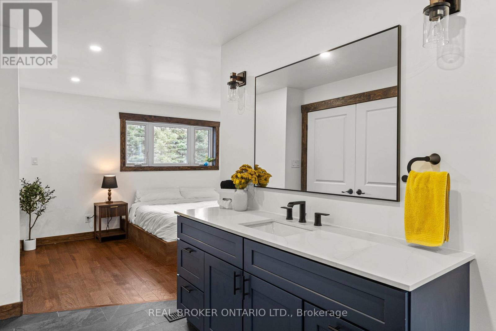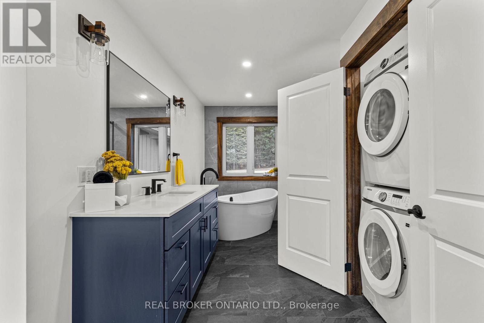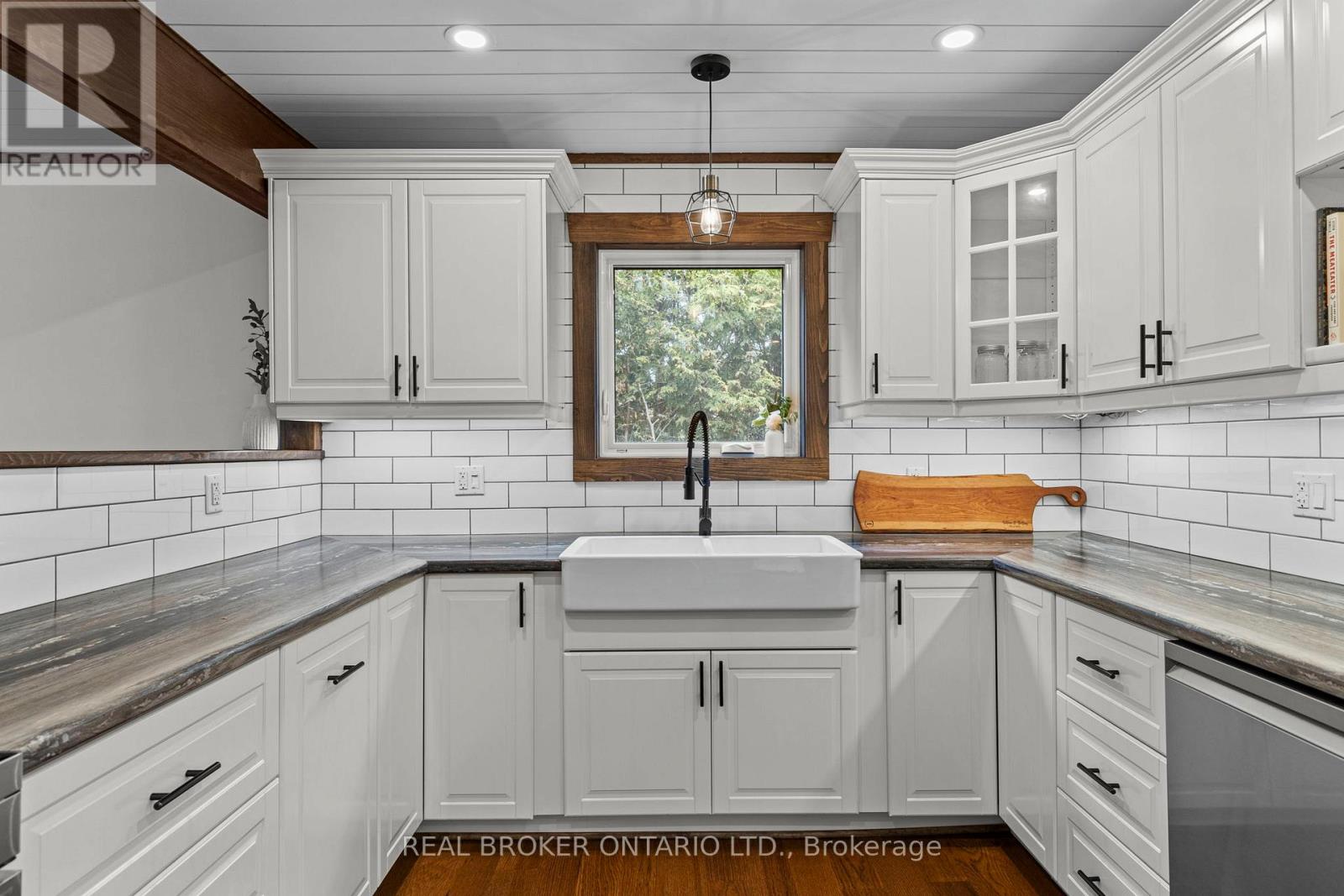 Check Out This Stunning Bungalow in Algonquin Highlands.Welcome to 1401 North Shore Rd, a turnkey rustic-modern bungalow offering luxury living in cottage country. This stunning 3-bedroom, 2-bathroom home features an open-concept layout highlighted by a floor-to-ceiling stacked stone fireplace, warm hardwood floors, and exposed timber beams. The gourmet kitchen boasts white shaker cabinets, a farmhouse sink, and stainless appliances - all flowing seamlessly into the living and dining areas, perfect for entertaining.The master suite is a true retreat, complete with a gorgeous private ensuite featuring a freestanding soaker tub, glass walk-in shower, and double stone vanity. A second full bathroom serves the remaining two bedrooms with the same quality finishes throughout. The convenience of main floor laundry rounds out the thoughtful, functional layout. Adding even more value, the property includes a 2022-built detached shop - ideal for hobbyists, tradespeople, or anyone in need of serious storage and workspace. The full unfinished basement presents an incredible opportunity to expand your living space, whether you envision a recreation room, additional bedrooms, a home gym, or more storage - the potential is entirely yours to define. Enjoy the outdoors from the beautiful timber-frame covered porch on this private, treed lot. Located near Beech Lake, Maple Lake, and local trails, this move-in ready masterpiece is the perfect year-round home. (id:50787)