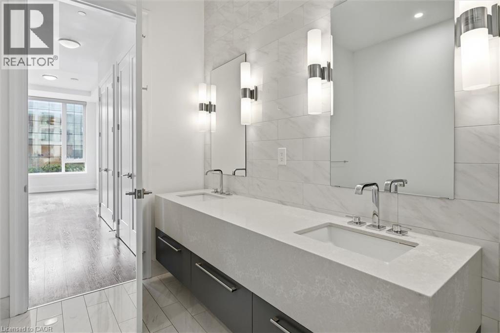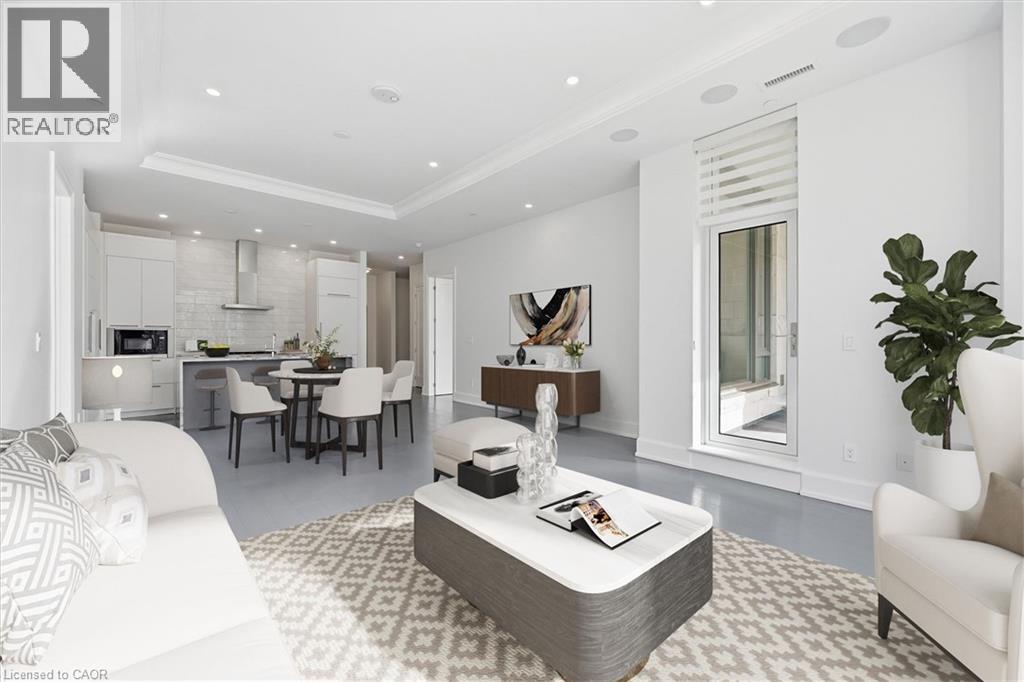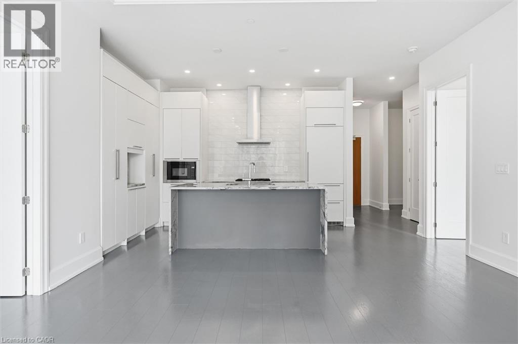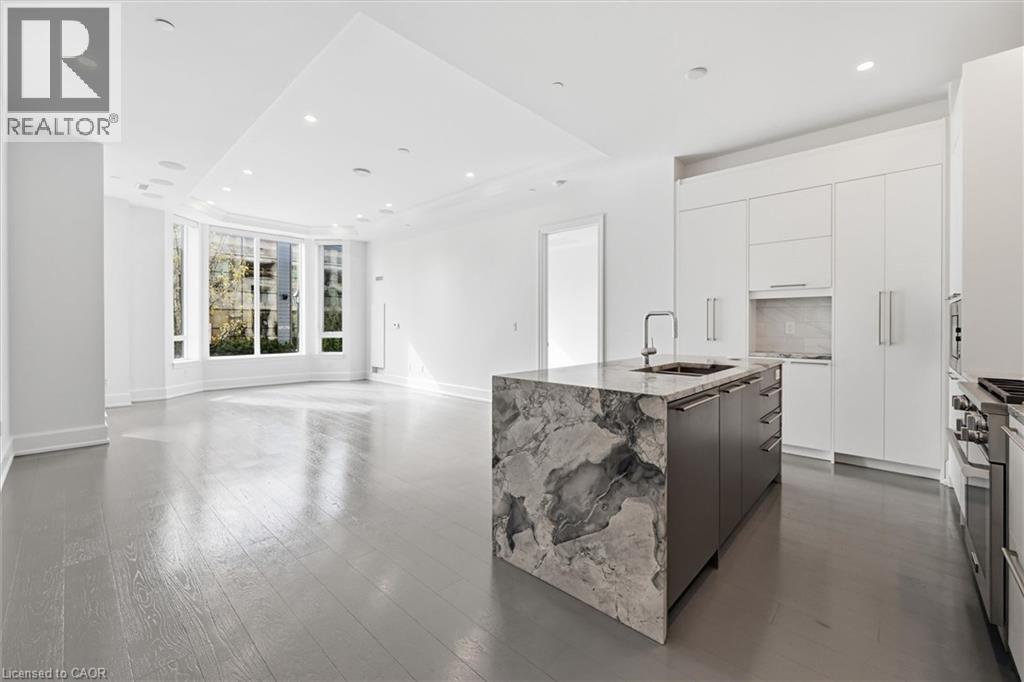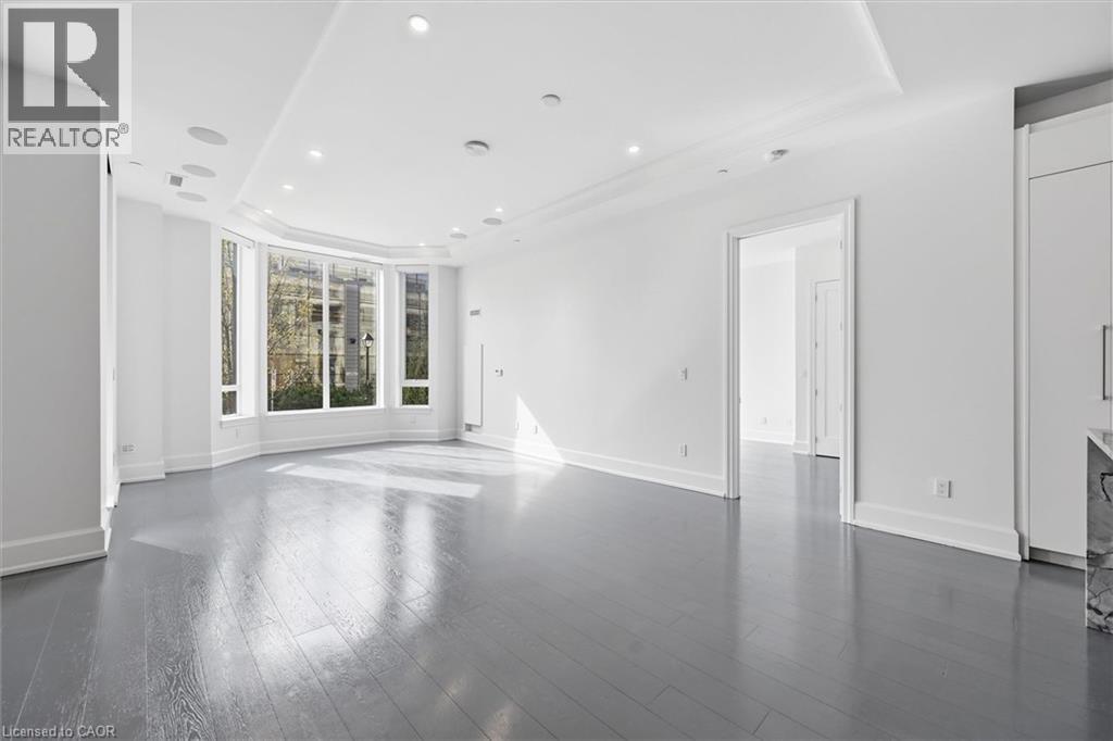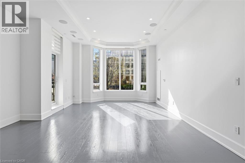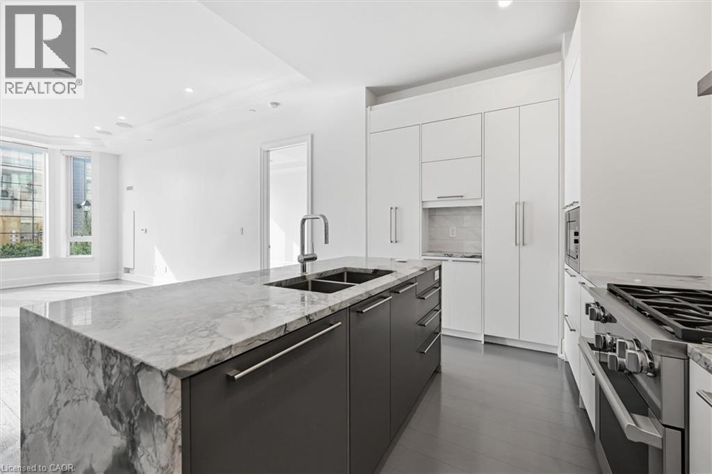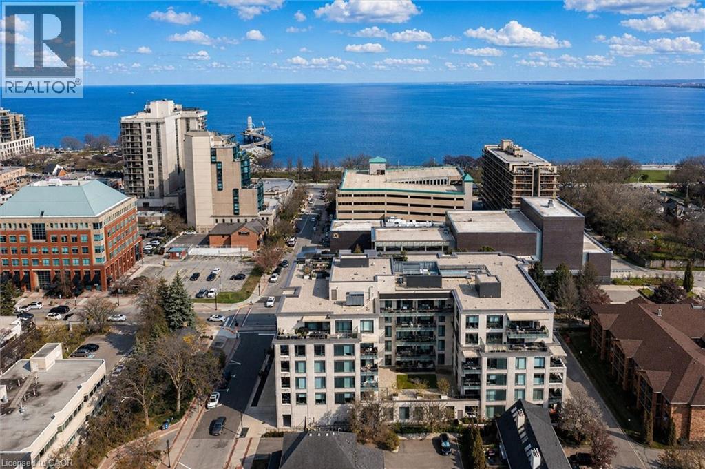 Experience 5-star executive living at the exclusive Saxony Condominium in the heart of downtown Burlington. Perfectly positioned across from the Performing Arts Centre and just steps to the lake, Spencer Smith Park, Joseph Brant Hospital, restaurants, boutique shopping, the pier, and Beachway trails, this premier location also offers quick highway access for added convenience. This stunning 1,517 sq. ft. suite showcases 10-ft ceilings, crown moulding, pot lights, automatic blinds, custom closets, and an elevated open-concept design. The gourmet kitchen features quartz countertops, built-in Miele appliances, an upgraded gas stove, and a striking waterfall island overlooking the spacious living and dining areas with built-in surround sound. Floor-to-ceiling windows fill the home with natural light and walk out to a large private terrace with a natural gas line and convenient street-level access. Two generous bedrooms each feature ensuites, including a luxurious primary retreat with a walk-in closet and a spa-inspired 5-piece ensuite. A den/office, powder room, laundry, walk-in storage closet, two side-by-side underground parking spaces, and a large locker complete the package. Residents enjoy premium amenities including a fitness room, theatre, party room, and an incredible rooftop terrace with fireplaces, water feature, BBQs, and panoramic lake. (id:50787)