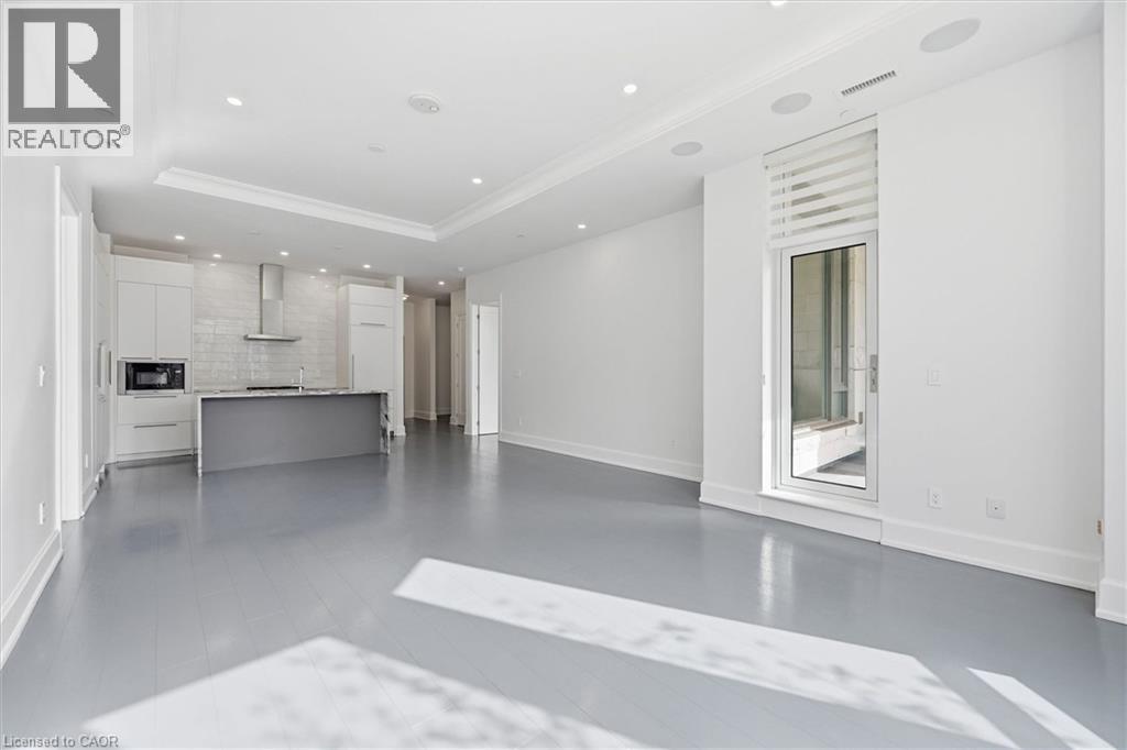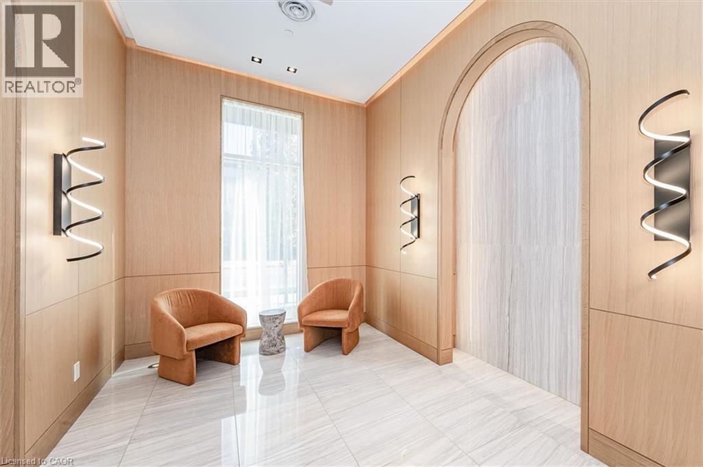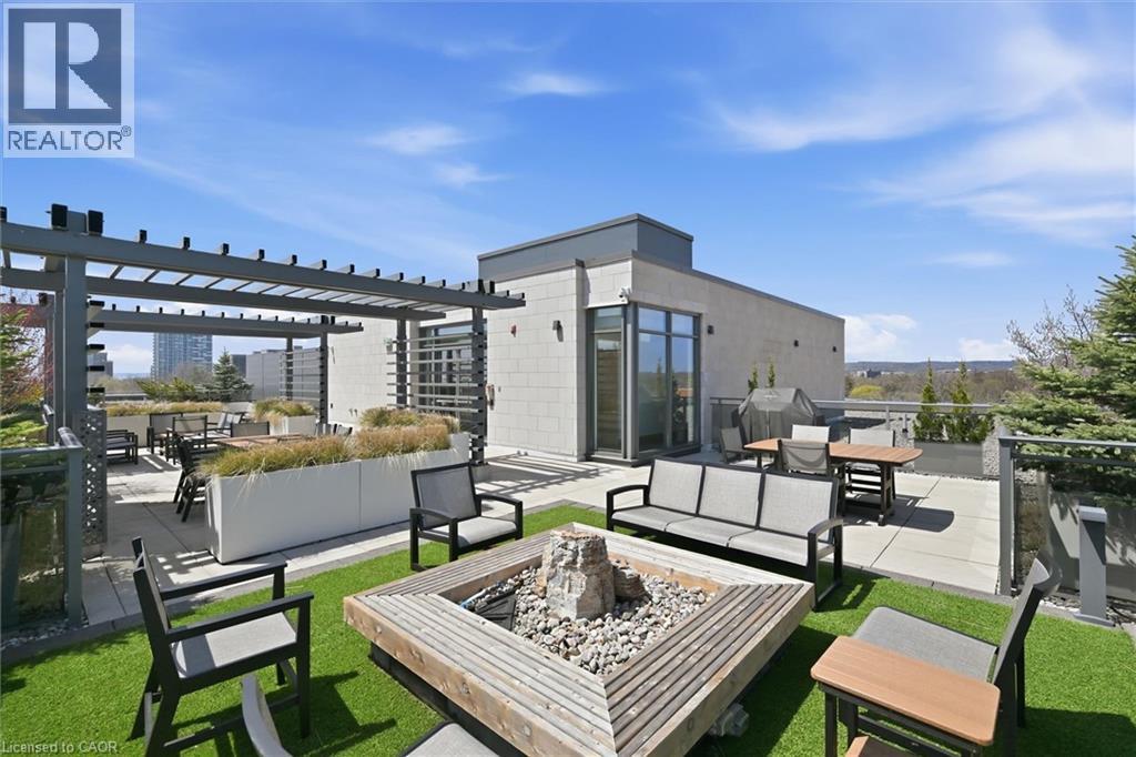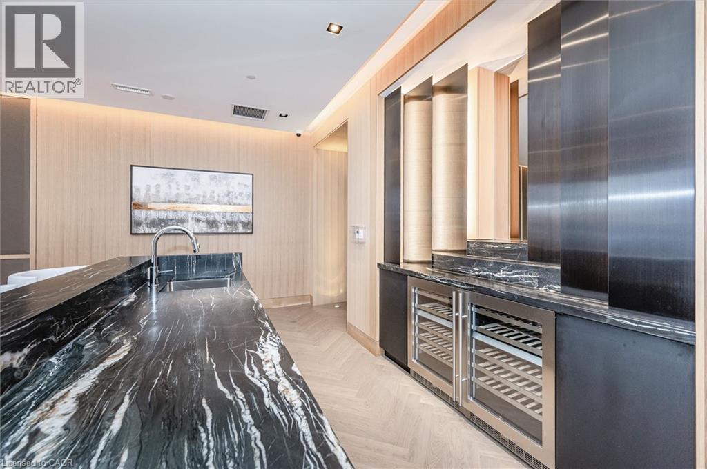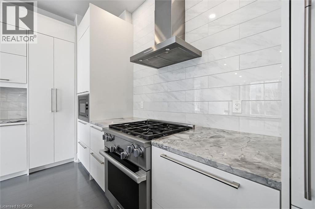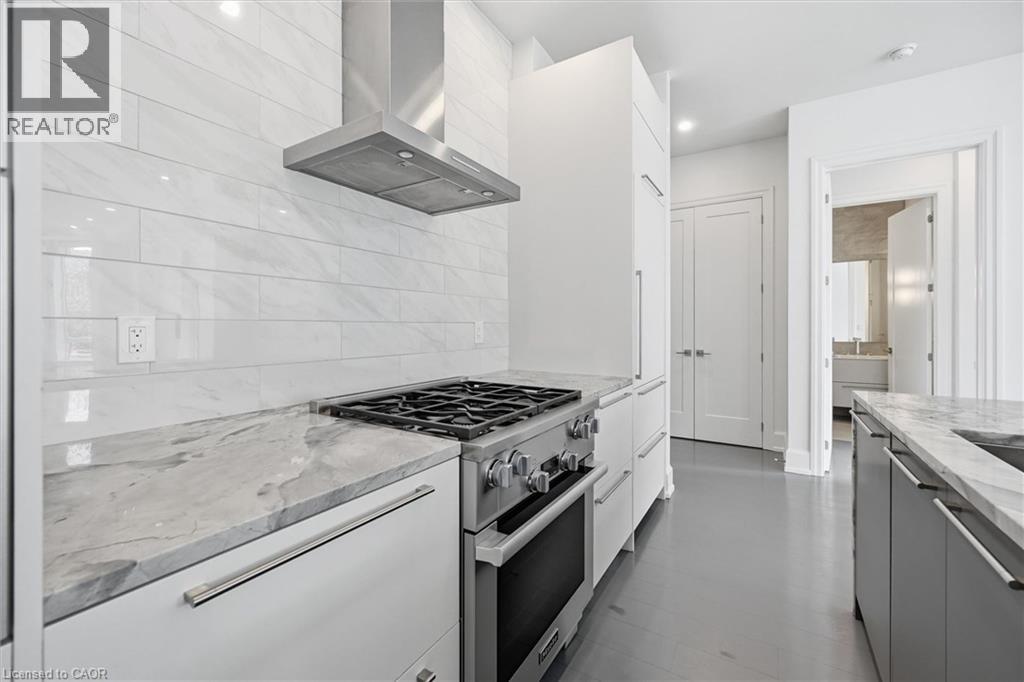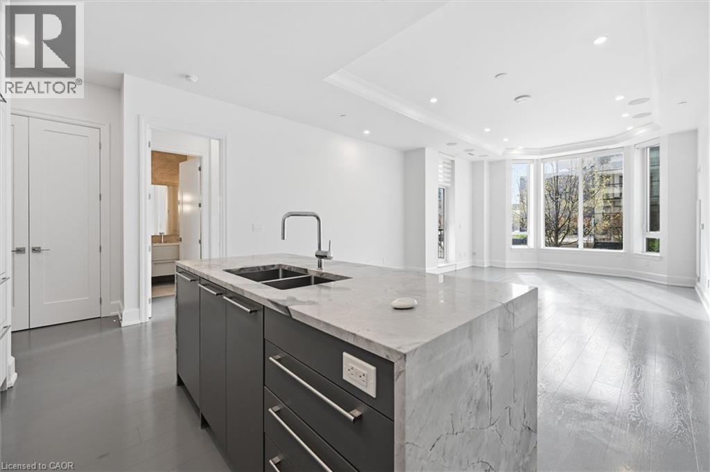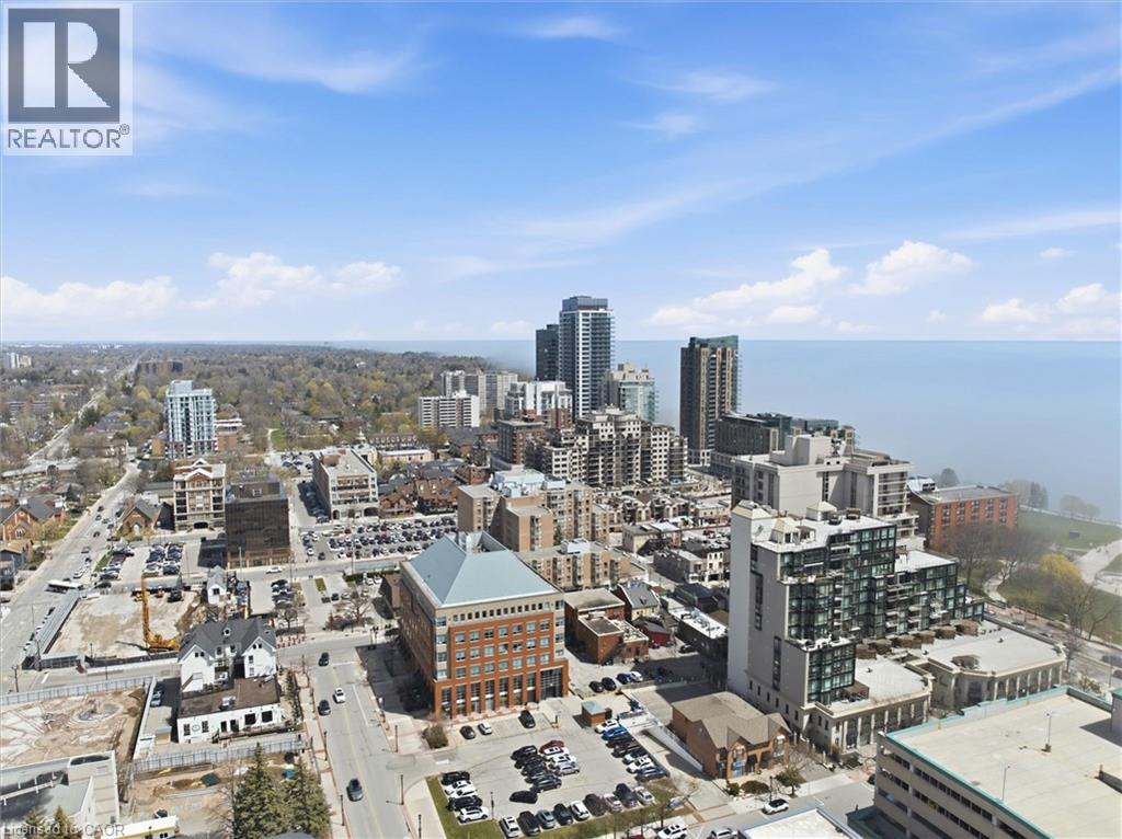 Experience 5-star executive living at the exclusive Saxony Condominium in the heart of downtown Burlington. Perfectly positioned across from the Performing Arts Centre and just steps to the lake, Spencer Smith Park, Joseph Brant Hospital, restaurants, boutique shopping, the pier, and Beachway trails, this premier location also offers quick highway access for added convenience. This stunning 1,517 sq. ft. suite showcases 10-ft ceilings, crown moulding, pot lights, automatic blinds, custom closets, and an elevated open-concept design. The gourmet kitchen features quartz countertops, built-in Miele appliances, an upgraded gas stove, and a striking waterfall island overlooking the spacious living and dining areas with built-in surround sound. Floor-to-ceiling windows fill the home with natural light and walk out to a large private terrace with a natural gas line and convenient street-level access. Two generous bedrooms each feature ensuites, including a luxurious primary retreat with a walk-in closet and a spa-inspired 5-piece ensuite. A den/office, powder room, laundry, walk-in storage closet, two side-by-side underground parking spaces, and a large locker complete the package. Residents enjoy premium amenities including a fitness room, theatre, party room, and an incredible rooftop terrace with fireplaces, water feature, BBQs, and panoramic lake. (id:50787)