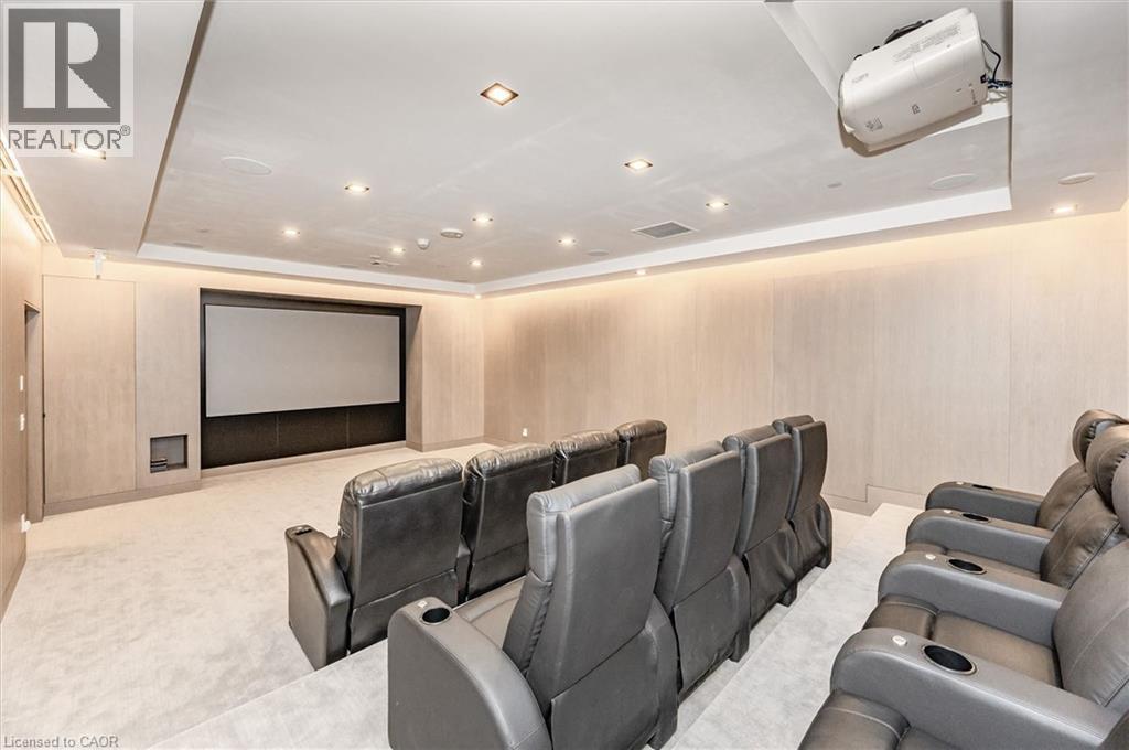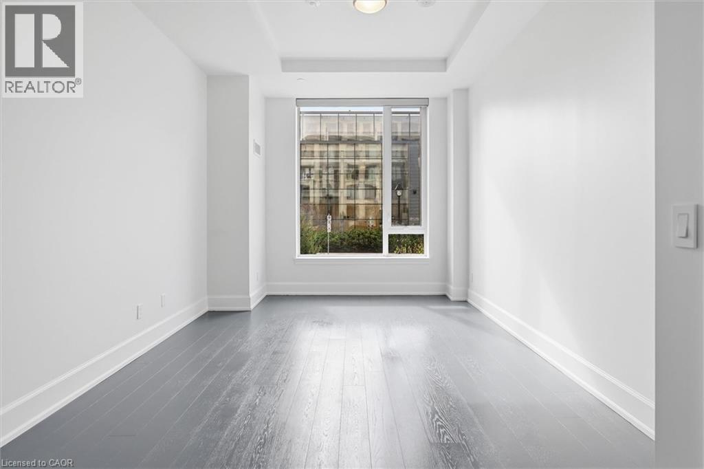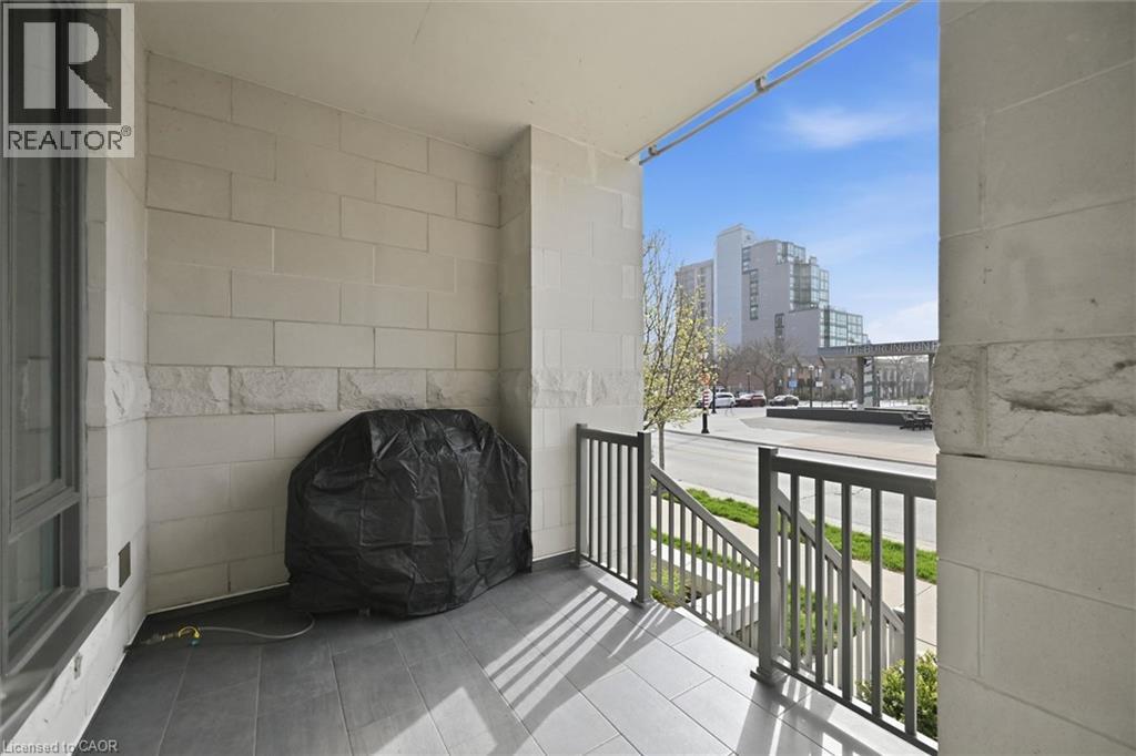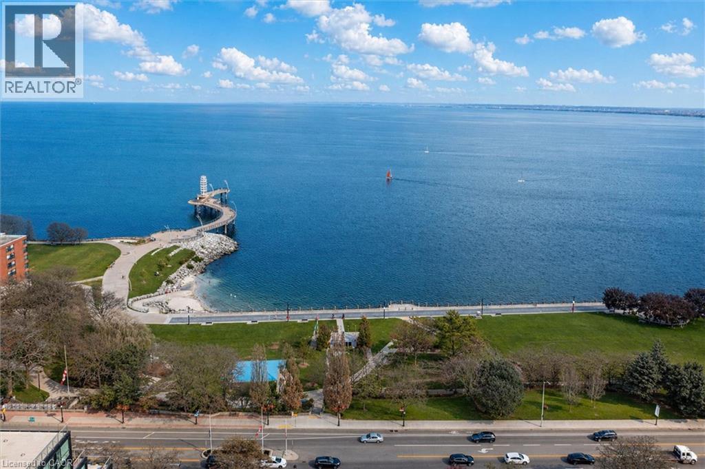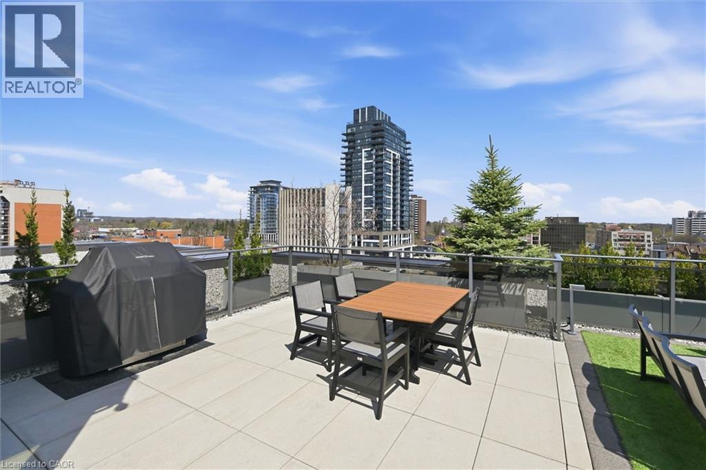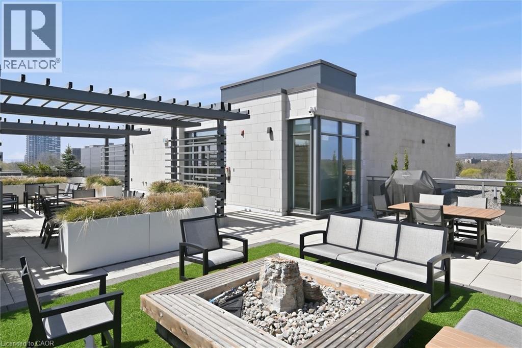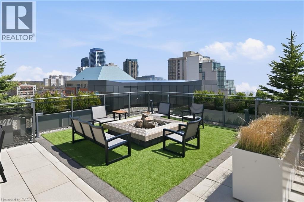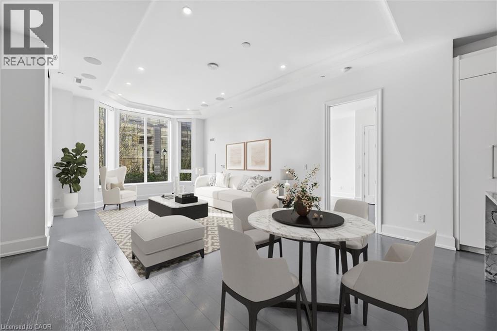 Experience 5-star executive living at the exclusive Saxony Condominium in the heart of downtown Burlington. Perfectly positioned across from the Performing Arts Centre and just steps to the lake, Spencer Smith Park, Joseph Brant Hospital, restaurants, boutique shopping, the pier, and Beachway trails, this premier location also offers quick highway access for added convenience. This stunning 1,517 sq. ft. suite showcases 10-ft ceilings, crown moulding, pot lights, automatic blinds, custom closets, and an elevated open-concept design. The gourmet kitchen features quartz countertops, built-in Miele appliances, an upgraded gas stove, and a striking waterfall island overlooking the spacious living and dining areas with built-in surround sound. Floor-to-ceiling windows fill the home with natural light and walk out to a large private terrace with a natural gas line and convenient street-level access. Two generous bedrooms each feature ensuites, including a luxurious primary retreat with a walk-in closet and a spa-inspired 5-piece ensuite. A den/office, powder room, laundry, walk-in storage closet, two side-by-side underground parking spaces, and a large locker complete the package. Residents enjoy premium amenities including a fitness room, theatre, party room, and an incredible rooftop terrace with fireplaces, water feature, BBQs, and panoramic lake. (id:50787)