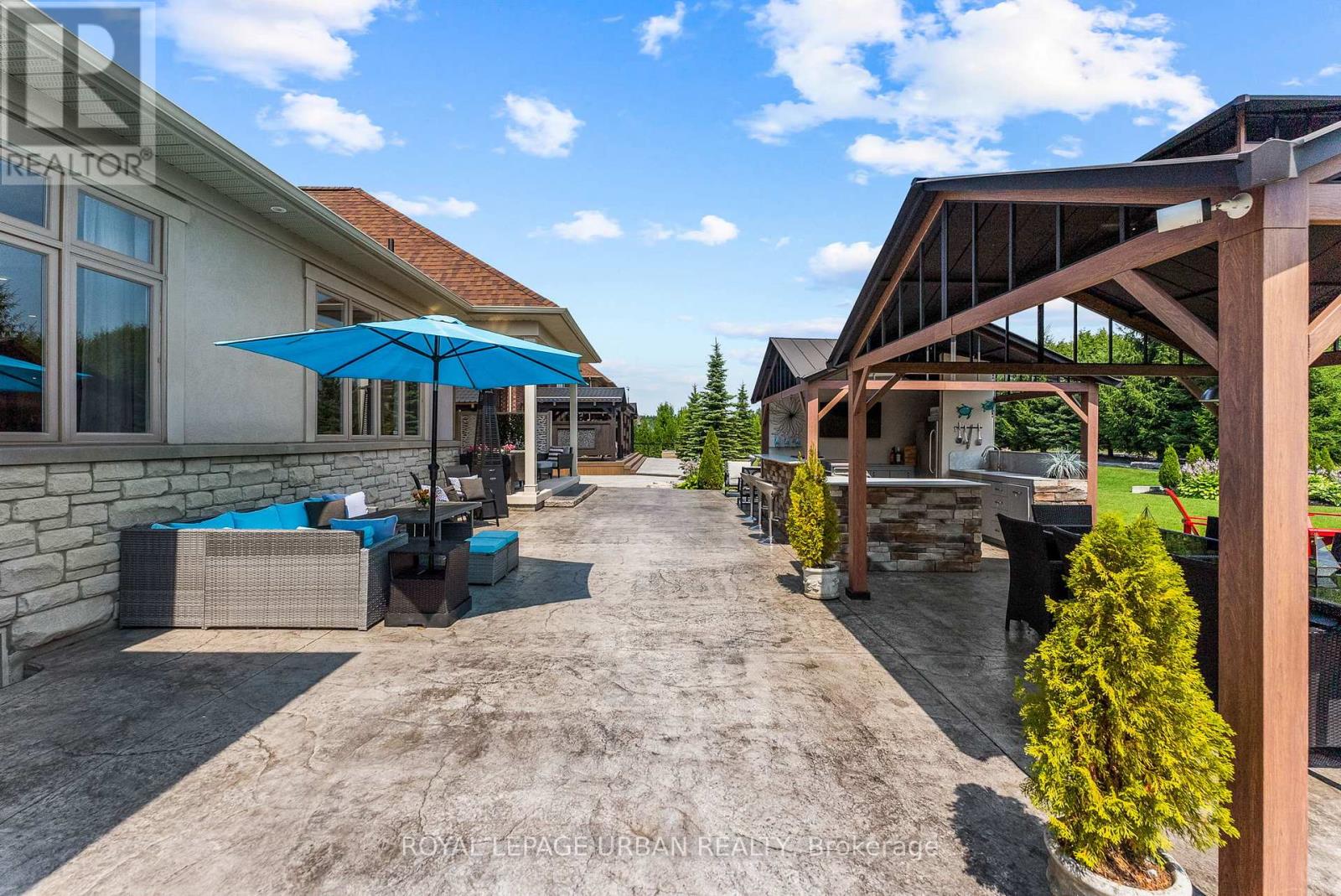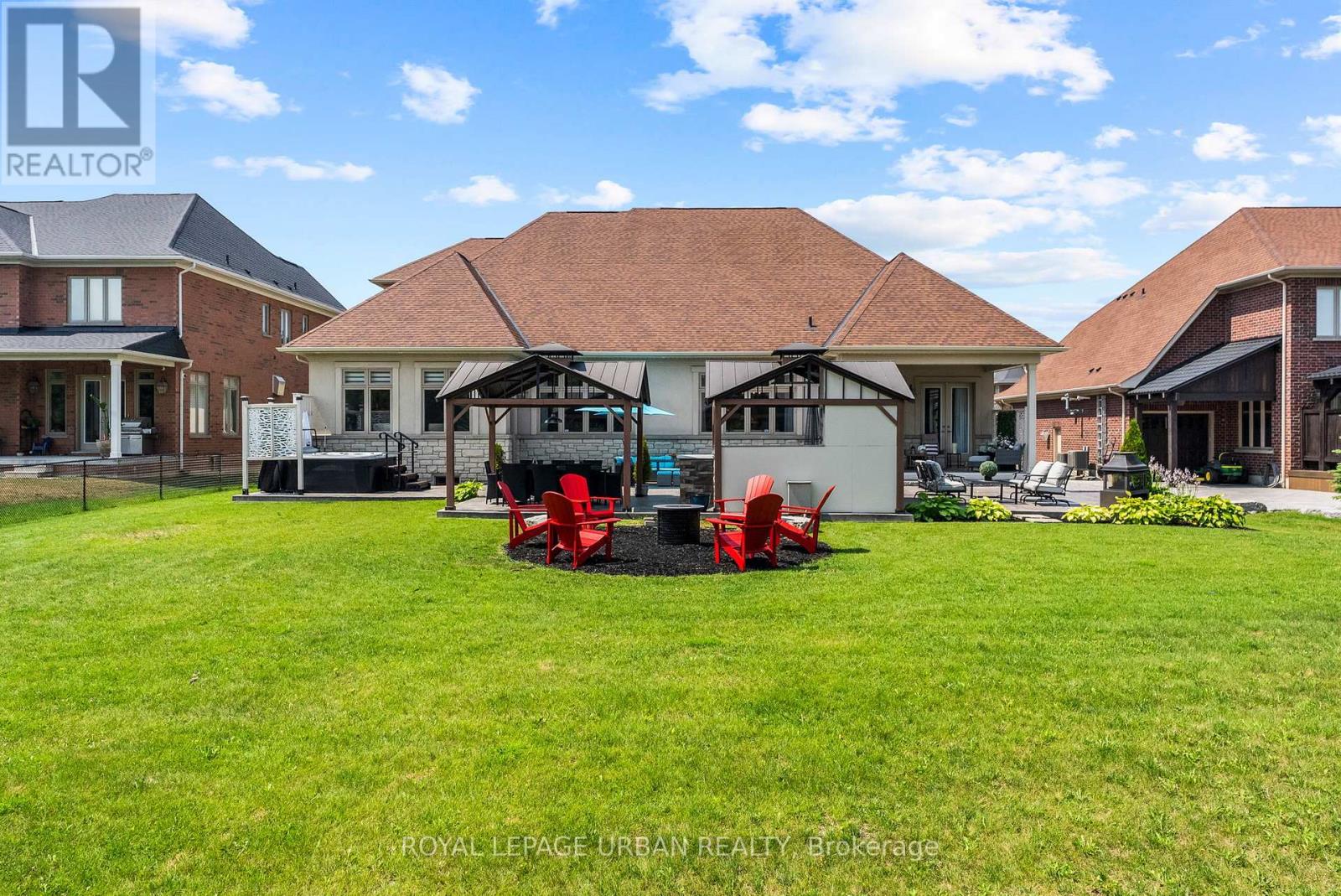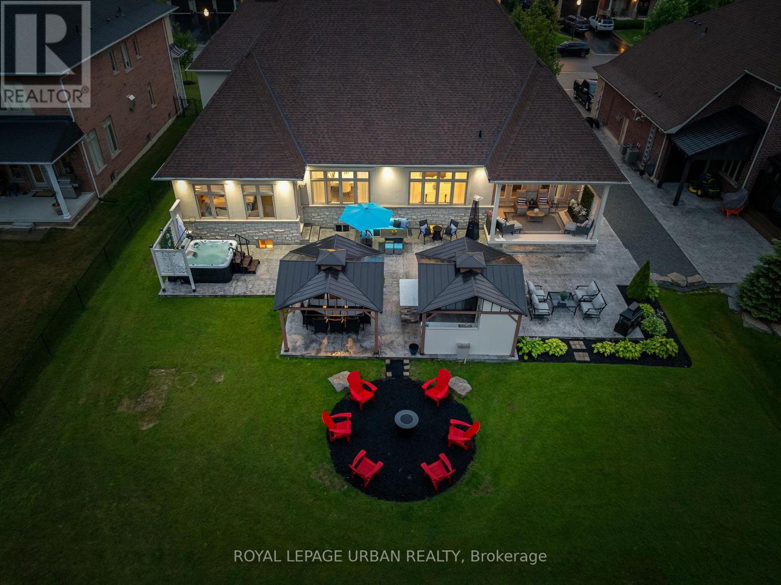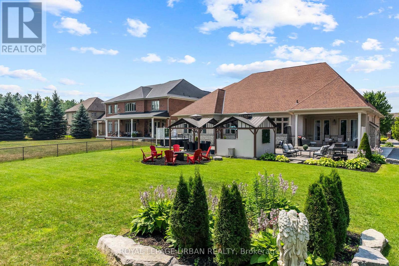 Welcome to this luxurious 6-bedroom, 5-bath bungaloft, perfectly positioned on an impressive 85 x 205 ft lot within one of Uxbridge's most exclusive gated golf course communities. Offering over 6,000 sq. ft. of finished living space with soaring 10 ft ceilings throughout, this home blends timeless elegance with modern convenience. The main level showcases a chef-inspired kitchen with Sub-Zero and Wolf appliances, walk-in pantry, custom wall units, and a convenient main-floor laundry. Expansive principal rooms flow seamlessly, with spacious bedrooms featuring walk-in closets for ultimate comfort. The fully finished basement offers versatile living and entertainment spaces, ideal for hosting family and friends. Every detail has been thoughtfully upgraded, including stamped concrete walkway, accent walls and ceilings, pot lights, and an EV charger. Step outside to your private backyard retreat, complete with a hot tub, two gazebos, outdoor custom kitchen with two grills, full fridge, wine fridge and plumbing. Professionally landscaped grounds perfect for outdoor living and entertaining. With parking for 9 vehicles plus a 3-car garage, fully heated with radiant heating and custom LED lighting; this home truly has it all. A rare opportunity to own a modern, upgraded residence in one of Uxbridge's most sought-after communities. (id:50787)