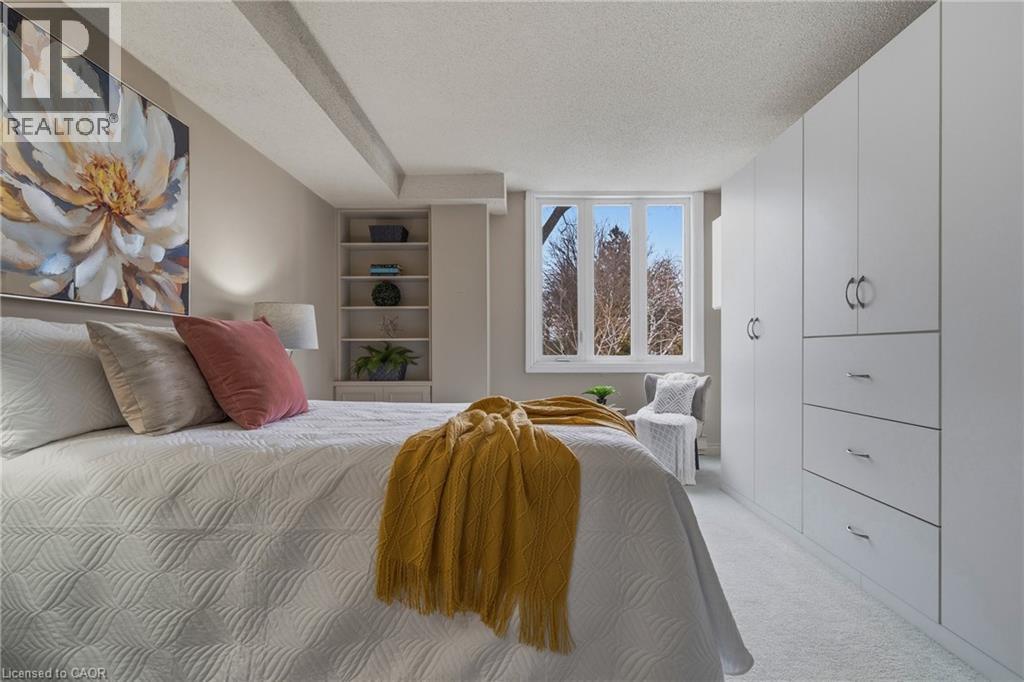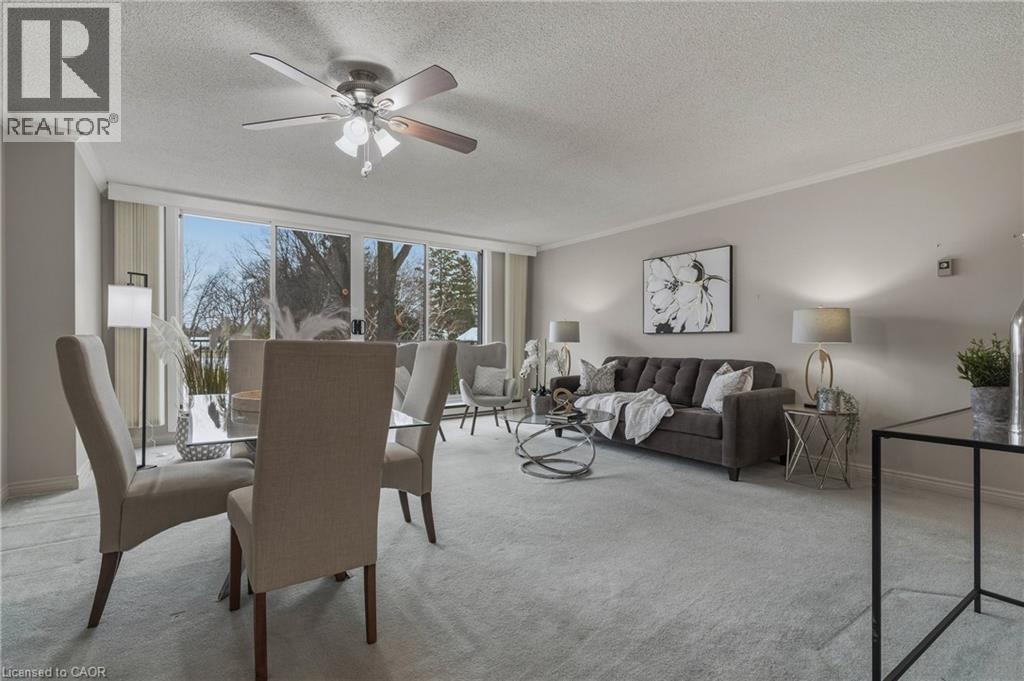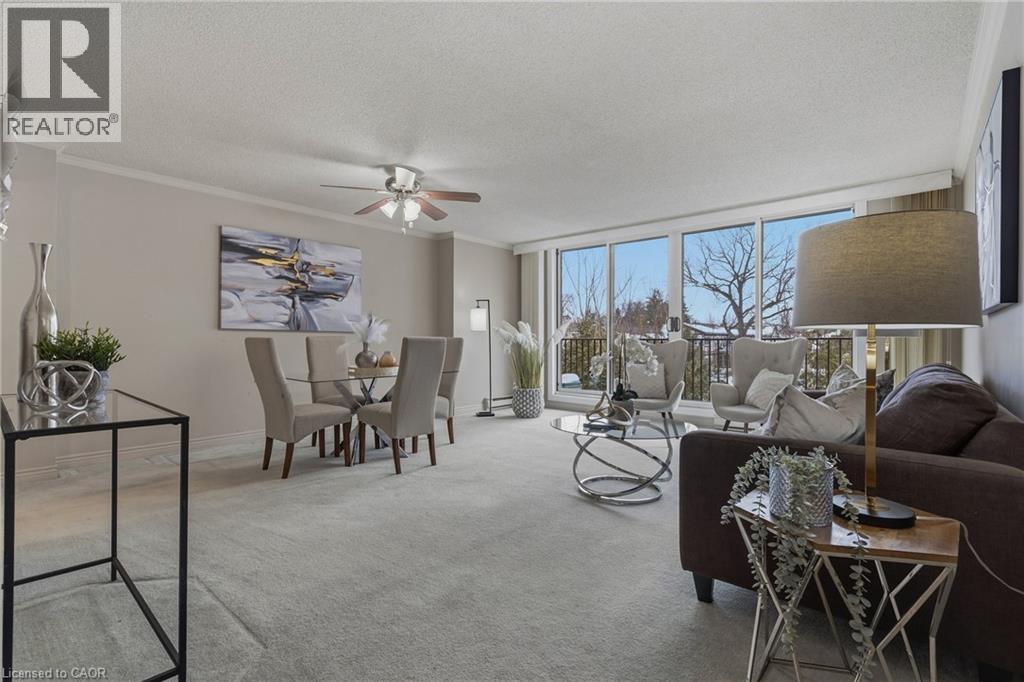 $556.90 MonthlyRarely offered, immaculate one-bedroom suite featuring an updated bathroom with granite countertop and a refreshed oak kitchen complete with backsplash, additional storage cabinetry, under-cabinet lighting, pot lights, double sink, built-in dishwasher, fridge, and stove. Convenient in-suite laundry with stackable washer and dryer plus extra storage. The spacious open-concept living and dining area is filled with natural light and offers a walk-out through oversized patio doors to a generous balcony overlooking mature trees and beautifully manicured grounds. The large principal bedroom features a picture window with views of the front gardens and a walk-in closet. This Senior friendly Condo. includes one underground parking space and a locker, and lots of storage. Ideally located close to shopping, restaurants, easy access to the 403, scenic hiking trails, Oak Gables Golf & Country Club, Hamilton Golf & Country Club, and numerous parks. Don't miss this opportunity! WOW! (id:50787)