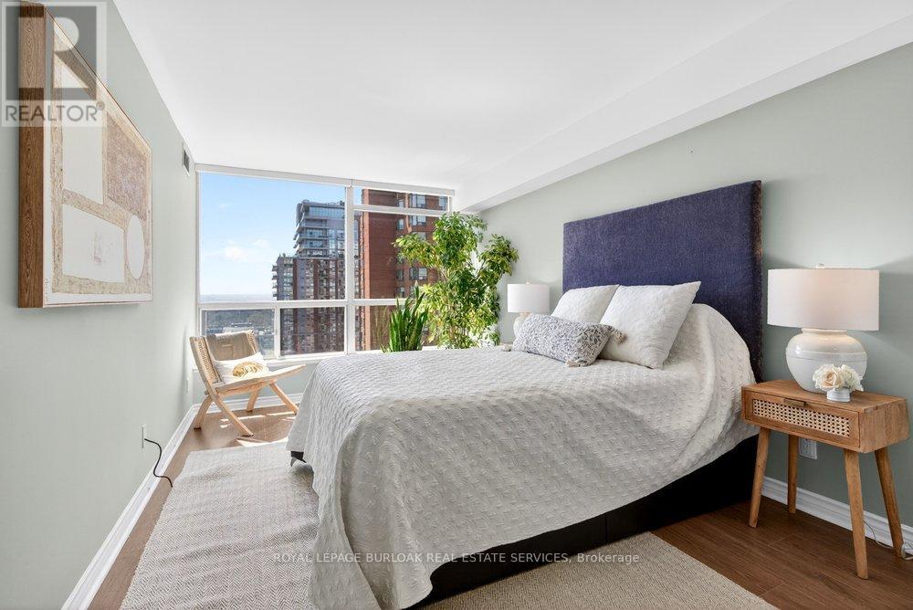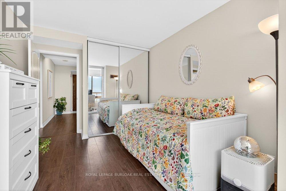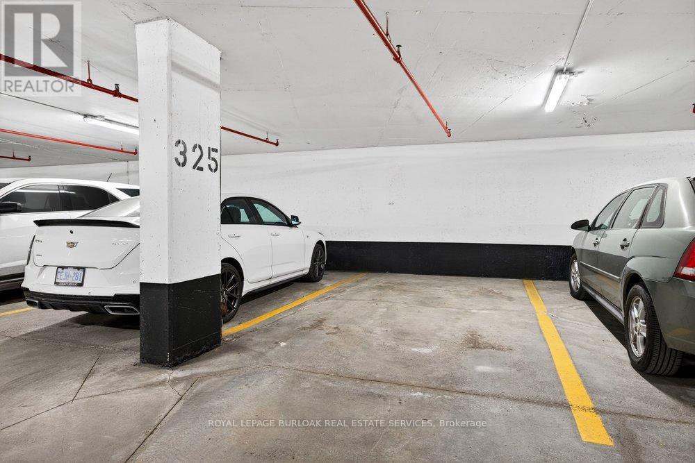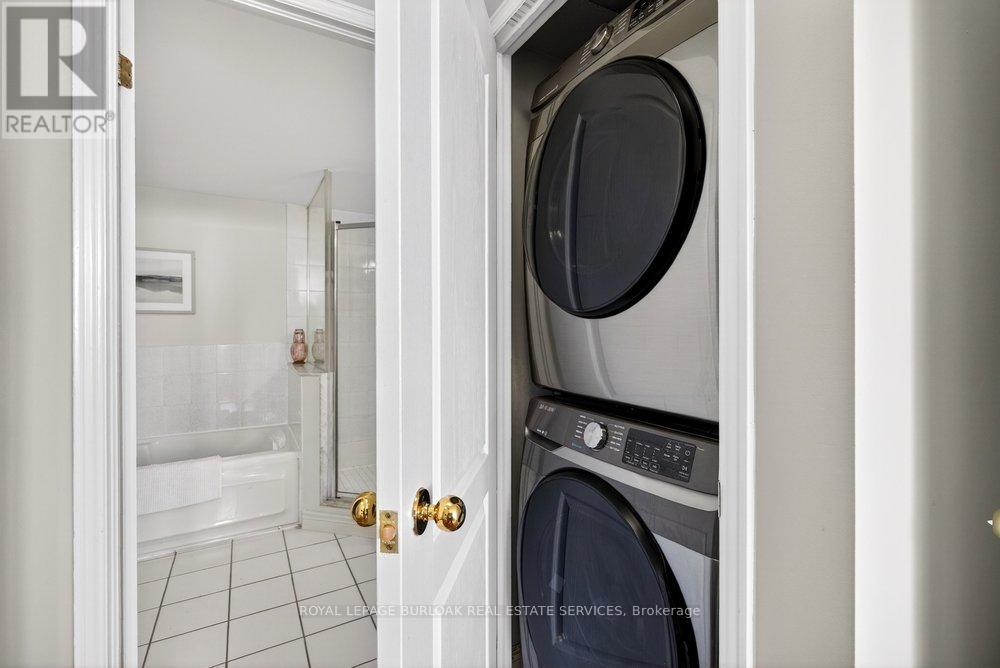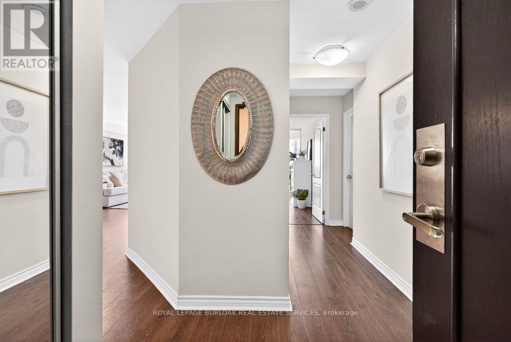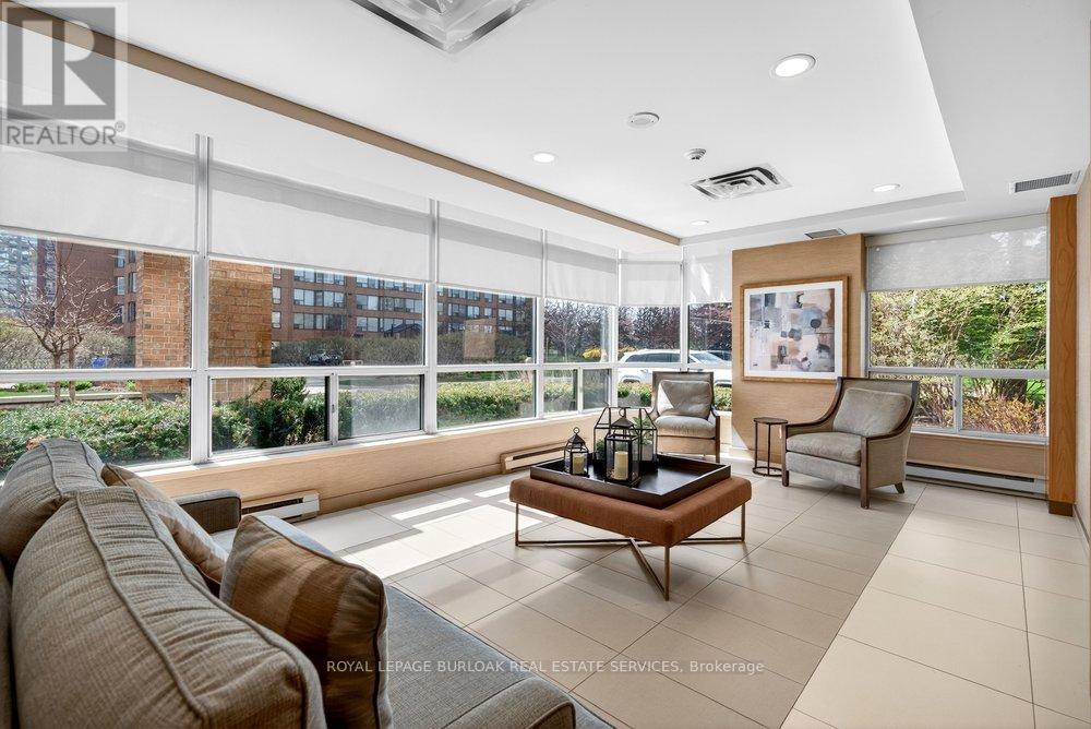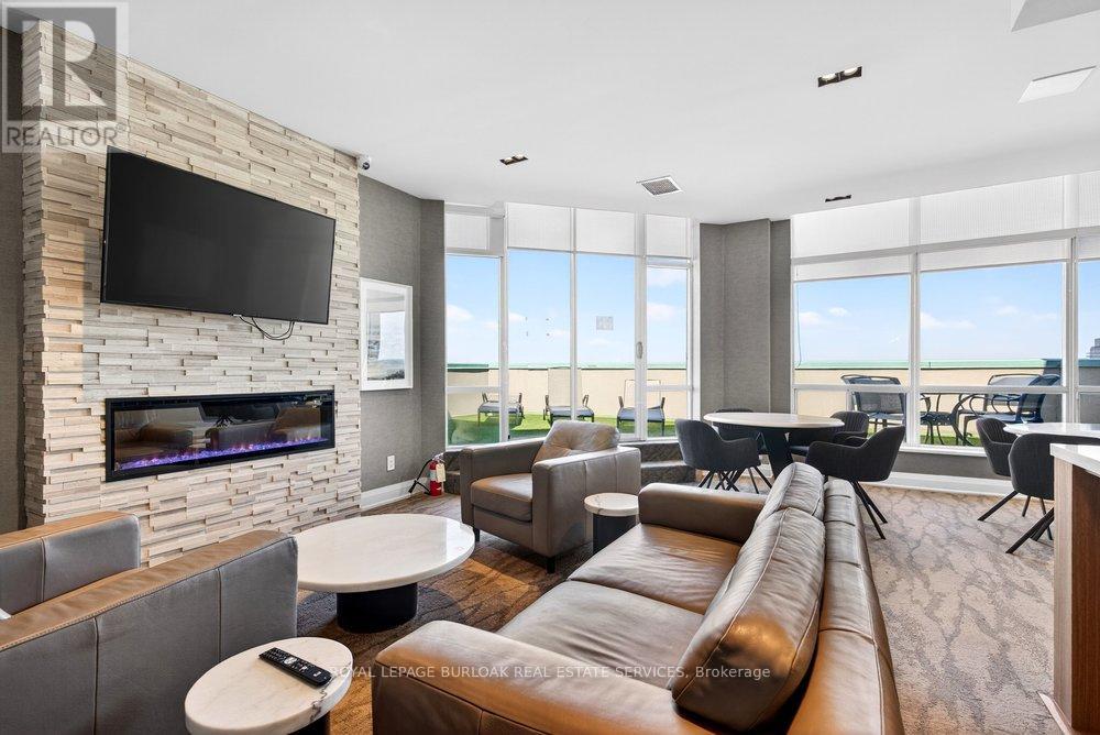Live the best of Burlington in this sought-after Grand Regency condo steps to Lake Ontario &vibrant downtown. This bright, 2 bed, 2 bath + den suite showcases floor-to-ceiling windows with stunning south-facing lake views, including from the private den and has approximately, 1100 sqft of living space. Enjoy a spacious open-concept layout with a large kitchen featuring stainless steel appliances, quart counters, & overlooks the dining/ & living areas, perfect for entertaining .Retreat to generous bedrooms with large closets & an ensuite bath, plus a full-size washer/dryer& 1 underground parking. Resort-style amenities include 24 hr concierge, outdoor pool & BBQ area, tennis, squash/racquetball, rooftop patio, party room, guest suites, gym & sauna. All-inclusive fees (heat, hydro, water, cable) + walkable access to Mapleview Mall, cafes, dining& the waterfront, and a short drive to the 403, make this a compelling lifestyle upgrade. (id:50787)