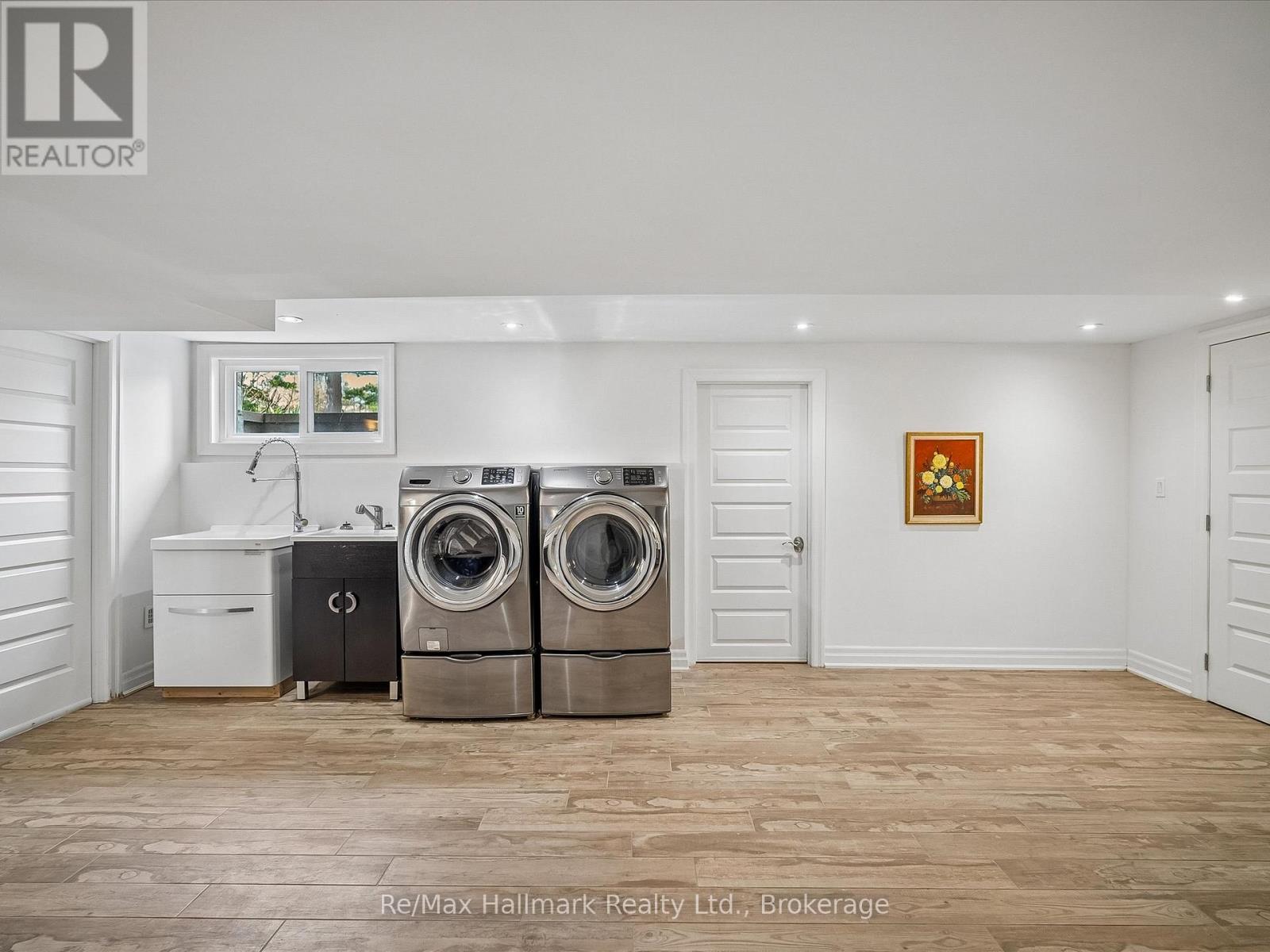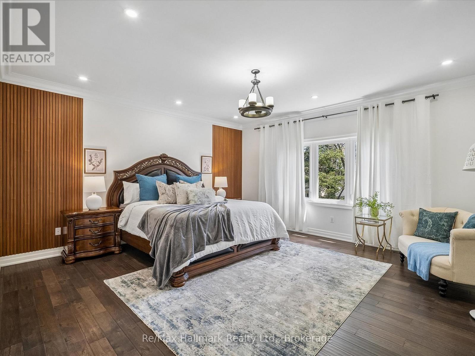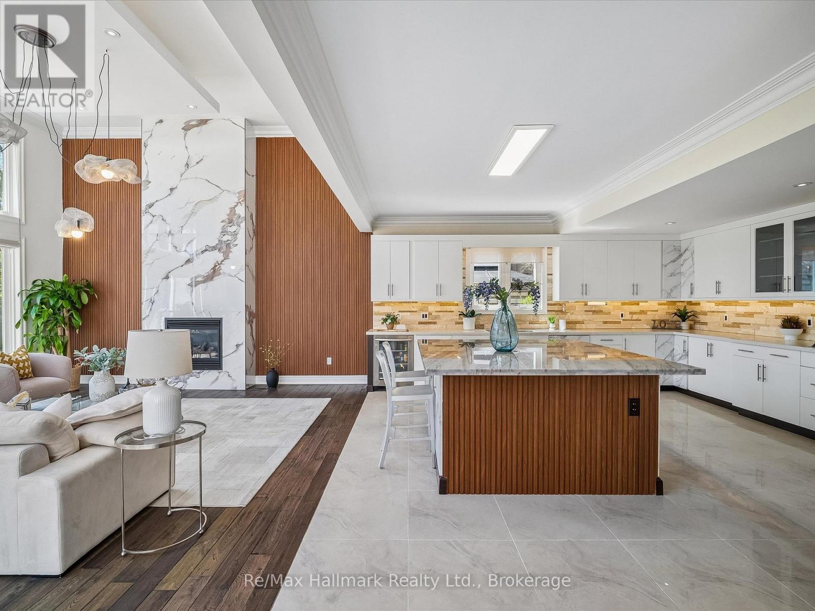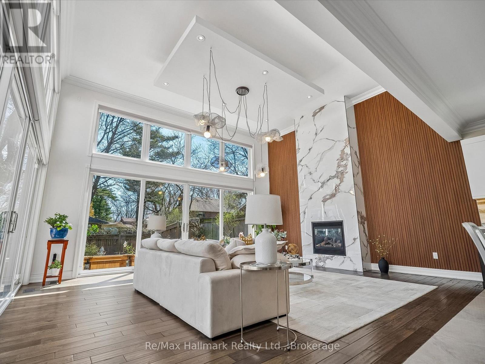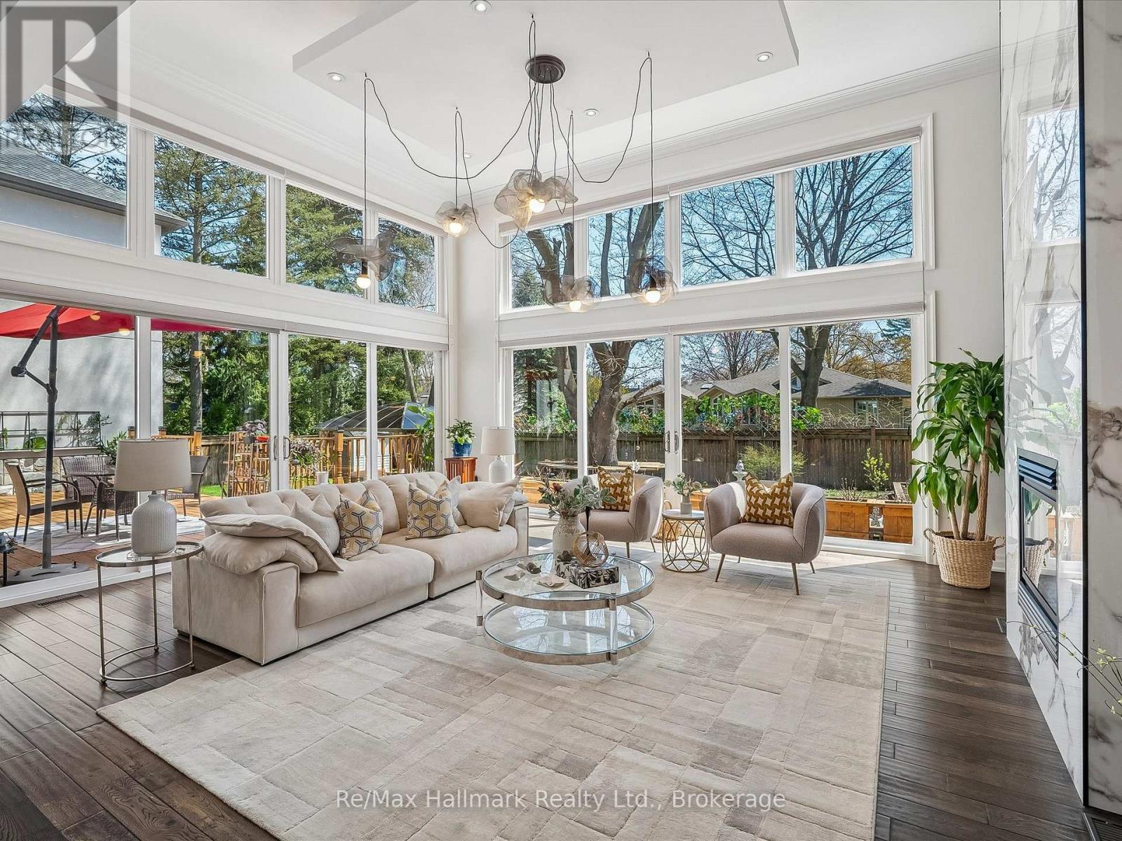 Nestled in the heart of highly sought-after Morrison, this exceptional custom-built executive home offers over 4,464sf above grade or nearly 6,000 sf of refined luxury living space, set on a rare 100 x 150 ft south-facing premium lot. Thoughtfully designed with a contemporary aesthetic and impeccable craftsmanship, this residence seamlessly blends elegance with modern functionality.Featuring a versatile layout with 2 bedrooms on the main level and 2 on the upper level, all spacious and boasts its own private ensuites and spacious walk-in closets, offering ultimate comfort and privacy. The home showcases rich hardwood flooring throughout, complemented by custom slatted wood accent walls, extensive millwork, crown mouldings, and soaring ceilings that elevate the sense of space and sophistication.The heart of the home is the breathtaking double-height family room, highlighted by floor-to-ceiling windows, a striking book-matched Calacatta marble fireplace, and a dramatic walnut slatted feature wall-creating a true architectural statement. Walk out to a 650 sq.ft. oversized deck, perfect for seamless indoor-outdoor entertaining.The designer kitchen is a chef's dream, featuring premium cabinetry, granite countertops, and top-of-the-line appliances, flowing effortlessly into the principal living spaces. A dedicated main floor office adds convenience for modern living.The professionally finished lower level offers expansive recreation and entertainment areas, ideal for family gatherings or hosting guests.Outdoors, enjoy beautifully landscaped front and rear gardens with a full sprinkler system, interlocking stonework, and a private backyard retreat bathed in southern sunlight.Located just steps to top-ranked schools (Oakville Trafalgar High School, Maple Grove Public School) and the lake, parks, and downtown Oakville, this home represents a rare opportunity in one of Oakville's most prestigious enclaves. (id:50787)