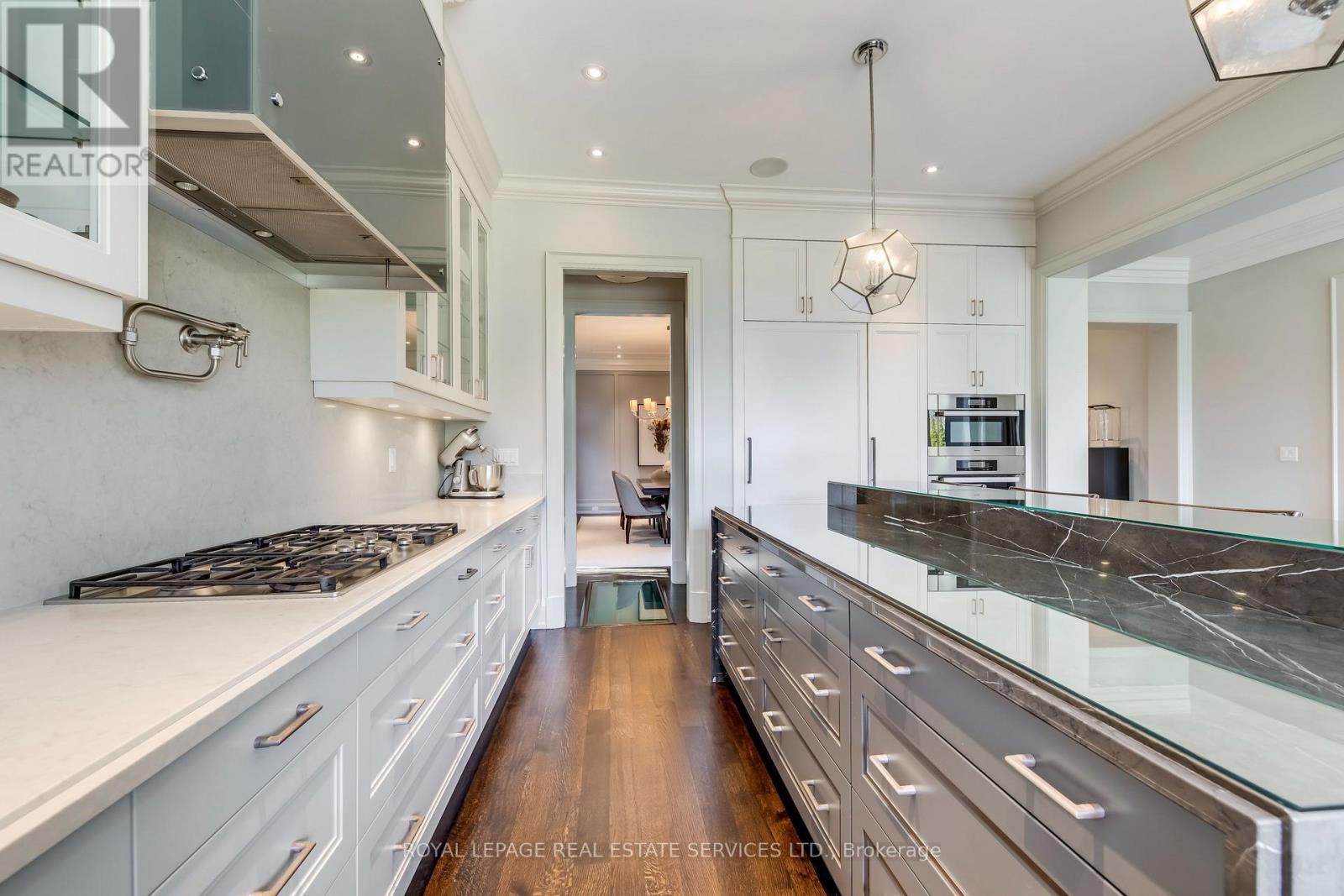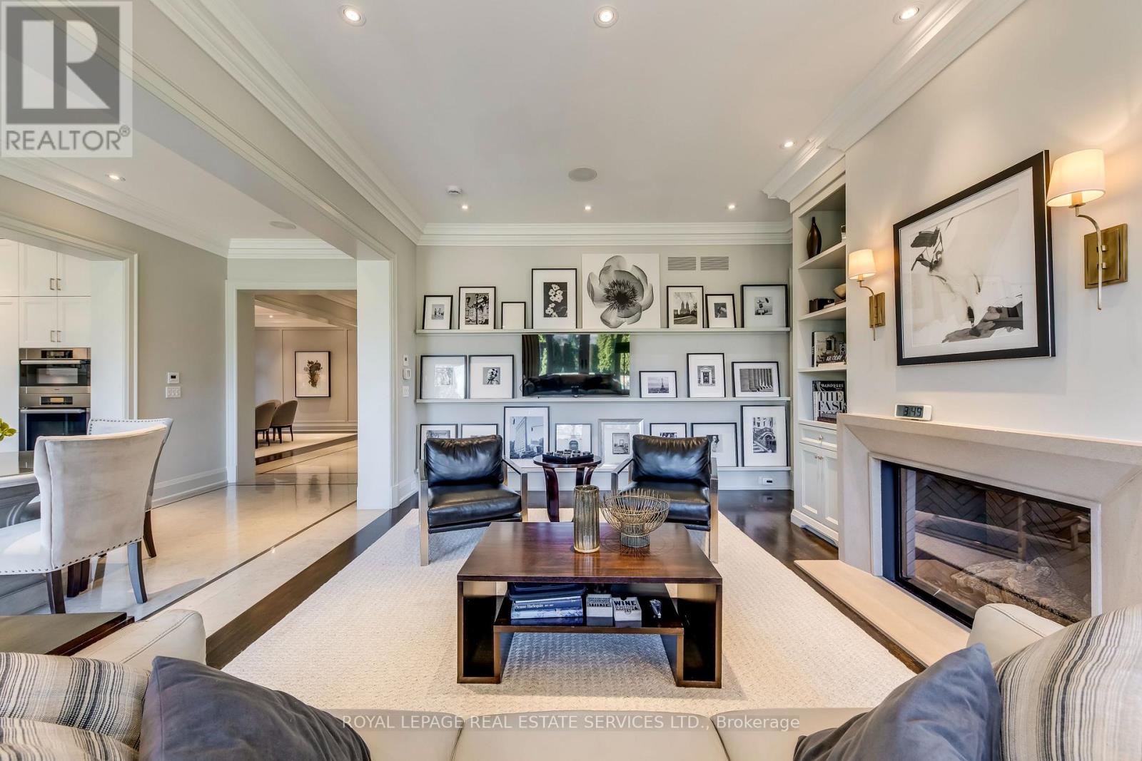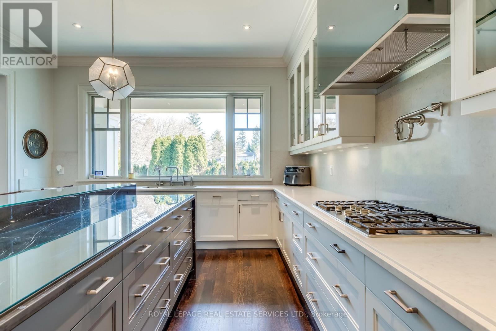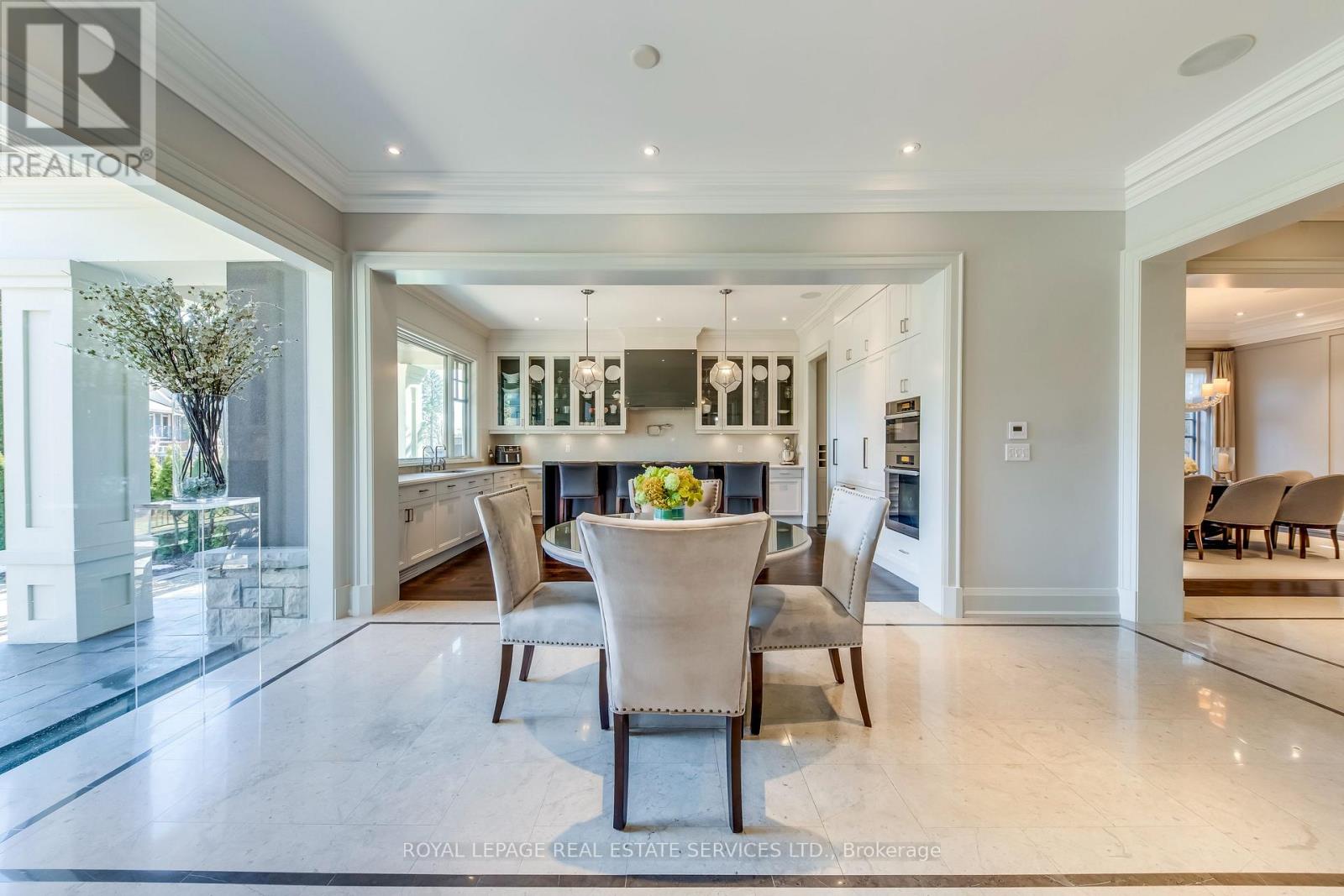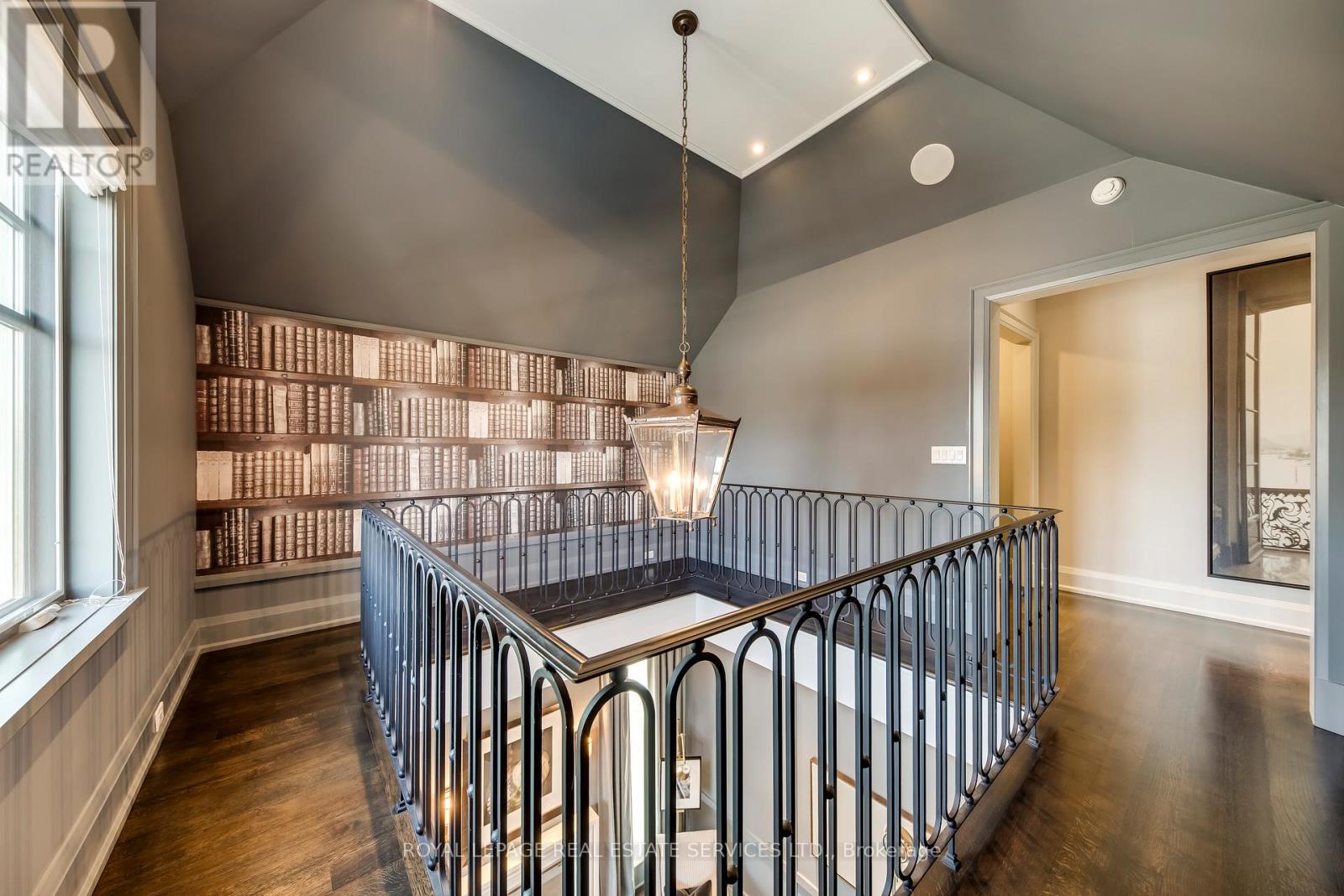 Elegant Custom Estate in Prestigious Southeast Oakville. Experience refined living in this stunning custom residence offering over 4,800 sq ft above grade and more than 7,300 sq ft of total living space. Thoughtfully designed by Michael Pettes and expertly built by PCM, this home showcases timeless architecture and exceptional craftsmanship throughout. The main level exudes European sophistication, featuring plaster crown mouldings, custom drapery, designer wall sconces, and intricate architectural detailing. A dramatic main floor library impresses with soaring ceilings, a gas fireplace, and a striking wrought-iron catwalk above. The grand formal dining room comfortably accommodates large gatherings, perfect for elegant entertaining. At the heart of the home is a Downsview chef's kitchen complete with a large centre island, servery, and seamless flow into the breakfast area and spacious family room. The upper level offers an outstanding layout highlighted by a wide skylit hallway-ideal for displaying art or family memories. All four generously sized bedrooms feature private ensuites and ample closets. The luxurious primary retreat boasts a cathedral ceiling, dressing room, and spa-inspired ensuite with a built-in bookshelf beside the soaker tub. The fully finished lower level is designed for both relaxation and entertaining, featuring a fifth bedroom, full bath, expansive recreation room with wet bar, and a stone-accent wine cellar. A large laundry room with extensive counter space and a wide winding walk-up to the backyard adds convenience. Additional highlights include a main floor den, upper-level study, heated interlock driveway, oversized garage with car lift capability, covered rear porch, and dual furnaces and A/C units. Ideally located within walking distance to top-rated schools and just minutes to shopping, amenities, and major highways, this exceptional home offers luxury, functionality, and an unbeatable Southeast Oakville lifestyle. (id:50787)