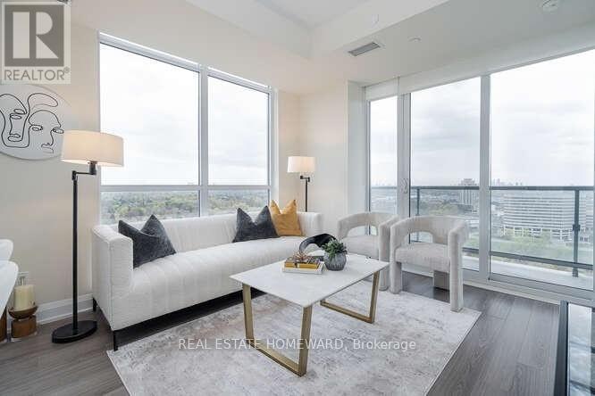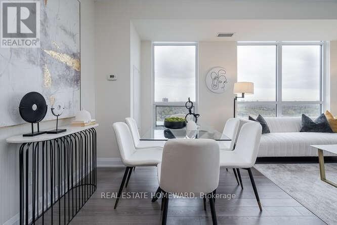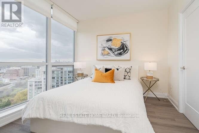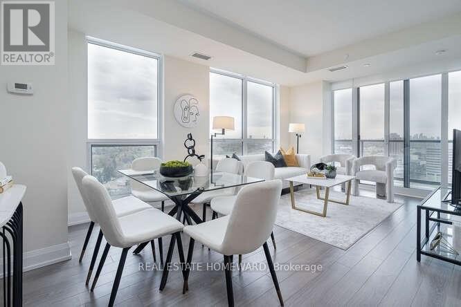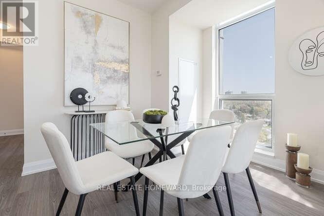 Tridel-built and impeccably maintained, this bright 2-bedroom, 2-bathroom corner suite features a private balcony with unobstructed southeast views and soaring 9-foot ceilings. The modern kitchen is appointed with granite/quartz countertops and upgraded appliances, while sleek laminate flooring runs throughout the unit. Expansive windows fill the space with natural light, enhancing its spacious and inviting feel.Ideally located just moments from CF Fairview Mall and the Shops at Don Mills, residents enjoy easy access to an excellent selection of restaurants, entertainment, and retail options. Conveniently close to Don Mills subway station, TTC transit, the DVP, Highway 404, and Highway 401, commuting is effortless.Exceptional building amenities include 24-hour concierge service, a fully equipped fitness studio, party room, theatre room, steam room, as well as parking and locker included. (id:50787)