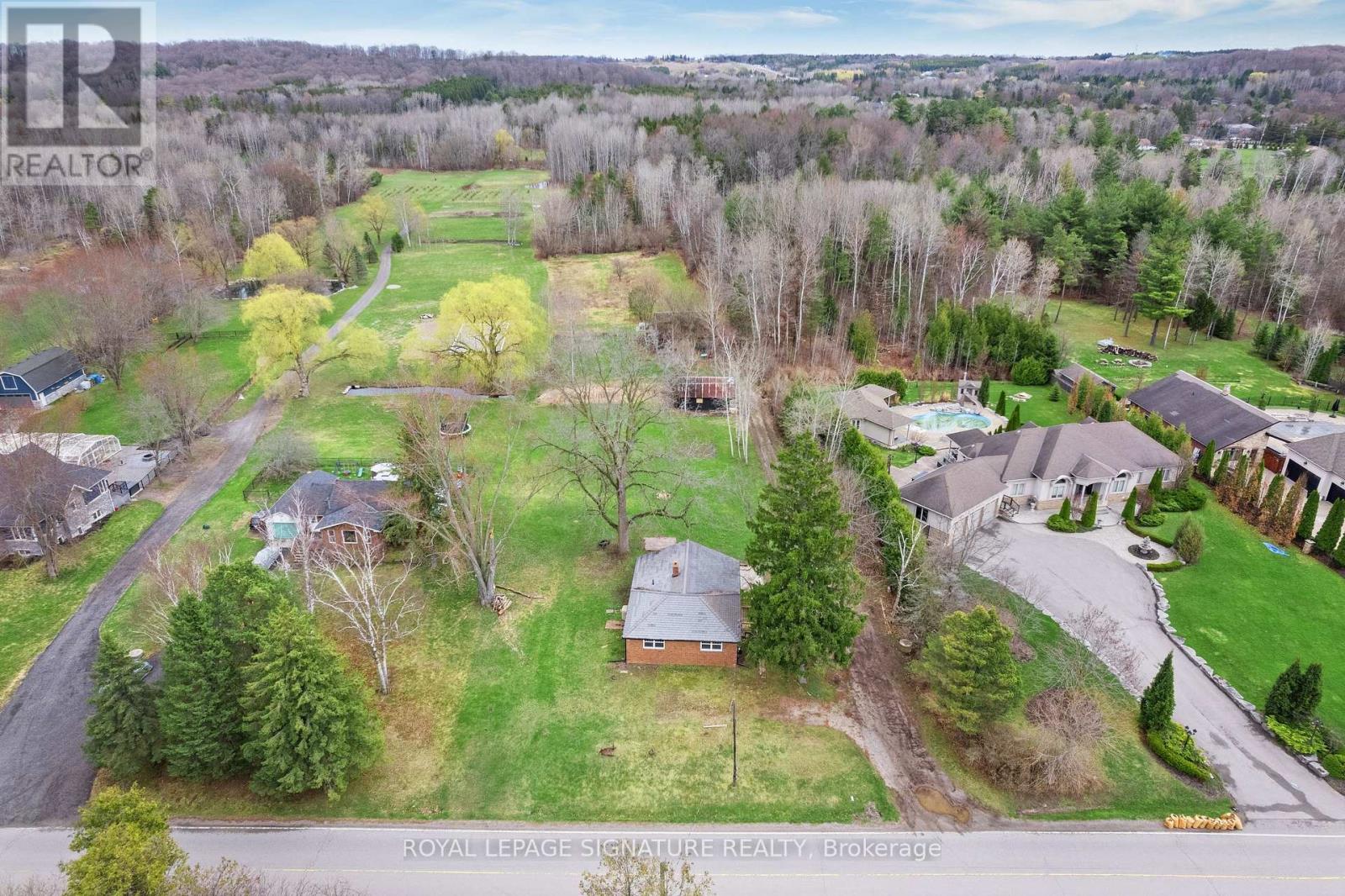 Solid all-brick bungalow situated on a picturesque 5+ acres lot on a quiet country road, backing onto protected conservation land for ultimate privacy and natural views. The home offers 3 bedrooms, a full four-piece bath, and an unfinished basement with a rough-in for an additional full bathroom. Serviced by an artisan well, septic system, natural gas, and hydro. Surrounded by million-dollar homes, this property presents an exceptional opportunity to renovate, expand, or build your custom dream home in a prestigious rural setting. Conveniently located just 20minutes from Woodbridge, combining peaceful country living with easy access to city amenities. Pictures are virtually staged. (id:50787)