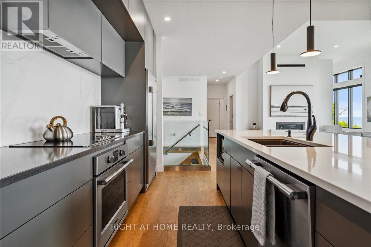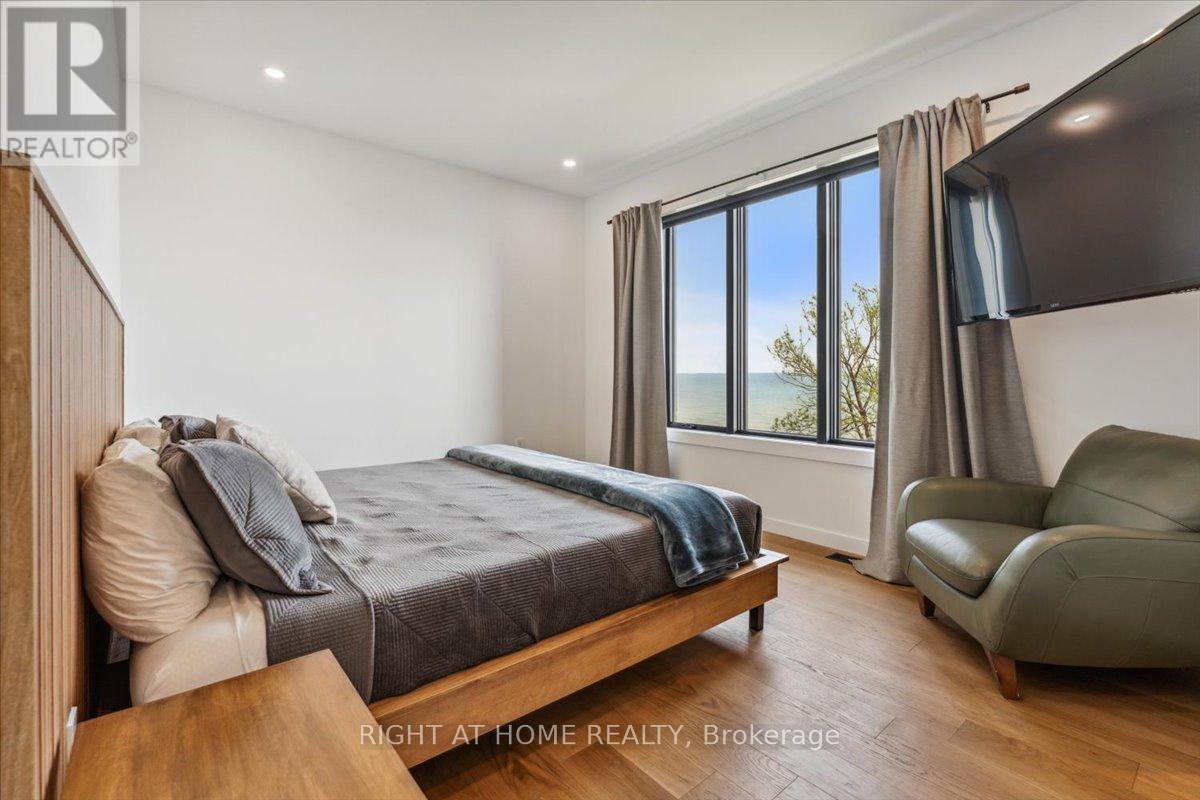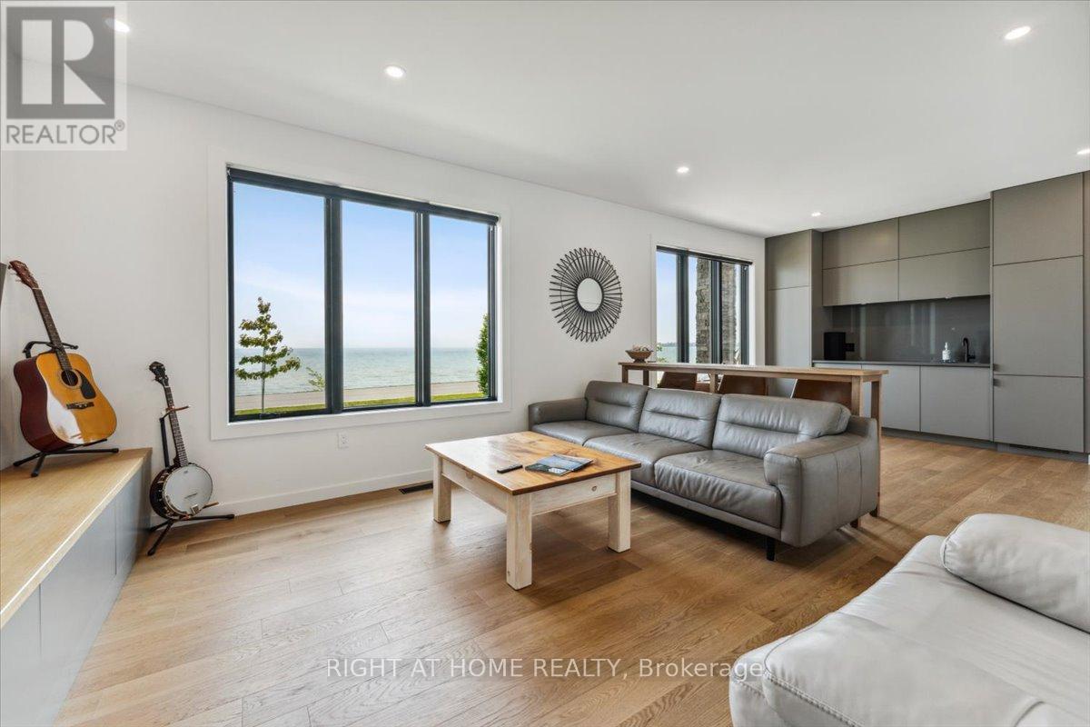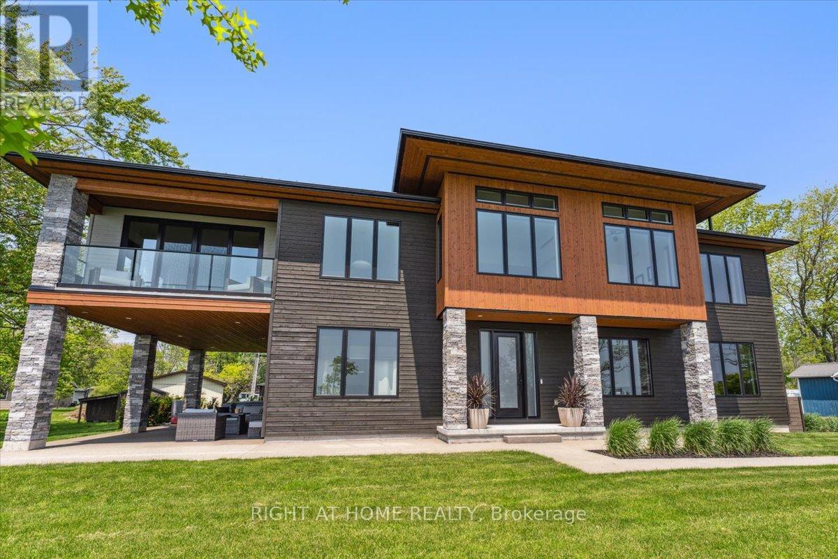 Wake to the rhythm of Lake Erie and uninterrupted waterfront views at 17 Bluewater Parkway, a refined lakefront retreat in Haldimand County designed for those who value privacy, design, and connection to nature. Defined by clean architectural lines and expansive glazing, the home is filled with natural light, with wall-to-wall windows framing the lake at every turn. Engineered hardwood flooring and soaring 9 and 11-foot ceilings set a tone of understated luxury, while multiple living spaces, each anchored by its own fireplace create warmth and versatility throughout. The upper level is designed for both everyday living and elevated entertaining. A European-inspired kitchen features sleek cabinetry, quartz surfaces, premium appliances, and an oversized island, flowing seamlessly into the dining and living areas. A sunroom with a third fireplace extends the living space, opening to a private balcony where panoramic water views and evening sunsets take centre stage. The primary suite offers a quiet, private retreat with walk-in closet and ensuite, complemented by a flexible studio space ideal as a home office or additional bedroom. A guest bedroom and full bath on the main level provide comfort and privacy for visitors. Function meets lifestyle with an in-floor heated garage, a detached two-car garage, and an expansive aggregate driveway-perfectly suited for vehicles, recreational equipment, and waterfront living. Finished in Maibec siding with stone accents and a durable metal roof, the home reflects a commitment to quality and longevity. Located within easy reach of the GTA yet offering a true sense of escape, this is a rare opportunity to experience lakefront living without compromise. (id:50787)