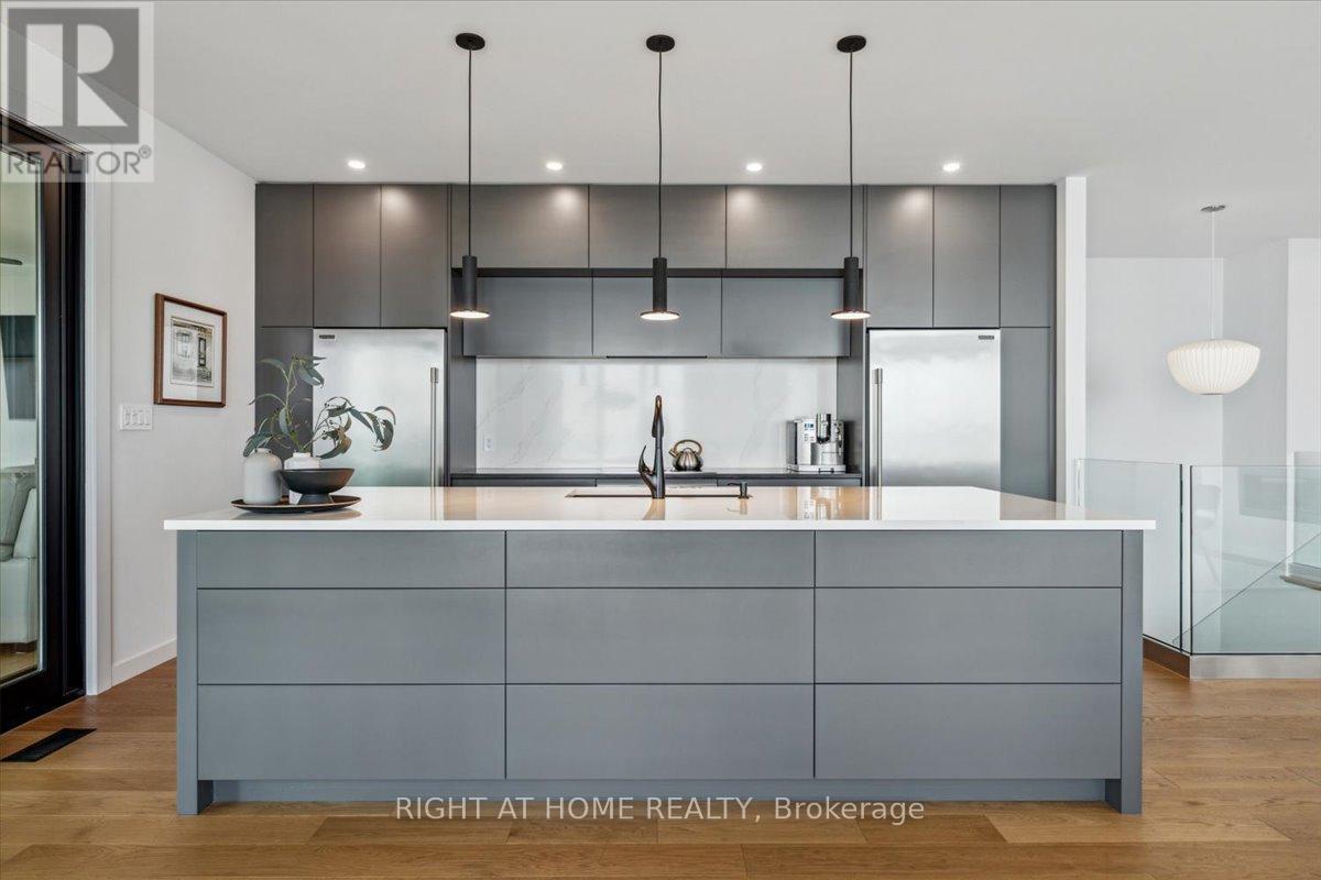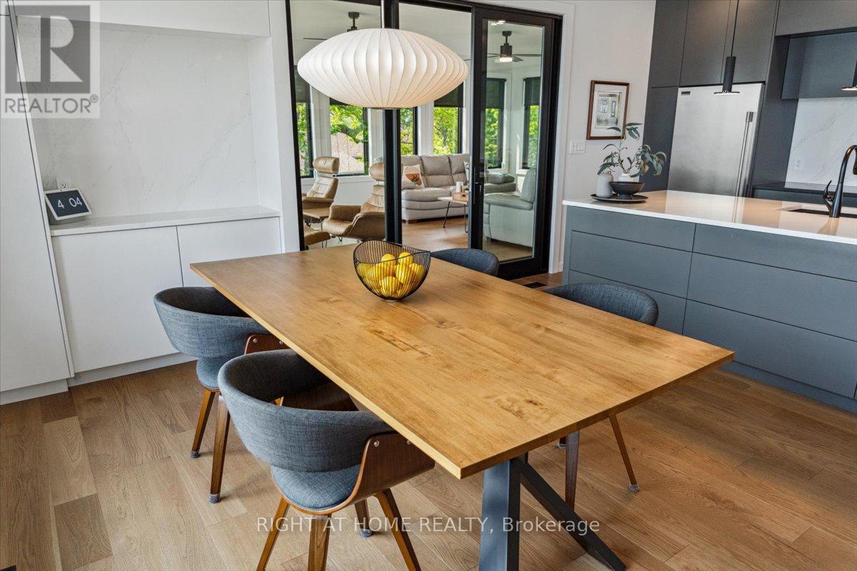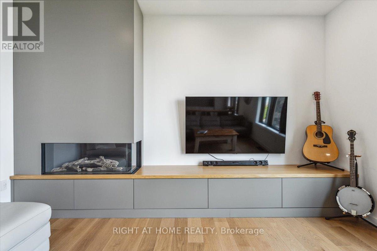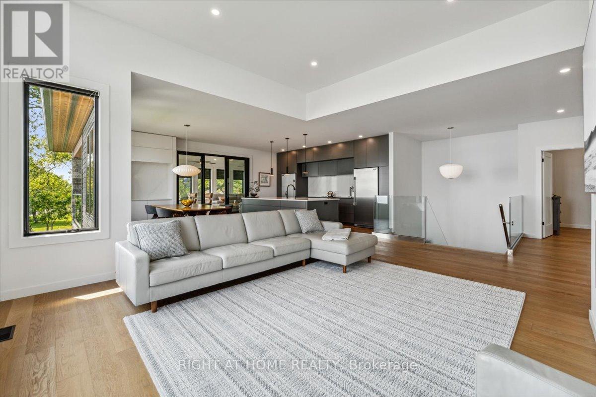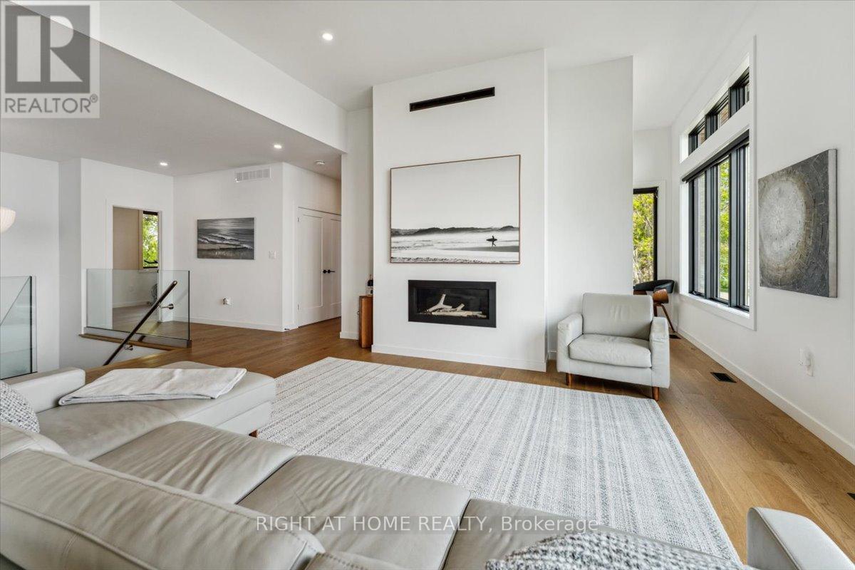 Wake to the rhythm of Lake Erie and uninterrupted waterfront views at 17 Bluewater Parkway, a refined lakefront retreat in Haldimand County designed for those who value privacy, design, and connection to nature. Defined by clean architectural lines and expansive glazing, the home is filled with natural light, with wall-to-wall windows framing the lake at every turn. Engineered hardwood flooring and soaring 9 and 11-foot ceilings set a tone of understated luxury, while multiple living spaces, each anchored by its own fireplace create warmth and versatility throughout. The upper level is designed for both everyday living and elevated entertaining. A European-inspired kitchen features sleek cabinetry, quartz surfaces, premium appliances, and an oversized island, flowing seamlessly into the dining and living areas. A sunroom with a third fireplace extends the living space, opening to a private balcony where panoramic water views and evening sunsets take centre stage. The primary suite offers a quiet, private retreat with walk-in closet and ensuite, complemented by a flexible studio space ideal as a home office or additional bedroom. A guest bedroom and full bath on the main level provide comfort and privacy for visitors. Function meets lifestyle with an in-floor heated garage, a detached two-car garage, and an expansive aggregate driveway-perfectly suited for vehicles, recreational equipment, and waterfront living. Finished in Maibec siding with stone accents and a durable metal roof, the home reflects a commitment to quality and longevity. Located within easy reach of the GTA yet offering a true sense of escape, this is a rare opportunity to experience lakefront living without compromise. (id:50787)