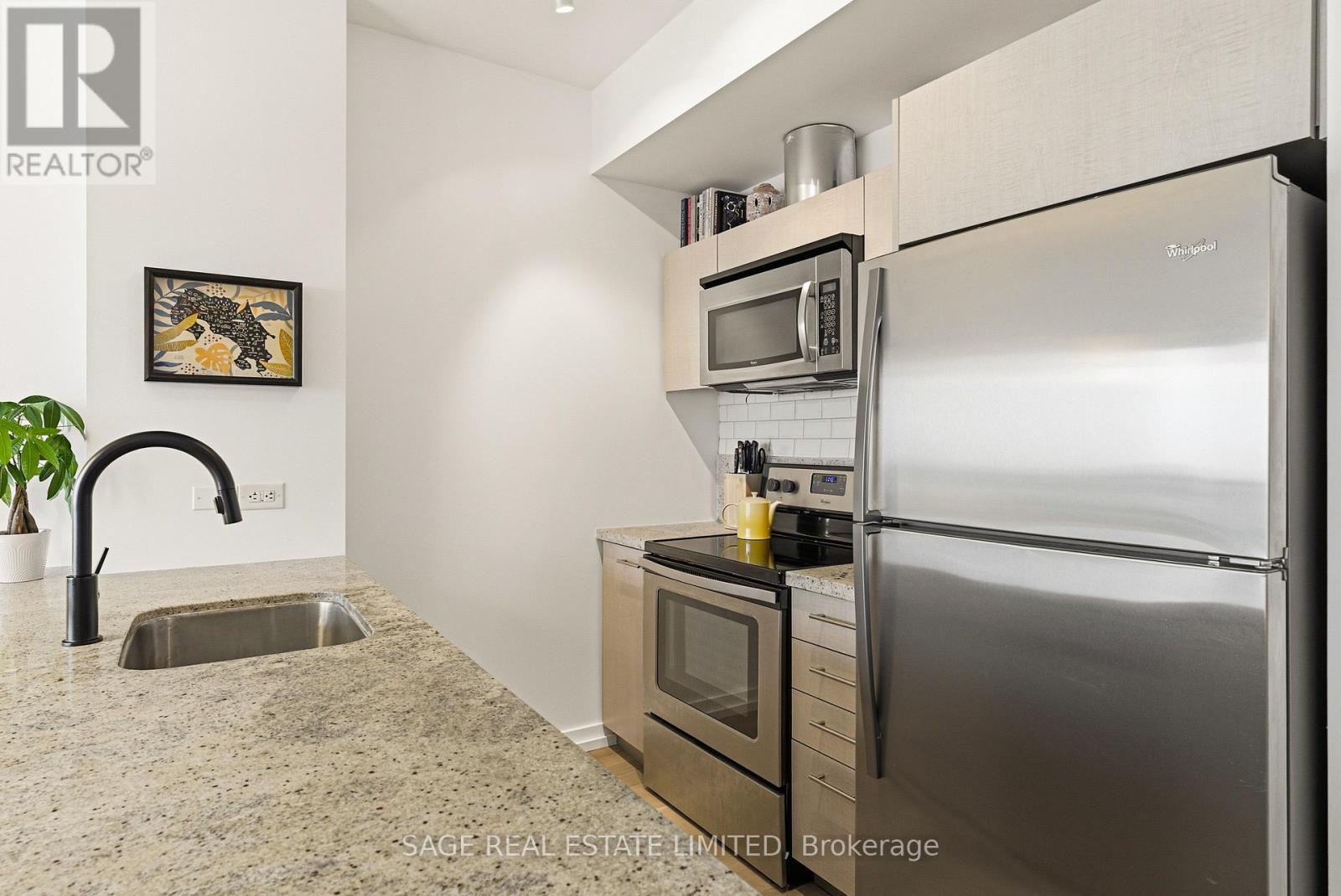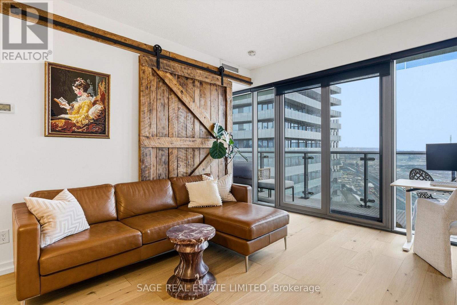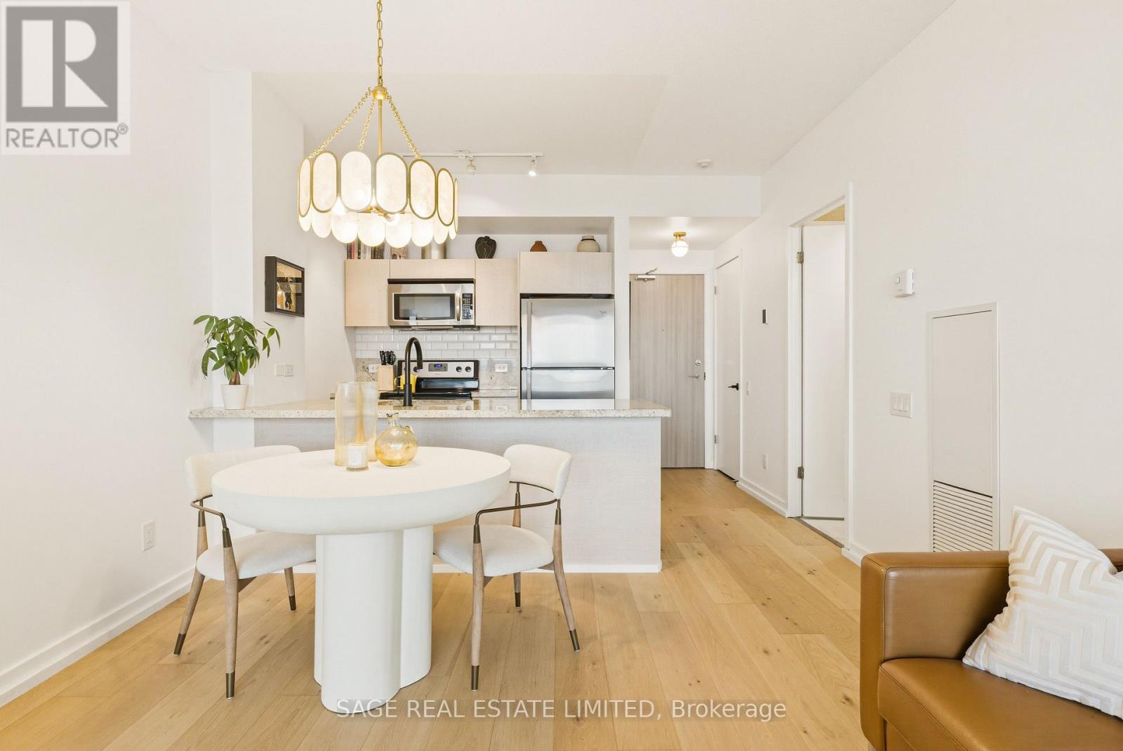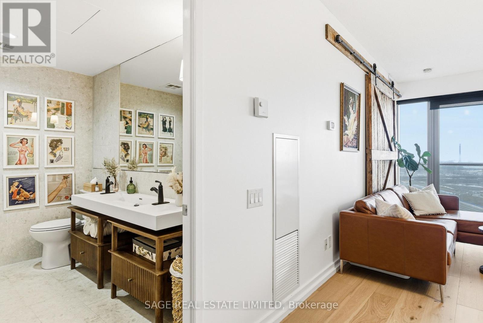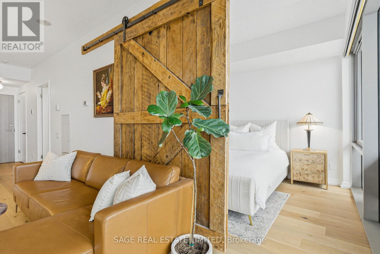Fully renovated one-bedroom in the heart of the Distillery District-thoughtfully upgraded and immaculately maintained. Nearly 600 sq ft of bright, South East-facing living space finished with Coastal Retreat oak wide-plank engineered hardwood floors. Floor-to-ceiling windows flood the space with natural light and frame open views toward the lake, with a walkout to your private balcony.The kitchen features granite counters, stainless steel appliances, and a centre island. The bathroom has been finished with Corian double sinks, high-end faucets, a deep soaker tub, and a rain shower. A reclaimed wood barn door with black iron hardware connects the bedroom to the living area, offering flexibility without sacrificing the open feel. Steps to TTC, the DVP, and the Gardiner. A short walk to St. Lawrence Market and the Financial District. 24/7 concierge and full building amenities included. One parking spot included. (id:50787)