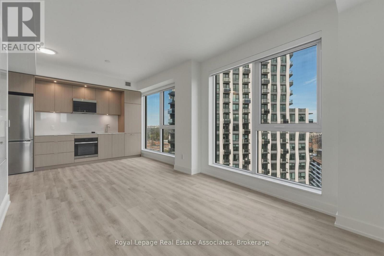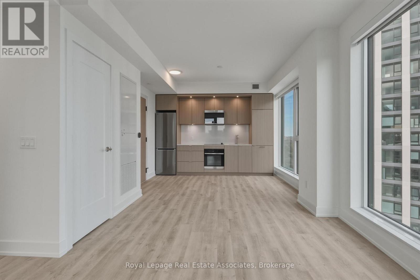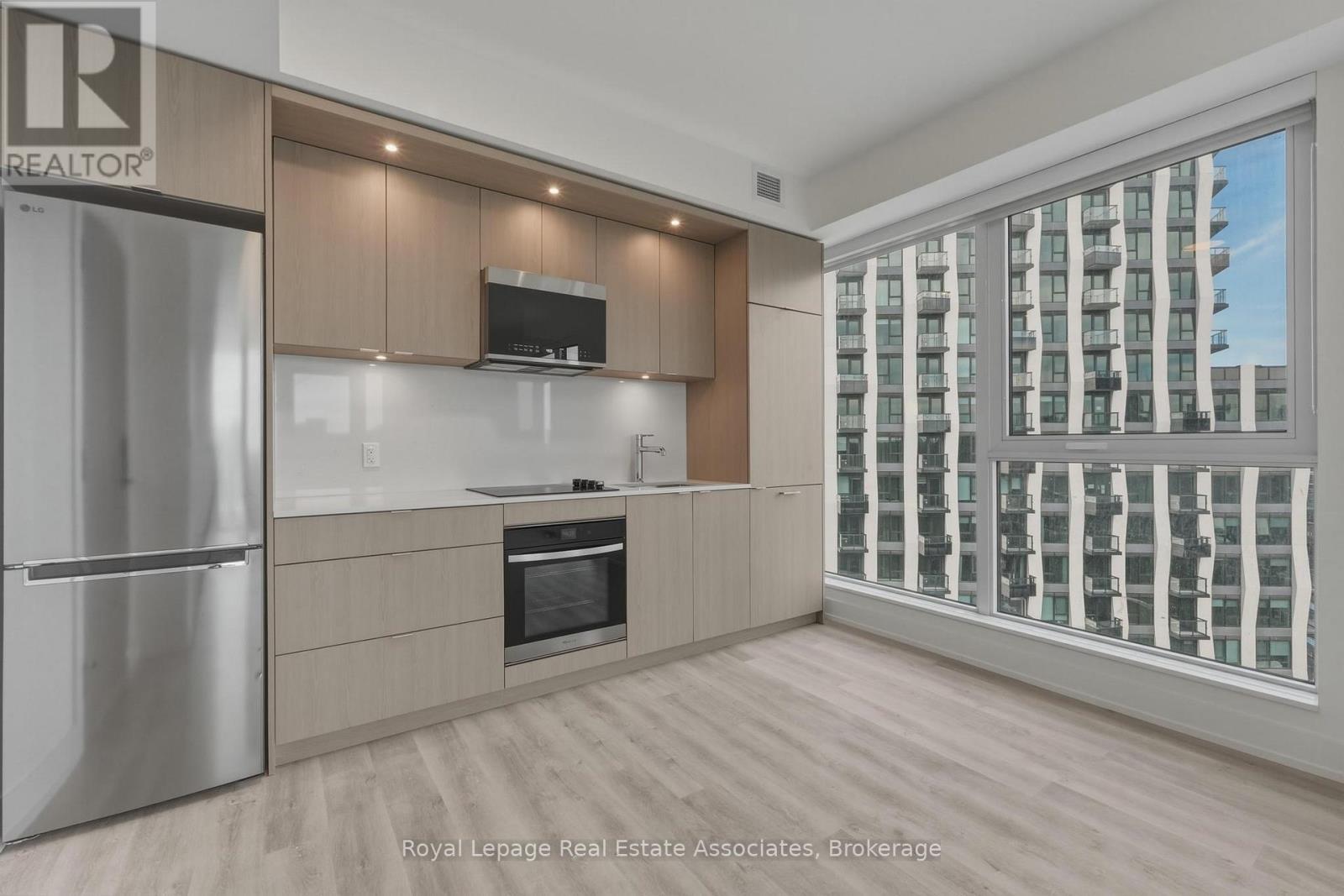 Welcome to Westerly 1, where contemporary design meets elevated urban living in the heart of Islington-City Centre West. This 1-bedroom suite offers a bright, carpet-free layout with modern finishes throughout, thoughtfully designed for comfortable everyday living. The modern kitchen features built-in stainless steel appliances and sleek cabinetry, flowing seamlessly into the combined dining and living area. Expansive floor-to-ceiling windows wrap around the curved façade, filling the space with natural light, while a walk-out leads to a private balcony, extending the living area outdoors. The bedroom offers a well-proportioned layout with a large closet and floor-to-ceiling window, creating a bright and comfortable retreat. A contemporary 4-piece bathroom is finished with clean tilework and modern fixtures. In-suite laundry is conveniently located within the suite for added ease. Residents enjoy access to amenities including a fitness centre, guest suites, party and meeting rooms, and concierge service. Ideally located steps from transit, parks, shopping, and dining, this residence offers comfortable, well-connected living in a desirable Etobicoke community. (id:50787)