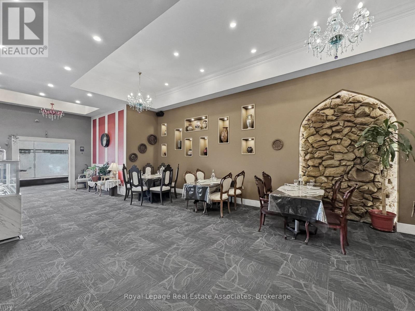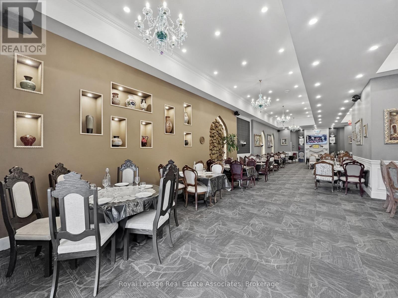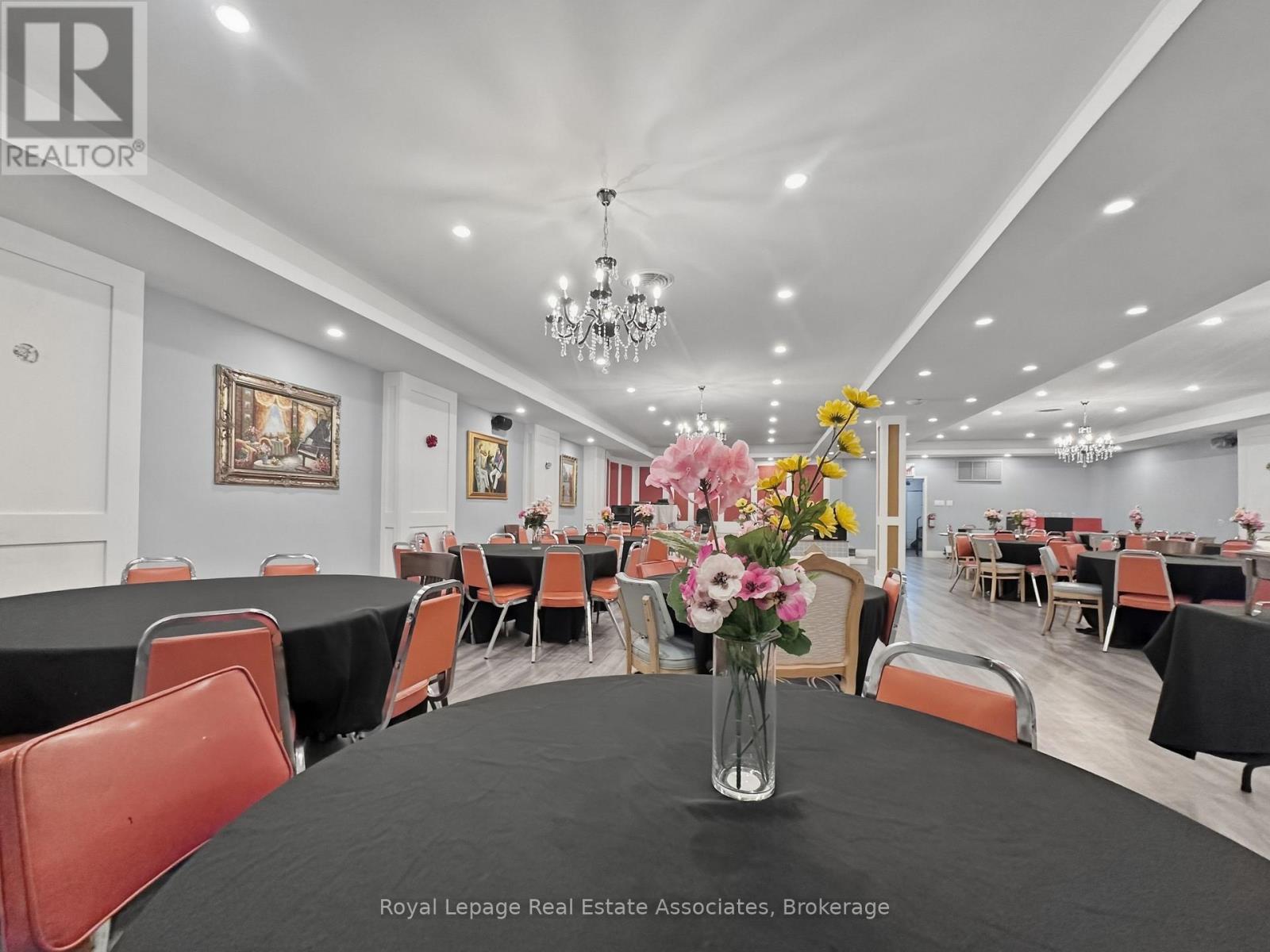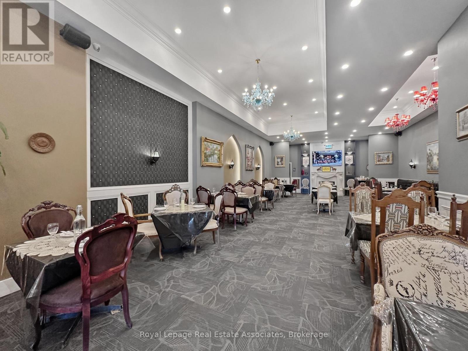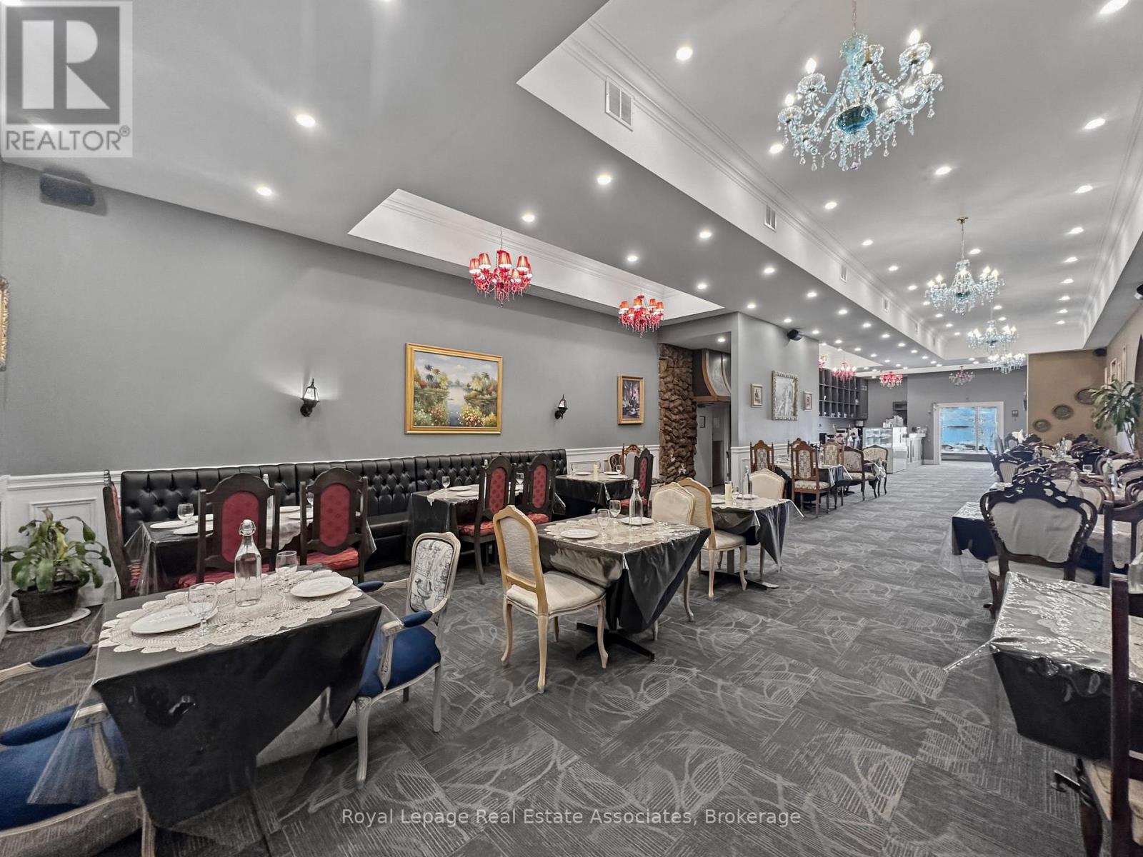 Exceptional opportunity to acquire a beautifully renovated turnkey restaurant located at 1850 Dundas St E in Mississauga. This impressive establishment offers approximately 210 seats in total, featuring an upscale dining area on the upper level with over 90 seats, highlighted by high ceilings, elegant finishes, and custom fireplaces that create a warm and sophisticated atmosphere. The lower level features a spacious banquet hall with seating for approximately 120 guests, ideal for private events, celebrations, and large group dining.Strategically positioned directly on Dundas Street, the property benefits from excellent visibility and strong through traffic. Situated in a busy plaza with ample parking, with only two restaurants in the entire plaza, offering a unique advantage and strong customer draw.The restaurant features a generously sized kitchen suitable for high-volume operations and a variety of cuisines. LLBO license in place, providing an excellent opportunity to expand the dining and event experience.Current rent is $6,624 per month including TMI and tax. A fantastic opportunity for restaurateurs or investors seeking a fully built-out restaurant with banquet capacity in a prime Mississauga location. (id:50787)