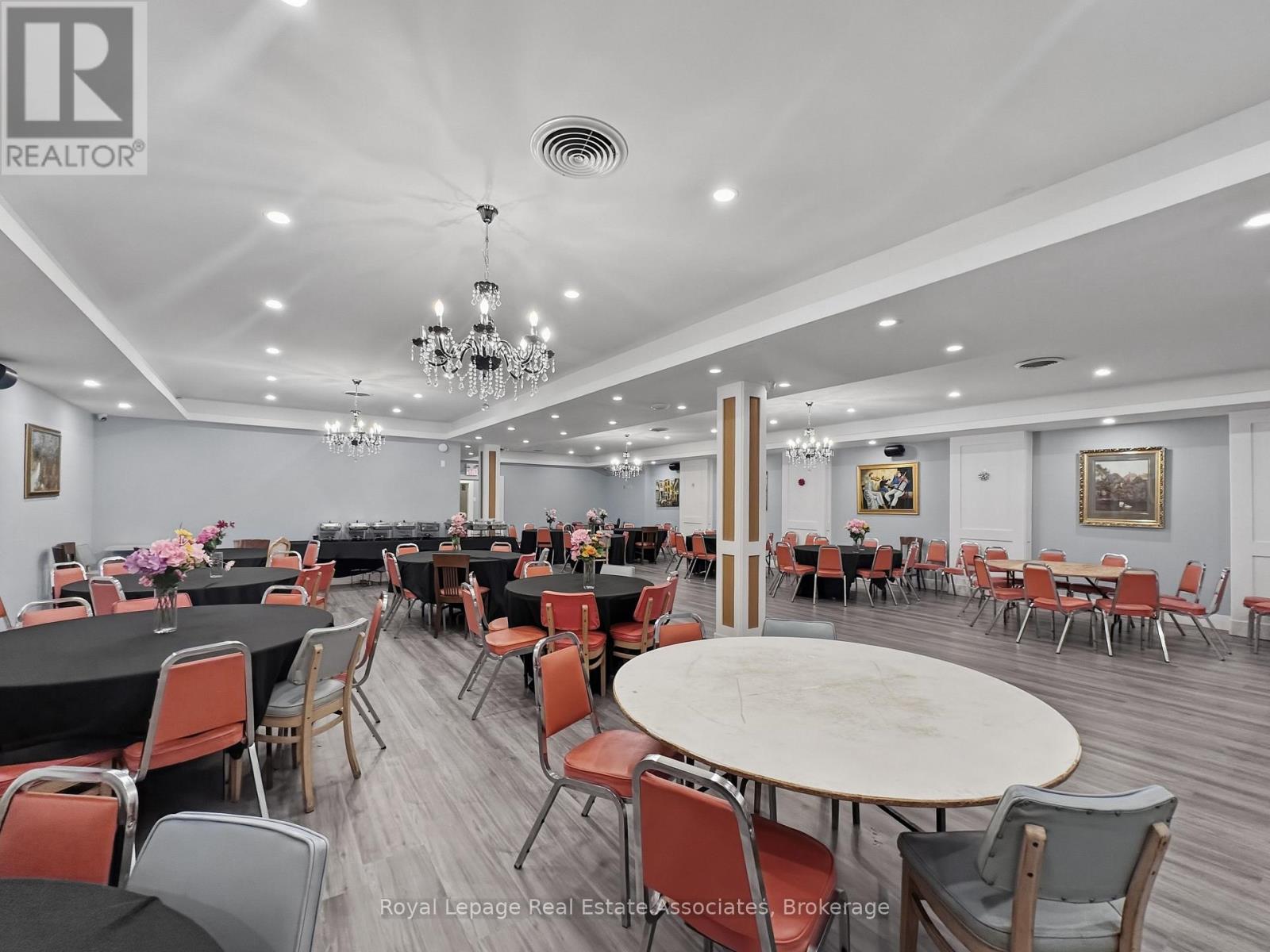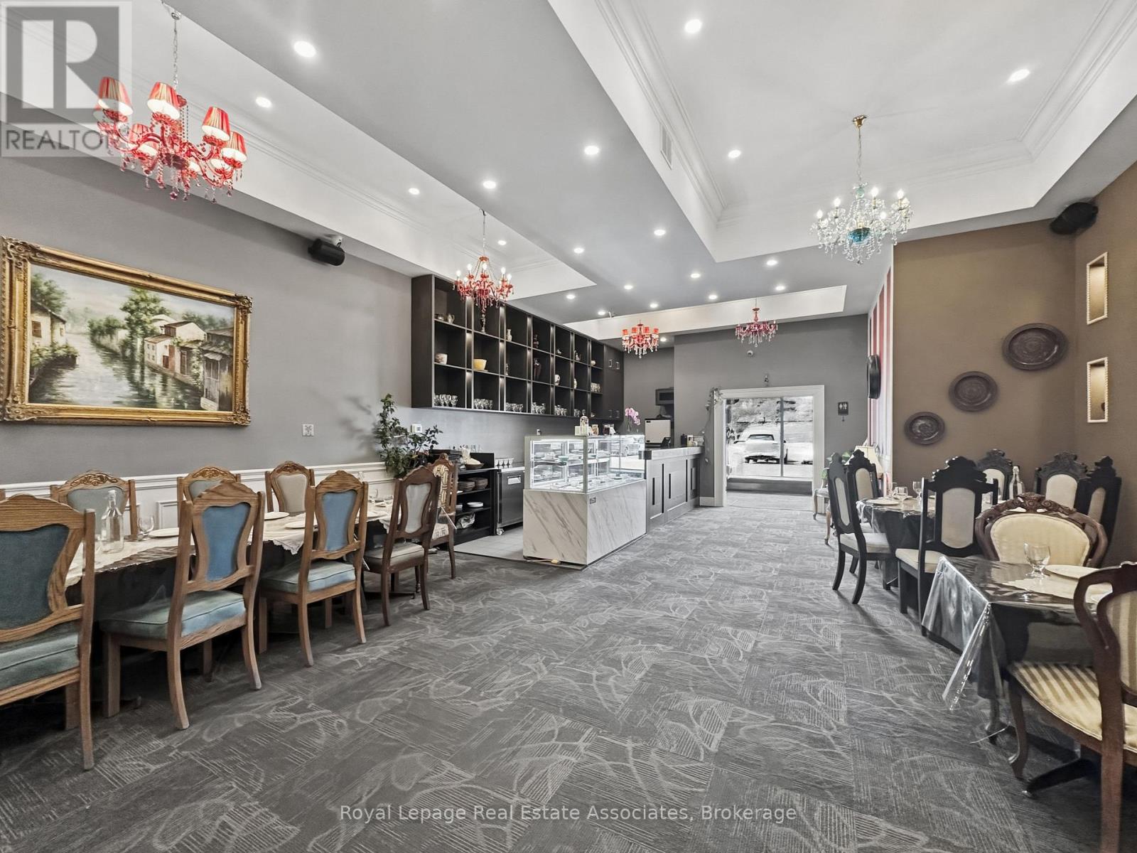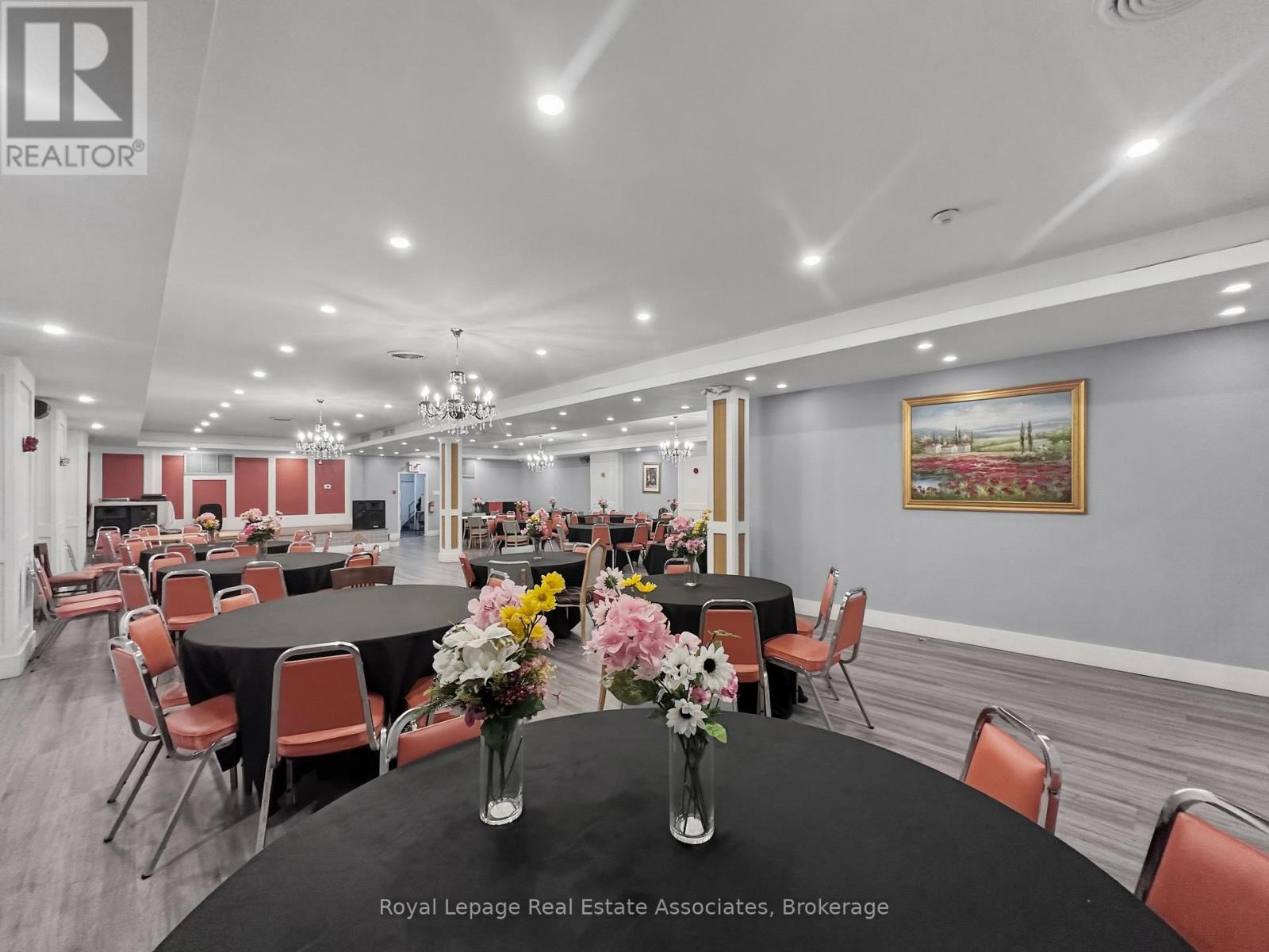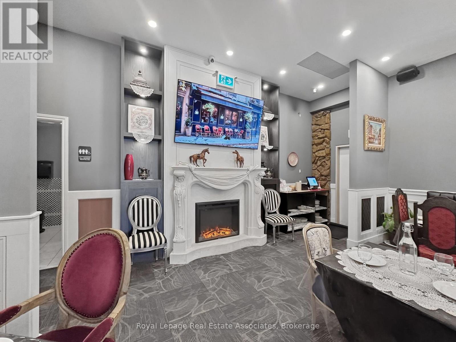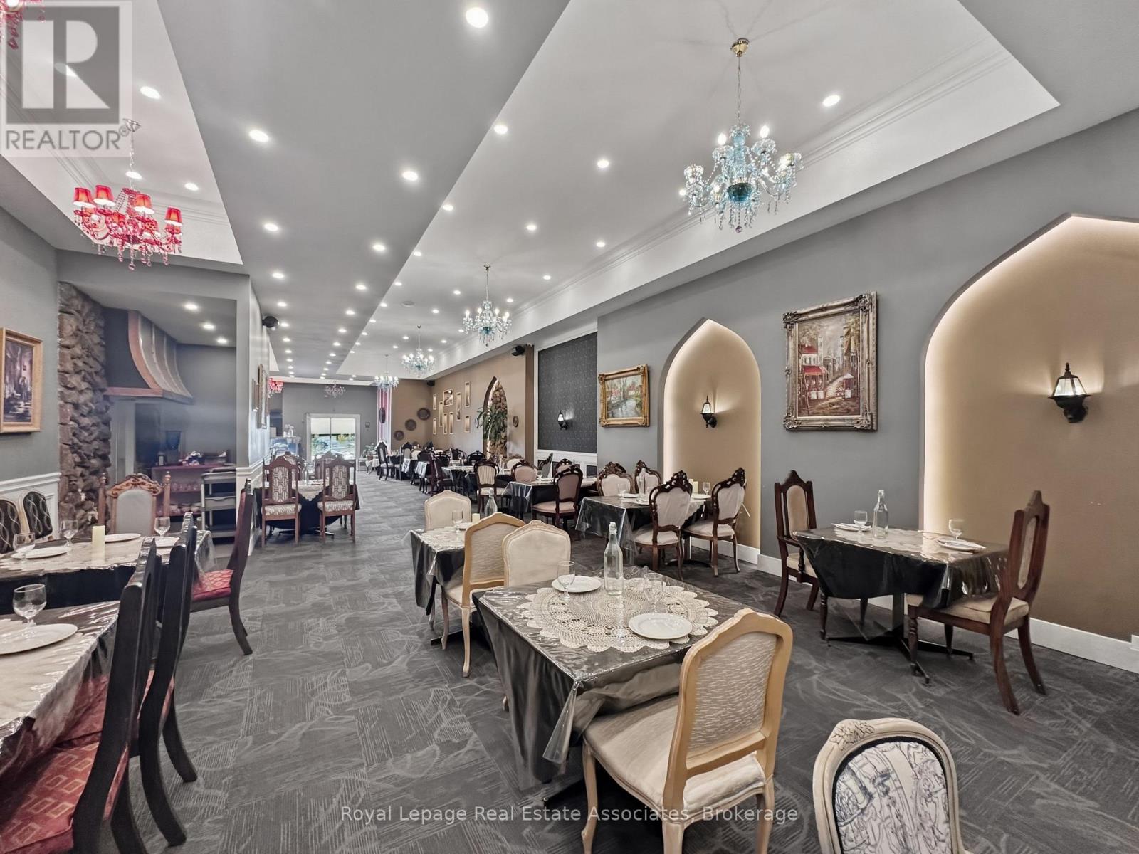 Exceptional opportunity to acquire a beautifully renovated turnkey restaurant located at 1850 Dundas St E in Mississauga. This impressive establishment offers approximately 210 seats in total, featuring an upscale dining area on the upper level with over 90 seats, highlighted by high ceilings, elegant finishes, and custom fireplaces that create a warm and sophisticated atmosphere. The lower level features a spacious banquet hall with seating for approximately 120 guests, ideal for private events, celebrations, and large group dining.Strategically positioned directly on Dundas Street, the property benefits from excellent visibility and strong through traffic. Situated in a busy plaza with ample parking, with only two restaurants in the entire plaza, offering a unique advantage and strong customer draw.The restaurant features a generously sized kitchen suitable for high-volume operations and a variety of cuisines. LLBO license in place, providing an excellent opportunity to expand the dining and event experience.Current rent is $6,624 per month including TMI and tax. A fantastic opportunity for restaurateurs or investors seeking a fully built-out restaurant with banquet capacity in a prime Mississauga location. (id:50787)