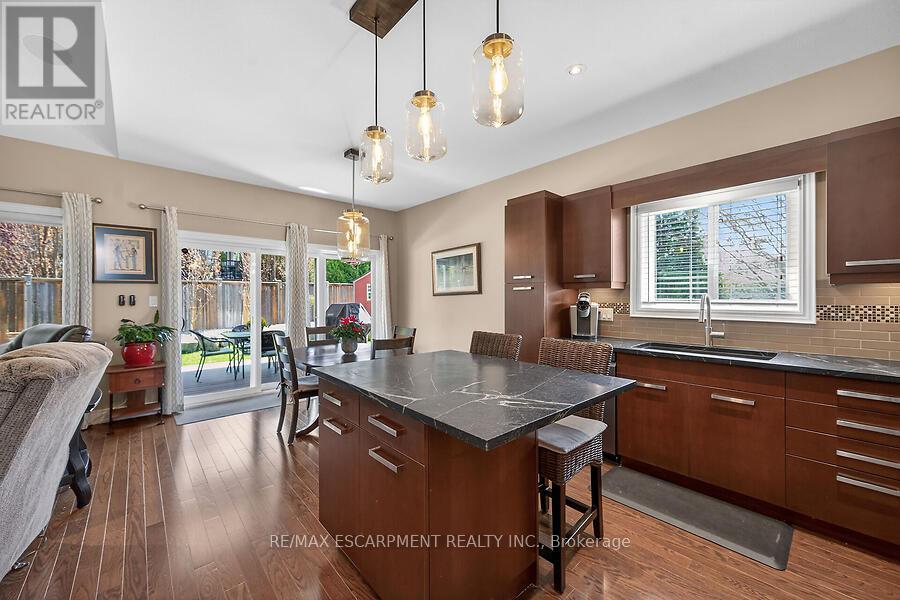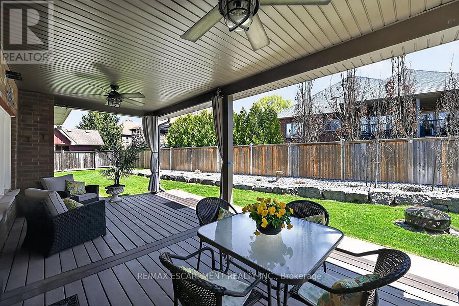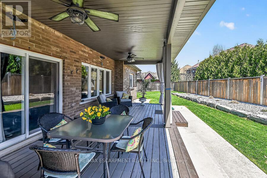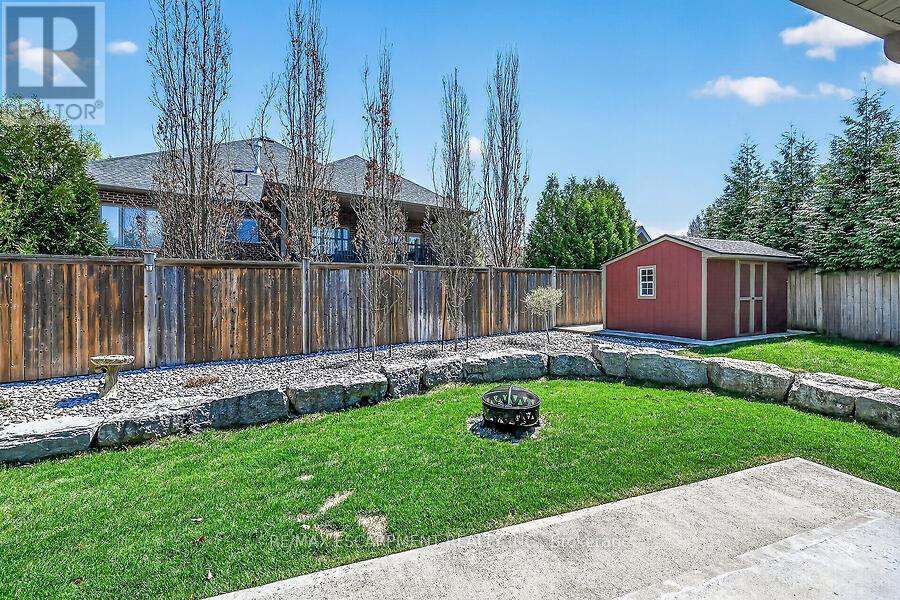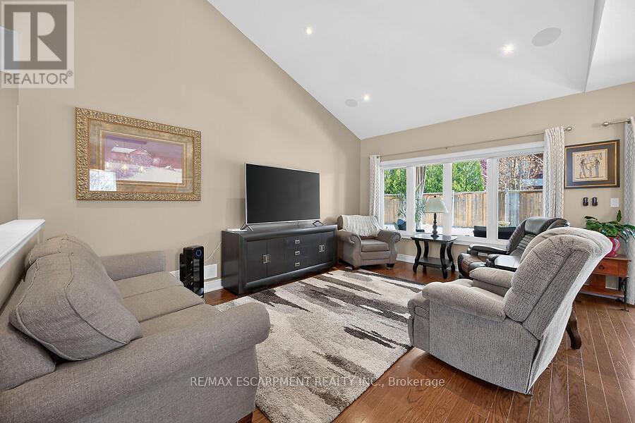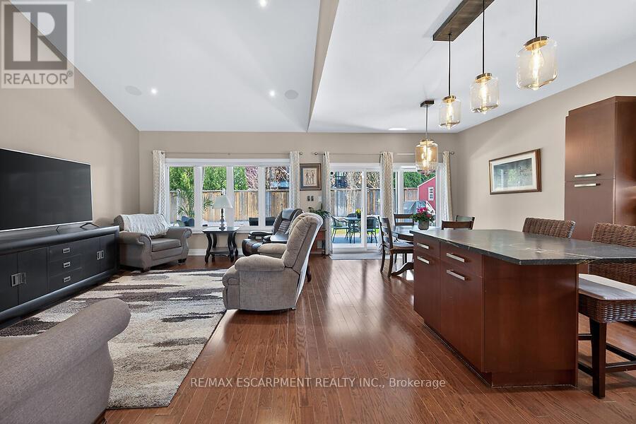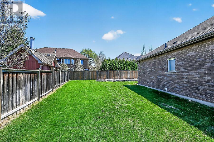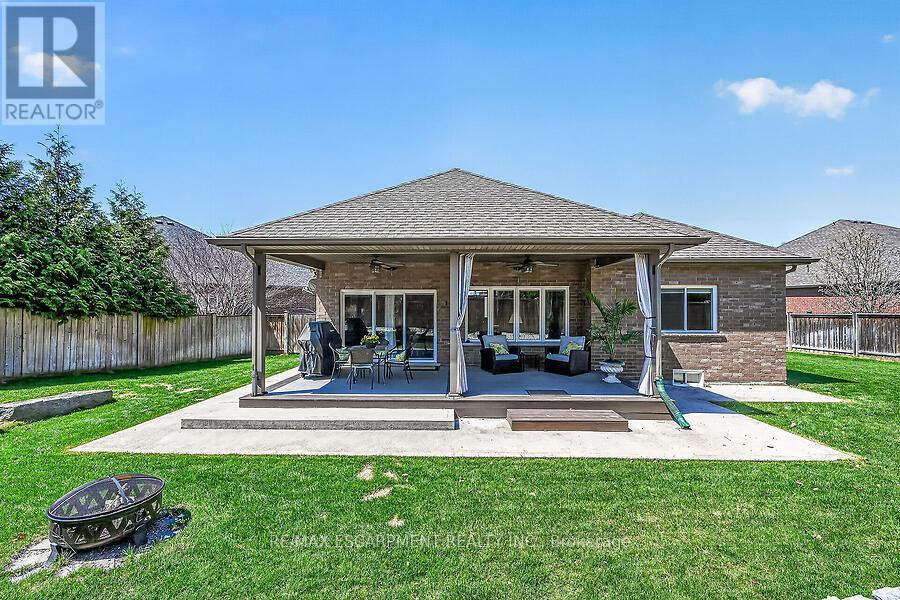 Welcome to this beautifully maintained bungalow in the quaint hamlet of Fenwick, just minutes to Fonthill and Niagara's renowned wine country. Built in 2012, this all brick and stone home offers a layout with 3+1 bedrooms and 3 full bathrooms, set on a fully fenced lot in the exclusive enclave of Cherry Ridge Estates. A bright foyer welcomes you into the open-concept main floor featuring vaulted ceilings in the living room, hardwood flooring throughout, and a stylish kitchen complete with soft-close cabinetry, sandstone countertops, and a movable island. Sliding doors lead to a composite deck with a covered seating area (elongated roof line), perfect for outdoor entertaining. The primary bedroom includes a private ensuite and walk-in closet, while the main floor also offers a second full bath and laundry/mud room to the garage. The finished lower level boasts a spacious family games room ideal for gatherings or movie nights with electric fireplace, along with a den with storage and barn doors for added privacy, and separate 3 piece bath. With direct access from the utility room to the garage, the lower level offers excellent in-law suite potential. Bonus: oversized double car garage, landscaped yard with sprinkler system, and natural gas BBQ hookup and shed. (id:50787)