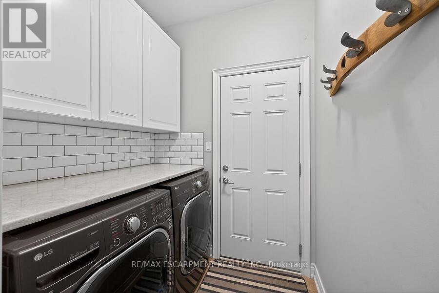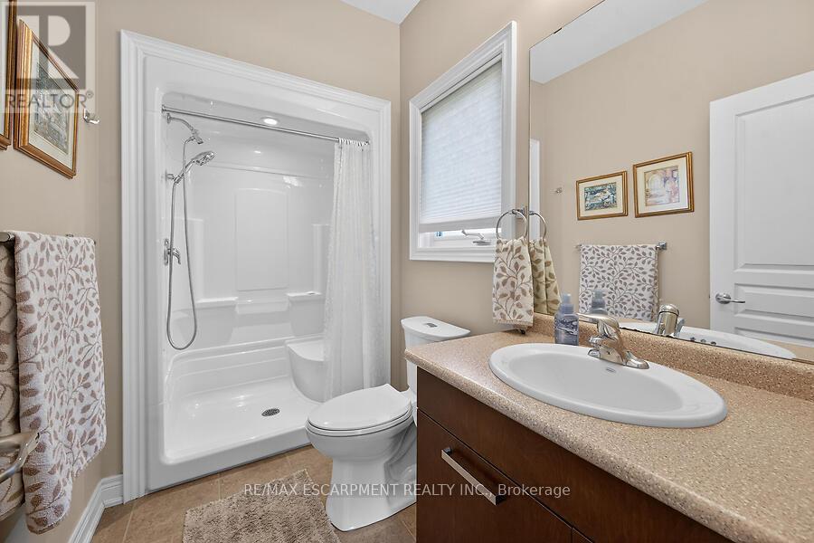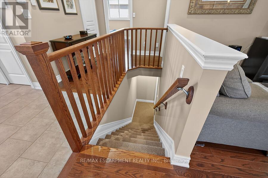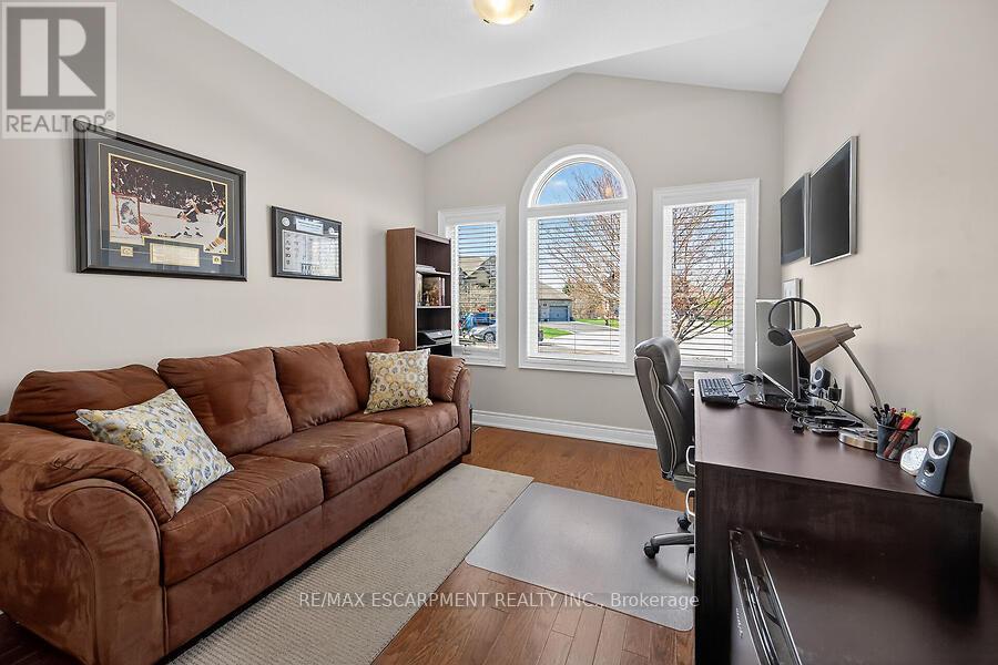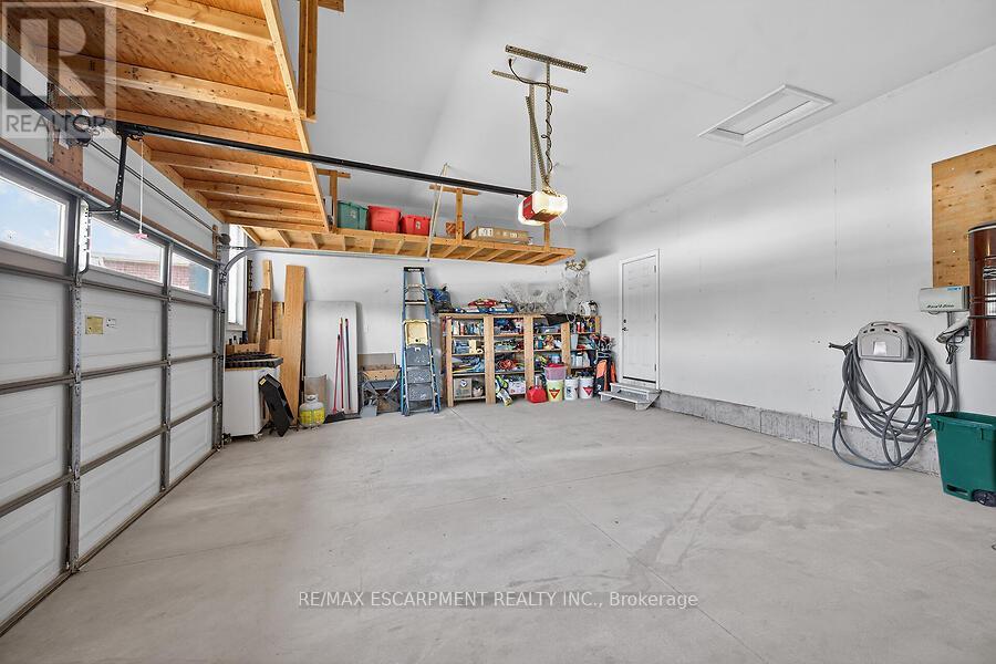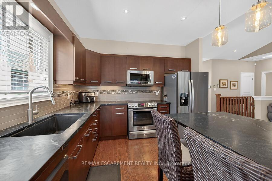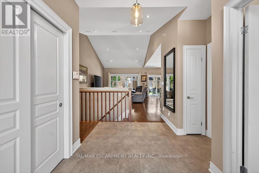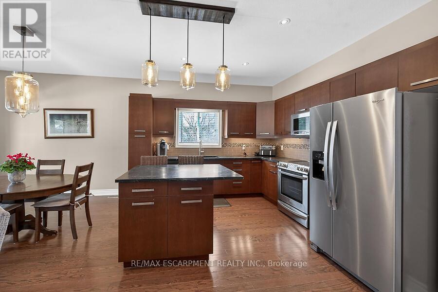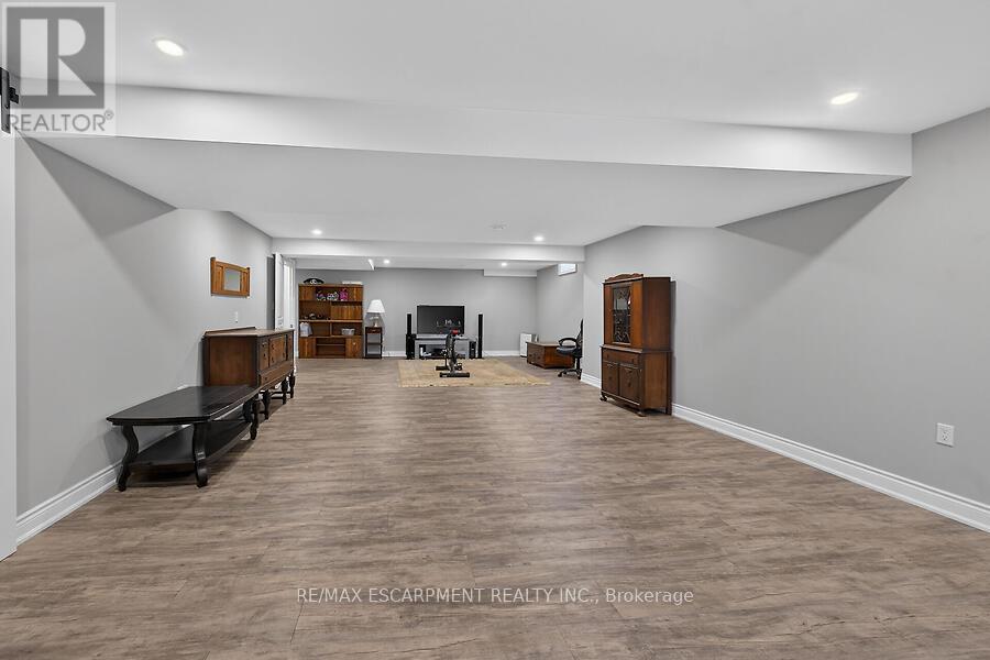 Welcome to this beautifully maintained bungalow in the quaint hamlet of Fenwick, just minutes to Fonthill and Niagara's renowned wine country. Built in 2012, this all brick and stone home offers a layout with 3+1 bedrooms and 3 full bathrooms, set on a fully fenced lot in the exclusive enclave of Cherry Ridge Estates. A bright foyer welcomes you into the open-concept main floor featuring vaulted ceilings in the living room, hardwood flooring throughout, and a stylish kitchen complete with soft-close cabinetry, sandstone countertops, and a movable island. Sliding doors lead to a composite deck with a covered seating area (elongated roof line), perfect for outdoor entertaining. The primary bedroom includes a private ensuite and walk-in closet, while the main floor also offers a second full bath and laundry/mud room to the garage. The finished lower level boasts a spacious family games room ideal for gatherings or movie nights with electric fireplace, along with a den with storage and barn doors for added privacy, and separate 3 piece bath. With direct access from the utility room to the garage, the lower level offers excellent in-law suite potential. Bonus: oversized double car garage, landscaped yard with sprinkler system, and natural gas BBQ hookup and shed. (id:50787)
