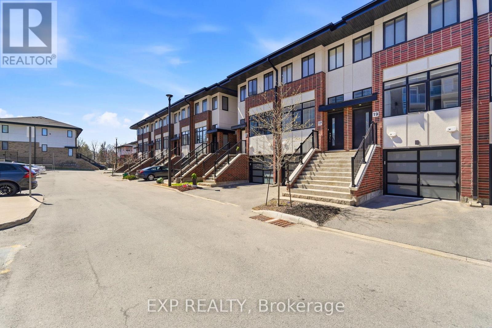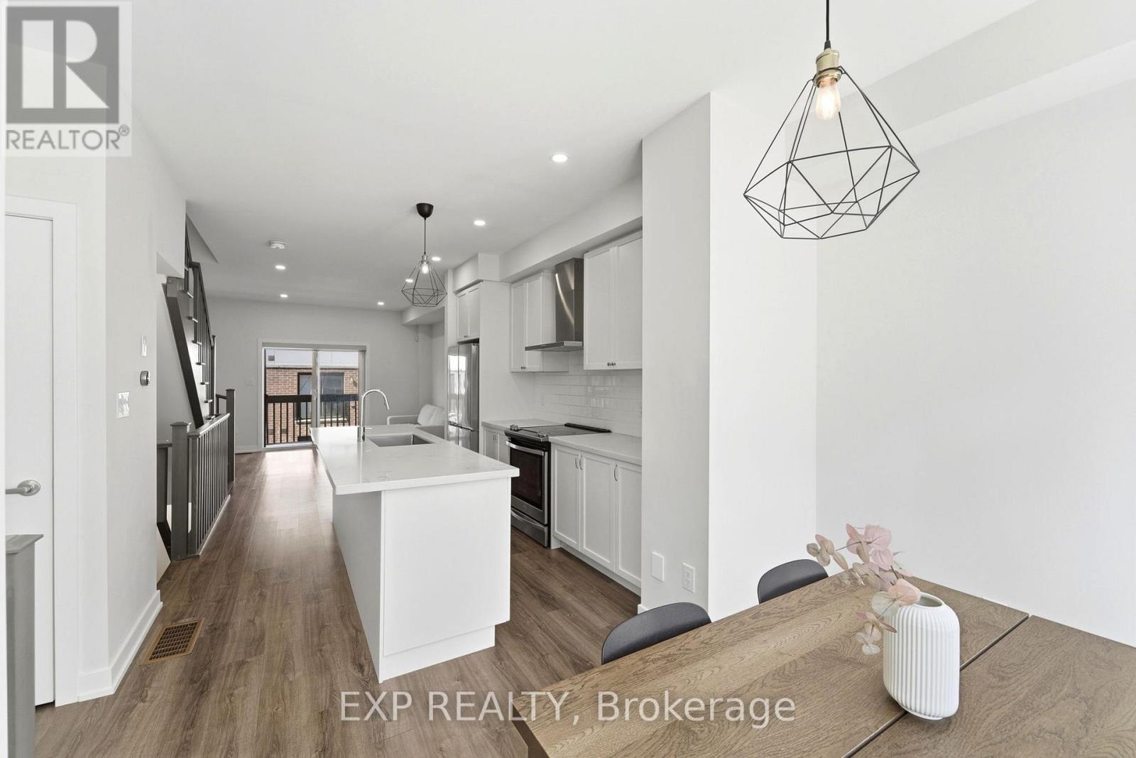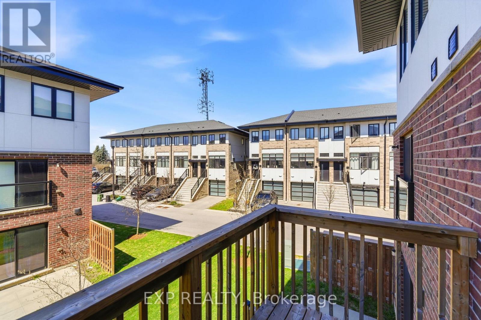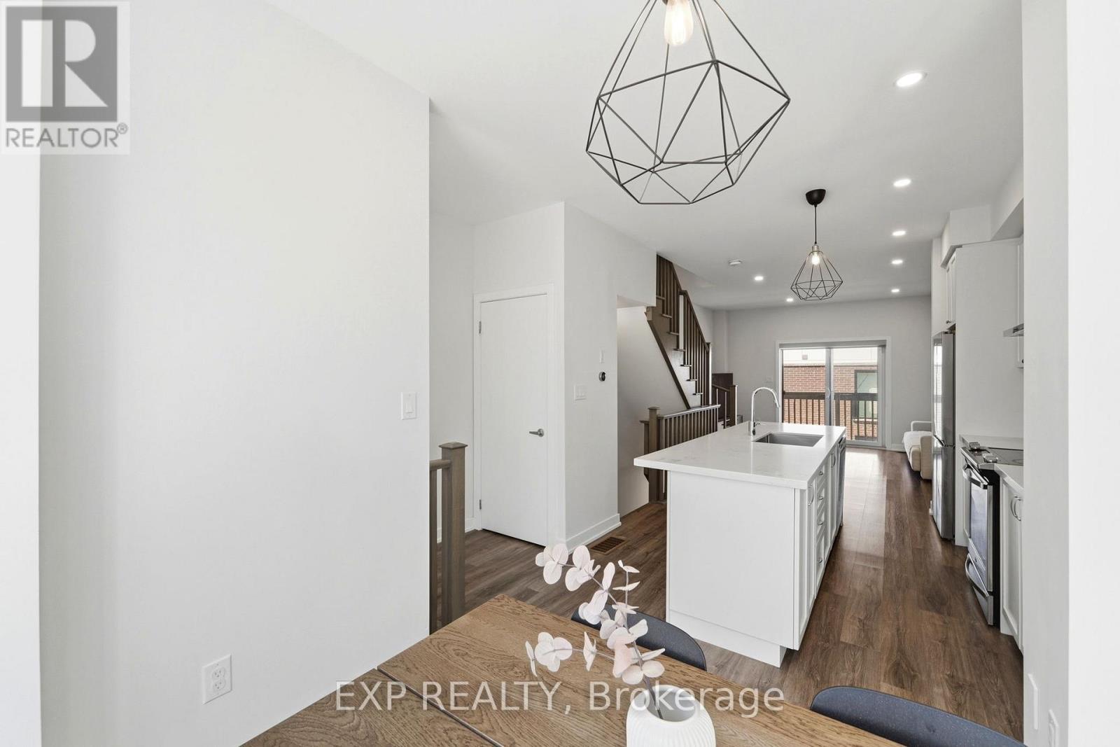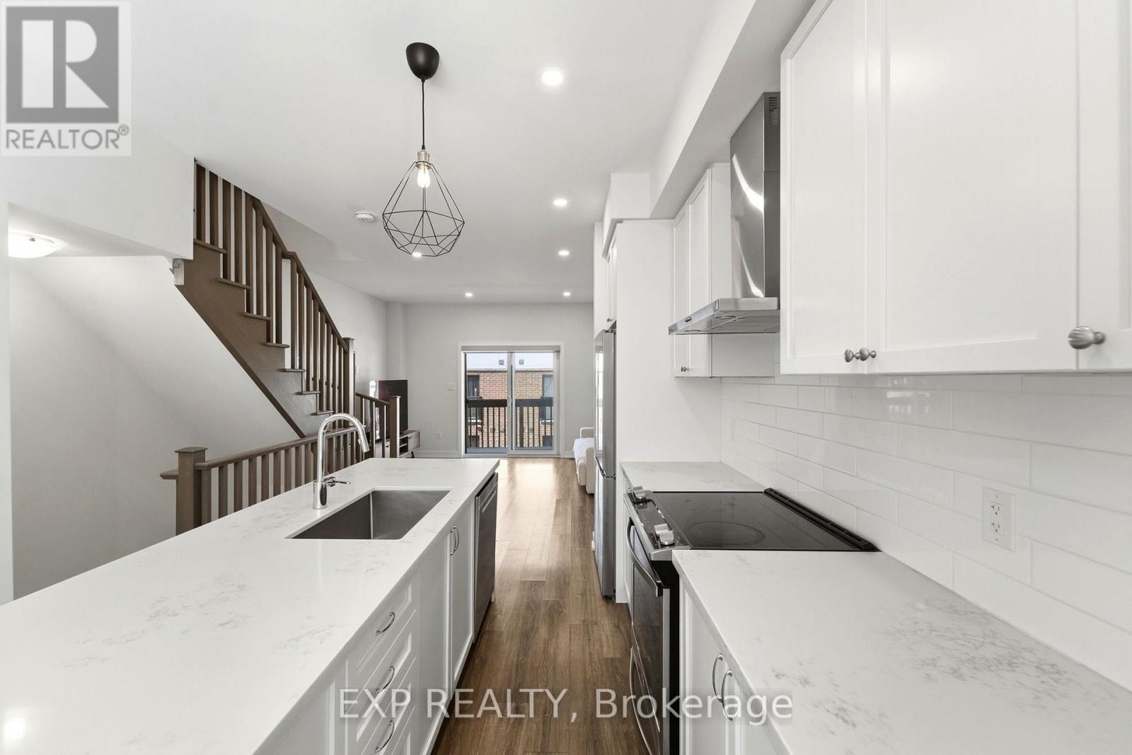 Modern 3-storey end-unit townhouse located in one of Ancaster's most desirable neighbourhoods, just minutes to Hwy 403, shopping, public transit, and all amenities. This bright, carpet-free home offers 3 bedrooms and 3 full bathrooms, including a primary bedroom featuring his and hers closets and a private ensuite, along with the convenience of bedroom-level laundry. The gourmet kitchen is equipped with quartz countertops, stainless steel appliances, a breakfast-bar island, and a spacious eat-in area. The open-concept living area is filled with natural light and features a walk-out access to a private balcony. The lower level provides exceptional flexibility and includes a 3-piece bathroom, making it ideal as a third bedroom, family room, home gym, or private office, with walk-out access to the yard. Additional features include 9-foot ceilings on the main level, an attached garage with inside entry and storage, ample visitor parking, and flexible possession. Move-in ready and perfect for a variety of lifestyles. (id:50787)