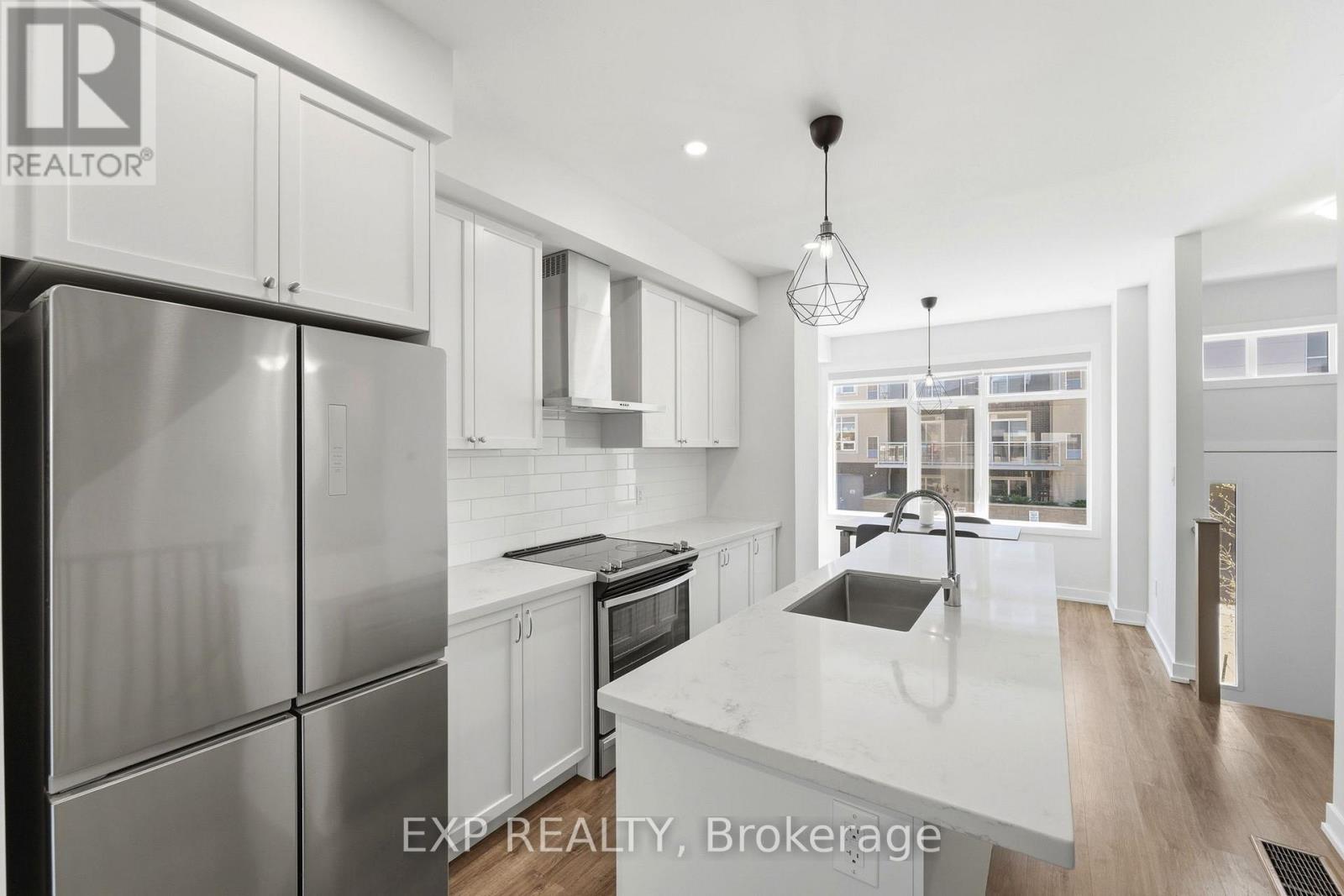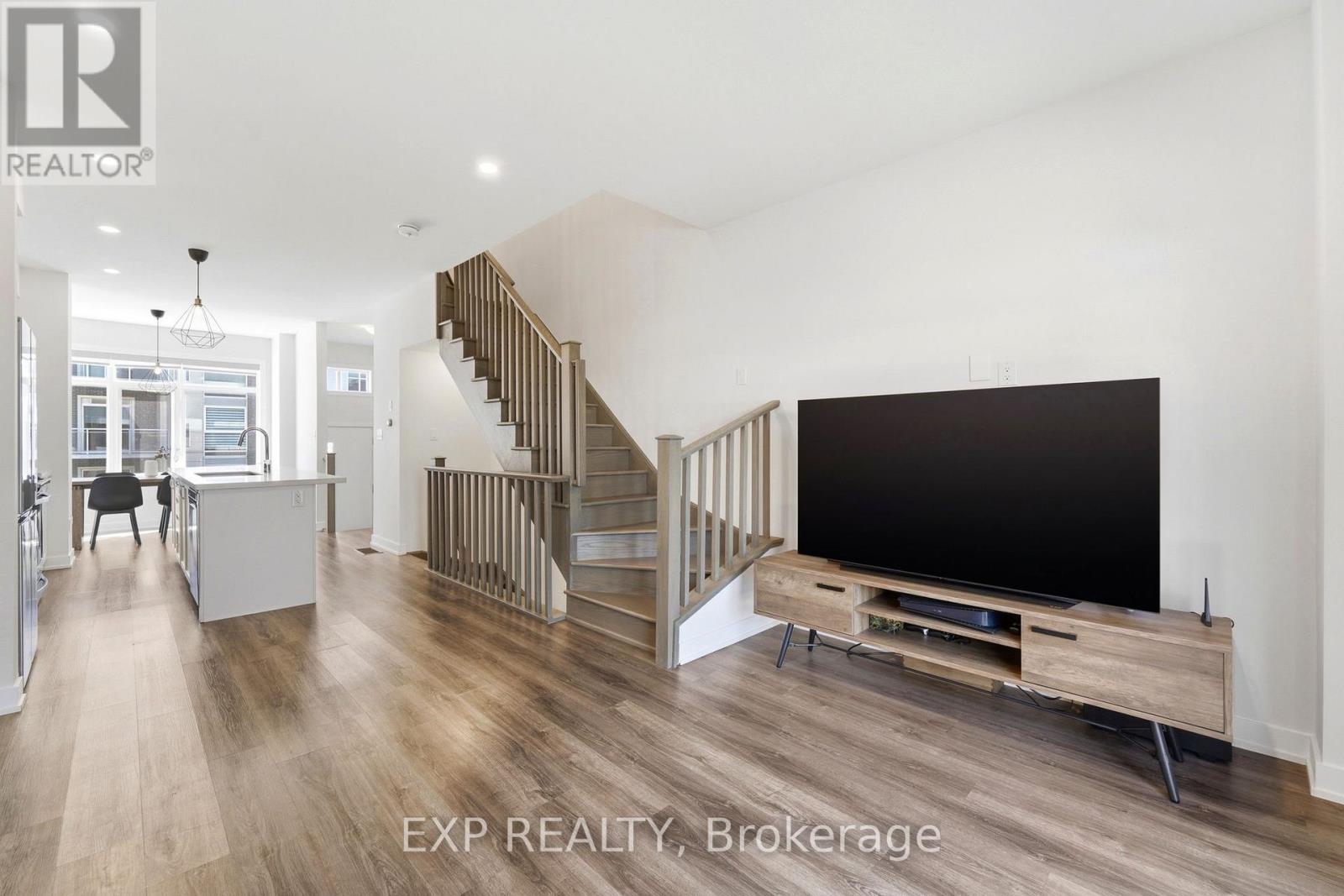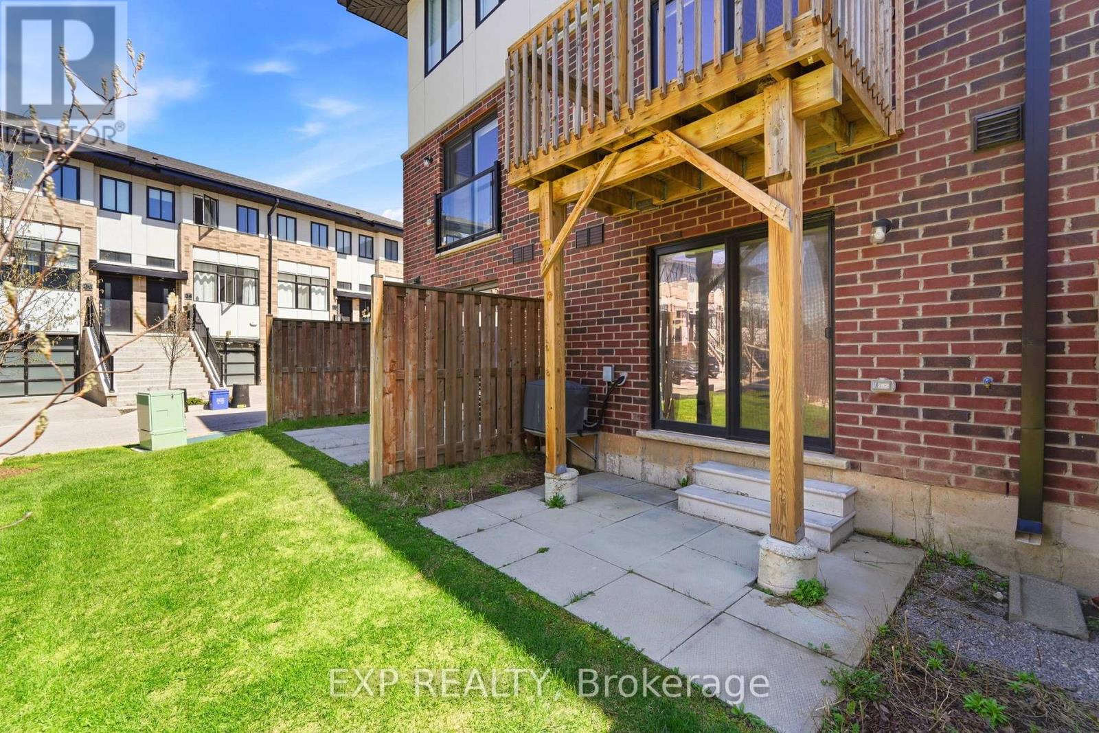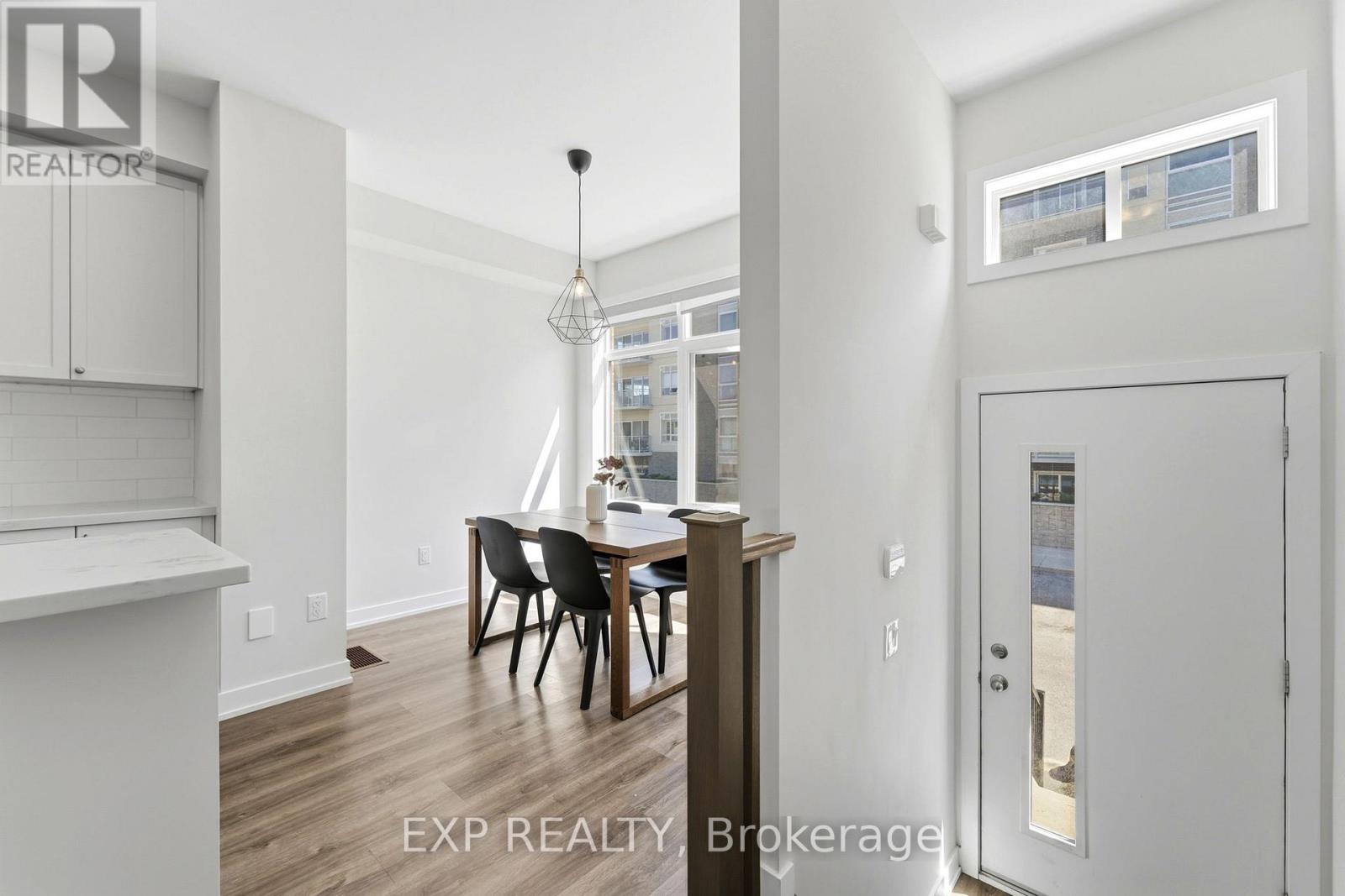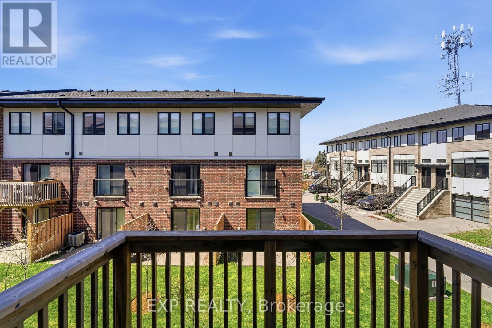 Modern 3-storey end-unit townhouse located in one of Ancaster's most desirable neighbourhoods, just minutes to Hwy 403, shopping, public transit, and all amenities. This bright, carpet-free home offers 3 bedrooms and 3 full bathrooms, including a primary bedroom featuring his and hers closets and a private ensuite, along with the convenience of bedroom-level laundry. The gourmet kitchen is equipped with quartz countertops, stainless steel appliances, a breakfast-bar island, and a spacious eat-in area. The open-concept living area is filled with natural light and features a walk-out access to a private balcony. The lower level provides exceptional flexibility and includes a 3-piece bathroom, making it ideal as a third bedroom, family room, home gym, or private office, with walk-out access to the yard. Additional features include 9-foot ceilings on the main level, an attached garage with inside entry and storage, ample visitor parking, and flexible possession. Move-in ready and perfect for a variety of lifestyles. (id:50787)