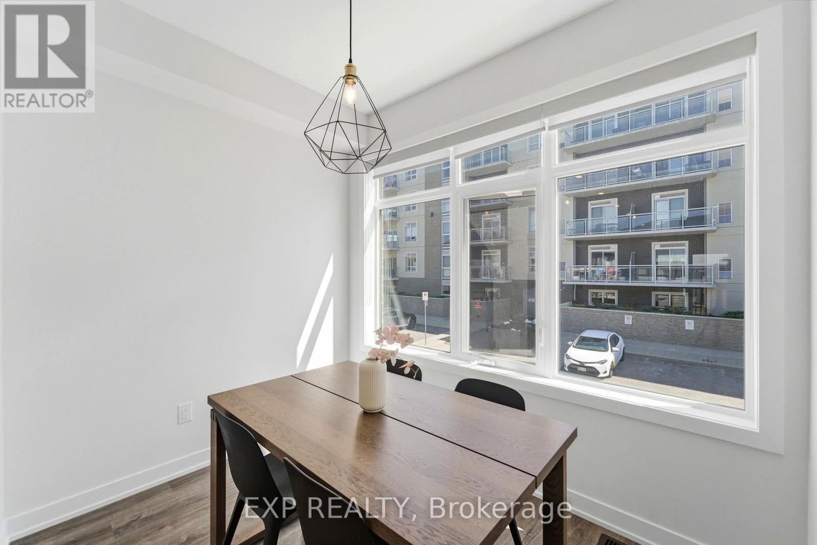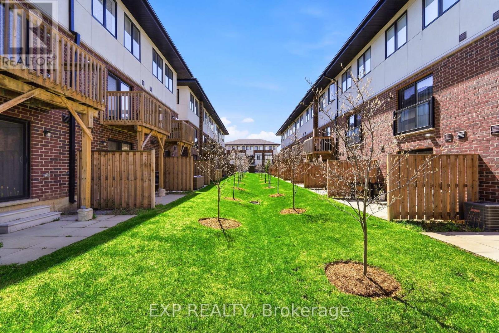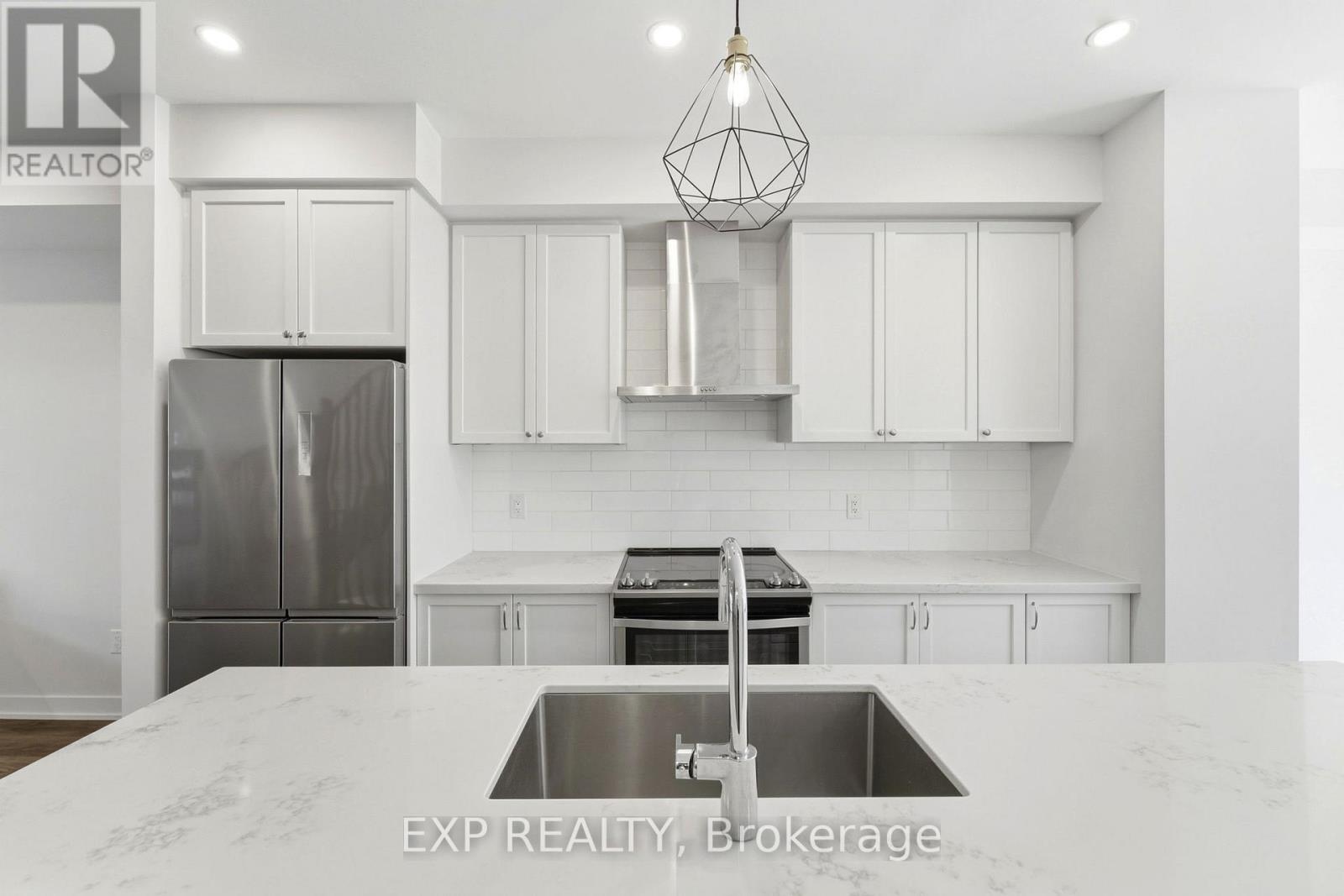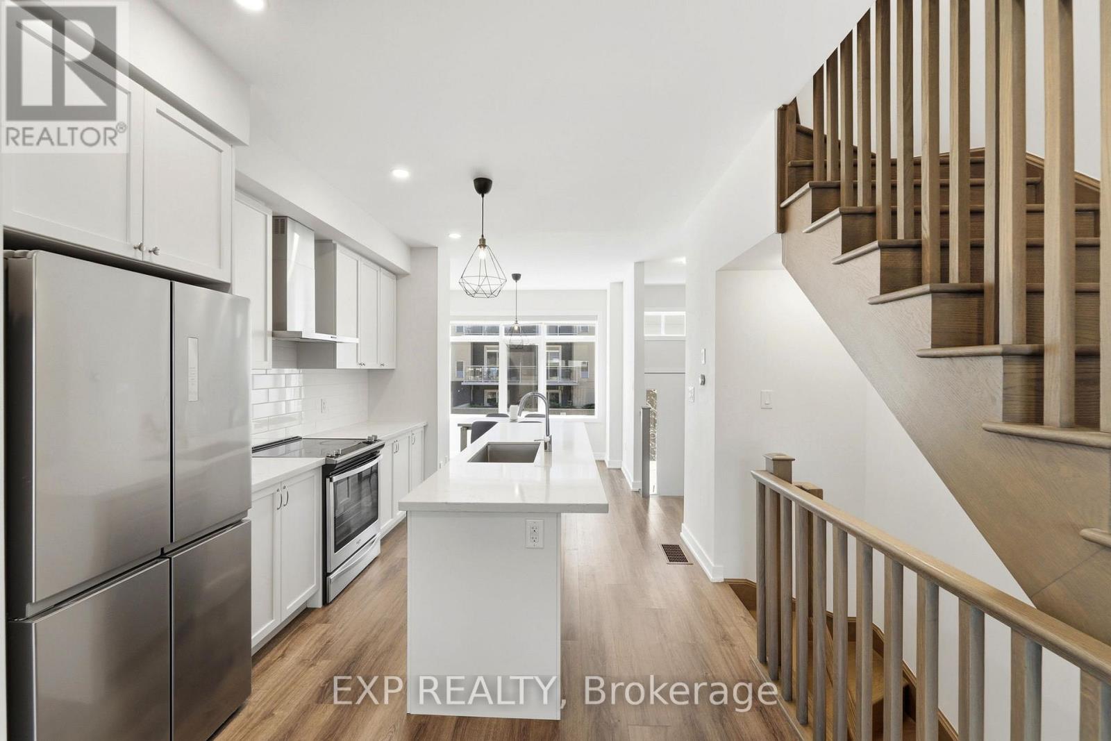 Modern 3-storey end-unit townhouse located in one of Ancaster's most desirable neighbourhoods, just minutes to Hwy 403, shopping, public transit, and all amenities. This bright, carpet-free home offers 3 bedrooms and 3 full bathrooms, including a primary bedroom featuring his and hers closets and a private ensuite, along with the convenience of bedroom-level laundry. The gourmet kitchen is equipped with quartz countertops, stainless steel appliances, a breakfast-bar island, and a spacious eat-in area. The open-concept living area is filled with natural light and features a walk-out access to a private balcony. The lower level provides exceptional flexibility and includes a 3-piece bathroom, making it ideal as a third bedroom, family room, home gym, or private office, with walk-out access to the yard. Additional features include 9-foot ceilings on the main level, an attached garage with inside entry and storage, ample visitor parking, and flexible possession. Move-in ready and perfect for a variety of lifestyles. (id:50787)
