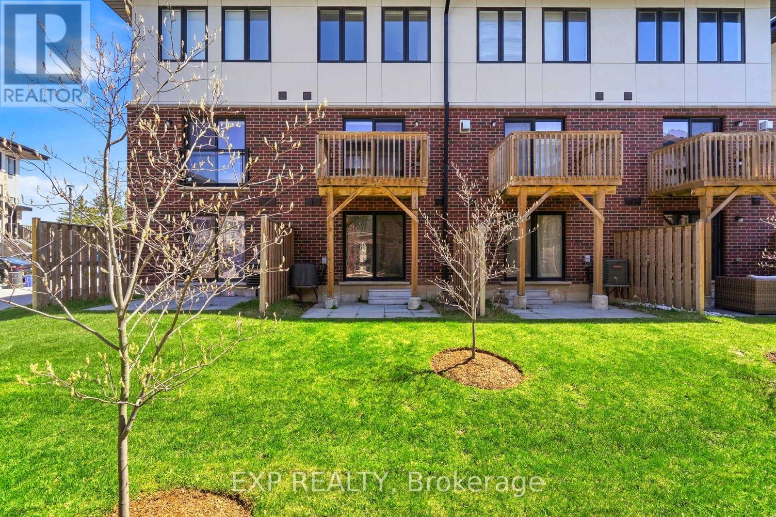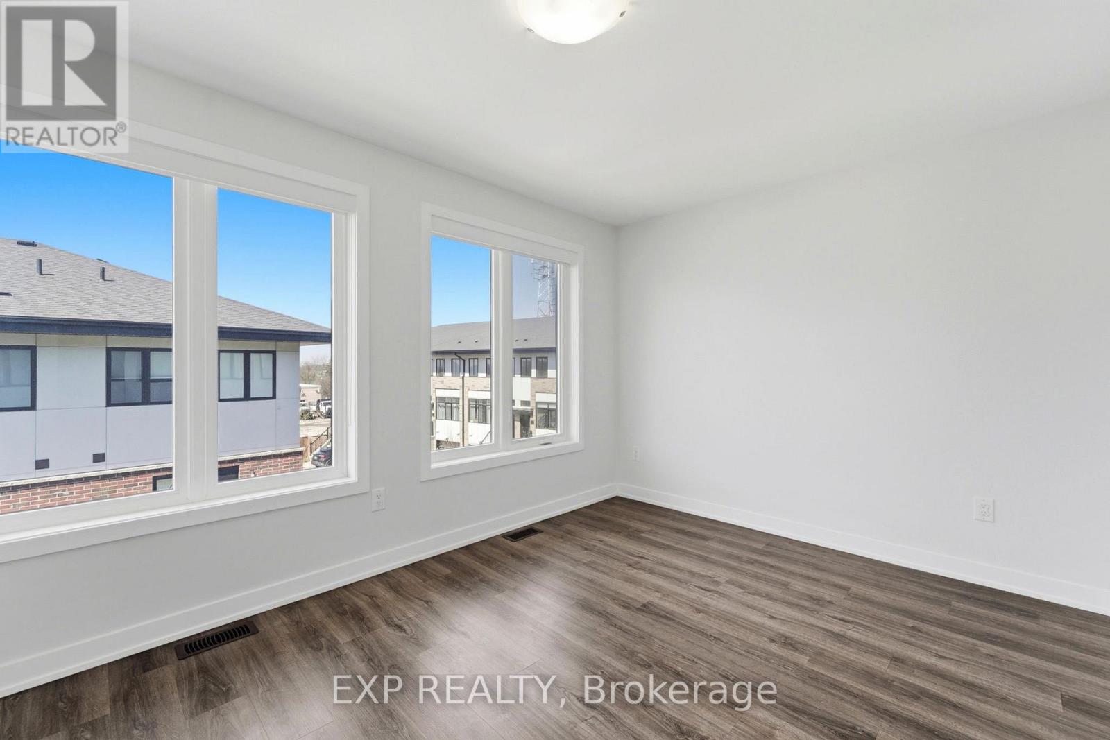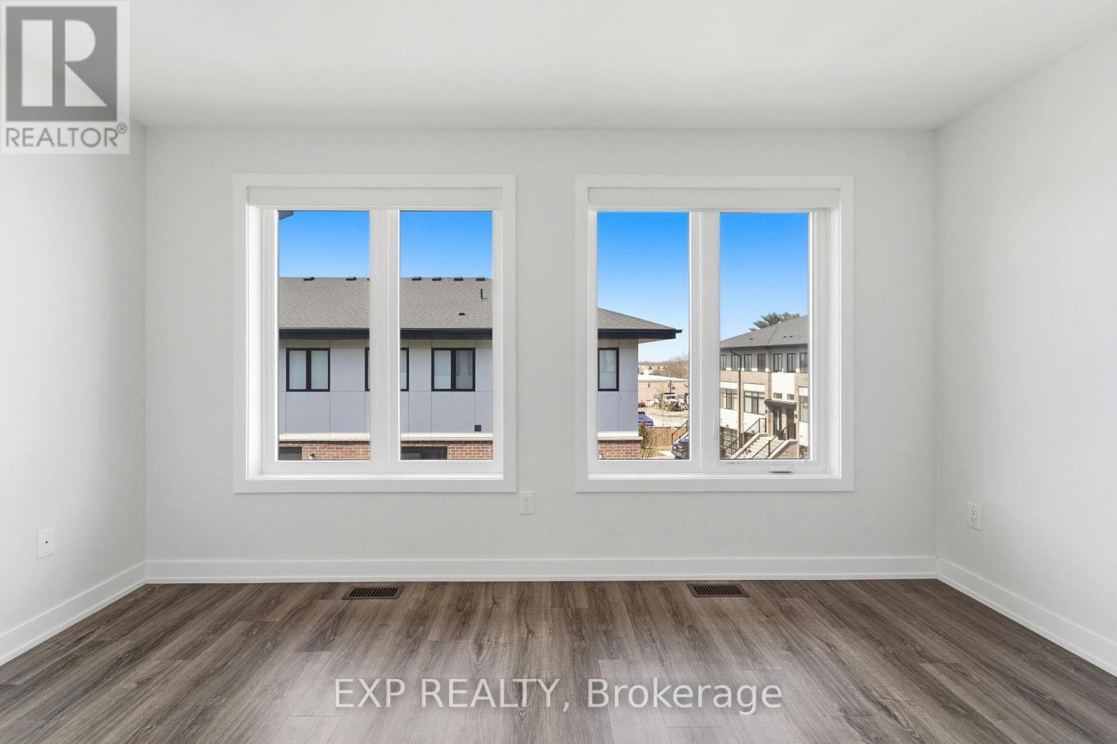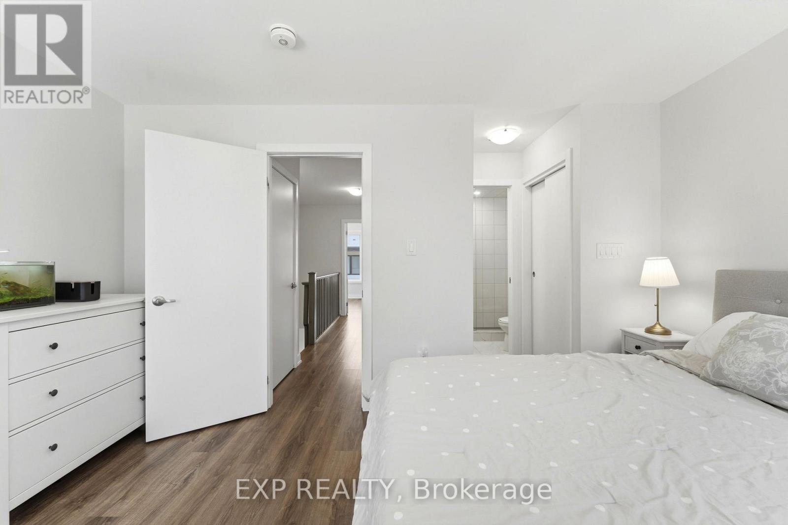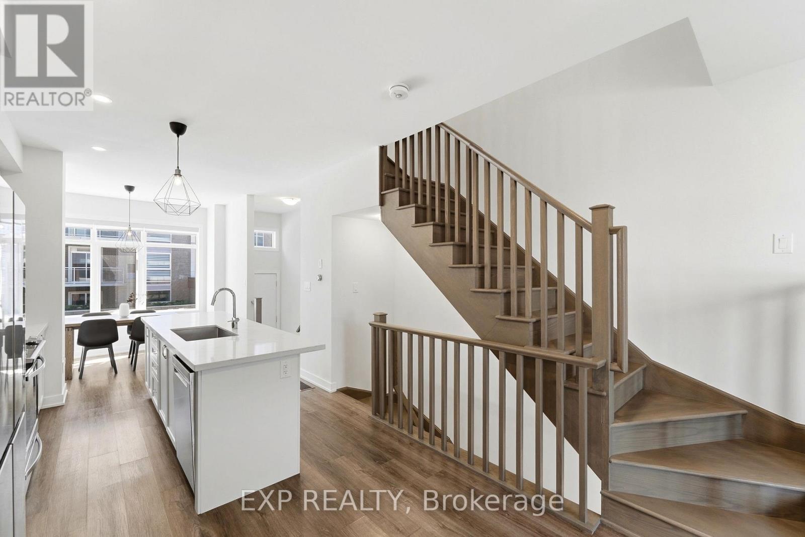 Modern 3-storey end-unit townhouse located in one of Ancaster's most desirable neighbourhoods, just minutes to Hwy 403, shopping, public transit, and all amenities. This bright, carpet-free home offers 3 bedrooms and 3 full bathrooms, including a primary bedroom featuring his and hers closets and a private ensuite, along with the convenience of bedroom-level laundry. The gourmet kitchen is equipped with quartz countertops, stainless steel appliances, a breakfast-bar island, and a spacious eat-in area. The open-concept living area is filled with natural light and features a walk-out access to a private balcony. The lower level provides exceptional flexibility and includes a 3-piece bathroom, making it ideal as a third bedroom, family room, home gym, or private office, with walk-out access to the yard. Additional features include 9-foot ceilings on the main level, an attached garage with inside entry and storage, ample visitor parking, and flexible possession. Move-in ready and perfect for a variety of lifestyles. (id:50787)