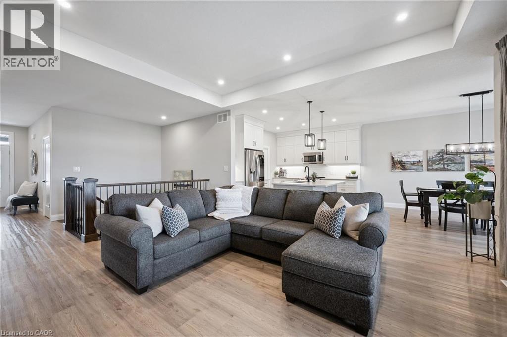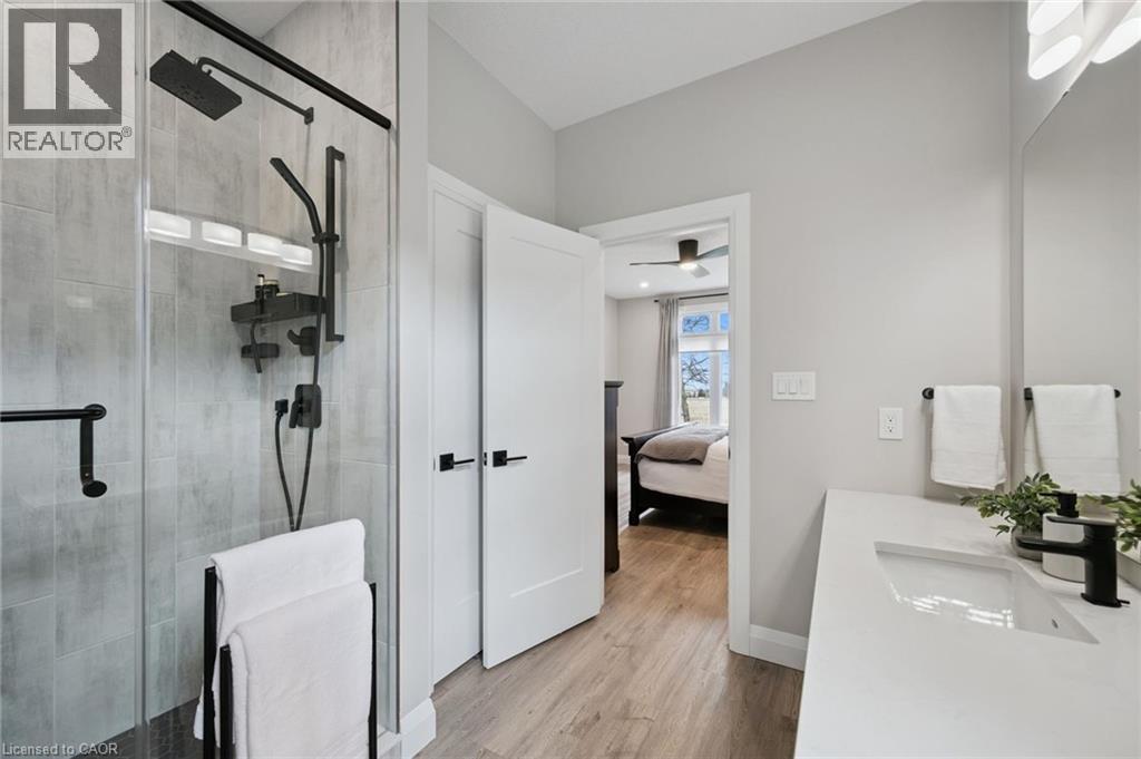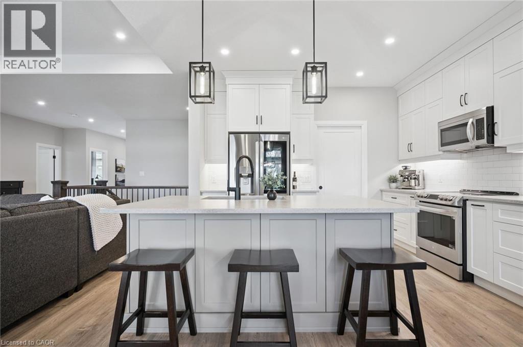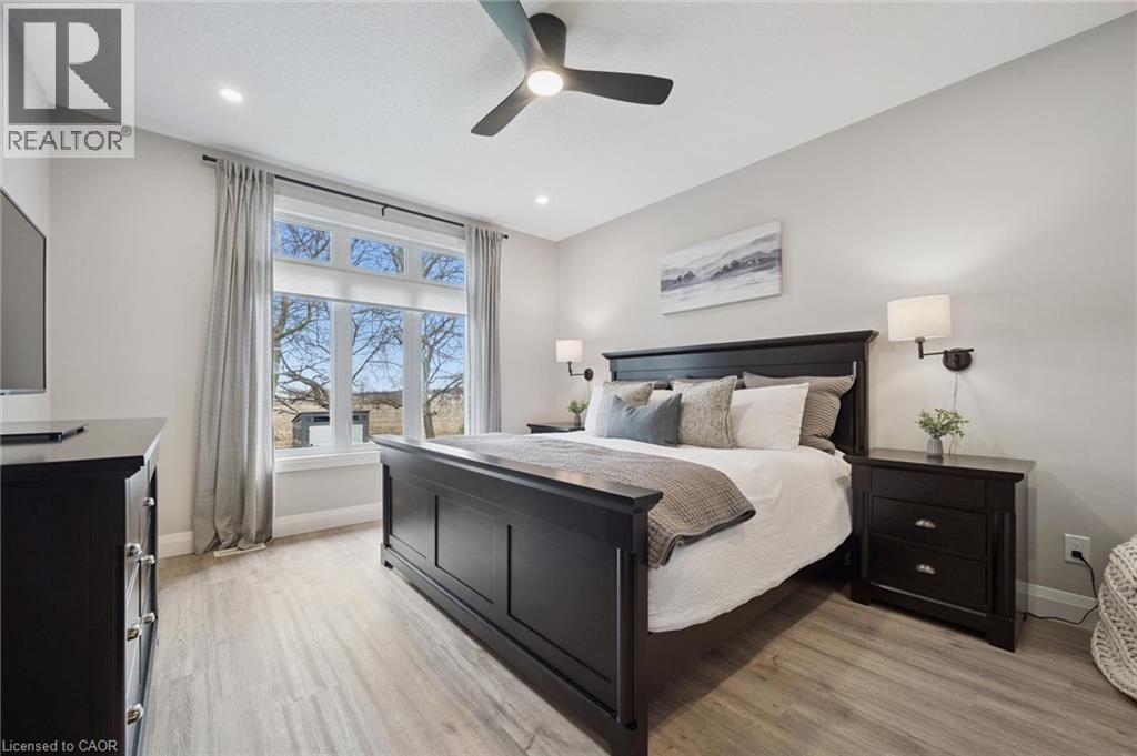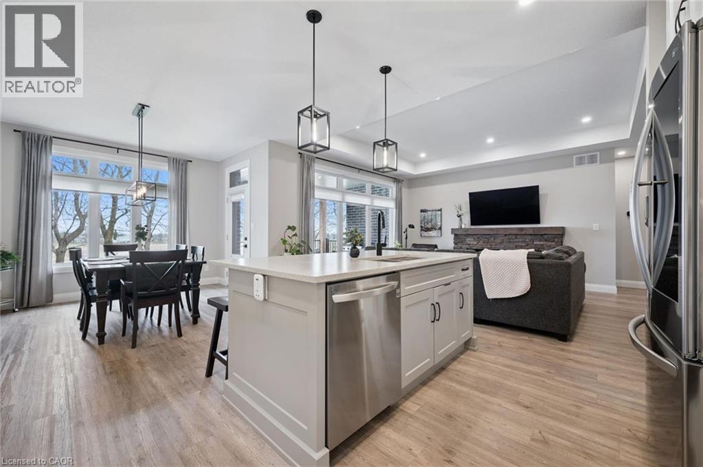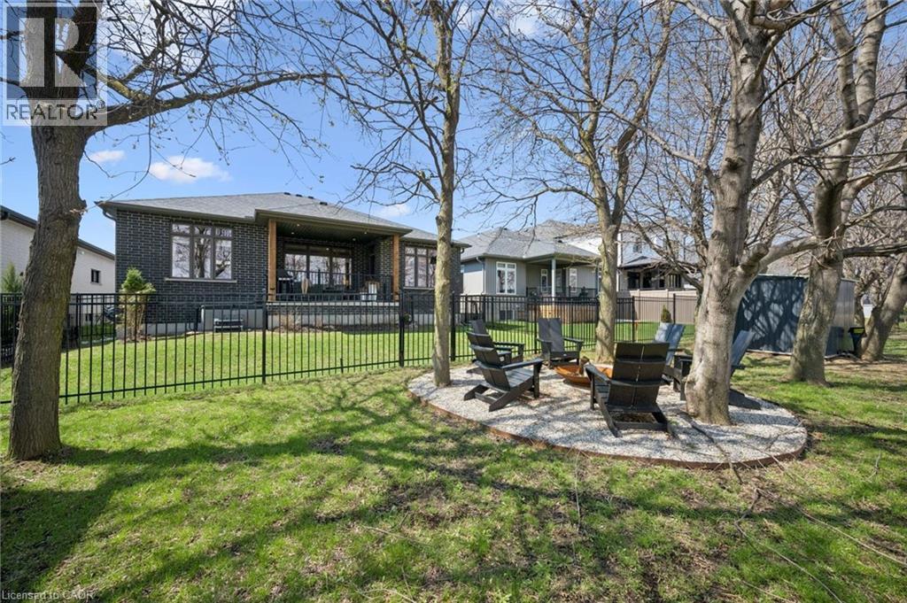 Welcome to an exceptional bungalow in Elmira, where modern design meets timeless elegance. Just four years old, this meticulously maintained 4-bedroom bungalow is located less than 10 minutes to Waterloo and enjoys being close to many amenities. It showcases a carpet-free interior with upscale finishes throughout. The main level is designed for both everyday living and entertaining, featuring upgraded quartz countertops, open concept living, a walk-in pantry, and custom window coverings that add a touch of sophistication. The main floor also enjoys the oversized primary suite with walk in closet and ensuite which comes complete with ceramic walk in tile shower. The laundry room is also located on the main floor as you walk in from your 2 car garage. A great touch! The fully finished lower level offers 2 bedrooms, bathroom and large entertaining area with impressive 9-foot ceilings and direct garage access, creating a versatile space ideal for multi-generational living or a private guest suite. Outdoors, discover a serene, tree-lined backdrop with a beautifully curated space complete with a covered porch area, hot tub, fire pit area, gas BBQ hookup, and wrought iron fencing—offering both privacy and style. Additional highlights include an upgraded stone exterior, concrete driveway, and custom wood pillars. This expansive bungalow is Located in a sought-after community just a short drive to Waterloo. This home delivers comfort, quality, and an elevated lifestyle and is move in ready. (id:50787)
