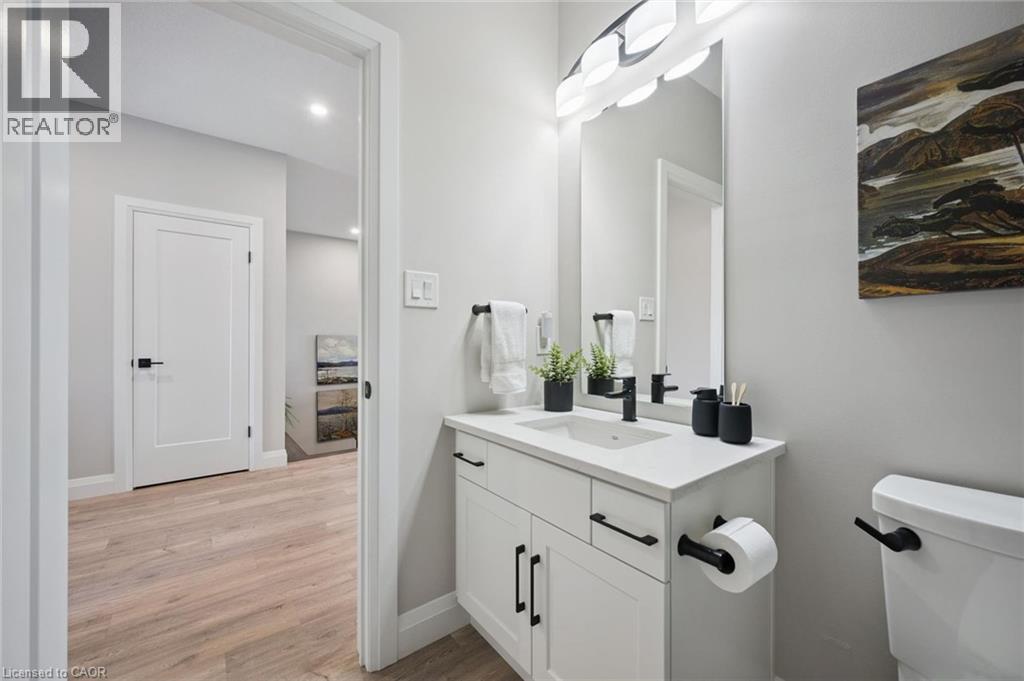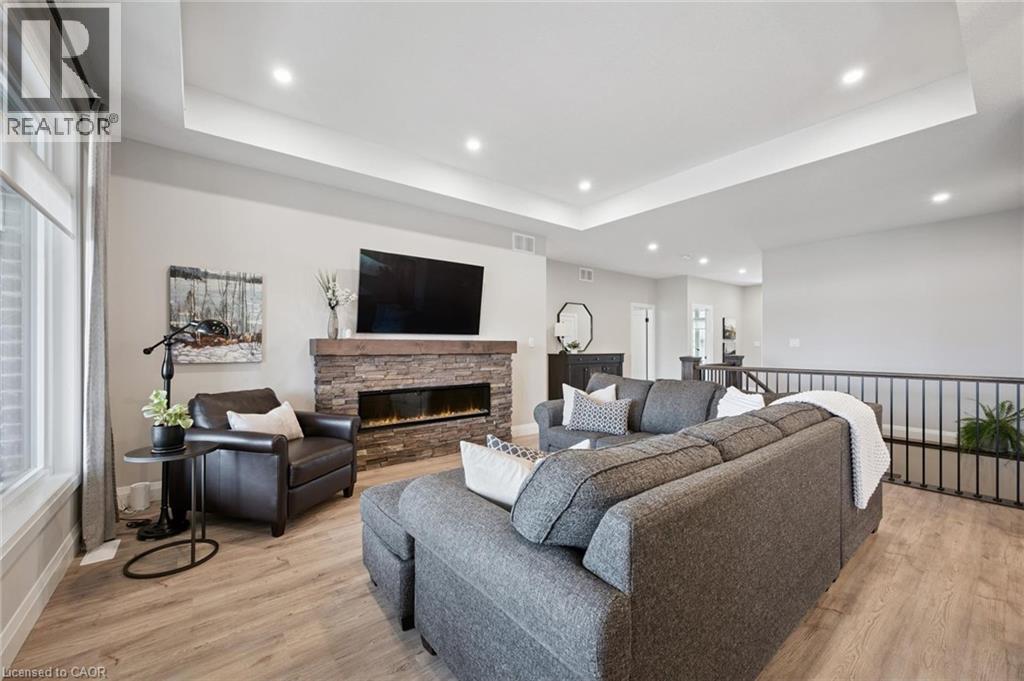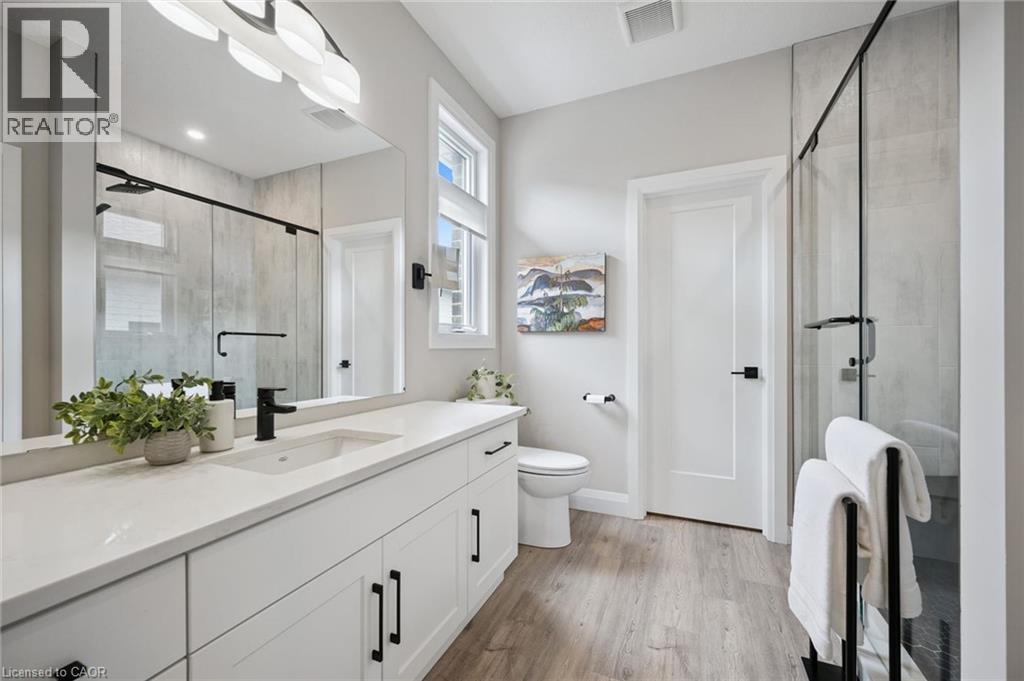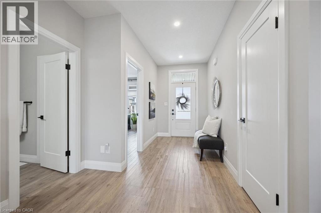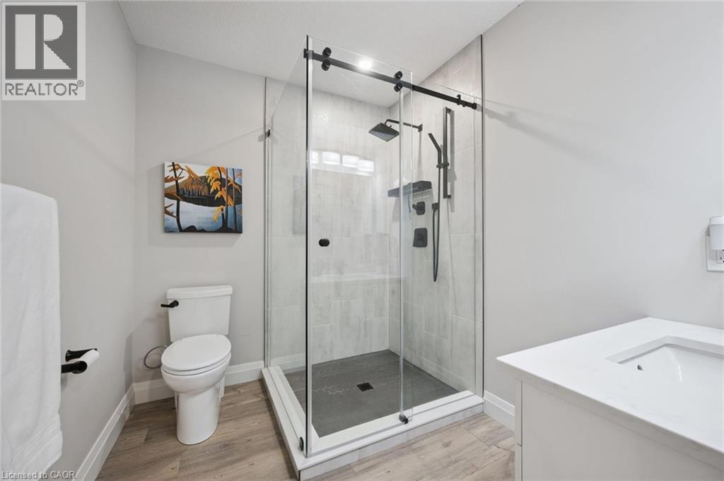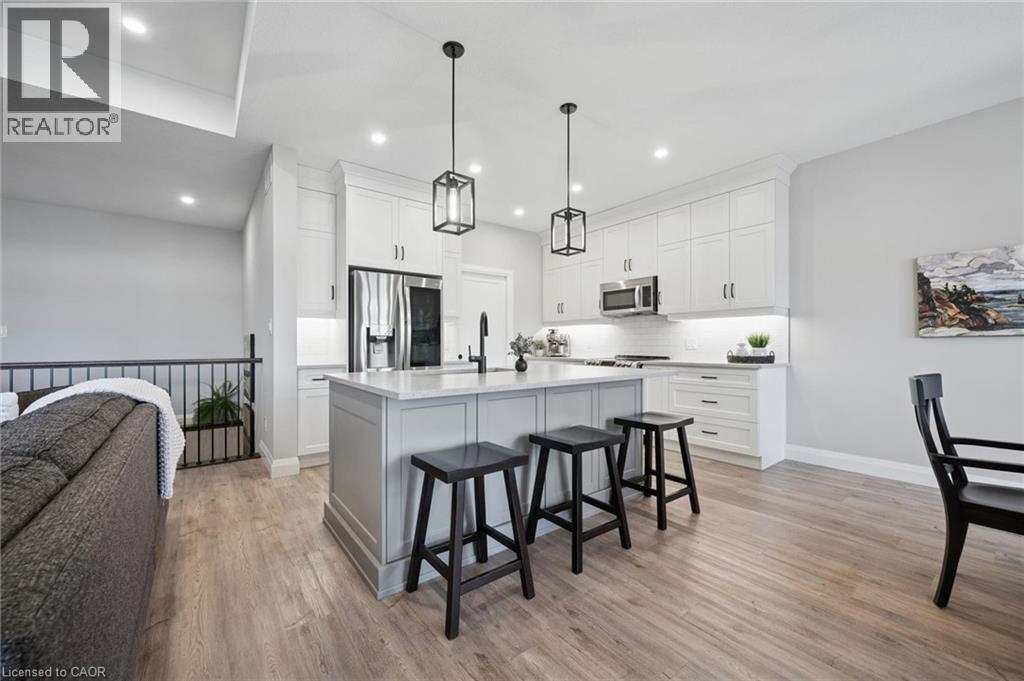 Welcome to an exceptional bungalow in Elmira, where modern design meets timeless elegance. Just four years old, this meticulously maintained 4-bedroom bungalow is located less than 10 minutes to Waterloo and enjoys being close to many amenities. It showcases a carpet-free interior with upscale finishes throughout. The main level is designed for both everyday living and entertaining, featuring upgraded quartz countertops, open concept living, a walk-in pantry, and custom window coverings that add a touch of sophistication. The main floor also enjoys the oversized primary suite with walk in closet and ensuite which comes complete with ceramic walk in tile shower. The laundry room is also located on the main floor as you walk in from your 2 car garage. A great touch! The fully finished lower level offers 2 bedrooms, bathroom and large entertaining area with impressive 9-foot ceilings and direct garage access, creating a versatile space ideal for multi-generational living or a private guest suite. Outdoors, discover a serene, tree-lined backdrop with a beautifully curated space complete with a covered porch area, hot tub, fire pit area, gas BBQ hookup, and wrought iron fencing—offering both privacy and style. Additional highlights include an upgraded stone exterior, concrete driveway, and custom wood pillars. This expansive bungalow is Located in a sought-after community just a short drive to Waterloo. This home delivers comfort, quality, and an elevated lifestyle and is move in ready. (id:50787)