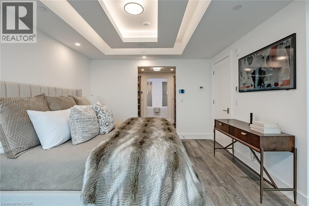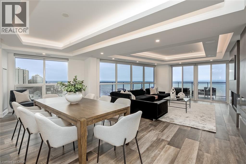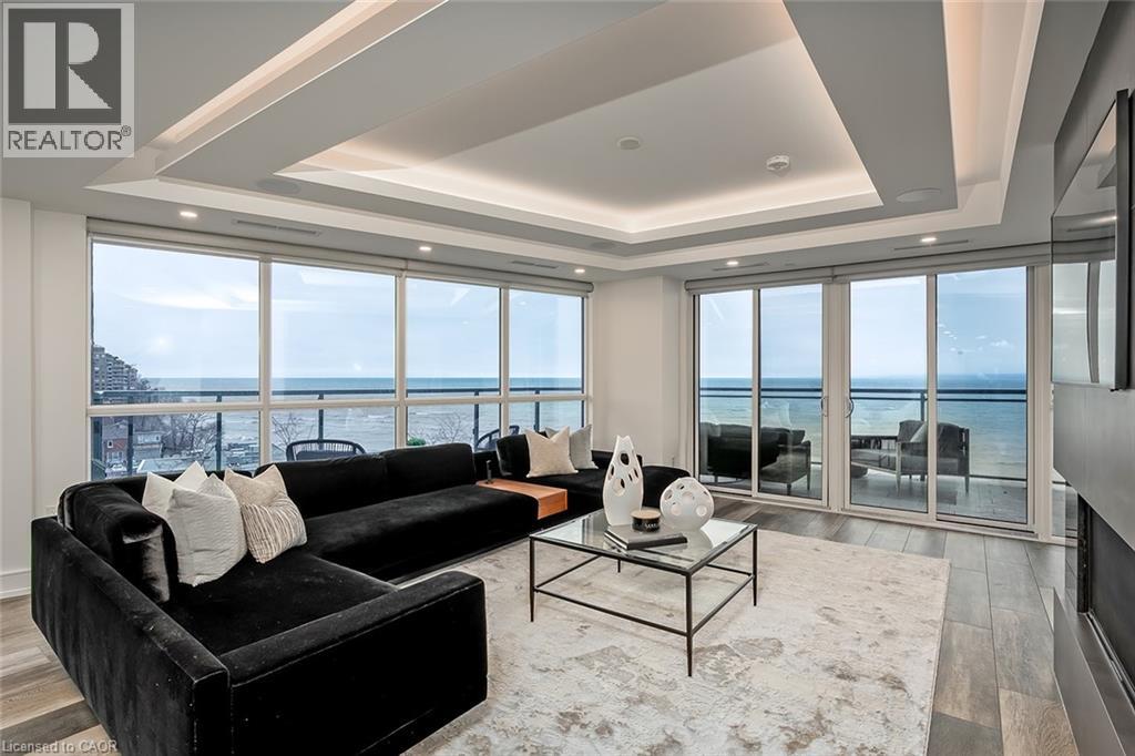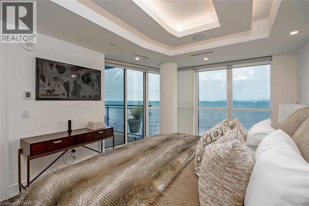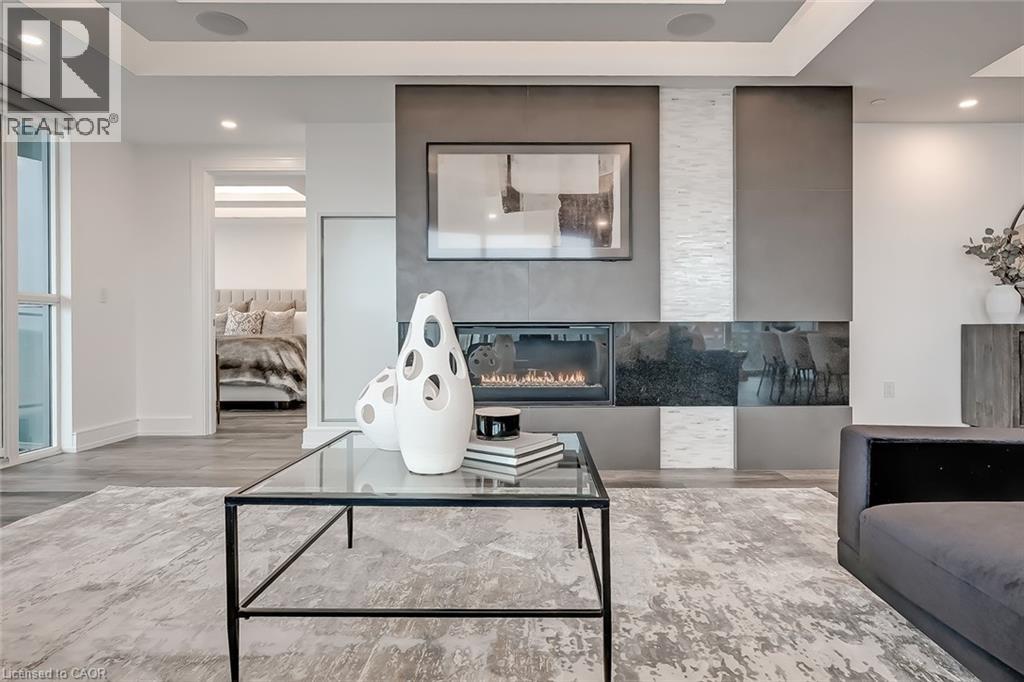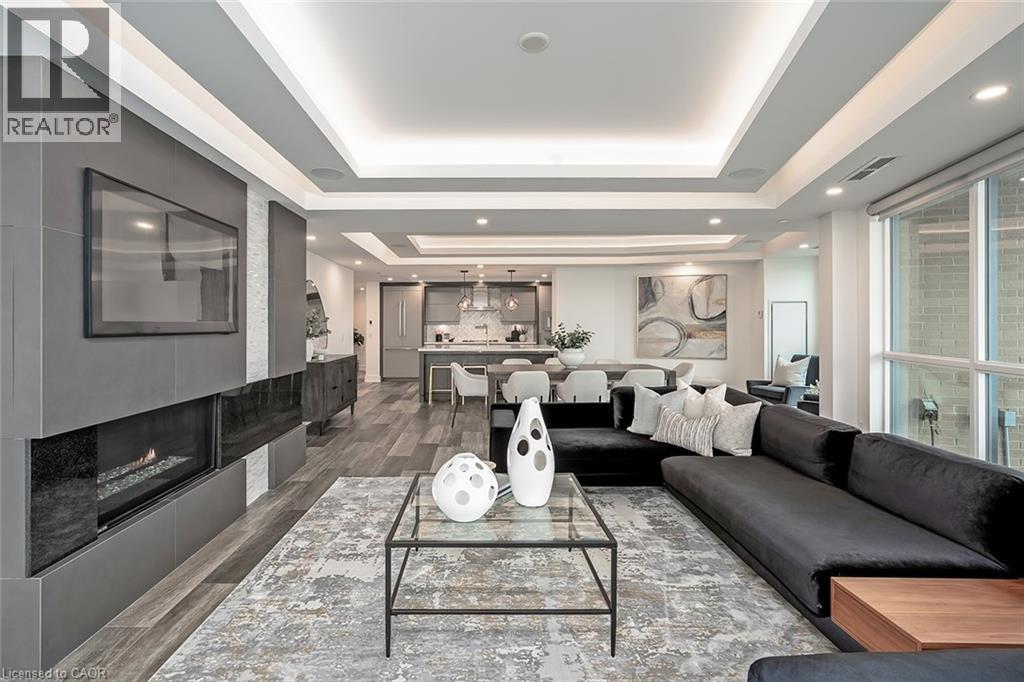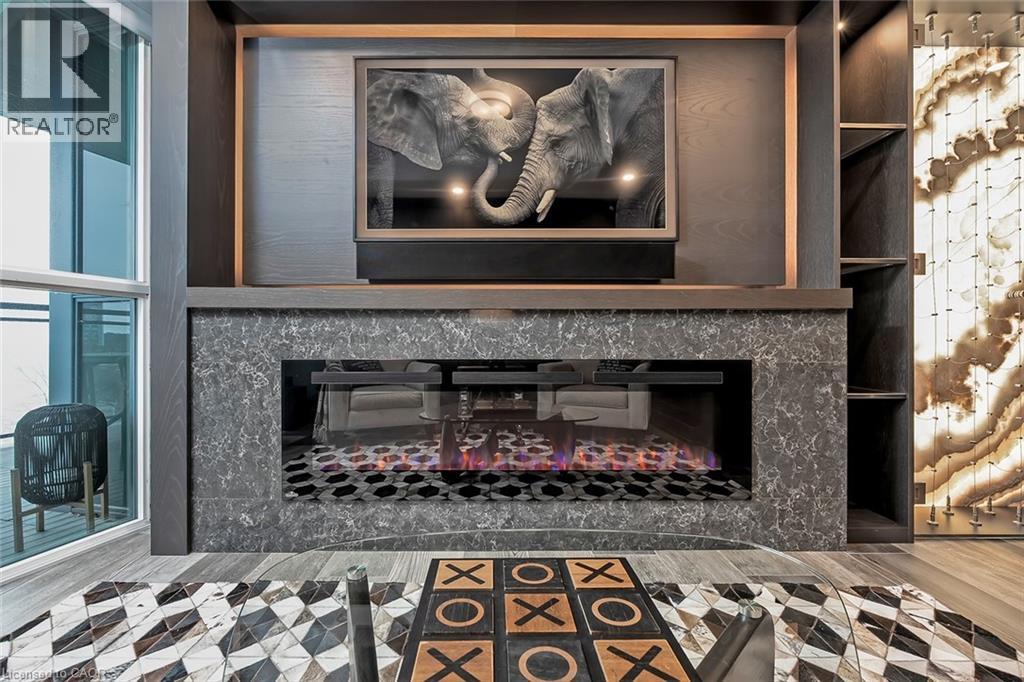 Experience luxury waterfront living in this spectacular 2,200 square foot residence in the prestigious Pearle Hotel & Spa. Designed with full home automation, built-in speakers, and heated floors throughout, this suite offers refined finishes and exceptional comfort. The chef-inspired kitchen features premium Gaggenau appliances including a built-in coffee maker and gas cooktop, stone countertops, pot filler, and a large island, flowing seamlessly into the open concept living and dining area with gas fireplace and expansive lake views. Walkouts lead to a private wrap-around balcony and a separate BBQ balcony with gas hookup. The luxurious primary suite boasts a custom walk-through closet and a spa-inspired five piece ensuite with steam shower, jetted soaker tub, heated floors, and towel warmer. A sophisticated library with fireplace, wine display, and wet bar offers flexible living space, while the second bedroom includes its own ensuite. Residents enjoy world-class amenities including 24-hour concierge, indoor pool, fitness facilities, rooftop terraces, and direct access to the Pearle Hotel’s restaurant, café, and spa. Located in the heart of downtown Burlington, steps to Spencer Smith Park, the waterfront, shops, dining, and cultural attractions. Includes two parking spaces and locker. This is luxury living at its finest. (id:50787)