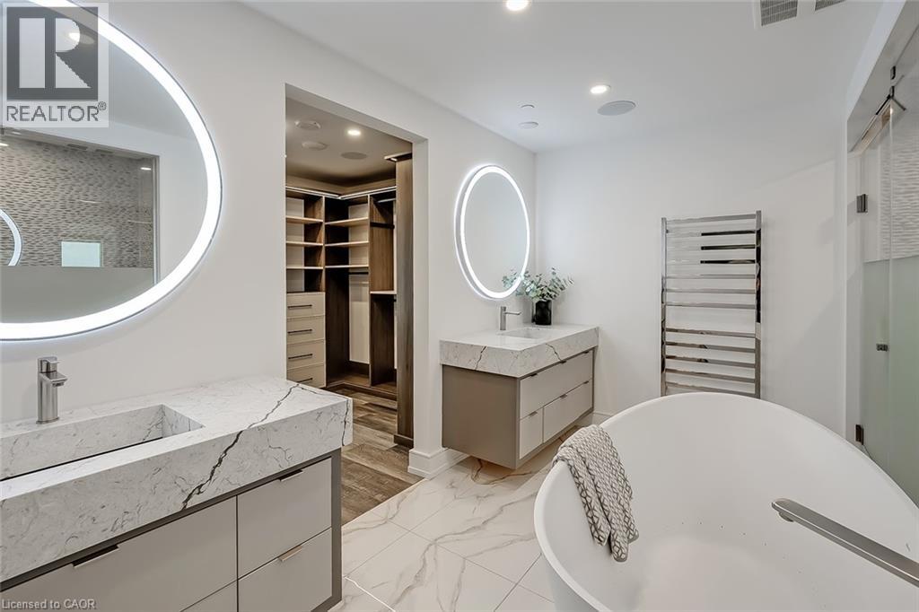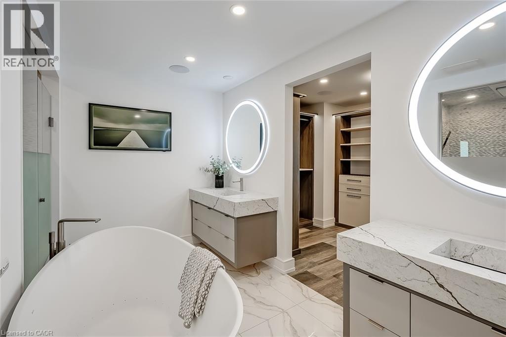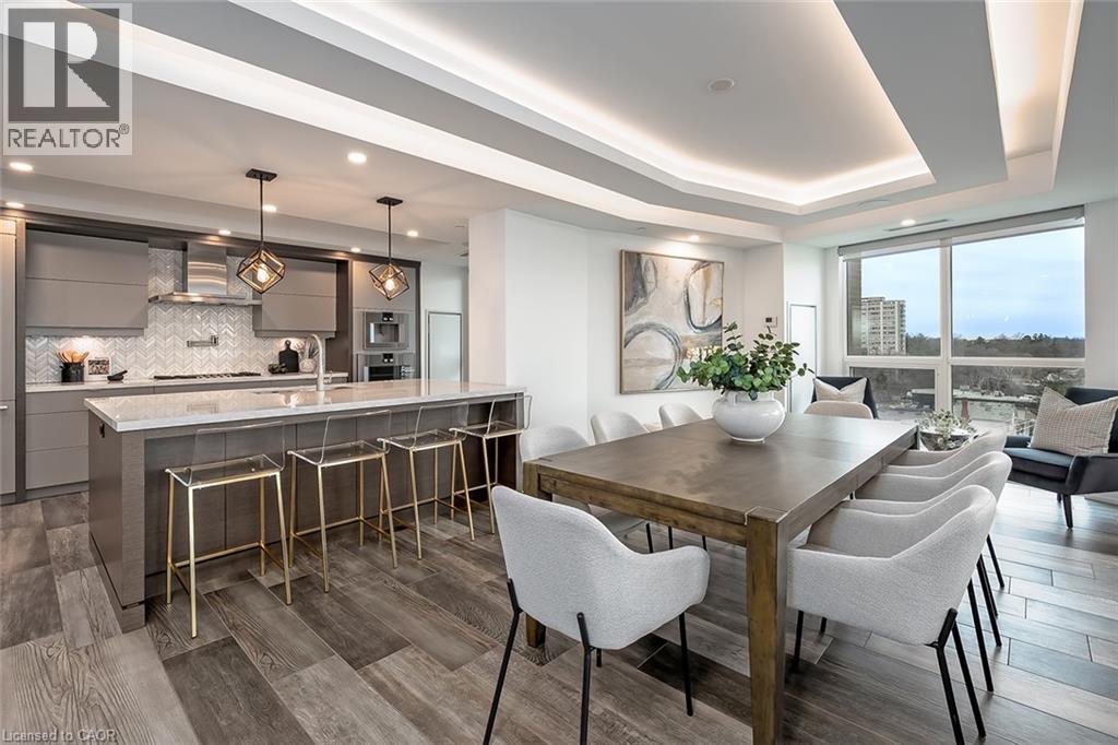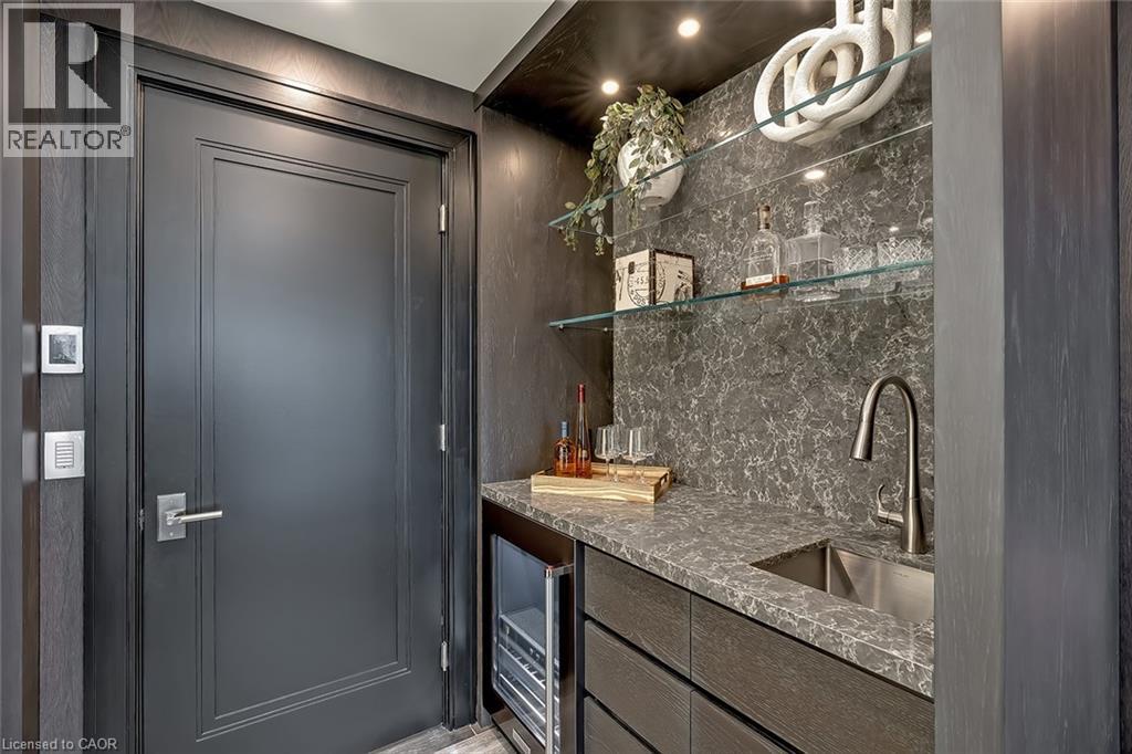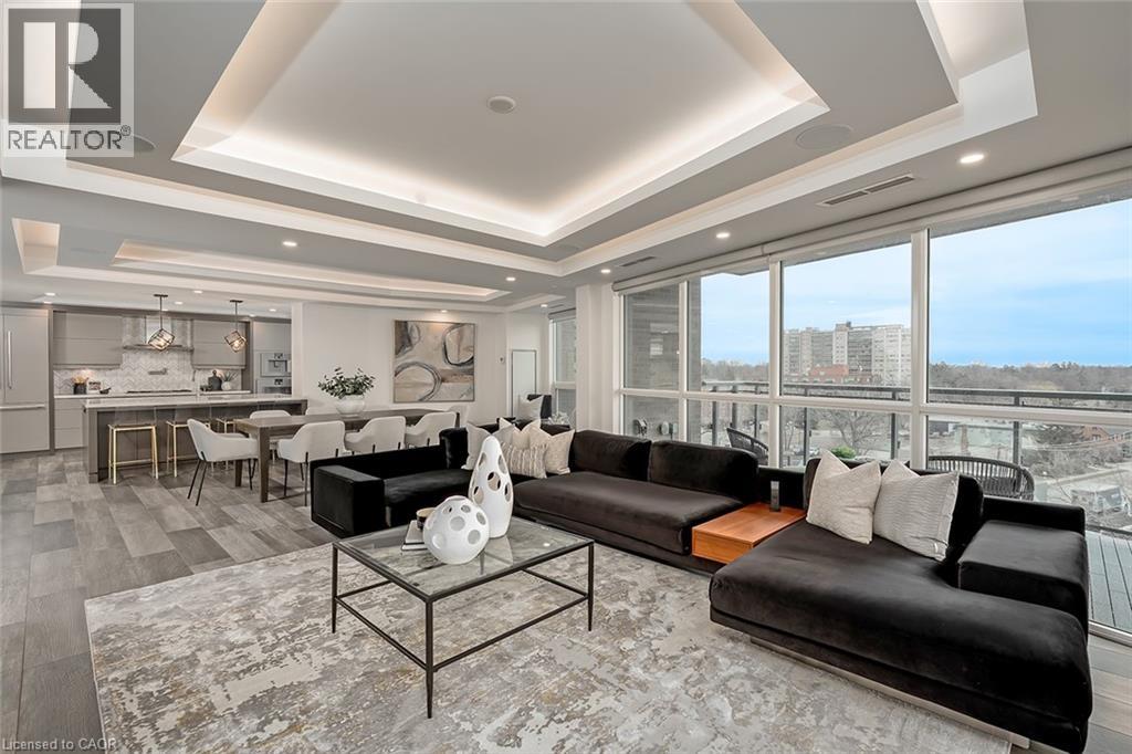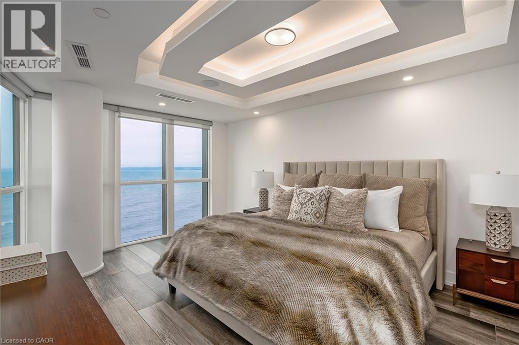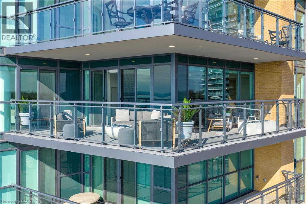 Experience luxury waterfront living in this spectacular 2,200 square foot residence in the prestigious Pearle Hotel & Spa. Designed with full home automation, built-in speakers, and heated floors throughout, this suite offers refined finishes and exceptional comfort. The chef-inspired kitchen features premium Gaggenau appliances including a built-in coffee maker and gas cooktop, stone countertops, pot filler, and a large island, flowing seamlessly into the open concept living and dining area with gas fireplace and expansive lake views. Walkouts lead to a private wrap-around balcony and a separate BBQ balcony with gas hookup. The luxurious primary suite boasts a custom walk-through closet and a spa-inspired five piece ensuite with steam shower, jetted soaker tub, heated floors, and towel warmer. A sophisticated library with fireplace, wine display, and wet bar offers flexible living space, while the second bedroom includes its own ensuite. Residents enjoy world-class amenities including 24-hour concierge, indoor pool, fitness facilities, rooftop terraces, and direct access to the Pearle Hotel’s restaurant, café, and spa. Located in the heart of downtown Burlington, steps to Spencer Smith Park, the waterfront, shops, dining, and cultural attractions. Includes two parking spaces and locker. This is luxury living at its finest. (id:50787)
