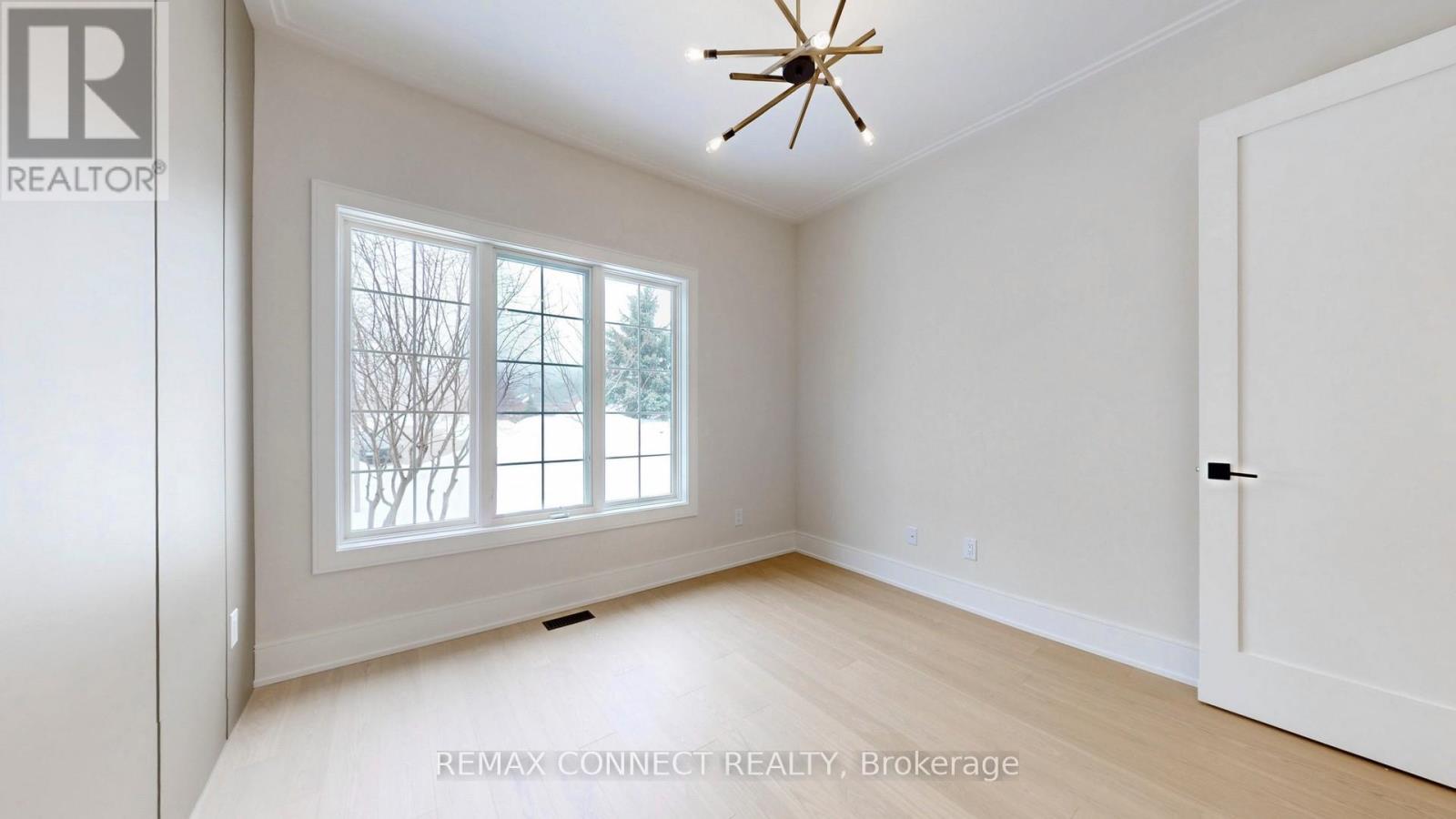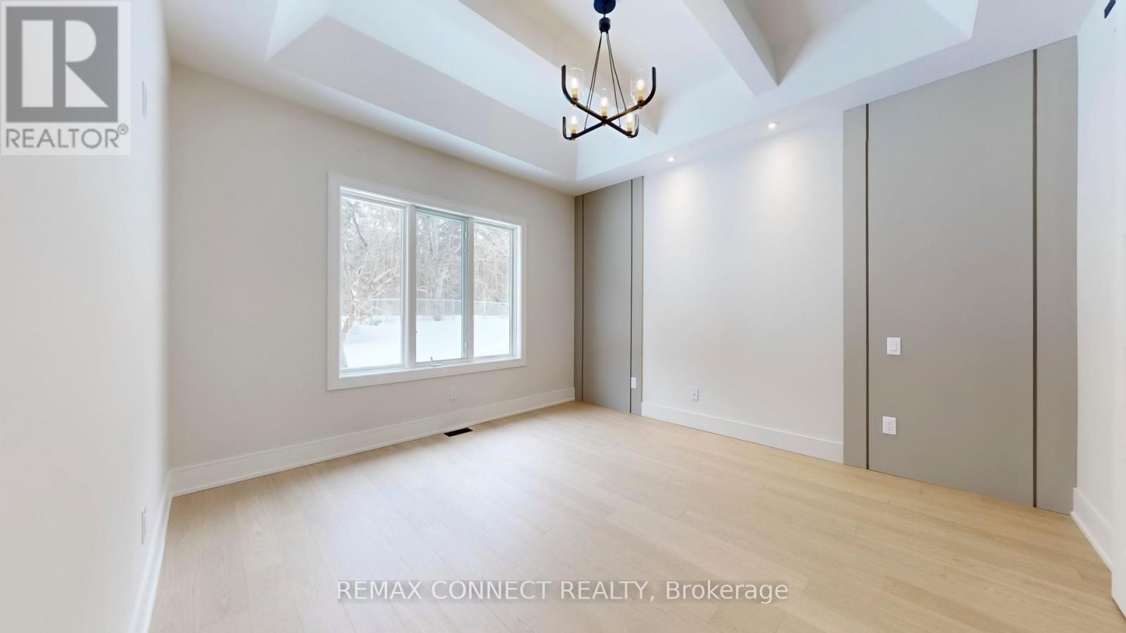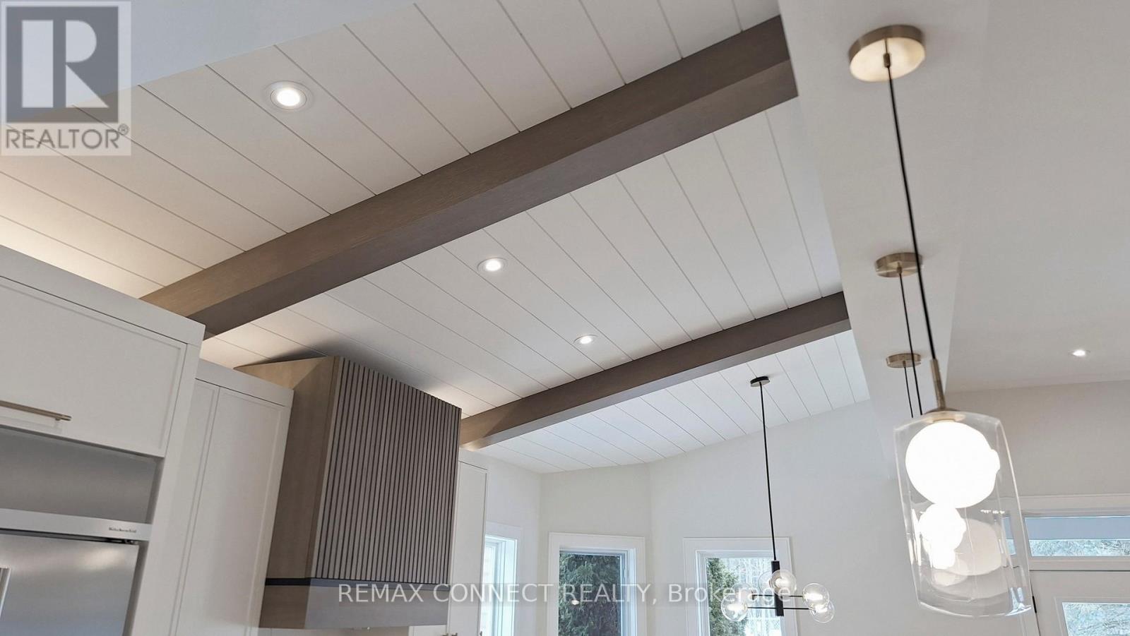 This fully renovated home offers a rare combination of craftsmanship and contemporary design. Updates include new hardwood flooring throughout. Custom kitchen boasts soft white cabinetry with oak accents, built-in appliances, and a unique waterfall island with breakfast bar, quartz countertops and backsplash. Beamed ceilings and a cozy eating area make this kitchen spectacular. All this overlooks the beautiful living room/dining room with floor to 11' ceiling 3-sided Dimplex fireplace, stylish feature walls, open oak and wrought iron staircase to the basement, designer light fixtures, and moulded ceilings. The primary bedroom has beamed ceilings and a beautiful feature wall. The redesigned ensuite & dressing area is a show stopper, complete with freestanding tub, huge custom shower with niche and recessed lighting, double sinks, and beautiful oak vanity. The dressing area is completely built in with interior lighting. The bright and spacious main floor laundry has loads of cupboards, laundry tub, quartz counters and pantry. The separate mudroom has built-in cabinetry with a bench and plenty of storage, and easy access to the garage. New stylish exterior doors. All new interior doors that have been raised to 90". All new trim and baseboards, smooth ceilings, upgrades to electrical. Undermount lighting on all cabinetry. No detail has been left untouched. The backyard is one of the most private and largest in the community. The huge pie backs onto the forest, with a side view of the golf course, all on a quiet cul-de-sac with quick easy access to Ninth Line. (id:50787)