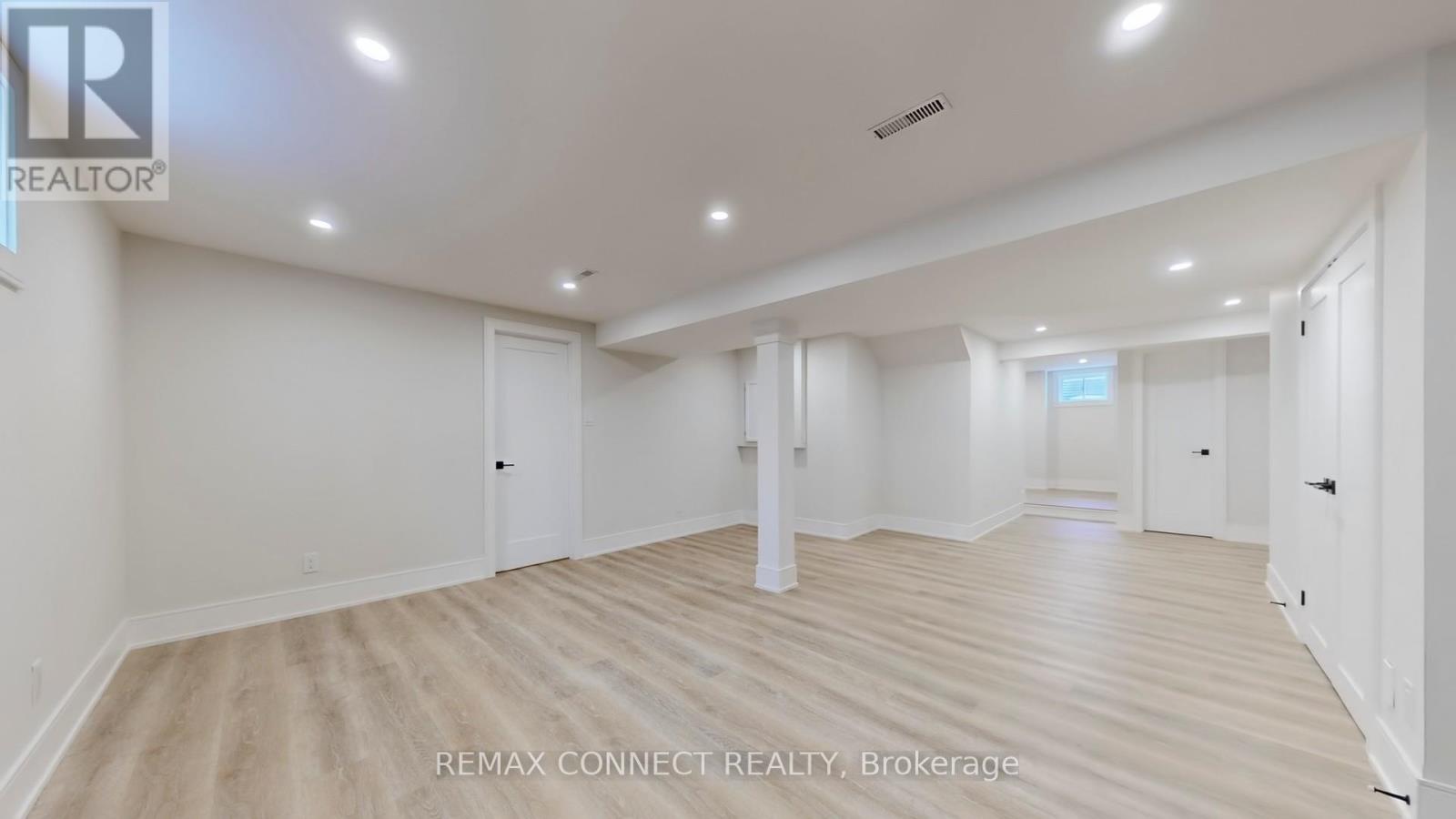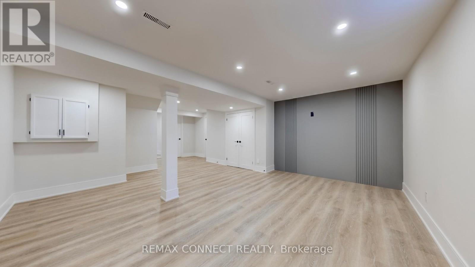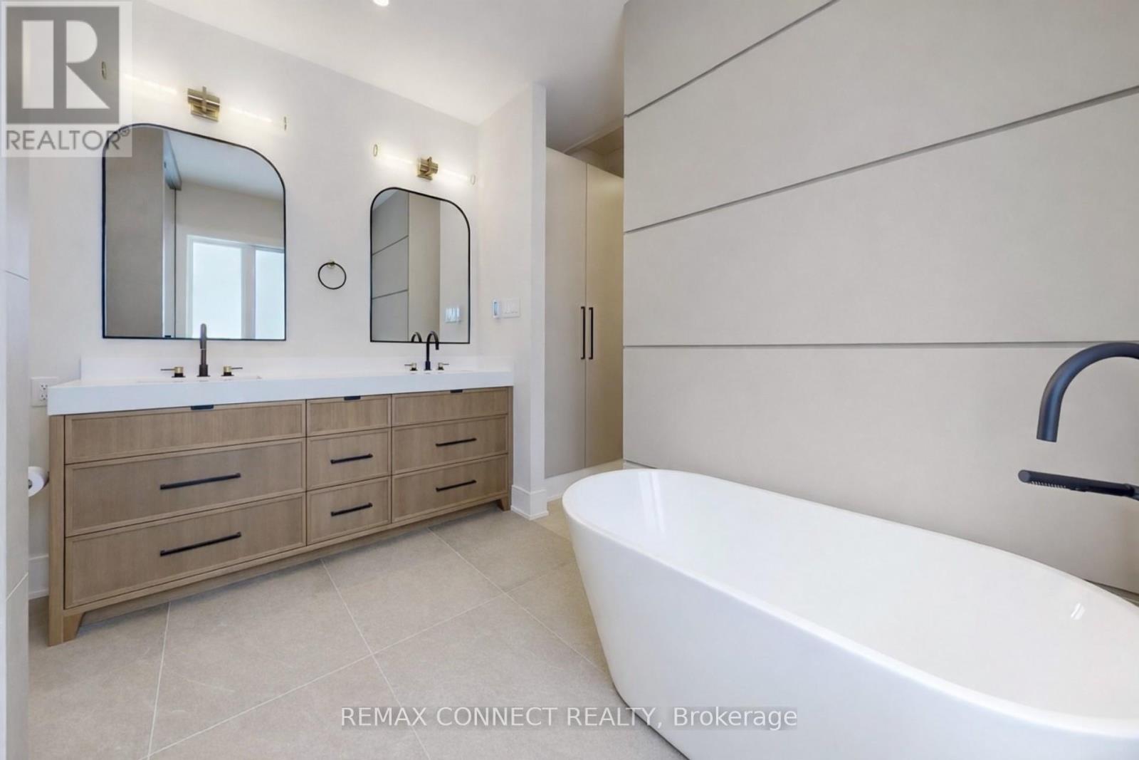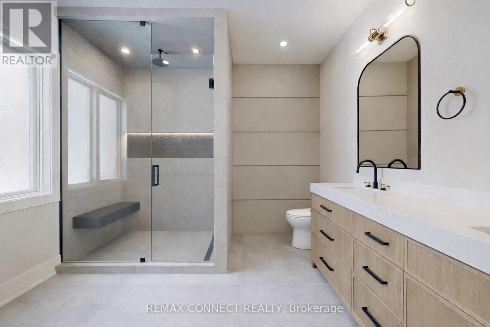 This fully renovated home offers a rare combination of craftsmanship and contemporary design. Updates include new hardwood flooring throughout. Custom kitchen boasts soft white cabinetry with oak accents, built-in appliances, and a unique waterfall island with breakfast bar, quartz countertops and backsplash. Beamed ceilings and a cozy eating area make this kitchen spectacular. All this overlooks the beautiful living room/dining room with floor to 11' ceiling 3-sided Dimplex fireplace, stylish feature walls, open oak and wrought iron staircase to the basement, designer light fixtures, and moulded ceilings. The primary bedroom has beamed ceilings and a beautiful feature wall. The redesigned ensuite & dressing area is a show stopper, complete with freestanding tub, huge custom shower with niche and recessed lighting, double sinks, and beautiful oak vanity. The dressing area is completely built in with interior lighting. The bright and spacious main floor laundry has loads of cupboards, laundry tub, quartz counters and pantry. The separate mudroom has built-in cabinetry with a bench and plenty of storage, and easy access to the garage. New stylish exterior doors. All new interior doors that have been raised to 90". All new trim and baseboards, smooth ceilings, upgrades to electrical. Undermount lighting on all cabinetry. No detail has been left untouched. The backyard is one of the most private and largest in the community. The huge pie backs onto the forest, with a side view of the golf course, all on a quiet cul-de-sac with quick easy access to Ninth Line. (id:50787)
