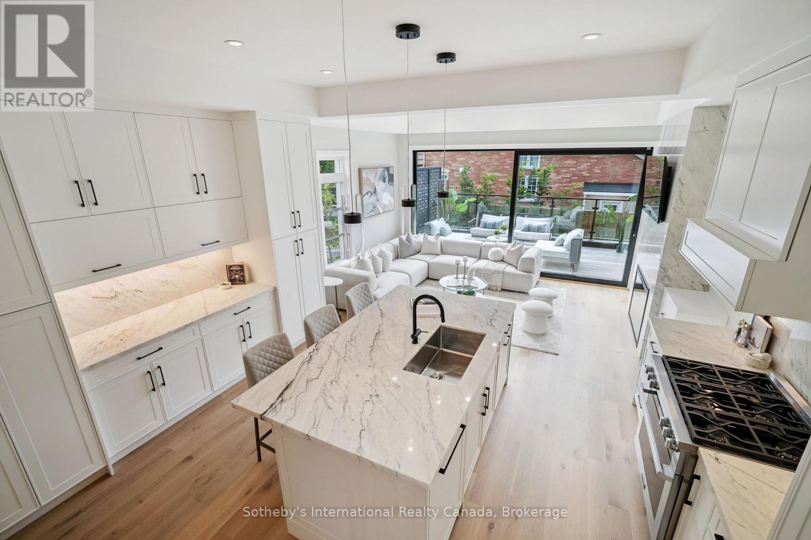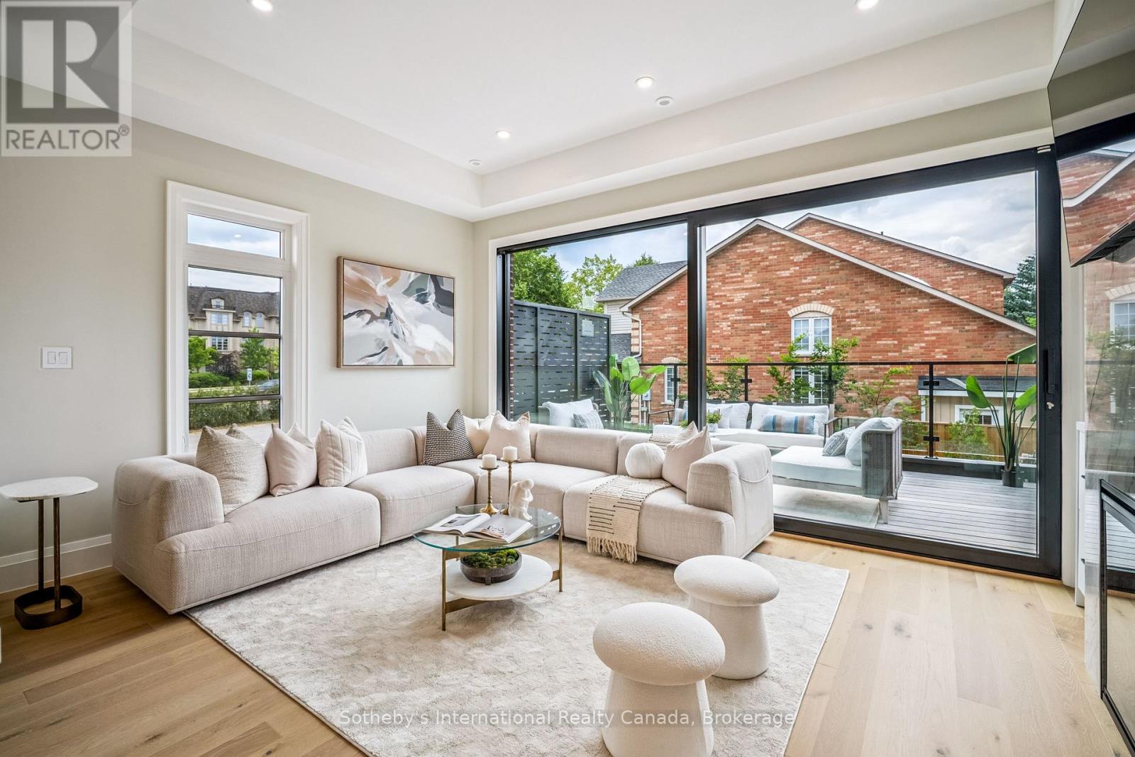 This newly completed, three-storey luxury townhome is part of The Matheson, an exclusive six-unit enclave tucked in one of Oakville's most sought-after neighbourhoods, just a short walk to Downtown, the lakefront, top schools, and vibrant local amenities. Offering over 3,000 sq ft of thoughtfully designed living space, this home features 3 spacious bedrooms, each with its own ensuite, and 4 beautifully appointed bathrooms. A private in-suite elevator ensures seamless access to every level, combining the scale of a detached home with the convenience of modern townhome living. The chefs kitchen is a standout with 35 feet of custom cabinetry, a full Miele appliance package, sleek quartz countertops and backsplash, and a large central island perfect for entertaining. The family room is anchored by a full-height feature fireplace wrapped in premium quartz, creating an elegant and inviting atmosphere. The private primary suite spans an entire floor and includes a morning kitchen, walk-in closet with custom organizers, and a spa-like ensuite featuring a deep soaker tub, walk-in glass shower, radiant heated floors, and a double vanity. Two secondary bedrooms are located on their own level, with direct elevator access and ample storage. Outdoor living is just as refined, with a front composite deck off the primary ensuite, and a private rear terrace finished in Ipe wood and tempered glass railings, ideal for relaxing or entertaining. Parking for up to 4 vehicles, including a private garage, adds exceptional everyday ease. This turnkey residence blends elegant design, premium finishes, and a prime location, offering the ultimate in low-maintenance luxury living. (id:50787)