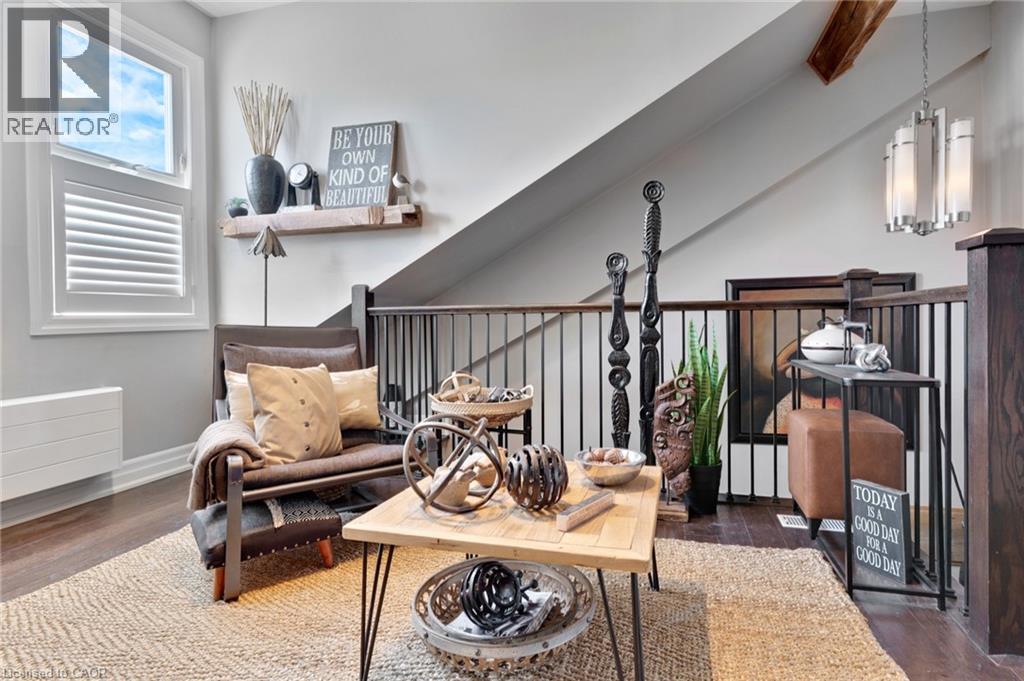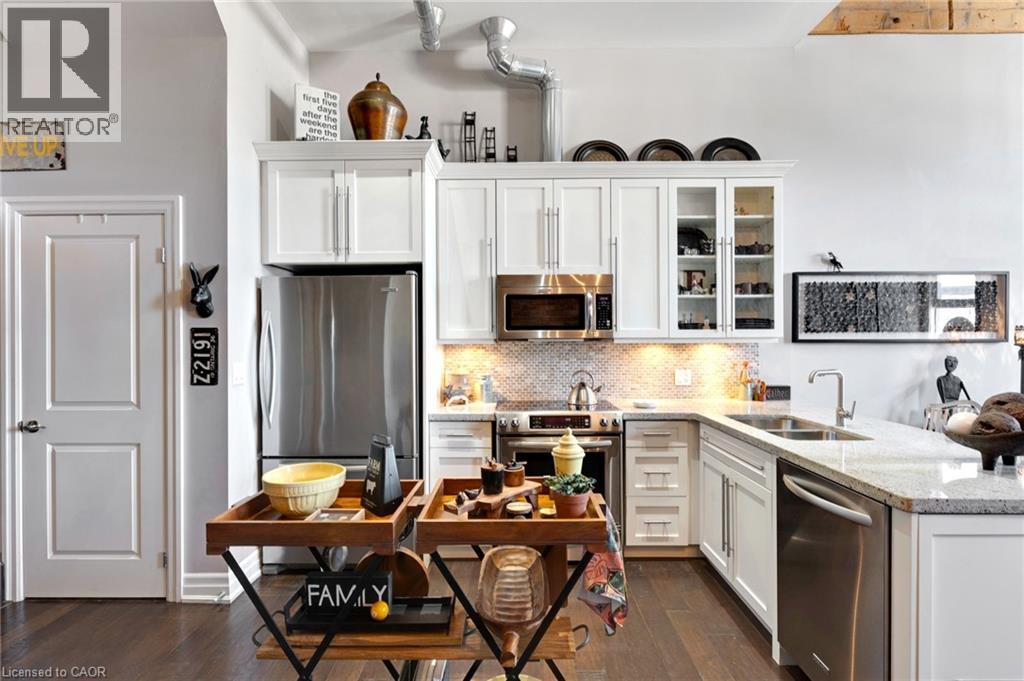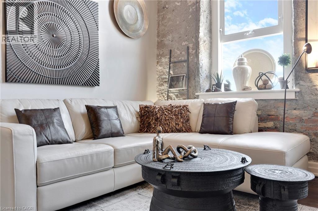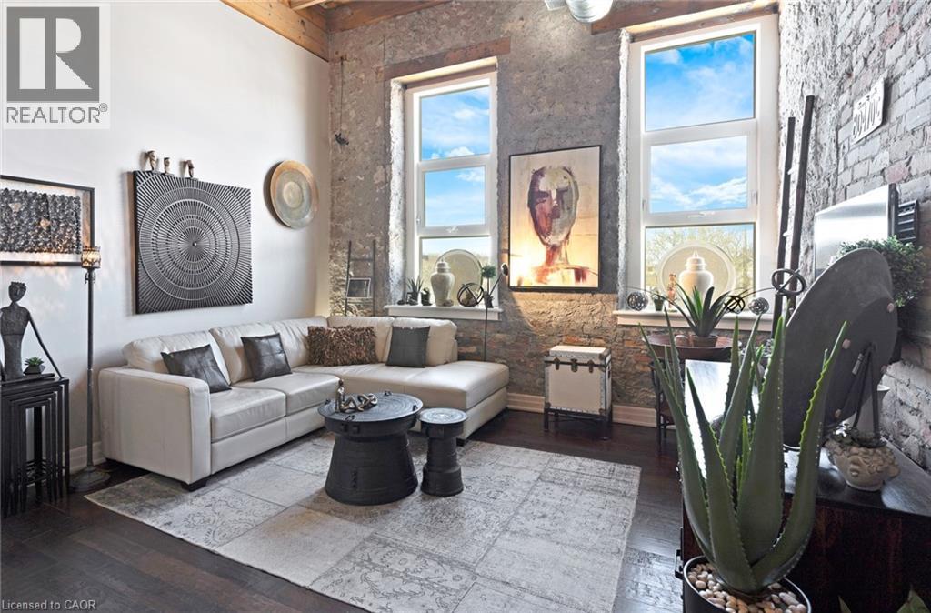Located at 25 Concession Street in East Galt, just a two-minute walk to the heart of downtown Cambridge, Suite 209 offers easy access to cafés, restaurants, weekend farmers’ markets, the Grand River and more. This loft-style unit offers 1,080 sq ft of interior living space and strikes a balance between industrial character and modern updates. High ceilings with exposed beams and HVAC, combined with stone walls and large north-facing windows, create a bright and open living space. The main floor begins with a spacious foyer featuring a large coat closet, followed by a 2-piece powder room and a separate office/storage closet. The open-concept layout connects the kitchen, dining, and living areas. The kitchen includes custom cabinetry, granite eat-up counter, stainless steel appliances including dishwasher, and space for an island or chef's chopping block for additional prep space. Adjacent to the kitchen is a built-in coffee/bar nook that integrates naturally into the area, with the living room positioned at the end where the warm sunlight floods the space. Upstairs, a den provides flexibility for a home office or guest area. The primary bedroom includes a walk-in closet with two built-in dressers and access to a 4-piece bathroom. There's unique elements throughout the home, such as the distinctive metal door partitioning the primary bedroom with it's unique industrial detail that reflects the building’s character. Additional features include low condo fees, and two outdoor parking spaces. Located within walking distance to the Grand River Pedestrian Bridge, Hamilton Family Theatre, local cafés, restaurants, and weekend markets, this home offers a well-balanced urban lifestyle in one of Cambridge’s most established neighbourhoods. (id:50787)