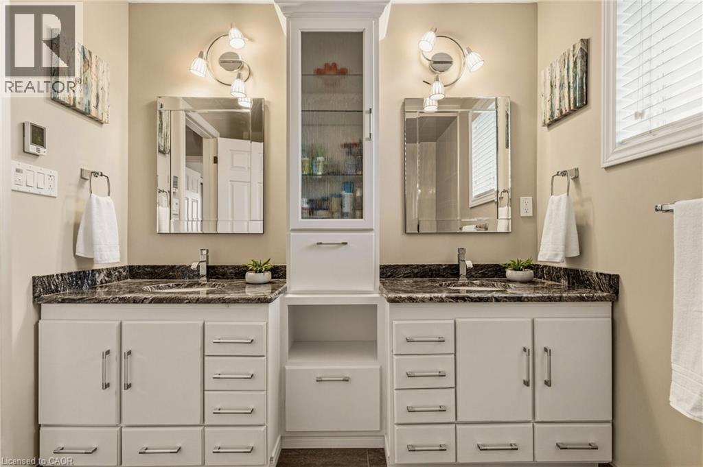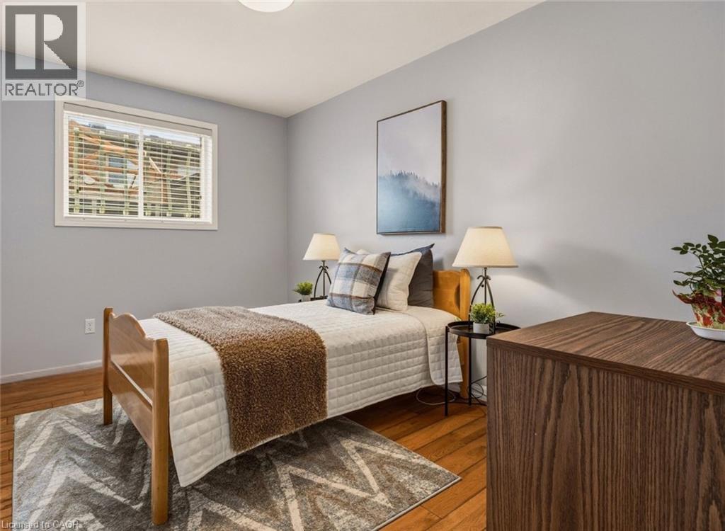 Welcome to this beautifully maintained 4 level backsplit in the highly sought after Gurnett neighbourhood on Hamilton’s West Mountain—just minutes to Ancaster, top rated schools, parks, and convenient highway access. With a separate side entrance and basement walkout , this home offers excellent in-law suite potential. With over 2400 square feet of finished living space, this home features hardwood flooring throughout and a versatile layout ideal for families or multi-generational living. The main level offers a bright living room, separate dining area, and an updated kitchen complete with solid oak cabinetry, stainless steel appliances, and a breakfast bar. The second level features three bedrooms and an updated 4 pc bathroom with double sinks and heated floors. The lower level is fully above grade with an oversized family room with wood burning fireplace and sliding glass doors leading to the backyard, along with a fourth bedroom (ideal as a home office/flex space),3 pc bathroom and separate side entrance. The basement level is full of retro charm with a spacious rec room with classic bar featuring brass railings, sink, and paneled accents. Additional features include a cold cellar, laundry area, workshop with built-in bench, and plenty of storage. Recent updates include furnace and owned hot water heater (2025), updated electrical, and central vacuum. Fully fenced, private backyard complete with landscaping, a shed, and awning extension. Fantastic opportunity in one of Hamilton Mountain’s most desirable communities. (id:50787)