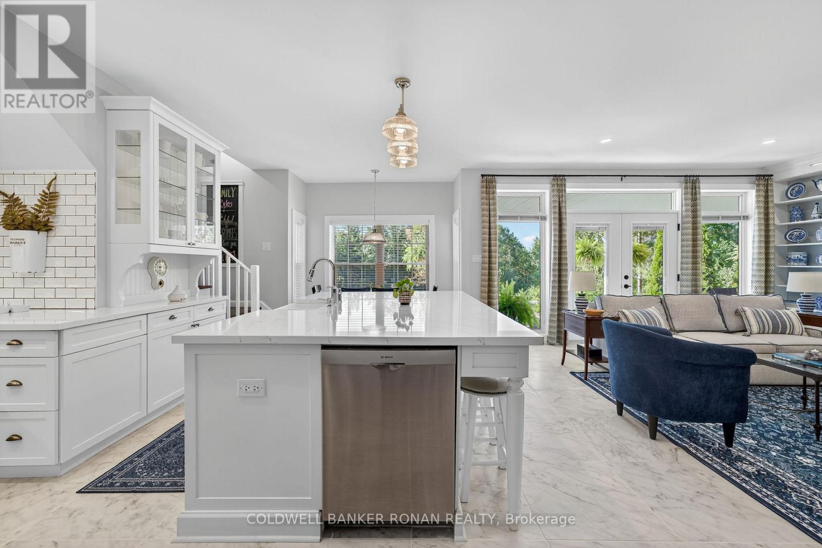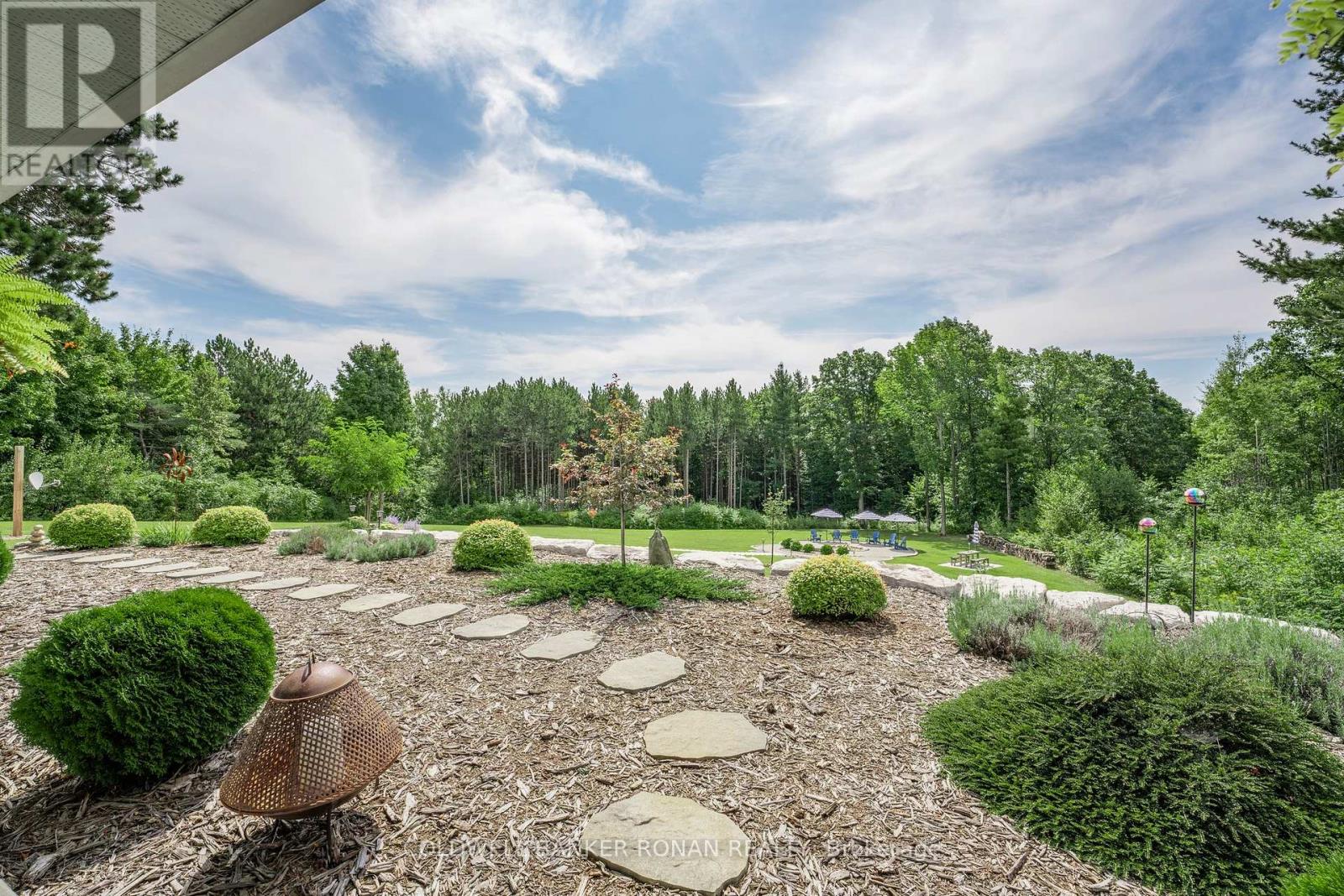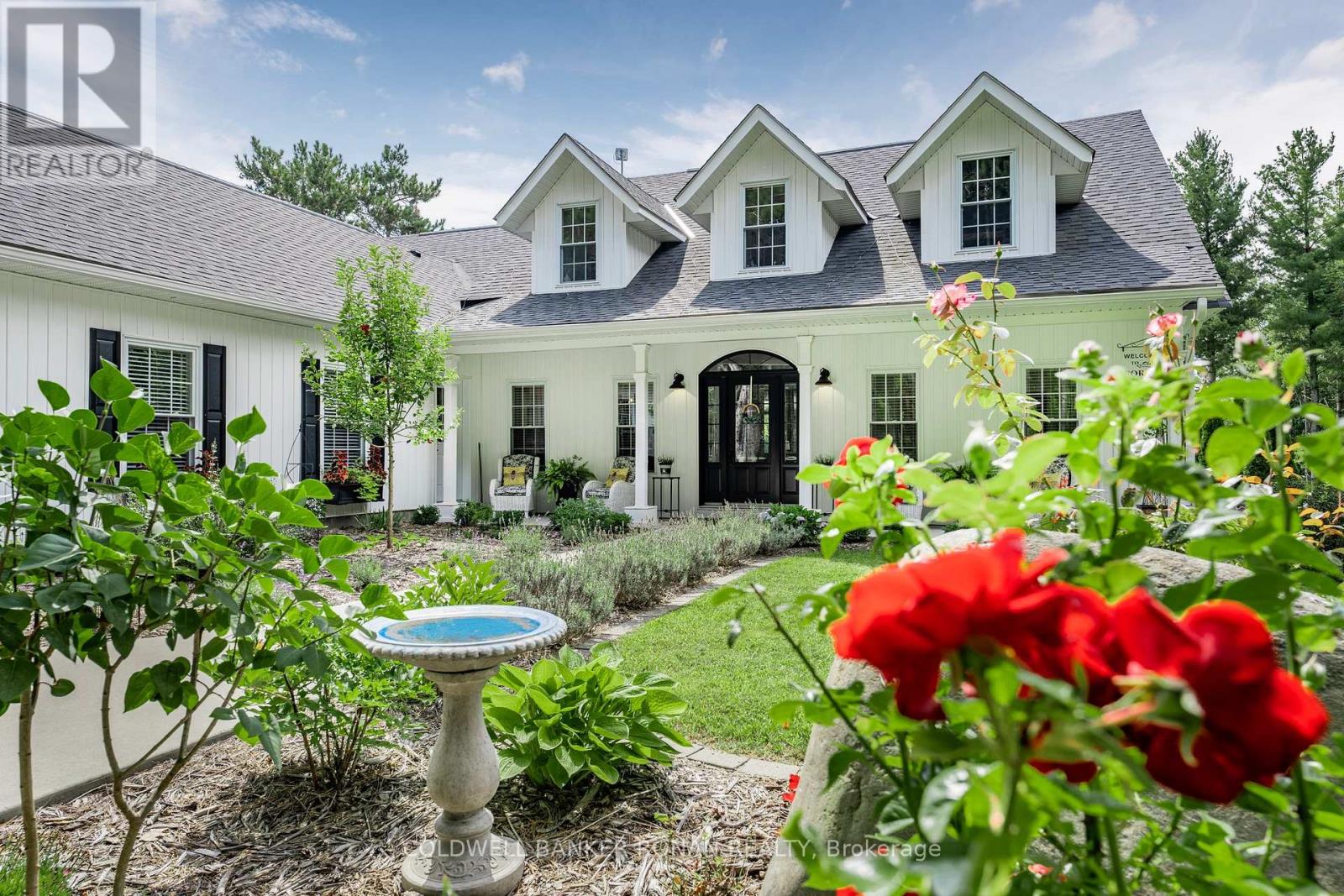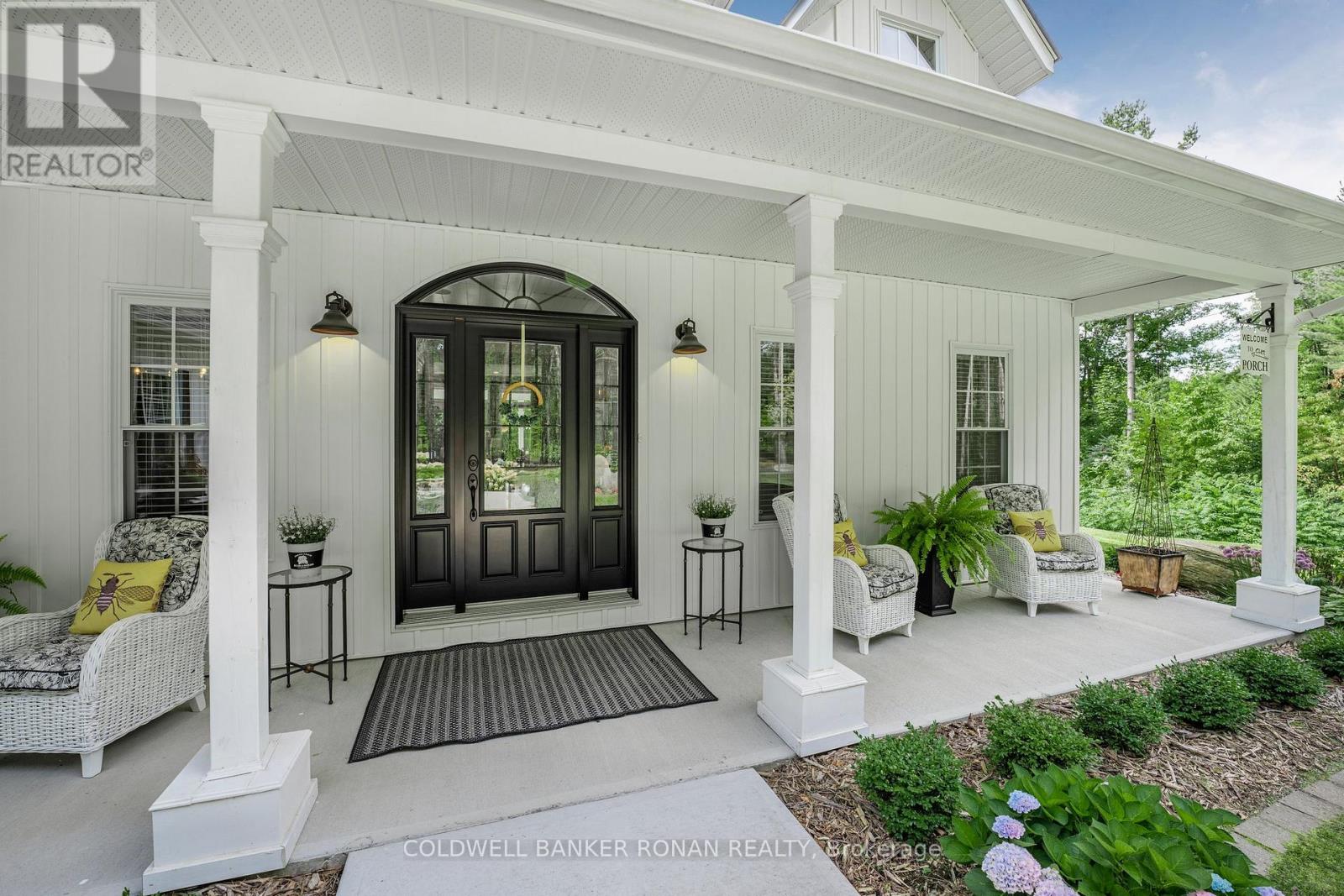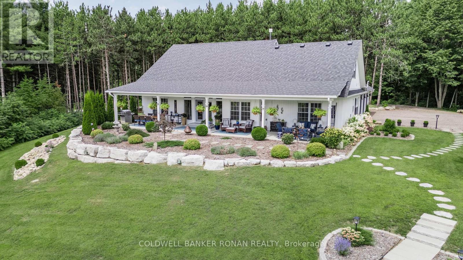 Sophisticated country living! Custom-built in 2018 and set on 2.7 acres of meticulously landscaped grounds in sought-after Tiny Township, this 3,000+ sq. ft. home offers a rare balance of architectural detail, functionality, and effortless style-just moments from Georgian Bay and Midland. The exterior's clean lines and custom details set the tone, while inside, a curated palette of textures and finishes creates warmth throughout. The heart of the home is a sun-filled, open-concept kitchen and living space designed for both intimate moments and entertaining, anchored by a statement fireplace and custom built-ins. Thoughtful details-from the walk-through pantry to the custom mudroom-elevate everyday living. A rare and valuable feature, the finished workshop (converted from one bay of the 3-car garage) offers exceptional flexibility for creative pursuits, home business, or refined storage. The primary suite is a private retreat, complete with a spa-inspired ensuite, walk-in closet, and seamless access to laundry. Additional bedrooms, each with convenient bath access, are complemented by a versatile den with a wet bar and an upper-level bonus space-ideal for guests, a media room, or a fourth bedroom. Seamless indoor-outdoor living unfolds through garden doors to a 58-foot covered porch with ceiling fans, overlooking manicured grounds, mature gardens, and a stone fire pit, designed for relaxed evenings and an effortless cottage lifestyle. An offering defined by intention, craftsmanship, and lifestyle-tailored for those who value space, privacy, and understated luxury. (id:50787)