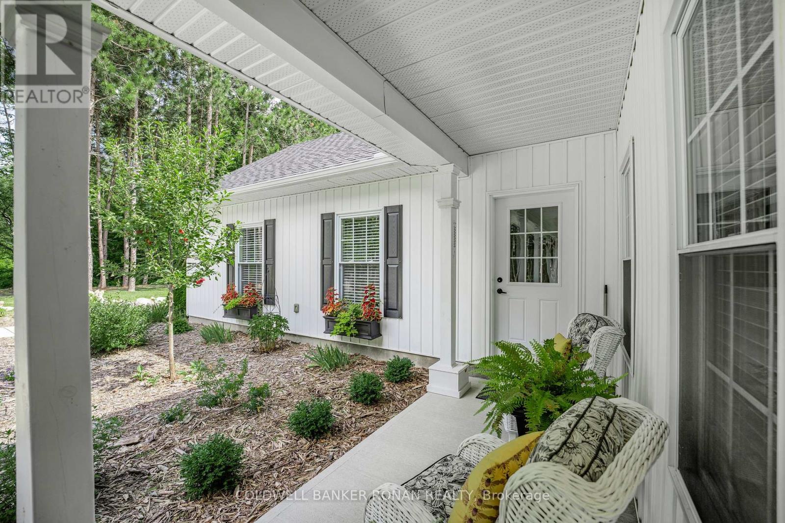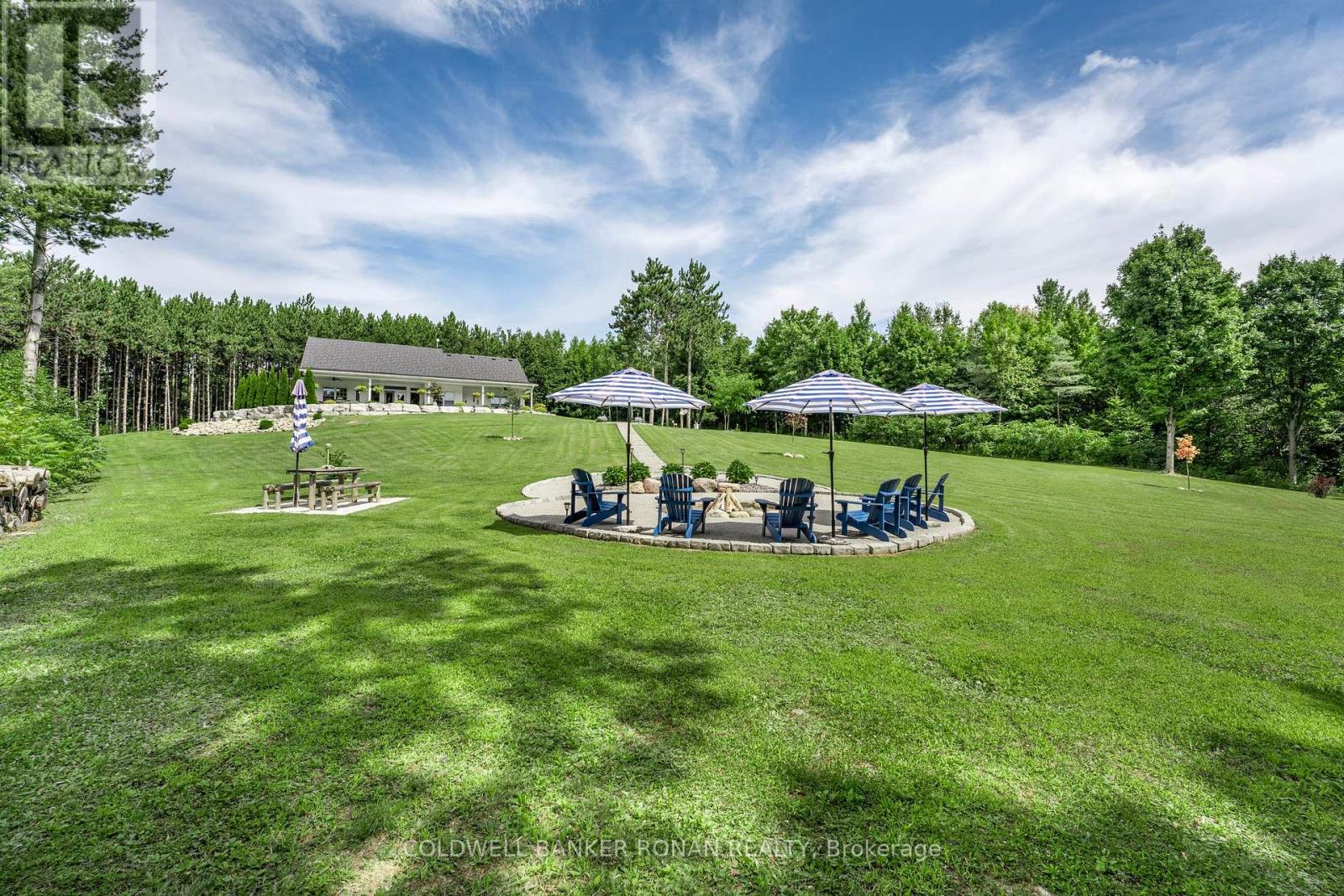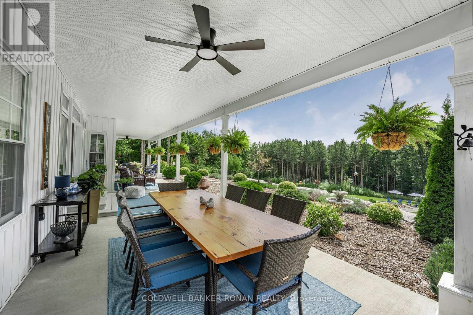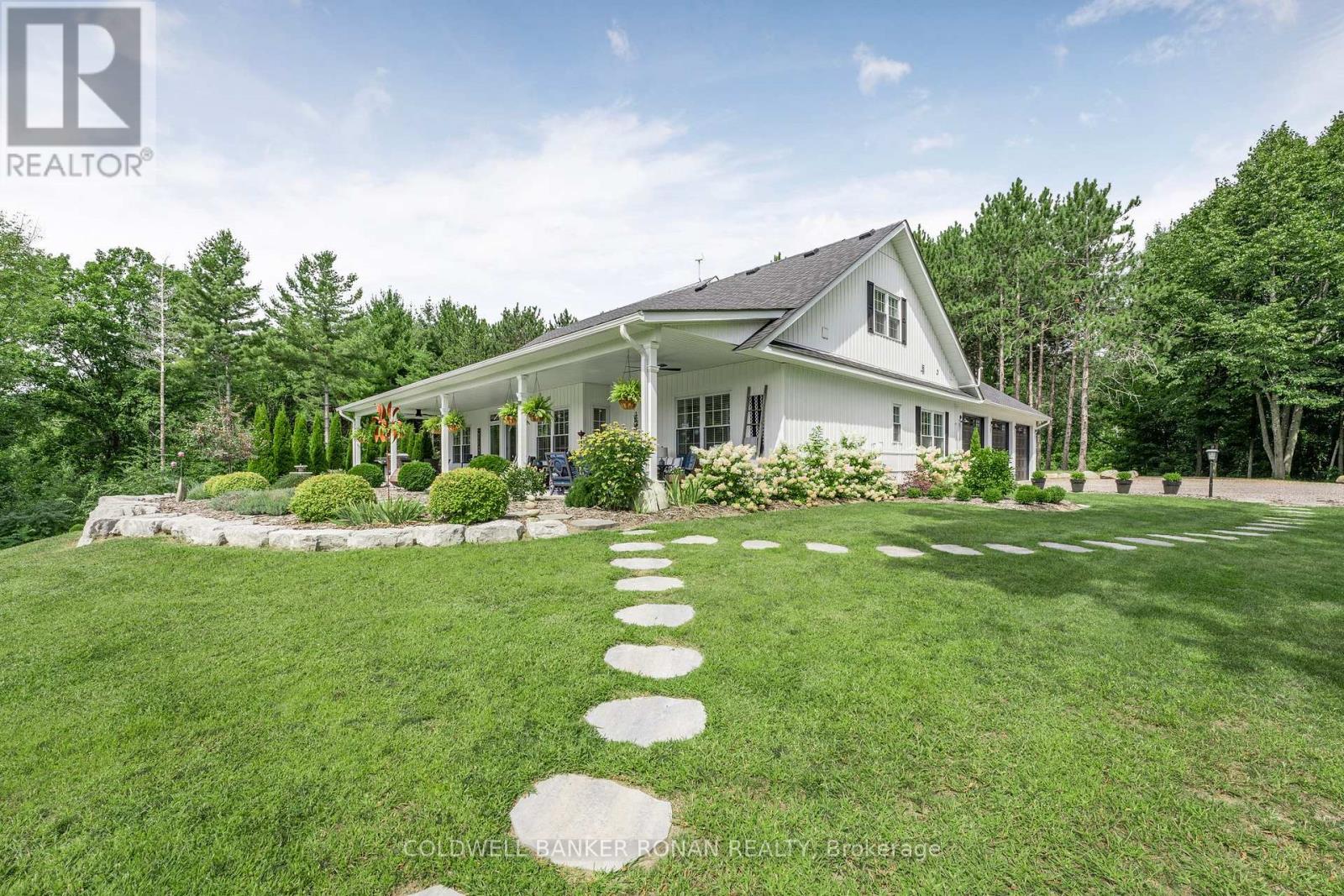 Sophisticated country living! Custom-built in 2018 and set on 2.7 acres of meticulously landscaped grounds in sought-after Tiny Township, this 3,000+ sq. ft. home offers a rare balance of architectural detail, functionality, and effortless style-just moments from Georgian Bay and Midland. The exterior's clean lines and custom details set the tone, while inside, a curated palette of textures and finishes creates warmth throughout. The heart of the home is a sun-filled, open-concept kitchen and living space designed for both intimate moments and entertaining, anchored by a statement fireplace and custom built-ins. Thoughtful details-from the walk-through pantry to the custom mudroom-elevate everyday living. A rare and valuable feature, the finished workshop (converted from one bay of the 3-car garage) offers exceptional flexibility for creative pursuits, home business, or refined storage. The primary suite is a private retreat, complete with a spa-inspired ensuite, walk-in closet, and seamless access to laundry. Additional bedrooms, each with convenient bath access, are complemented by a versatile den with a wet bar and an upper-level bonus space-ideal for guests, a media room, or a fourth bedroom. Seamless indoor-outdoor living unfolds through garden doors to a 58-foot covered porch with ceiling fans, overlooking manicured grounds, mature gardens, and a stone fire pit, designed for relaxed evenings and an effortless cottage lifestyle. An offering defined by intention, craftsmanship, and lifestyle-tailored for those who value space, privacy, and understated luxury. (id:50787)