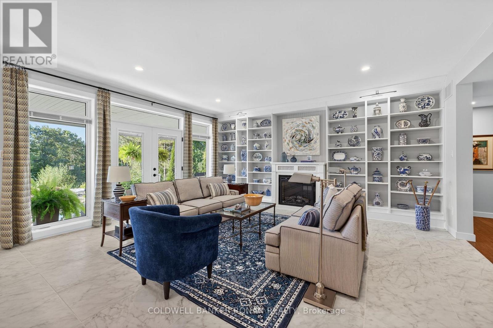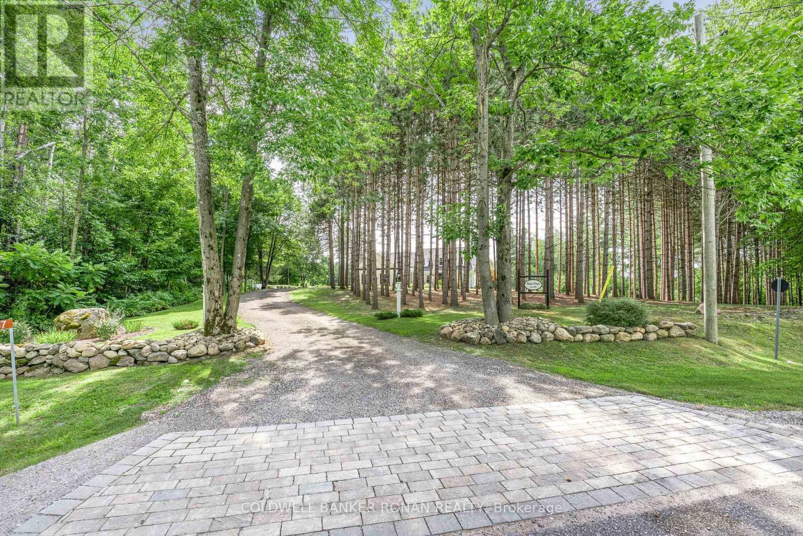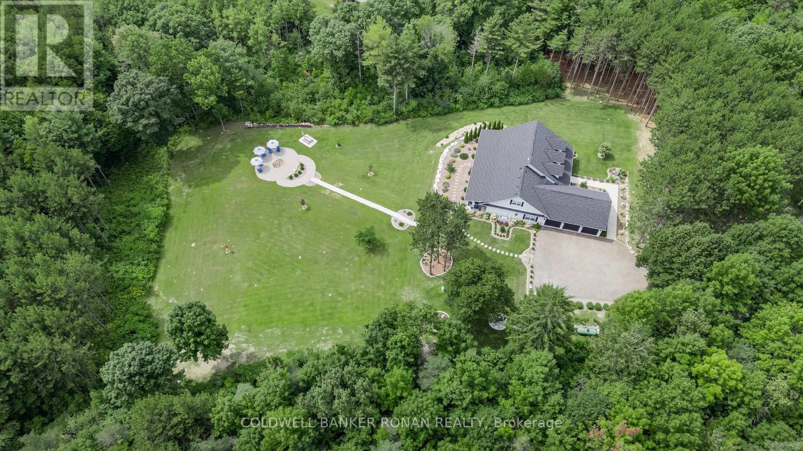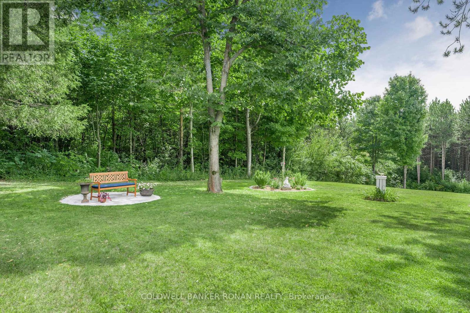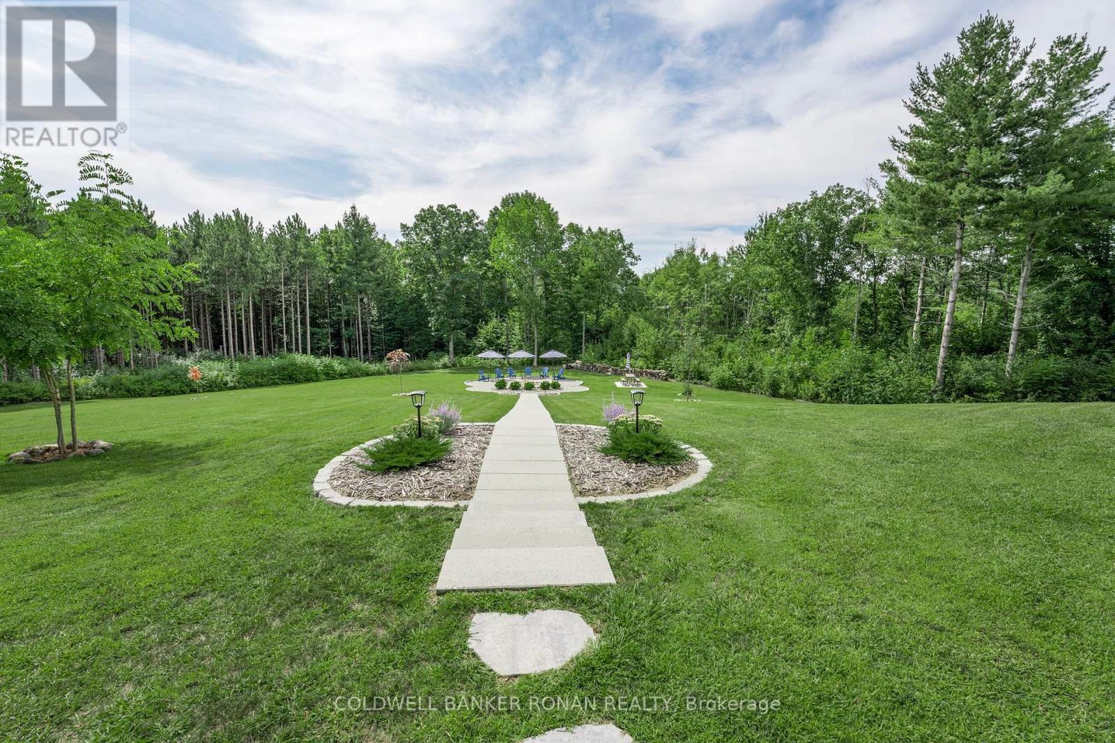 Sophisticated country living! Custom-built in 2018 and set on 2.7 acres of meticulously landscaped grounds in sought-after Tiny Township, this 3,000+ sq. ft. home offers a rare balance of architectural detail, functionality, and effortless style-just moments from Georgian Bay and Midland. The exterior's clean lines and custom details set the tone, while inside, a curated palette of textures and finishes creates warmth throughout. The heart of the home is a sun-filled, open-concept kitchen and living space designed for both intimate moments and entertaining, anchored by a statement fireplace and custom built-ins. Thoughtful details-from the walk-through pantry to the custom mudroom-elevate everyday living. A rare and valuable feature, the finished workshop (converted from one bay of the 3-car garage) offers exceptional flexibility for creative pursuits, home business, or refined storage. The primary suite is a private retreat, complete with a spa-inspired ensuite, walk-in closet, and seamless access to laundry. Additional bedrooms, each with convenient bath access, are complemented by a versatile den with a wet bar and an upper-level bonus space-ideal for guests, a media room, or a fourth bedroom. Seamless indoor-outdoor living unfolds through garden doors to a 58-foot covered porch with ceiling fans, overlooking manicured grounds, mature gardens, and a stone fire pit, designed for relaxed evenings and an effortless cottage lifestyle. An offering defined by intention, craftsmanship, and lifestyle-tailored for those who value space, privacy, and understated luxury. (id:50787)