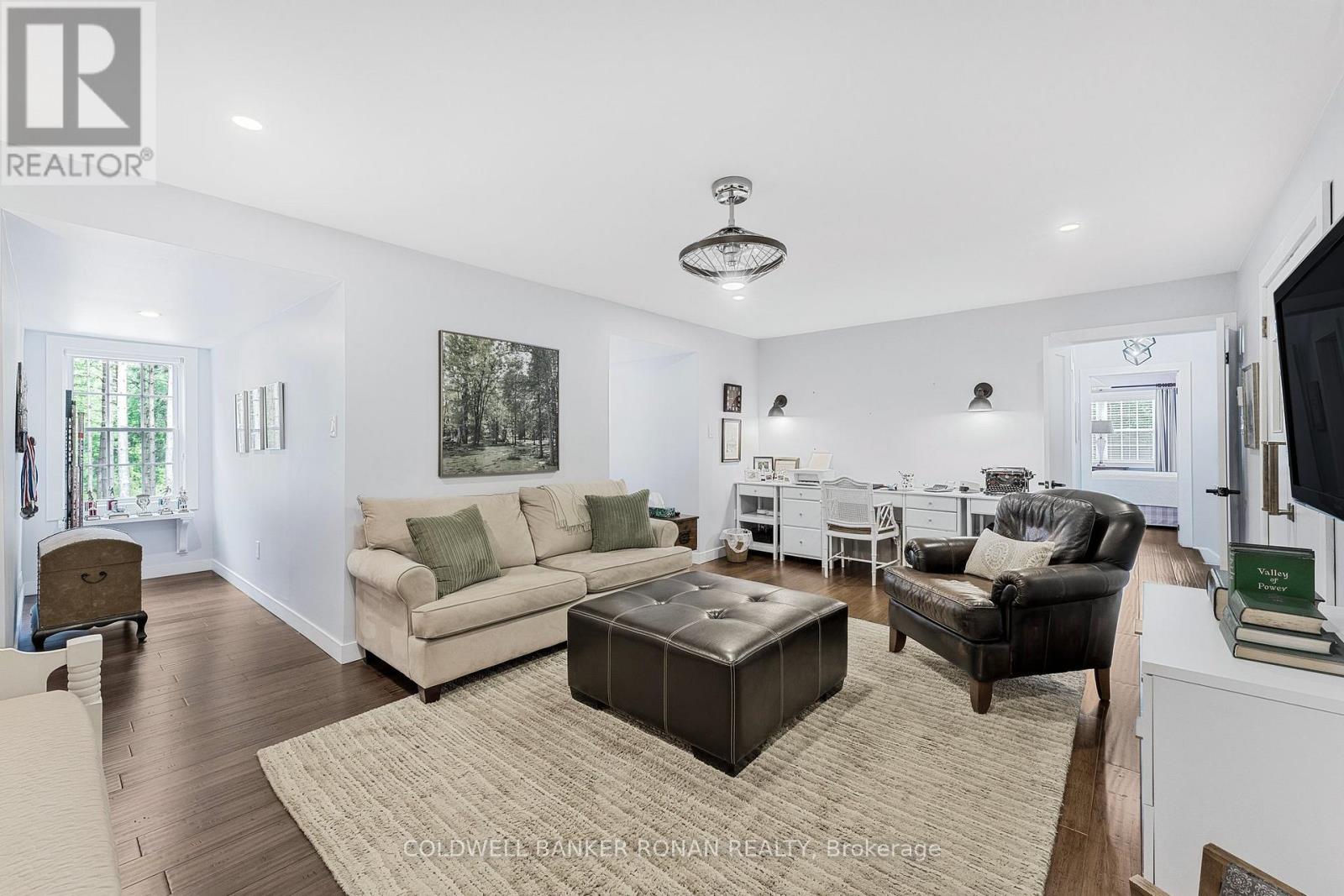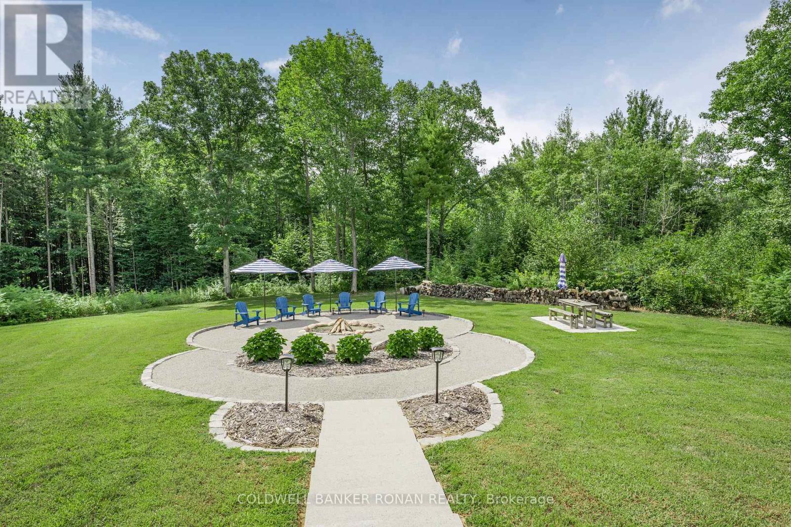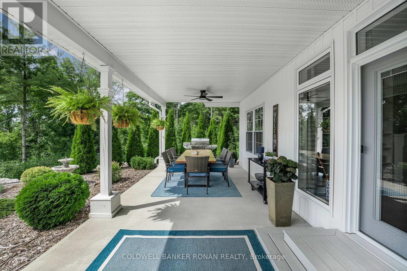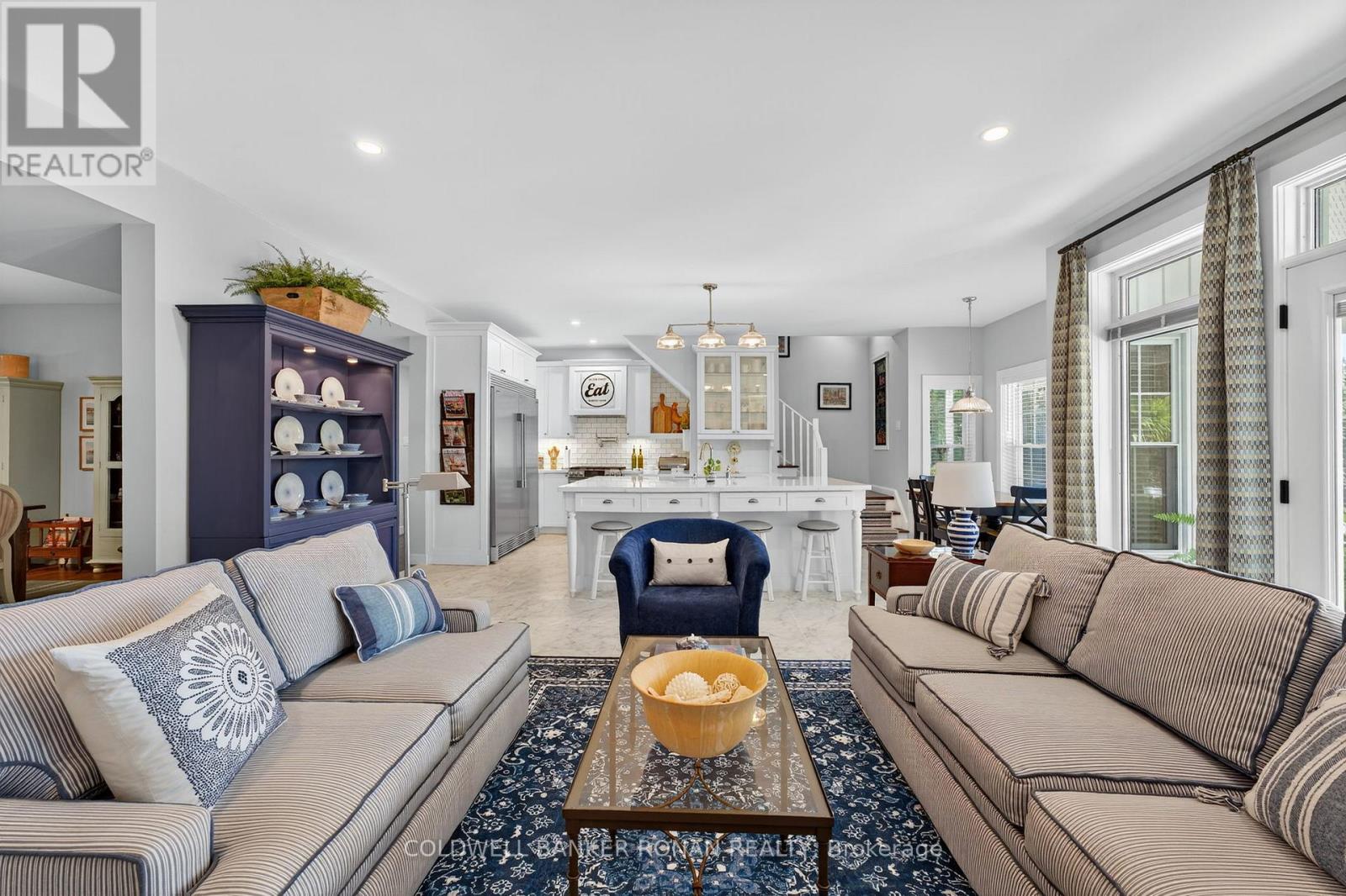 Sophisticated country living! Custom-built in 2018 and set on 2.7 acres of meticulously landscaped grounds in sought-after Tiny Township, this 3,000+ sq. ft. home offers a rare balance of architectural detail, functionality, and effortless style-just moments from Georgian Bay and Midland. The exterior's clean lines and custom details set the tone, while inside, a curated palette of textures and finishes creates warmth throughout. The heart of the home is a sun-filled, open-concept kitchen and living space designed for both intimate moments and entertaining, anchored by a statement fireplace and custom built-ins. Thoughtful details-from the walk-through pantry to the custom mudroom-elevate everyday living. A rare and valuable feature, the finished workshop (converted from one bay of the 3-car garage) offers exceptional flexibility for creative pursuits, home business, or refined storage. The primary suite is a private retreat, complete with a spa-inspired ensuite, walk-in closet, and seamless access to laundry. Additional bedrooms, each with convenient bath access, are complemented by a versatile den with a wet bar and an upper-level bonus space-ideal for guests, a media room, or a fourth bedroom. Seamless indoor-outdoor living unfolds through garden doors to a 58-foot covered porch with ceiling fans, overlooking manicured grounds, mature gardens, and a stone fire pit, designed for relaxed evenings and an effortless cottage lifestyle. An offering defined by intention, craftsmanship, and lifestyle-tailored for those who value space, privacy, and understated luxury. (id:50787)