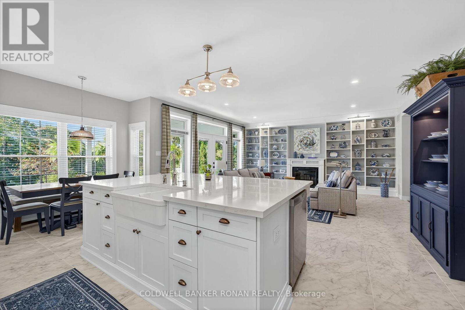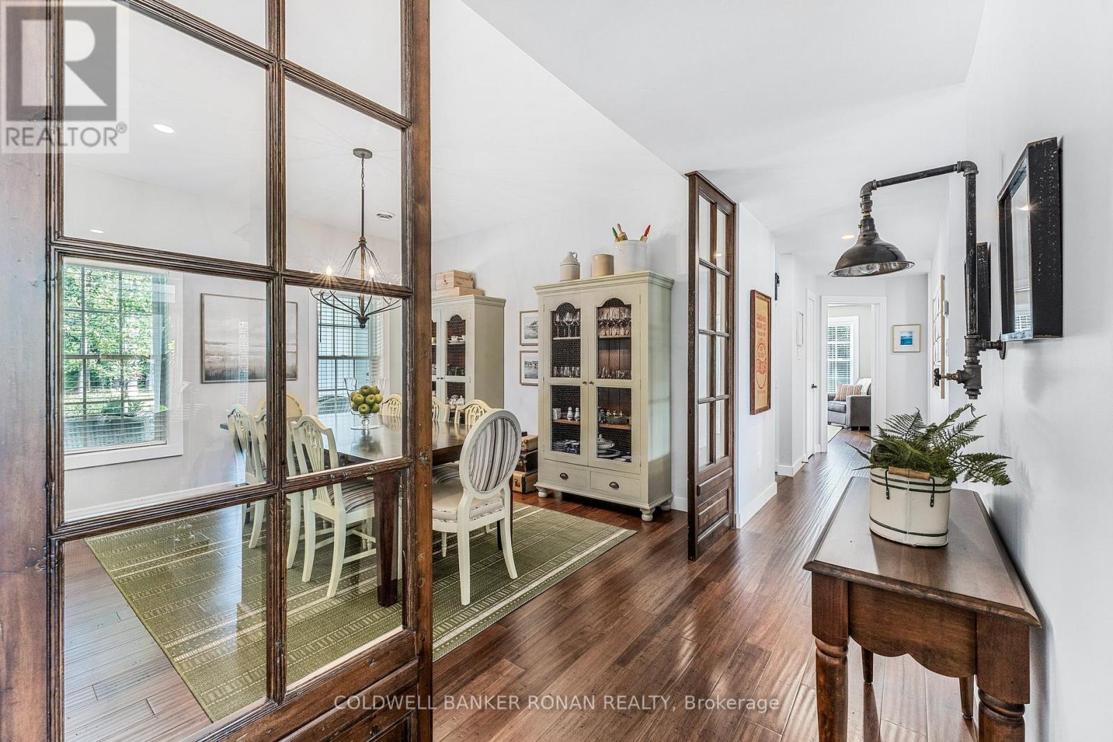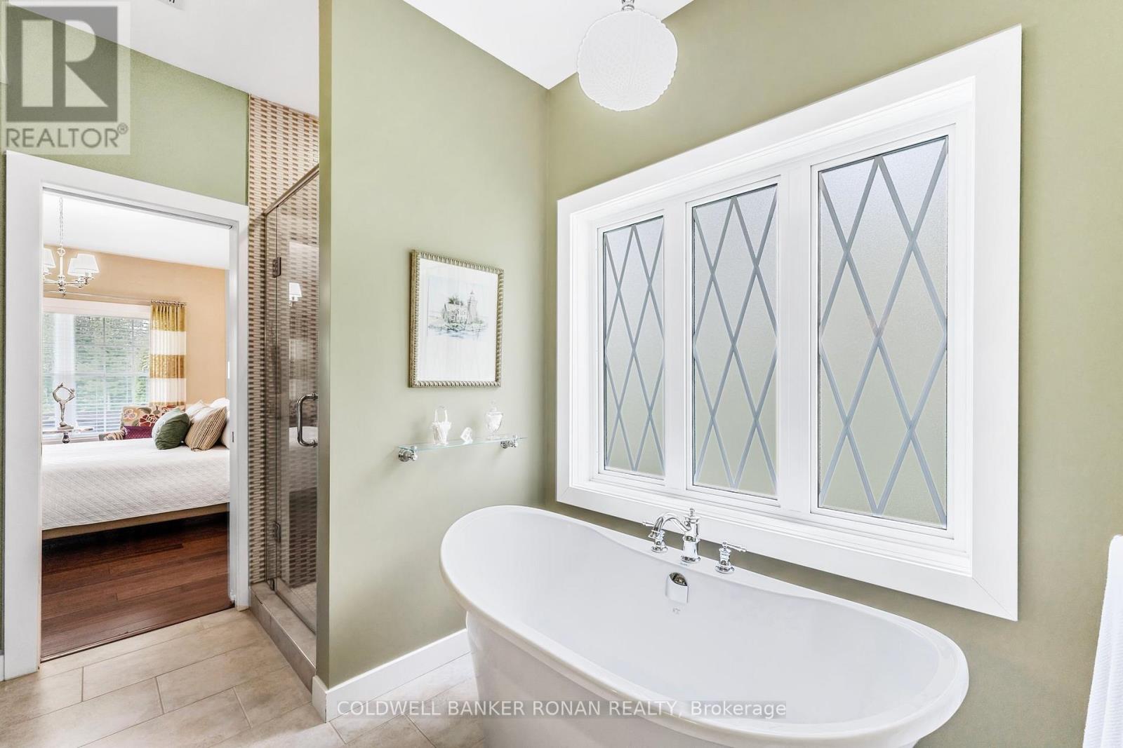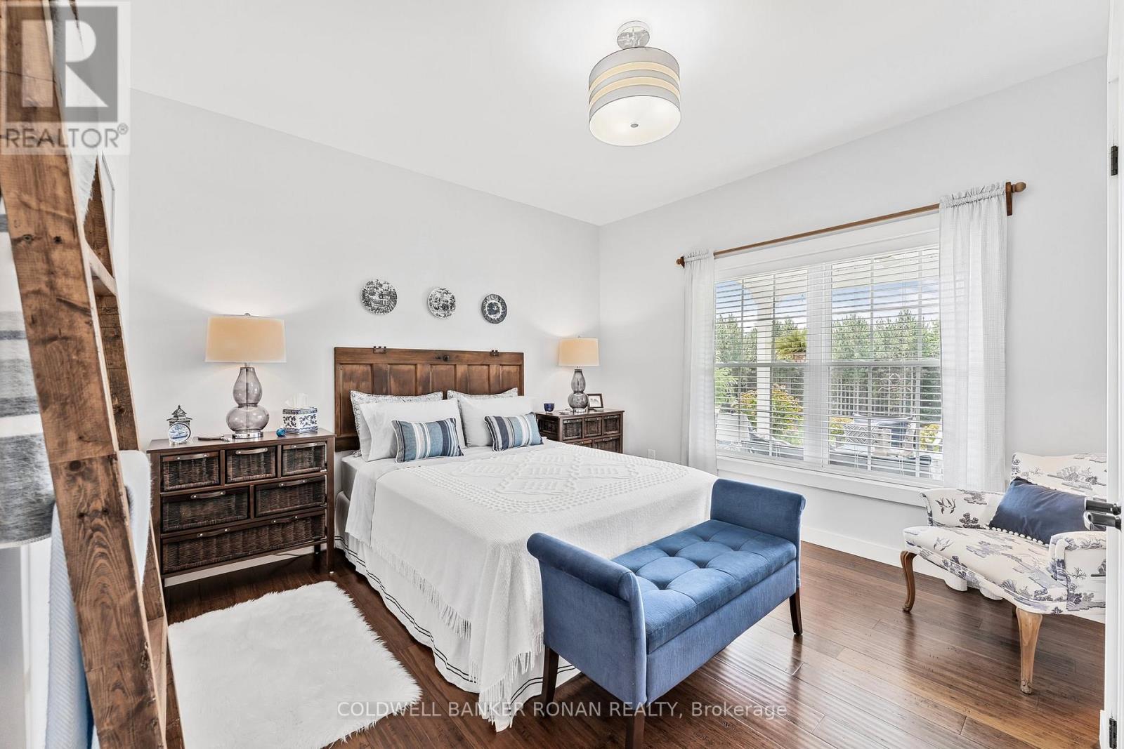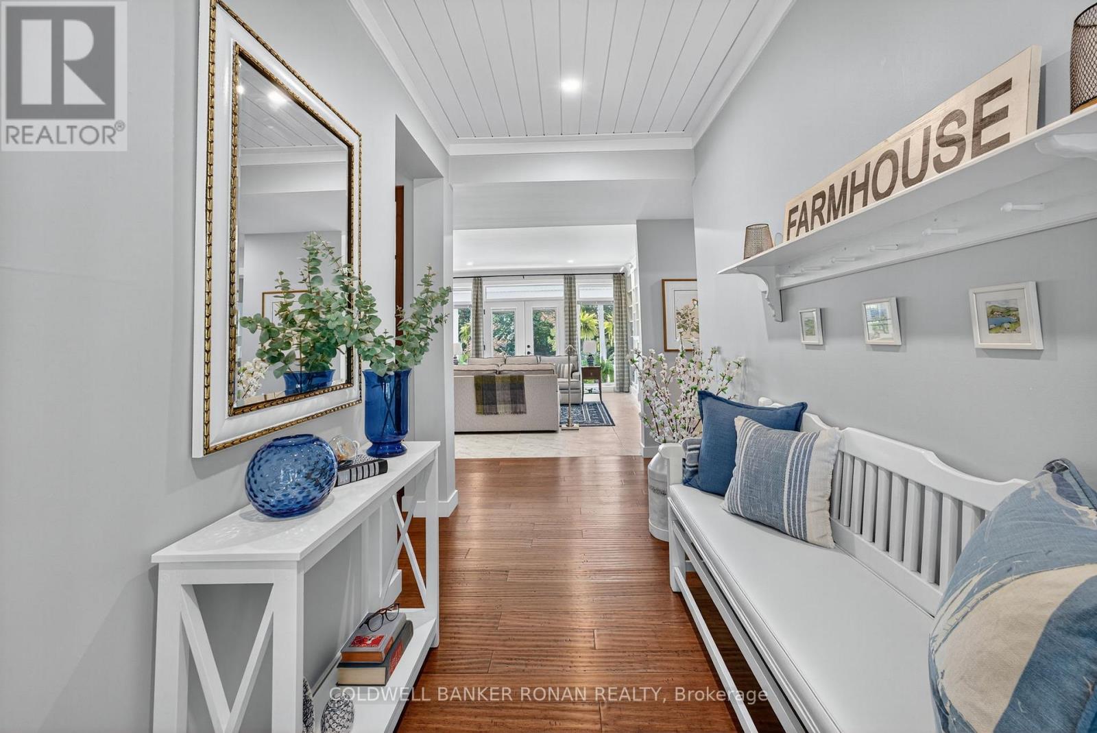 Sophisticated country living! Custom-built in 2018 and set on 2.7 acres of meticulously landscaped grounds in sought-after Tiny Township, this 3,000+ sq. ft. home offers a rare balance of architectural detail, functionality, and effortless style-just moments from Georgian Bay and Midland. The exterior's clean lines and custom details set the tone, while inside, a curated palette of textures and finishes creates warmth throughout. The heart of the home is a sun-filled, open-concept kitchen and living space designed for both intimate moments and entertaining, anchored by a statement fireplace and custom built-ins. Thoughtful details-from the walk-through pantry to the custom mudroom-elevate everyday living. A rare and valuable feature, the finished workshop (converted from one bay of the 3-car garage) offers exceptional flexibility for creative pursuits, home business, or refined storage. The primary suite is a private retreat, complete with a spa-inspired ensuite, walk-in closet, and seamless access to laundry. Additional bedrooms, each with convenient bath access, are complemented by a versatile den with a wet bar and an upper-level bonus space-ideal for guests, a media room, or a fourth bedroom. Seamless indoor-outdoor living unfolds through garden doors to a 58-foot covered porch with ceiling fans, overlooking manicured grounds, mature gardens, and a stone fire pit, designed for relaxed evenings and an effortless cottage lifestyle. An offering defined by intention, craftsmanship, and lifestyle-tailored for those who value space, privacy, and understated luxury. (id:50787)